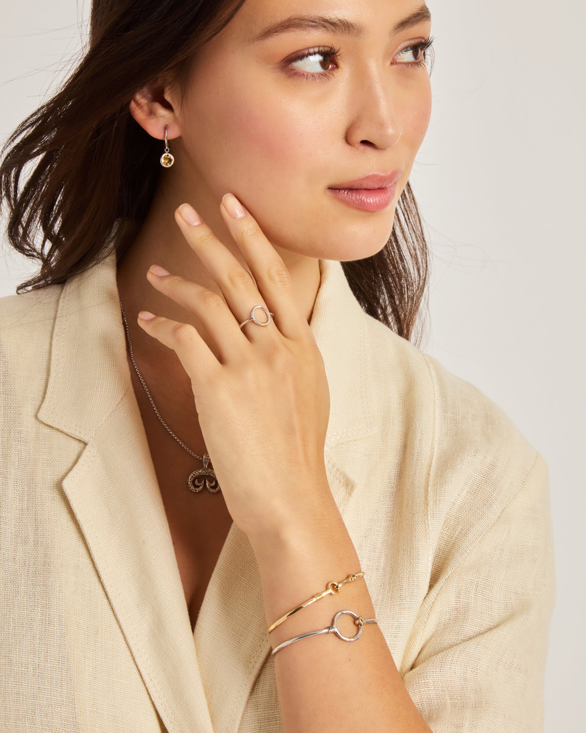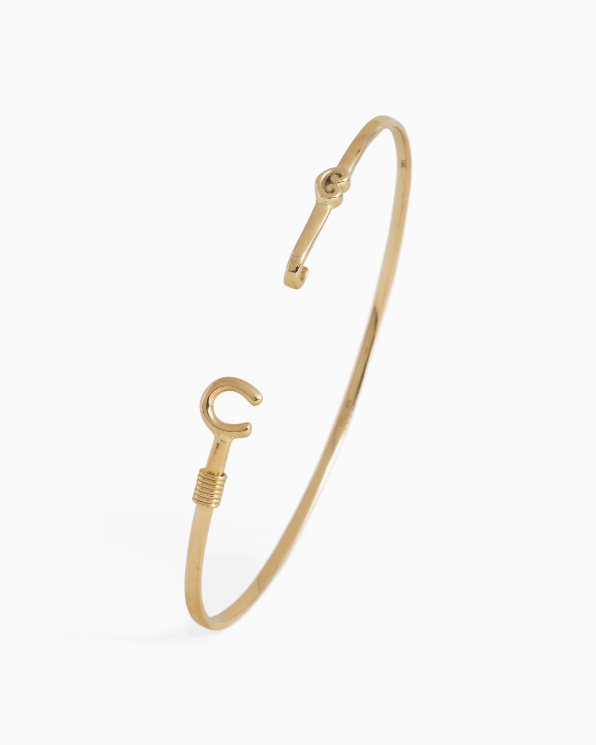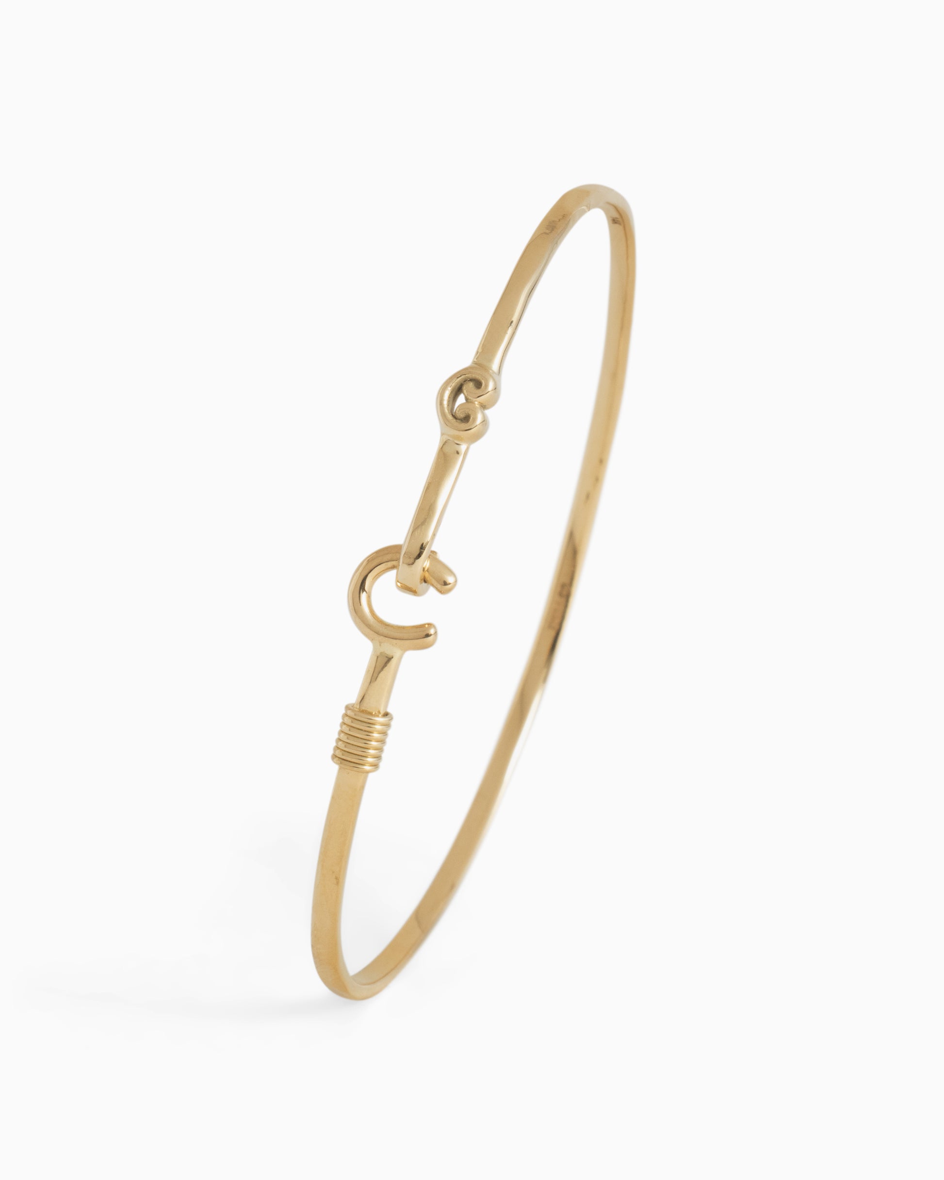 A Vibe signature, The Hook Bracelet is fashioned in 14K solid gold with a "C" hook clasp. Featuring a tiny replica of the St. John petroglyph and seven good luck wraps, solo or stacked, it is sure to be a favorite piece. Found in many of our designs, Vibe’s seven good luck wraps represent love, laughter, happiness, good fortune, health, unity, and peace. In the Caribbean tradition, wear your hook facing in to keep love close to your heart, and facing out if you are open to a new love in your life. Wear this piece on its own or stack it with other bracelets for a layered look.