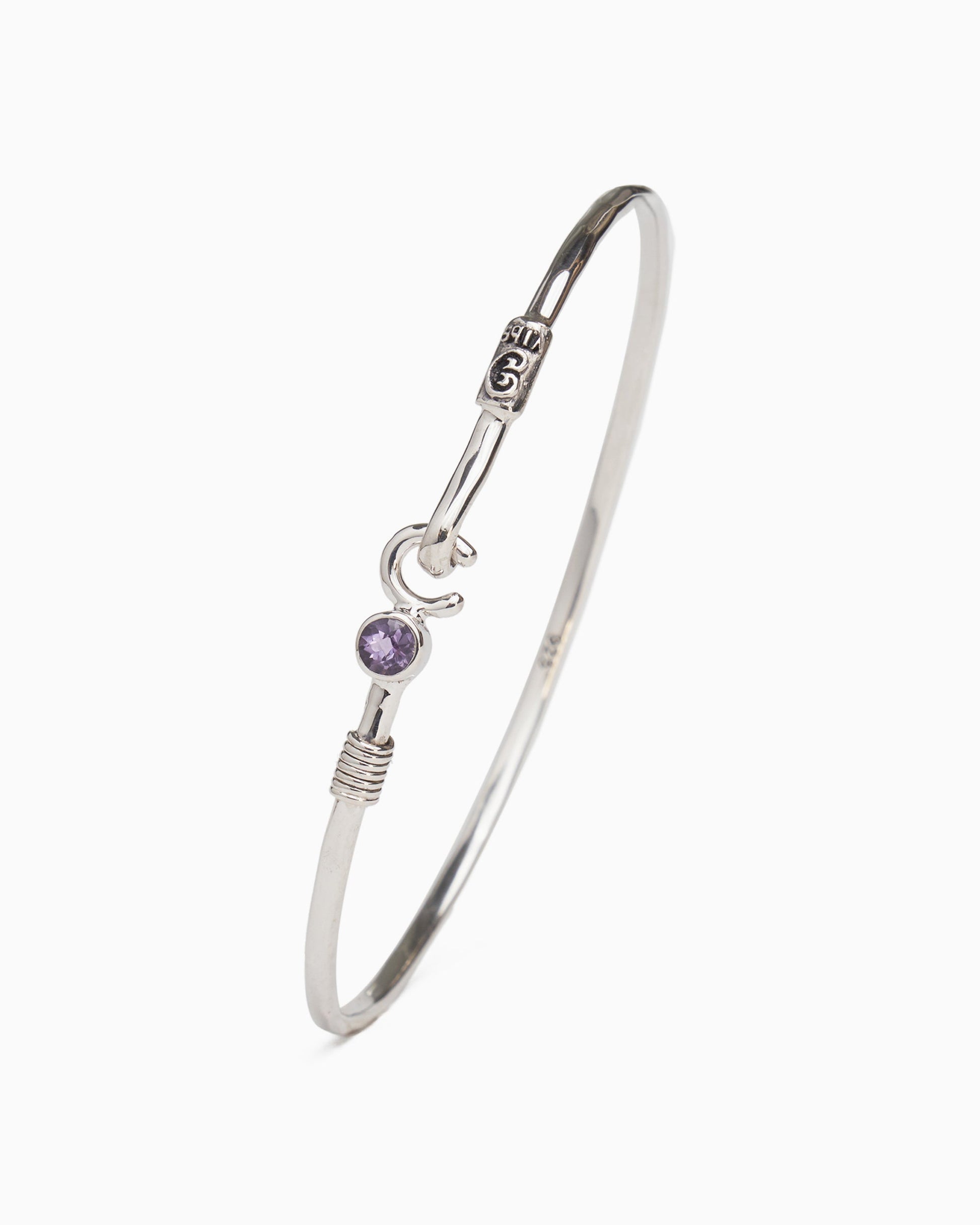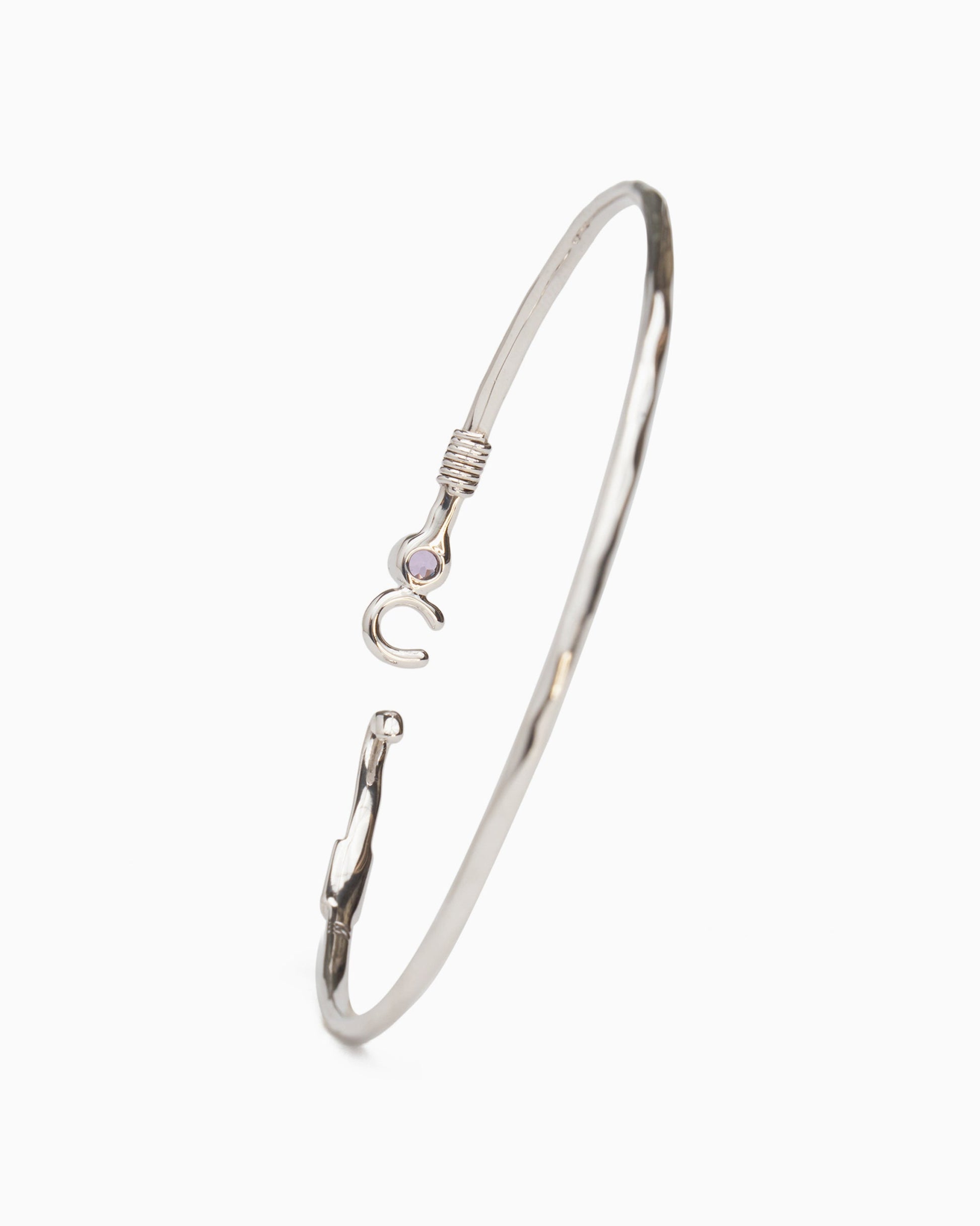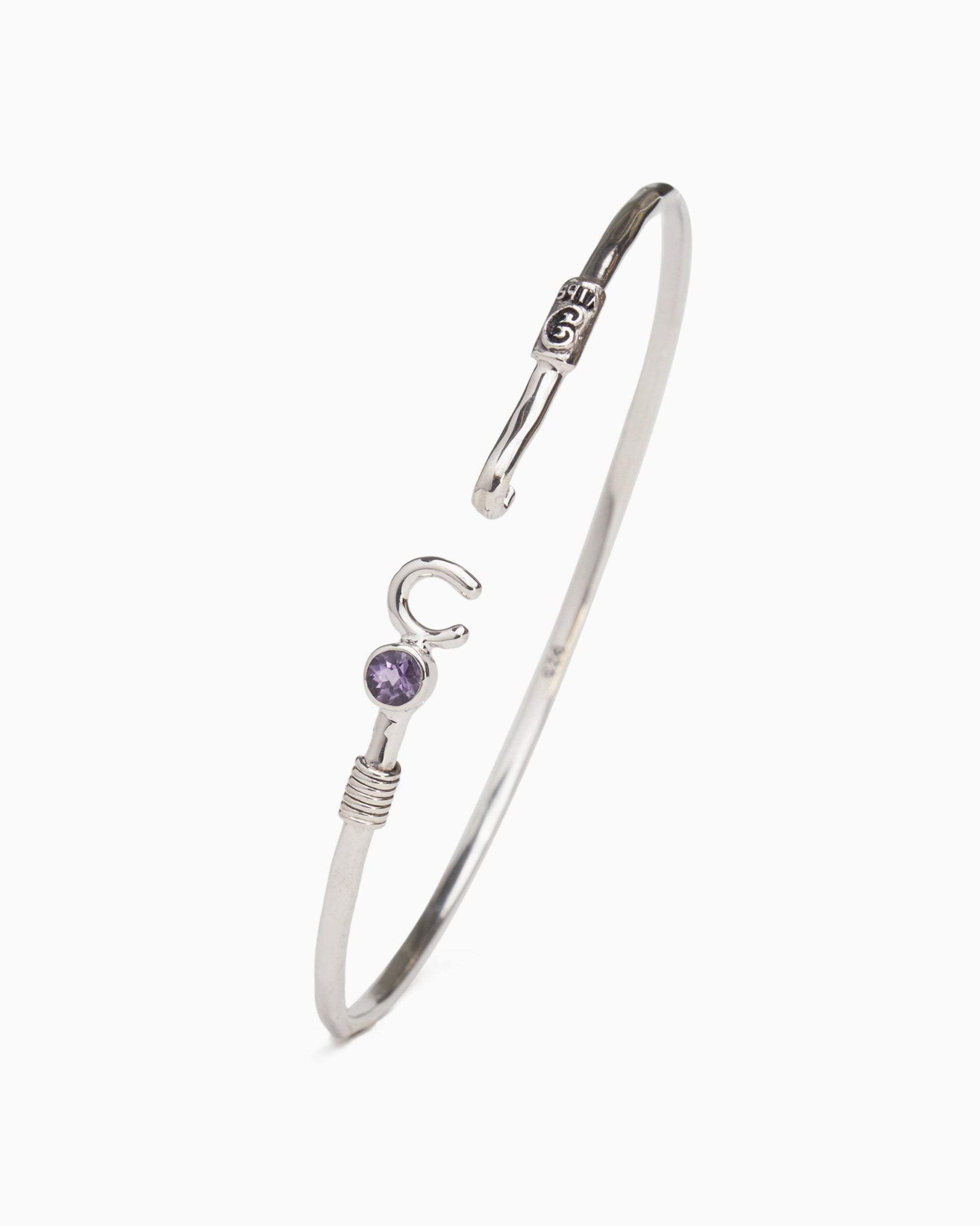 A Vibe signature, The Hook Bracelet with Stone is fashioned in gently hammered sterling silver with a faceted amethyst stone and "C" hook clasp. Featuring a replica of the St. John petroglyph and seven good luck wraps, solo or stacked, it is sure to be a favorite piece. Found in many of our designs, Vibe’s seven good luck wraps represent love, laughter, happiness, good fortune, health, unity, and peace. In the Caribbean tradition, wear your hook facing in to keep love close to your heart, and facing out if you are open to a new love in your life. Wear this piece on its own or stack it with other bracelets for a layered look.