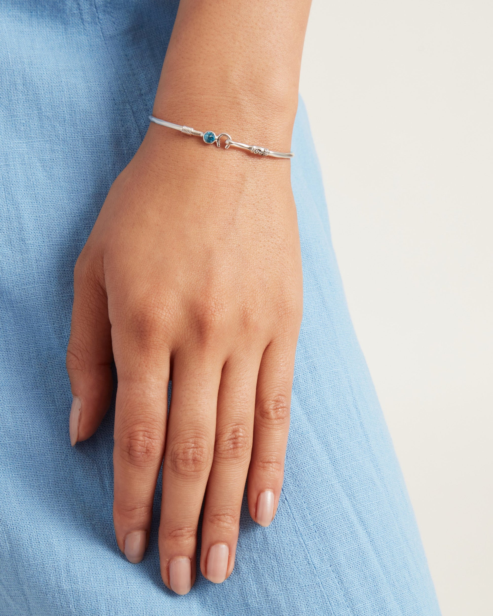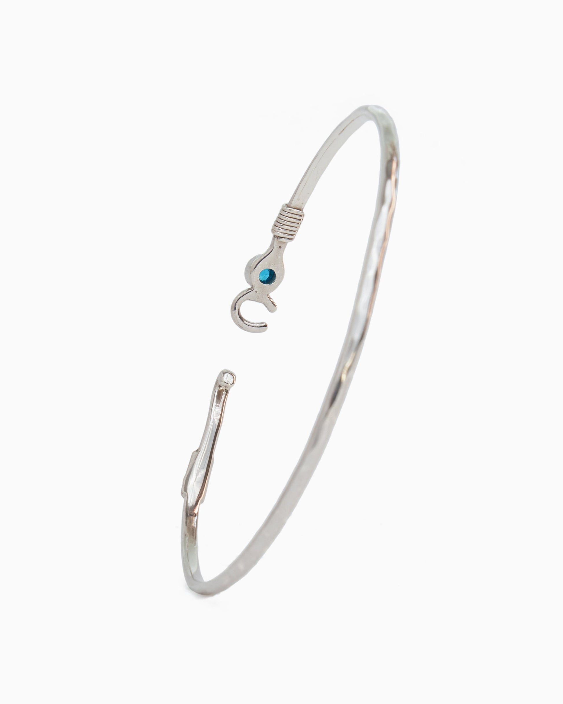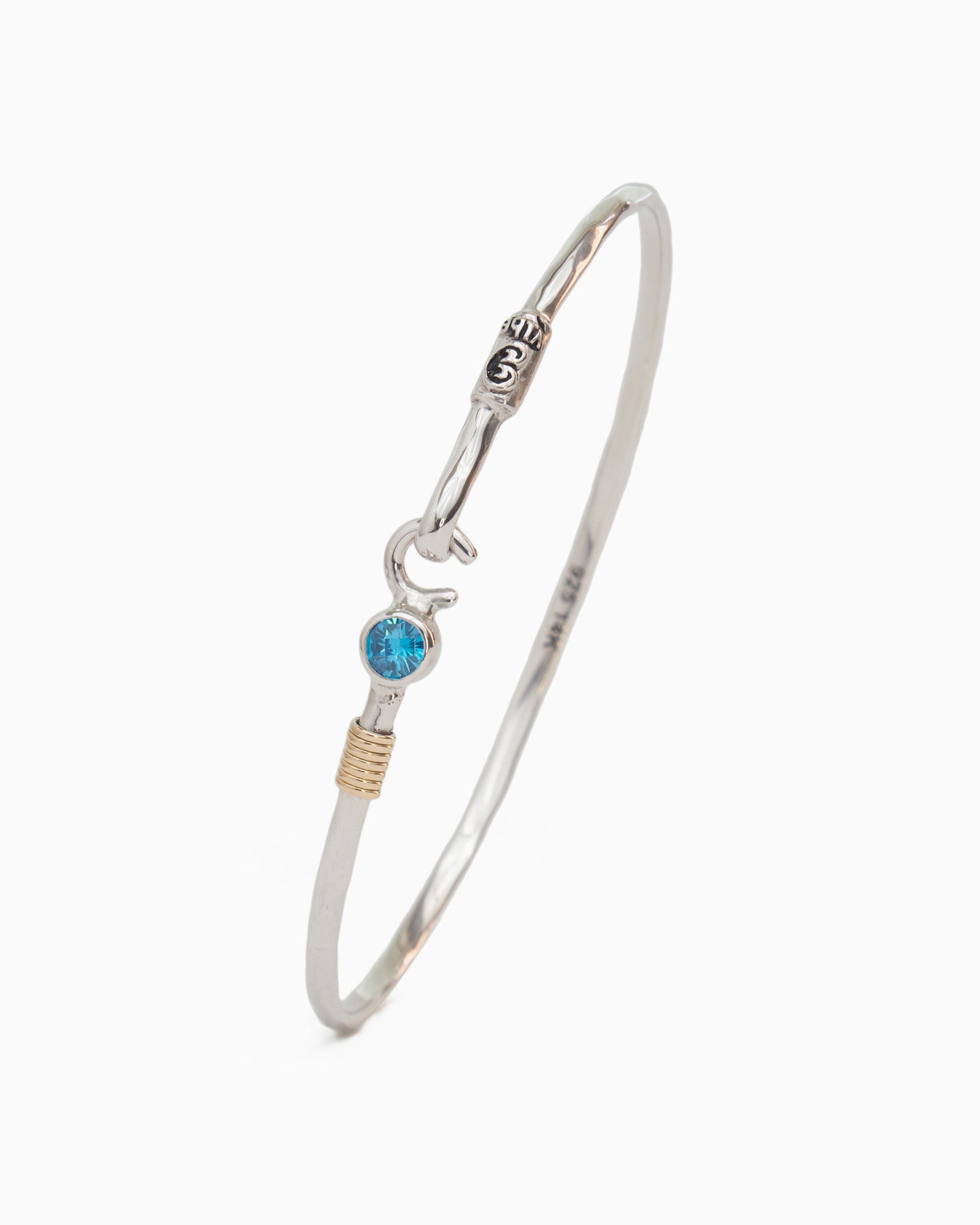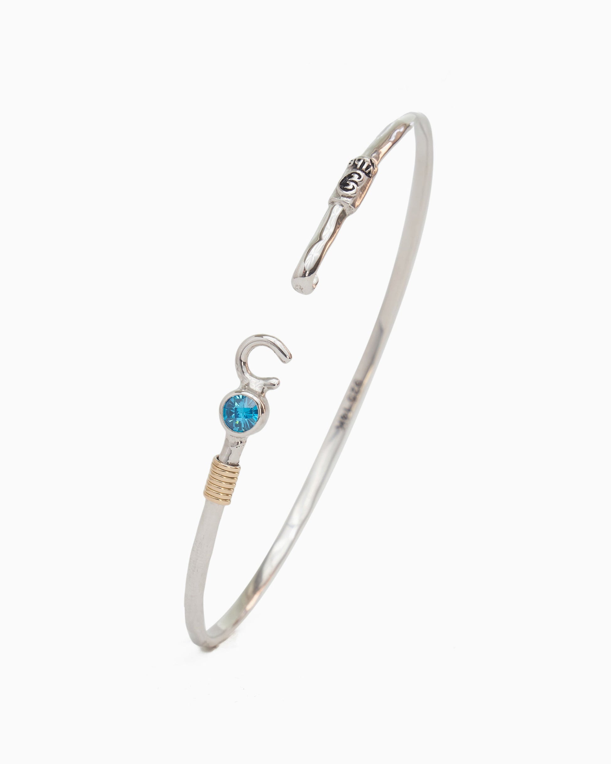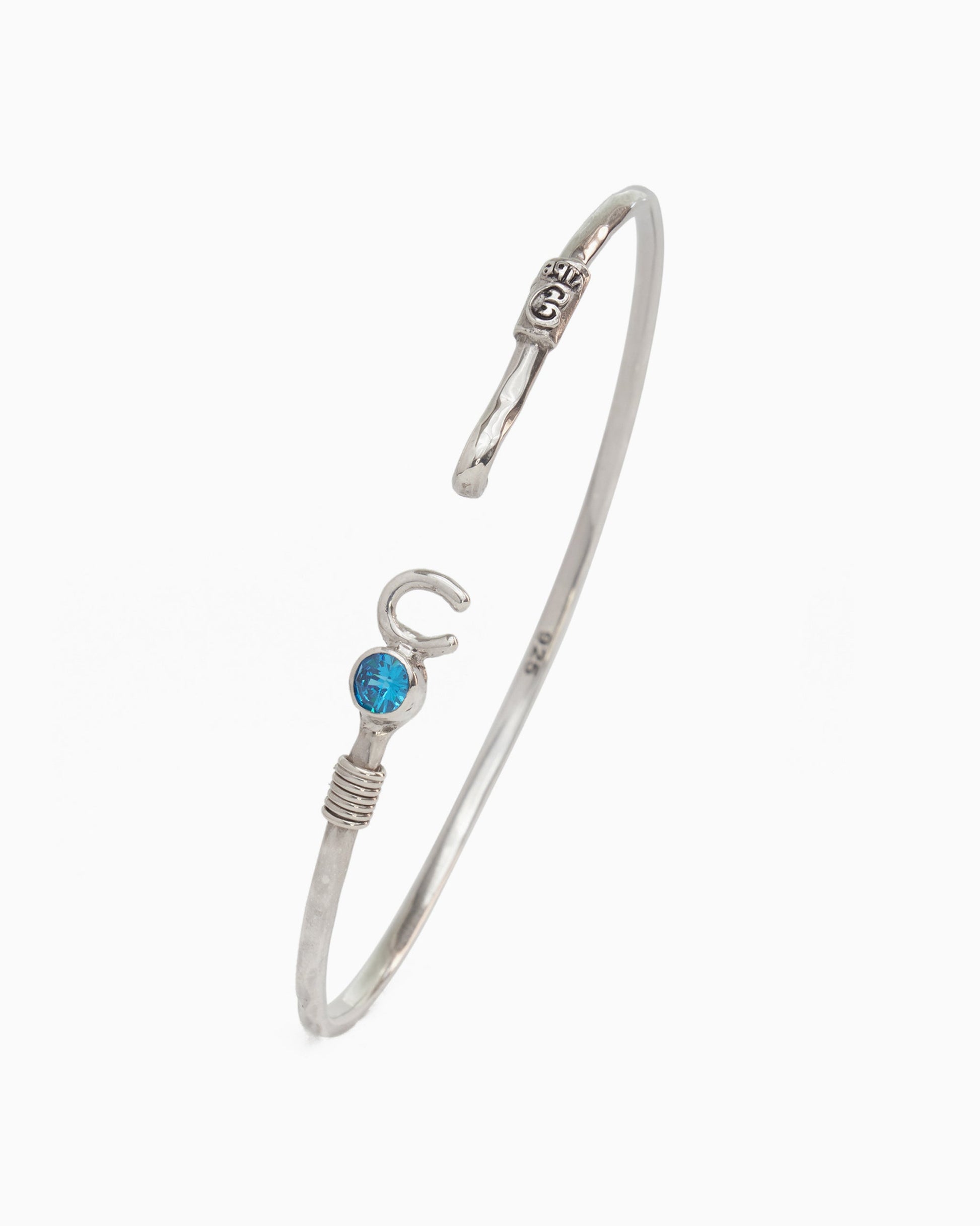 A Vibe signature, The Hook Bracelet with Stone is fashioned in gently hammered sterling silver with a faceted blue zircon stone and "C" hook clasp. Featuring a replica of the St. John petroglyph and seven good luck wraps, solo or stacked, it is sure to be a favorite piece. Found in many of our designs, Vibe’s seven good luck wraps represent love, laughter, happiness, good fortune, health, unity, and peace. In the Caribbean tradition, wear your hook facing in to keep love close to your heart, and facing out if you are open to a new love in your life. Wear this piece on its own or stack it with other bracelets for a layered look.
