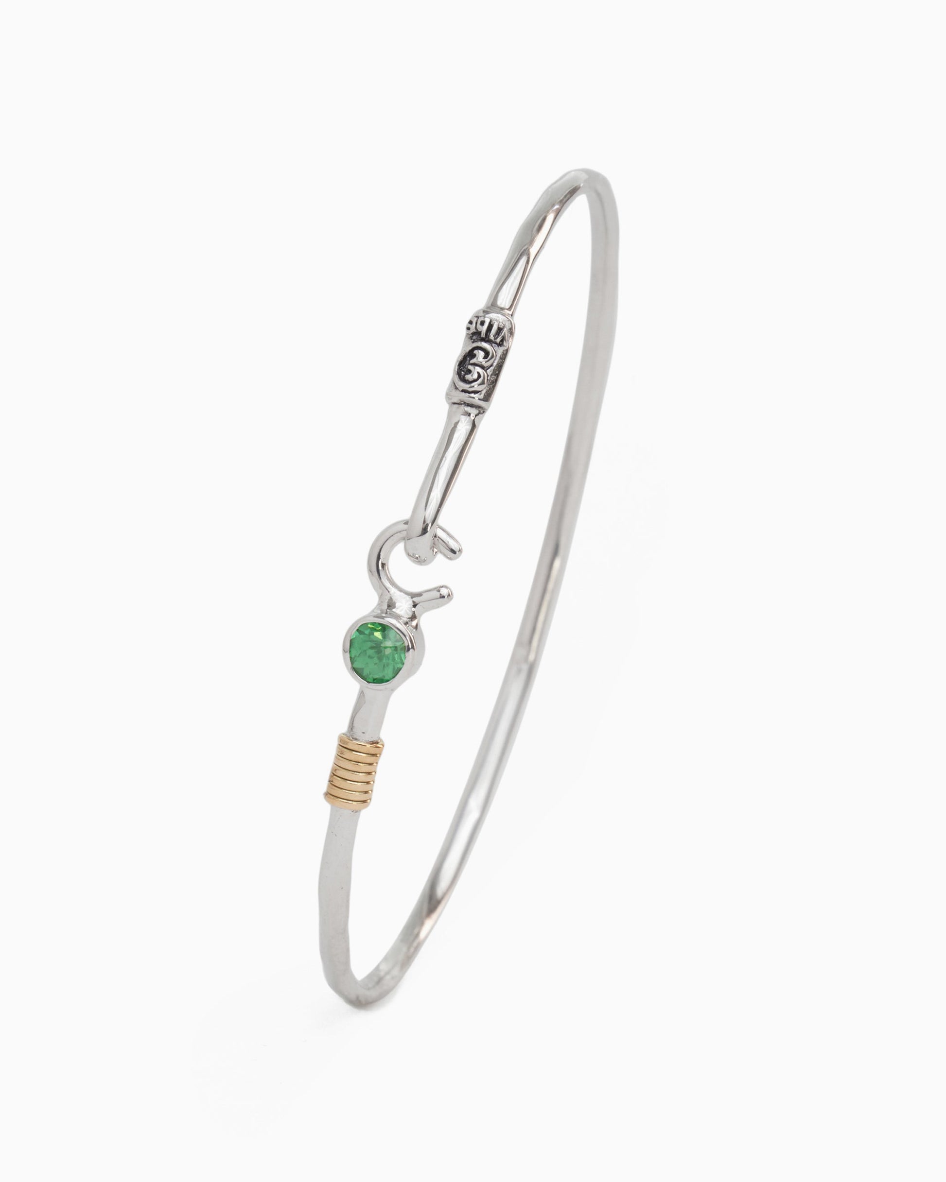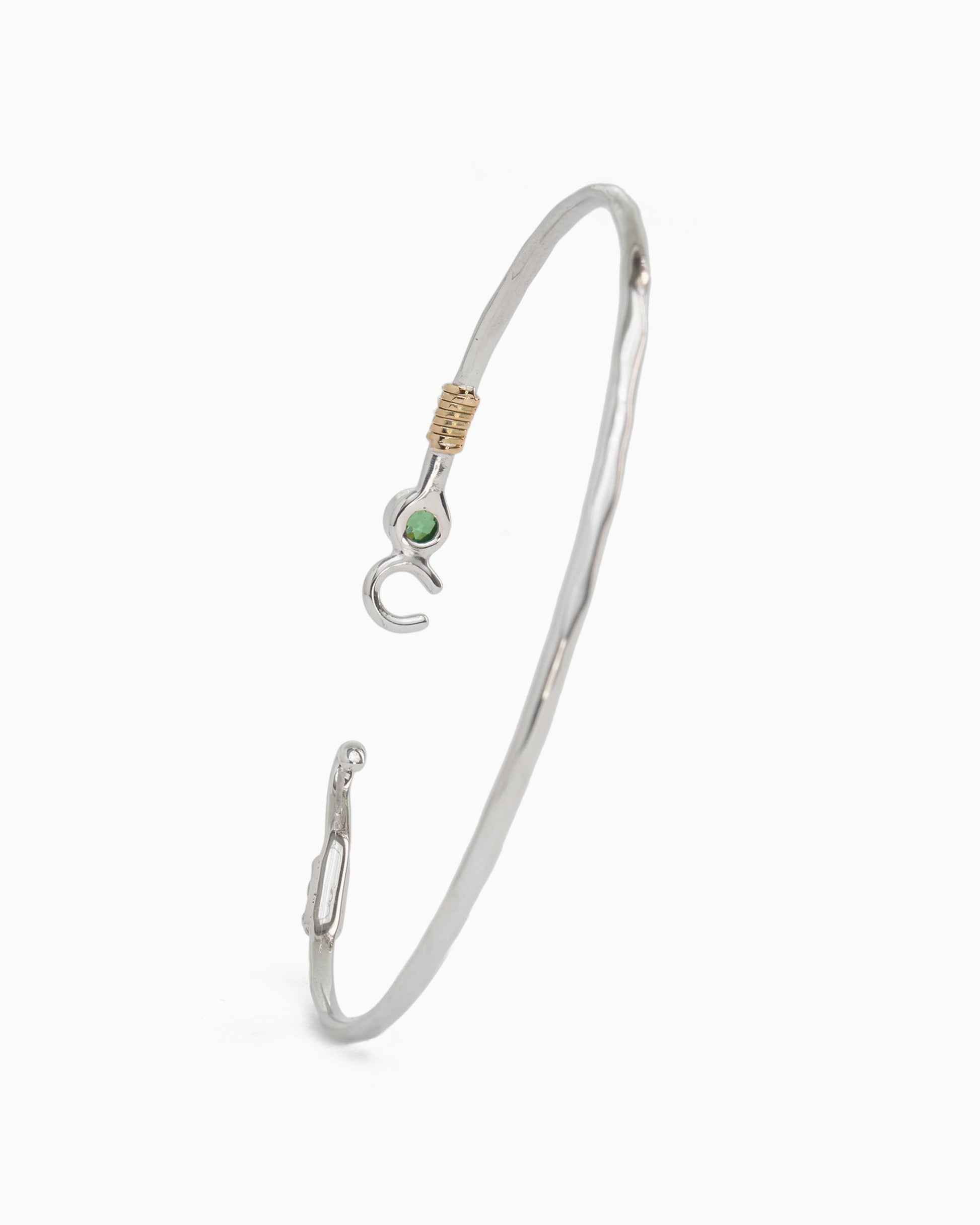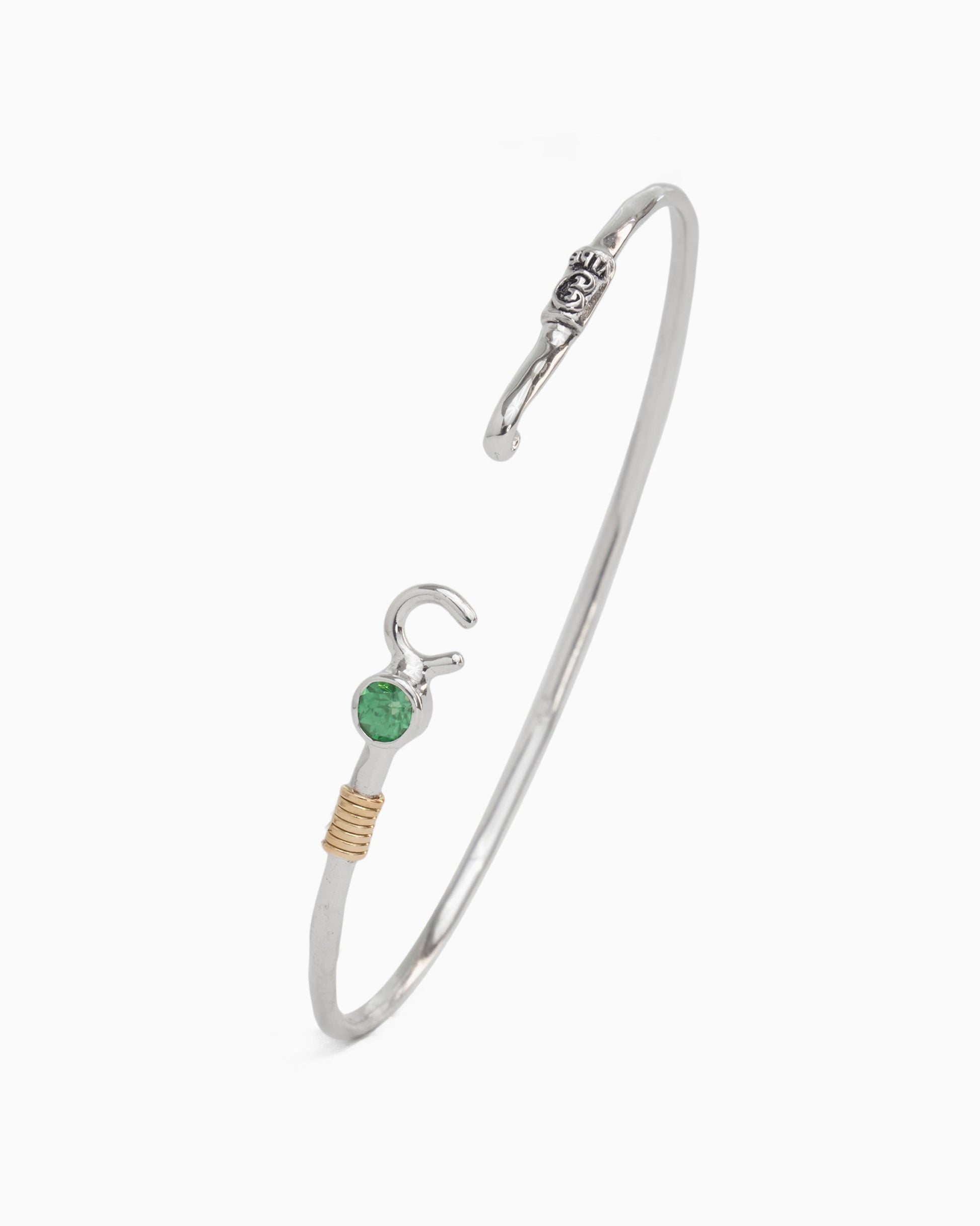 A Vibe signature, The Hook Bracelet with Stone is fashioned in gently hammered sterling silver with a faceted green zircon stone and "C" hook clasp. Featuring a replica of the St. John petroglyph and seven 14K gold good luck wraps, solo or stacked, it is sure to be a favorite piece. Found in many of our designs, Vibe’s seven good luck wraps represent love, laughter, happiness, good fortune, health, unity, and peace. In the Caribbean tradition, wear your hook facing in to keep love close to your heart, and facing out if you are open to a new love in your life. Wear this piece on its own or stack it with other bracelets for a layered look.