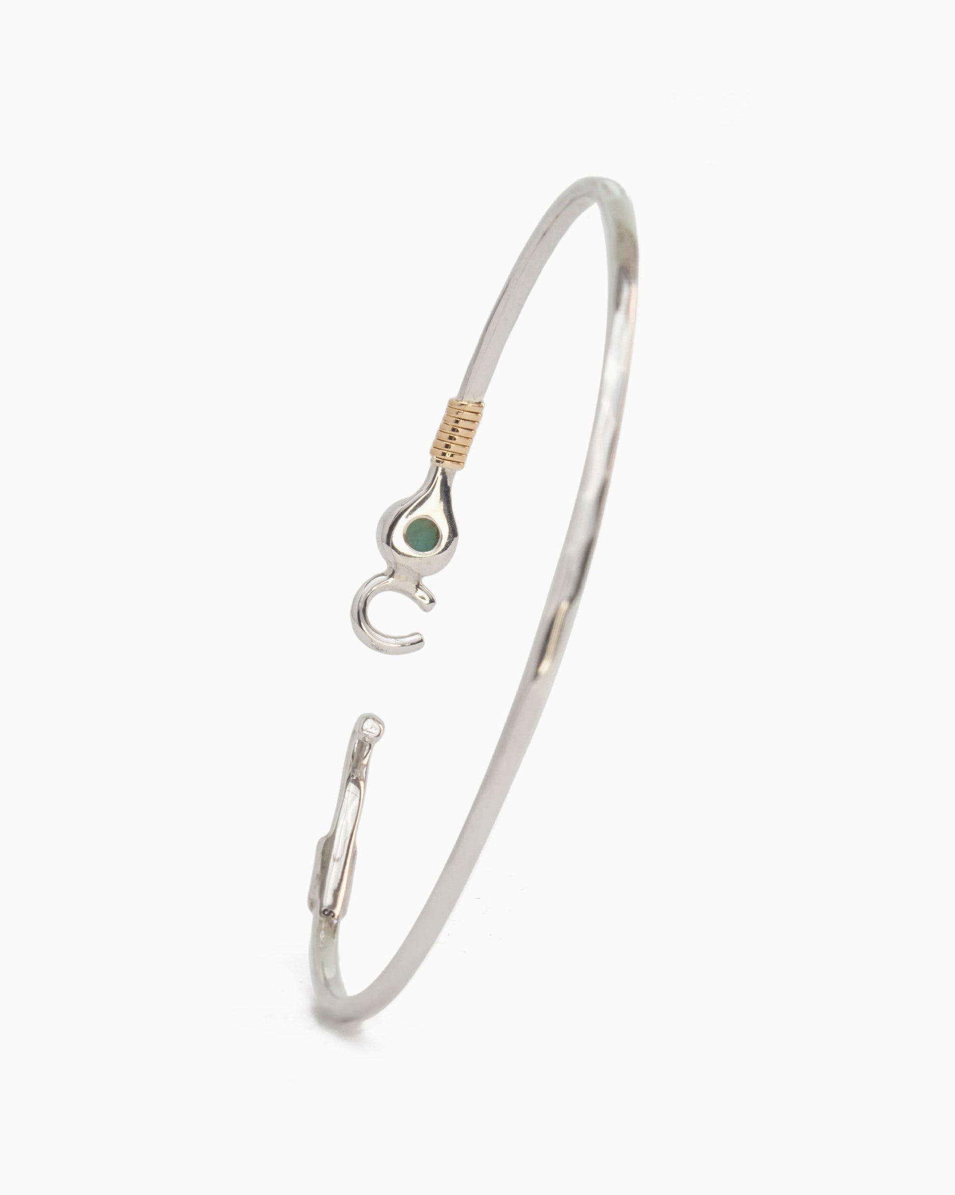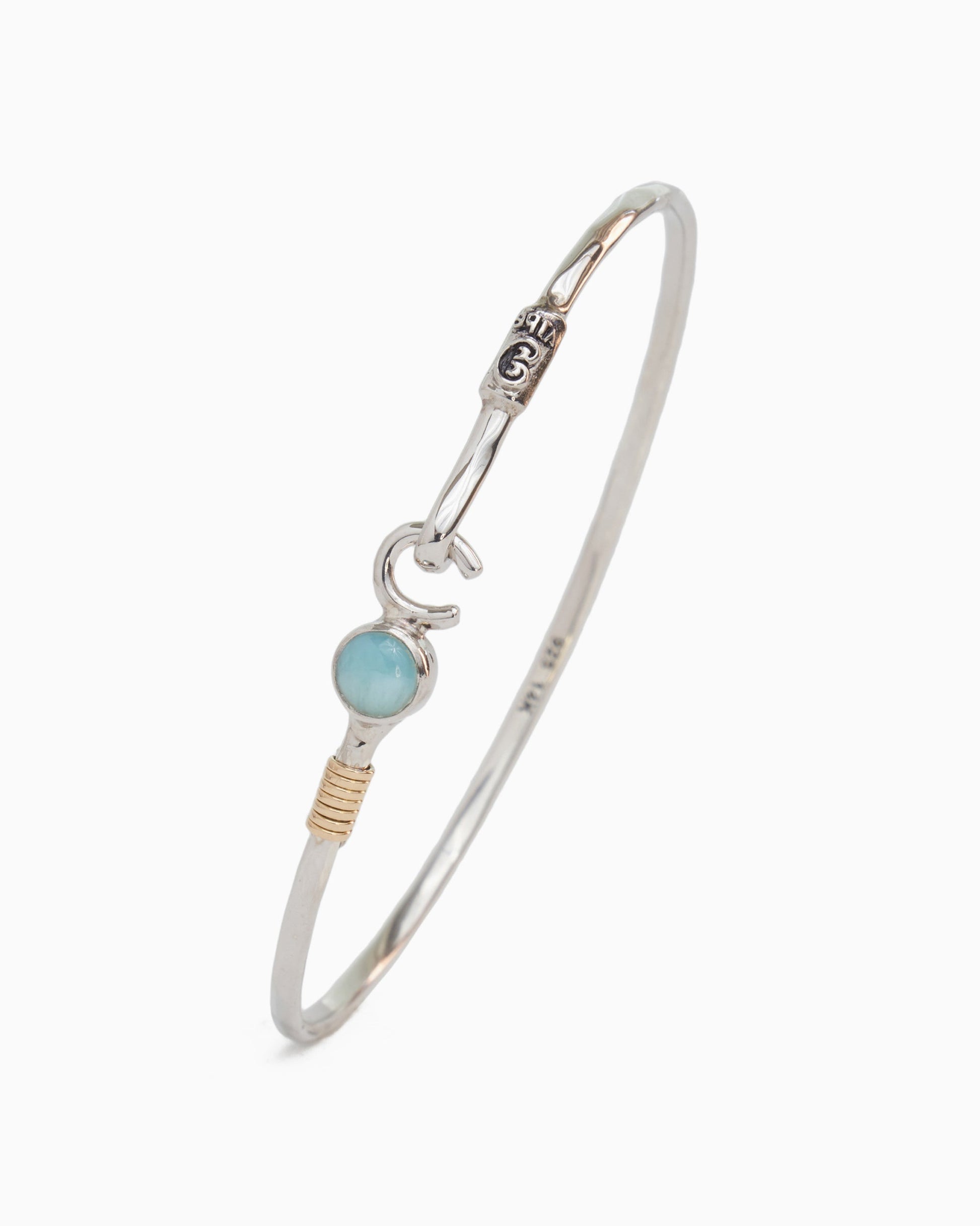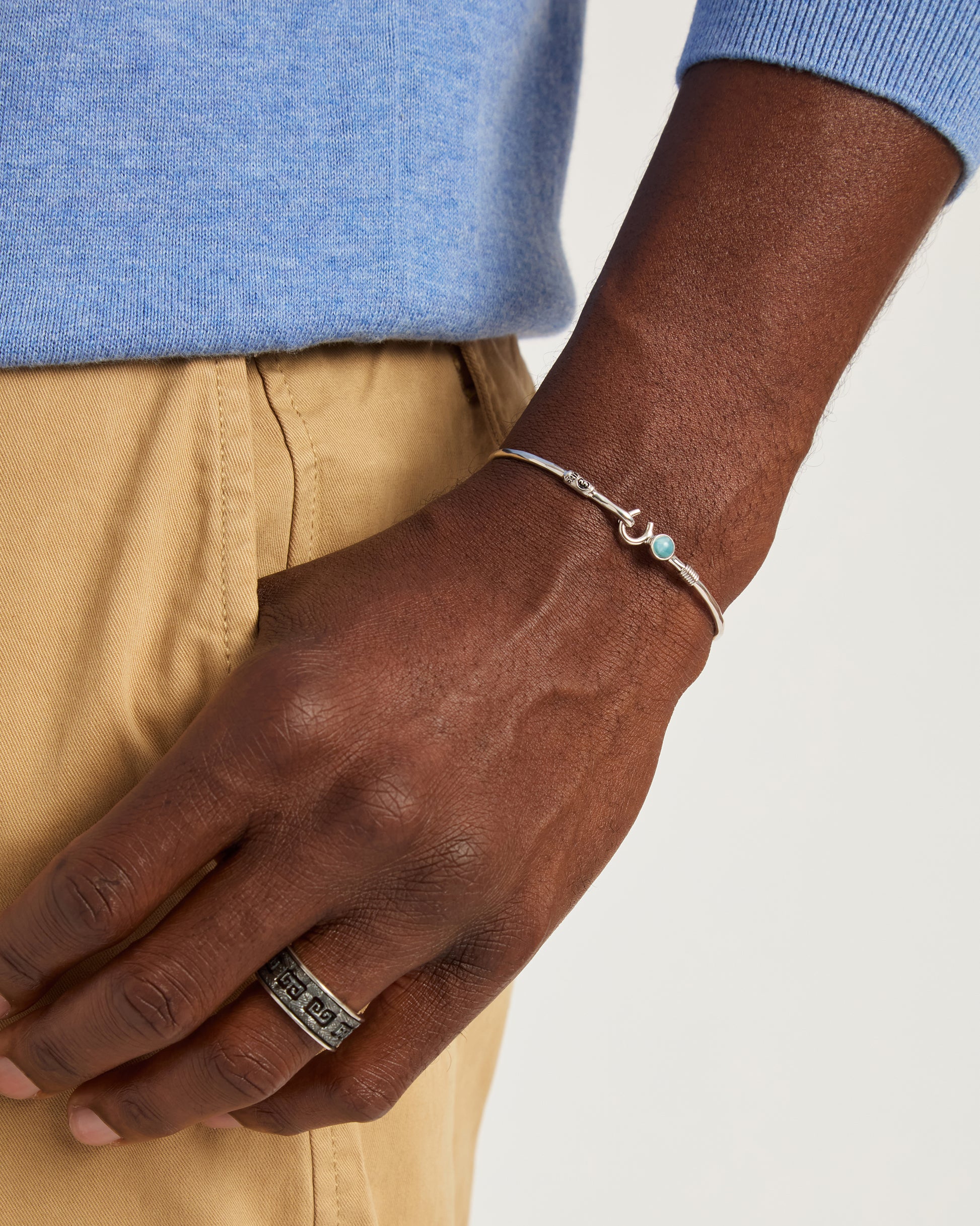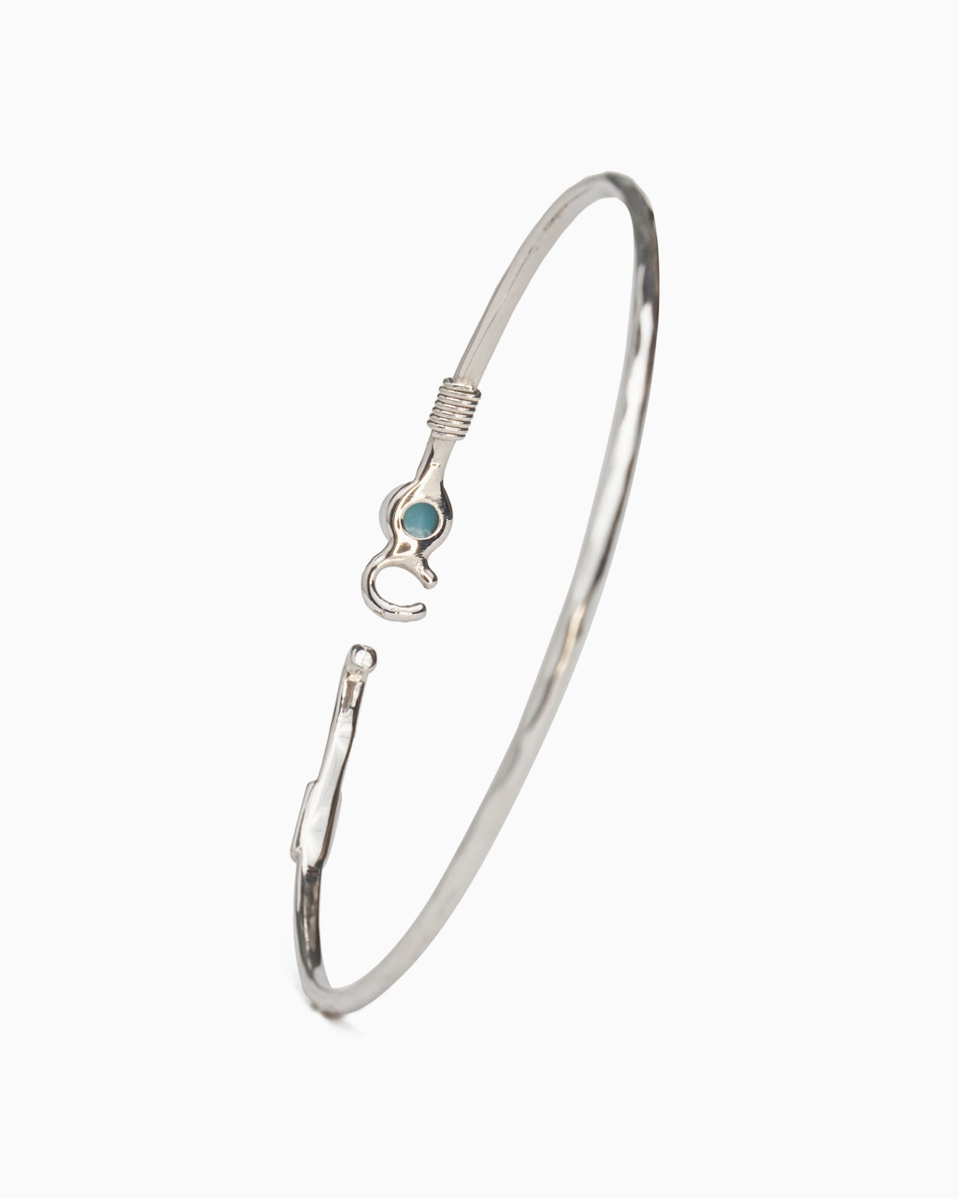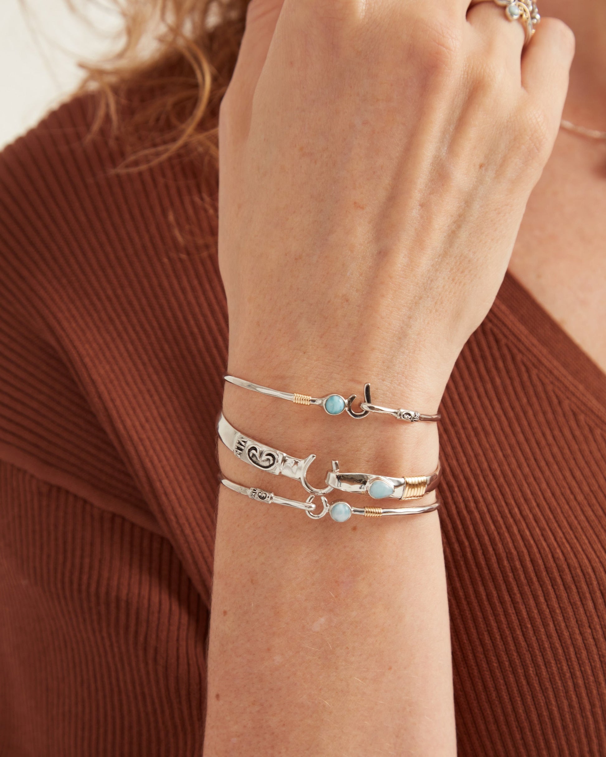 A Vibe signature, The Hook Bracelet with Stone is fashioned in gently hammered sterling silver with a larimar cabochon and "C" hook clasp. Featuring a replica of the St. John petroglyph and seven good luck wraps, solo or stacked, it is sure to be a favorite piece. Found in many of our designs, Vibe’s seven good luck wraps represent love, laughter, happiness, good fortune, health, unity, and peace. In the Caribbean tradition, wear your hook facing in to keep love close to your heart, and facing out if you are open to a new love in your life. Wear this piece on its own or stack it with other bracelets for a layered look.
