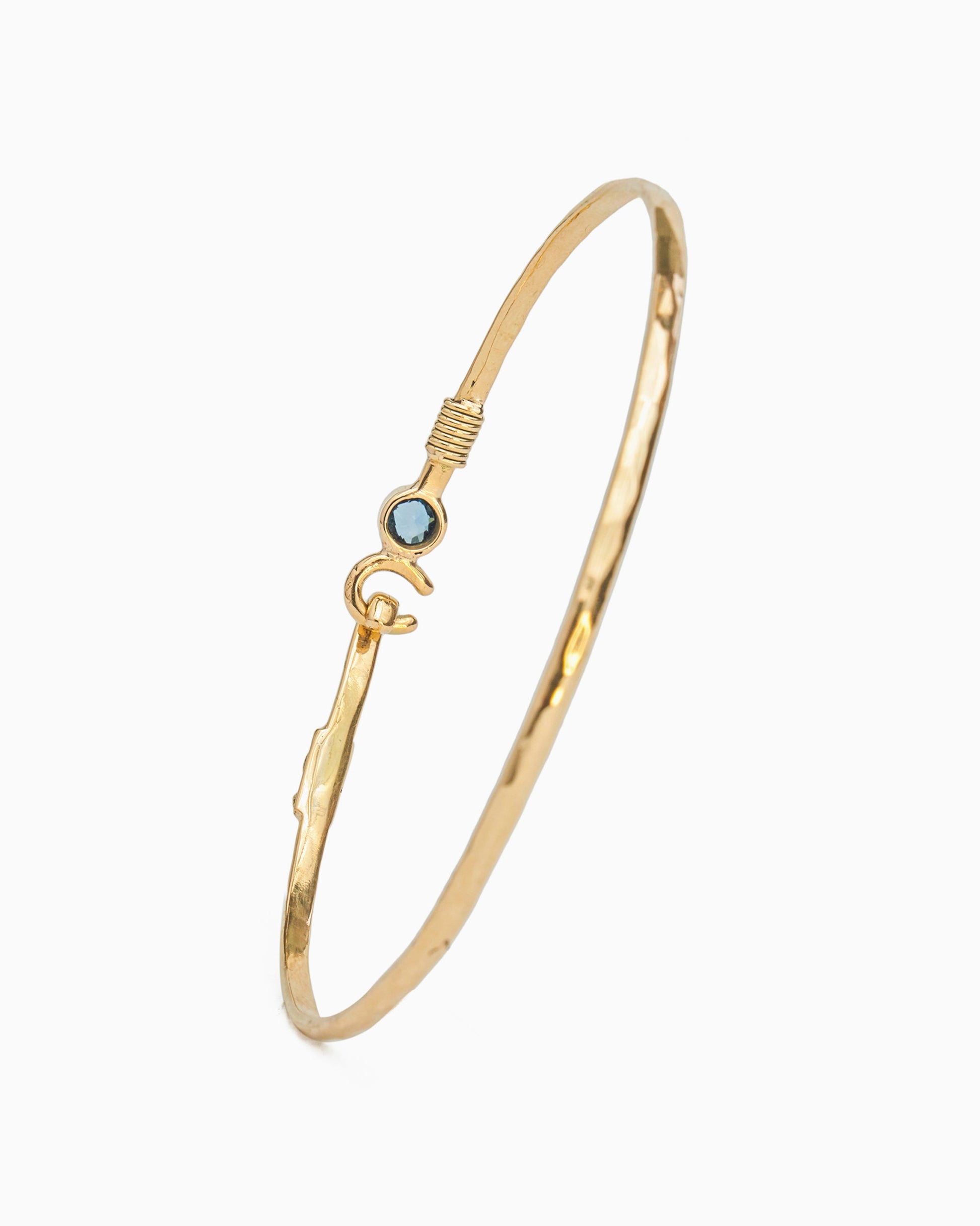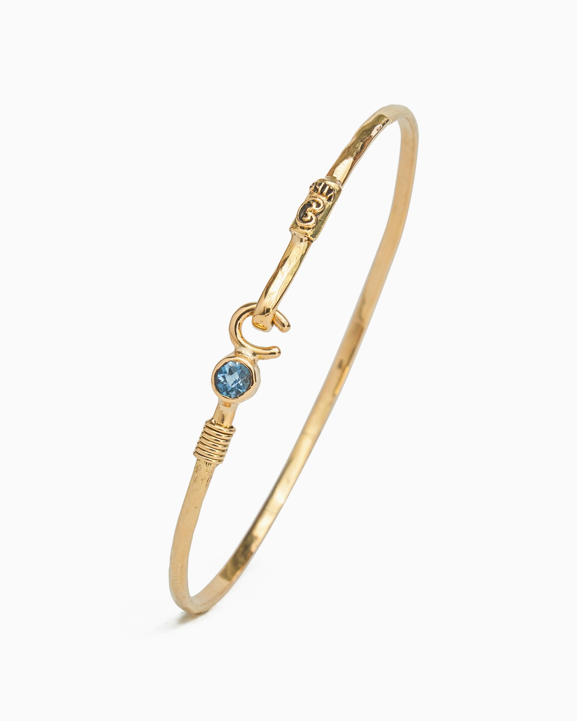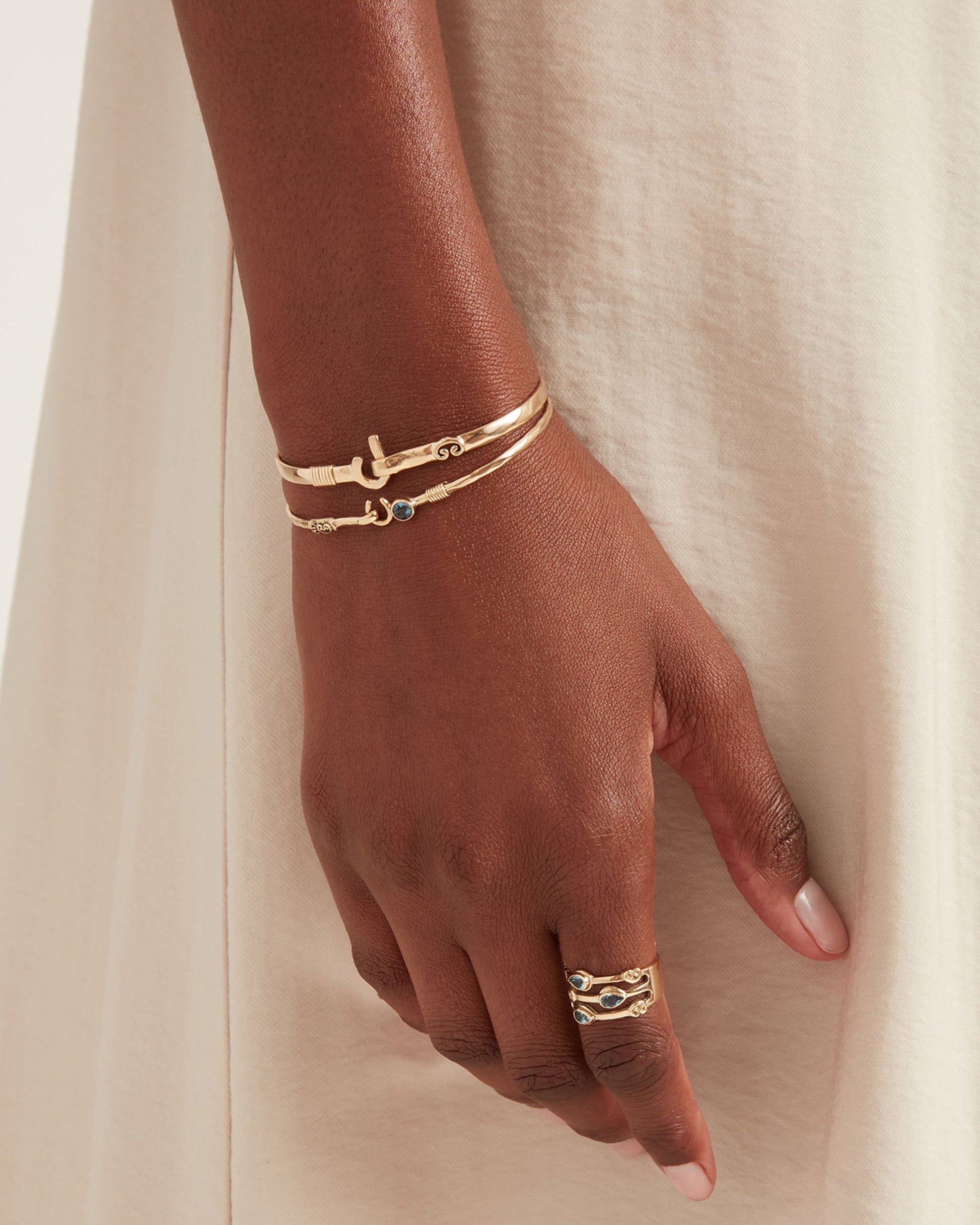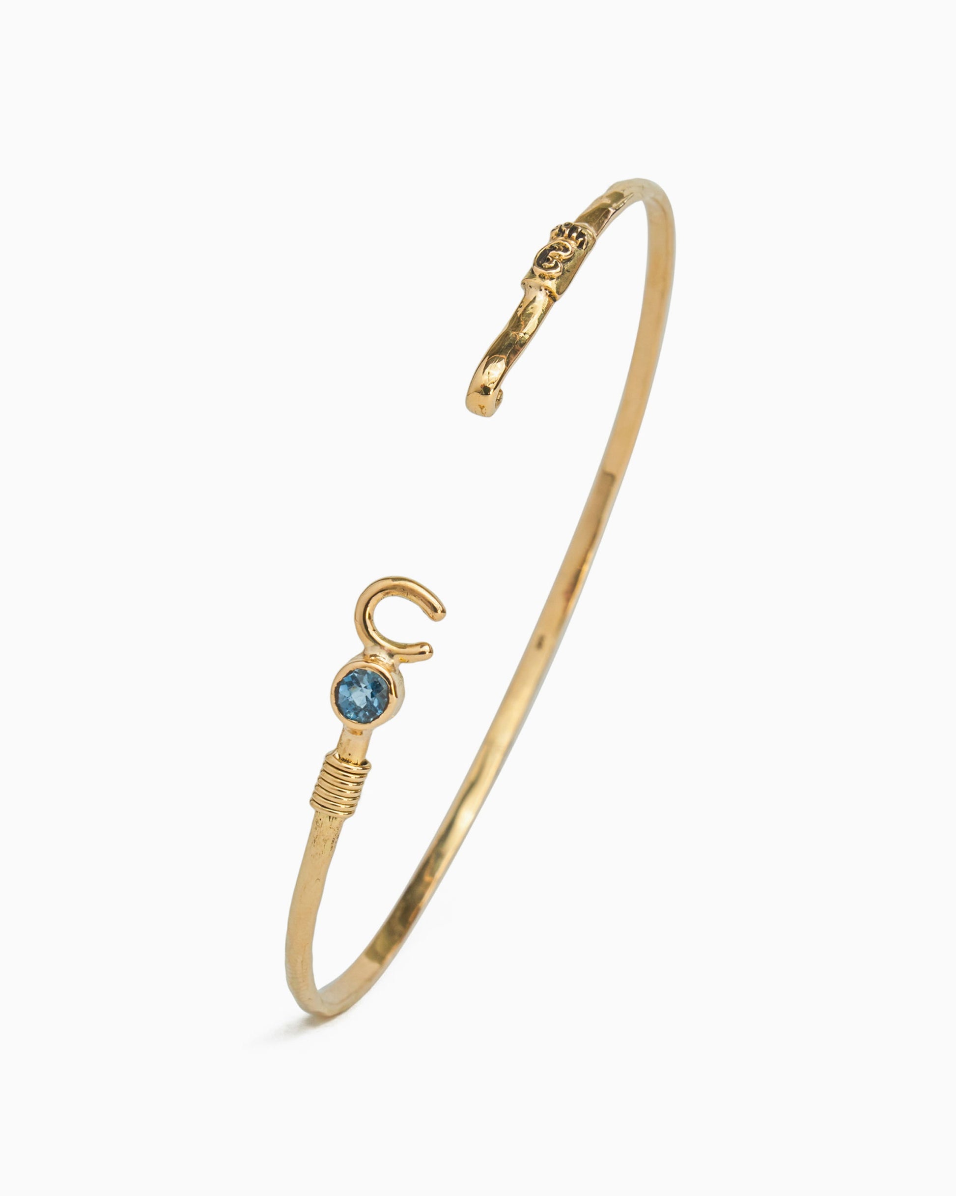 A Vibe signature, The Hook Bracelet with Stone is fashioned in gently hammered 14K solid gold with a faceted London blue topaz stone and "C" hook clasp. Featuring a replica of the St. John petroglyph and seven 14K gold good luck wraps, solo or stacked, it is sure to be a favorite piece. Found in many of our designs, Vibe’s seven good luck wraps represent love, laughter, happiness, good fortune, health, unity, and peace. In the Caribbean tradition, wear your hook facing in to keep love close to your heart, and facing out if you are open to a new love in your life. Wear this piece on its own or stack it with other bracelets for a layered look.