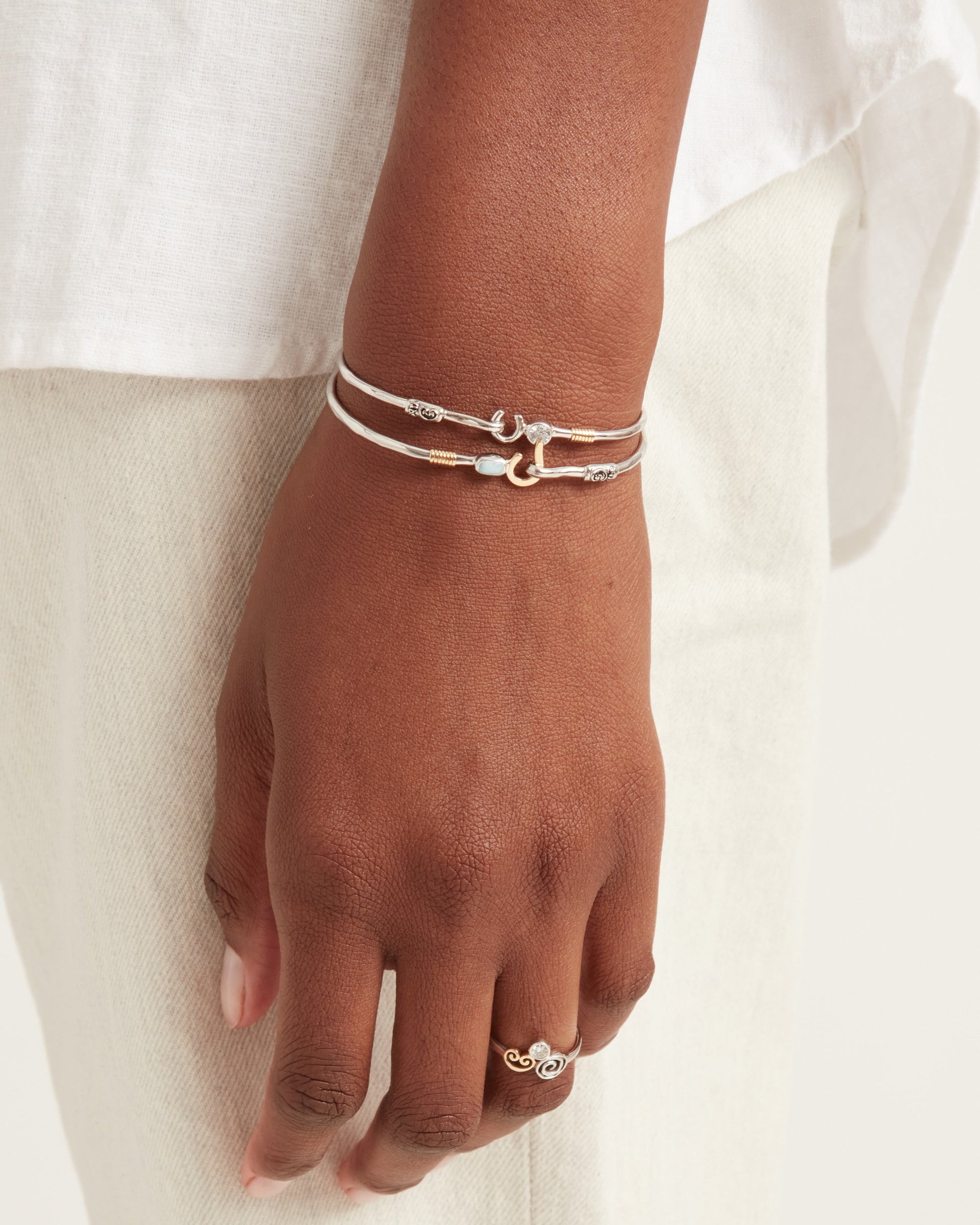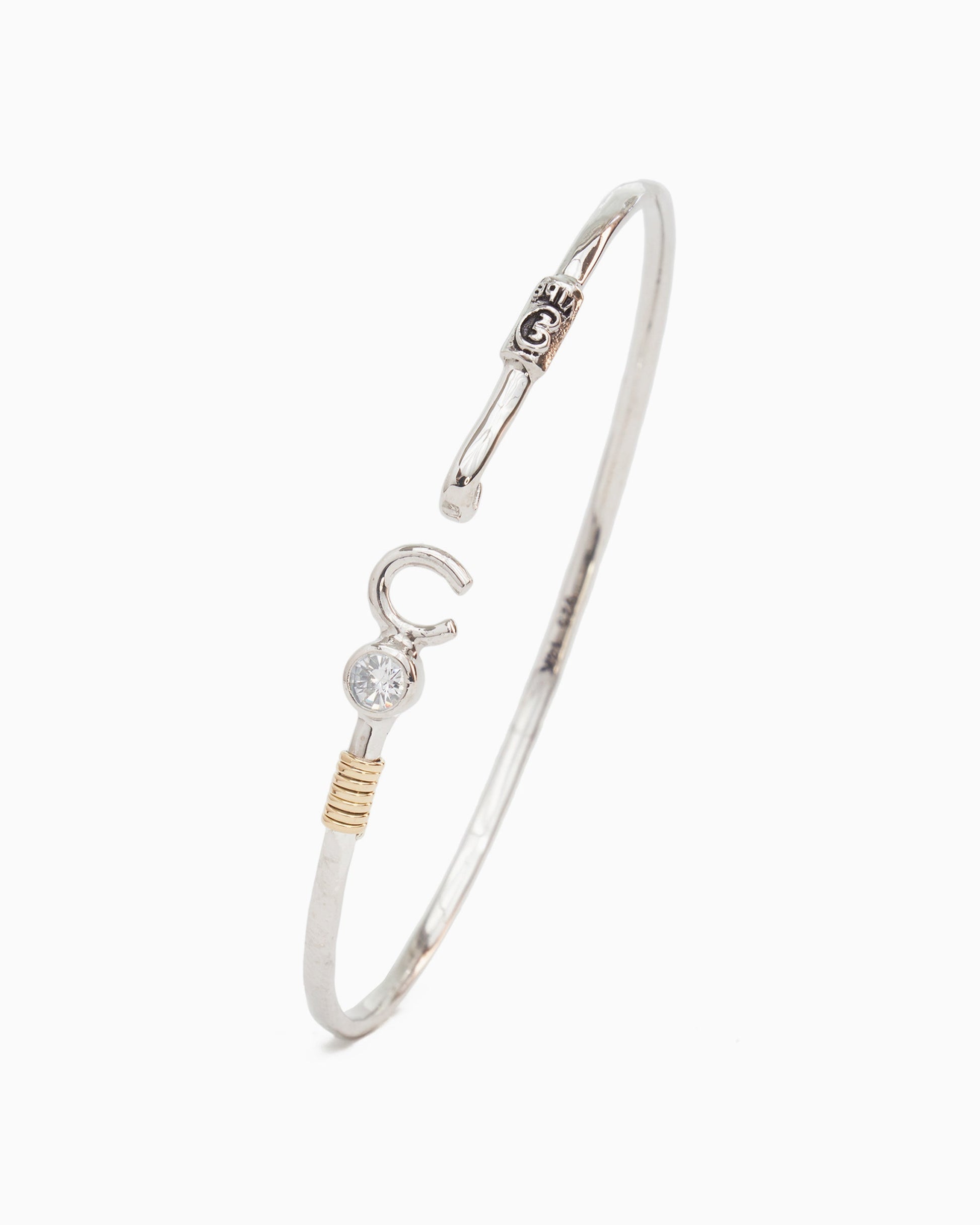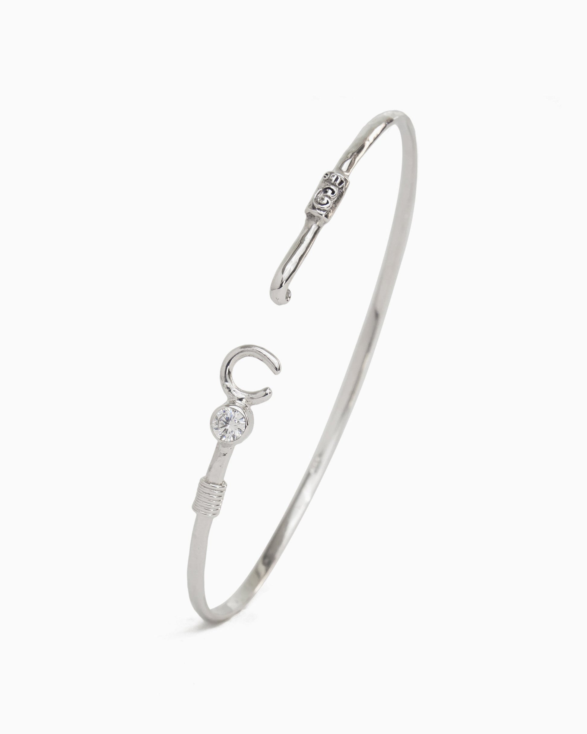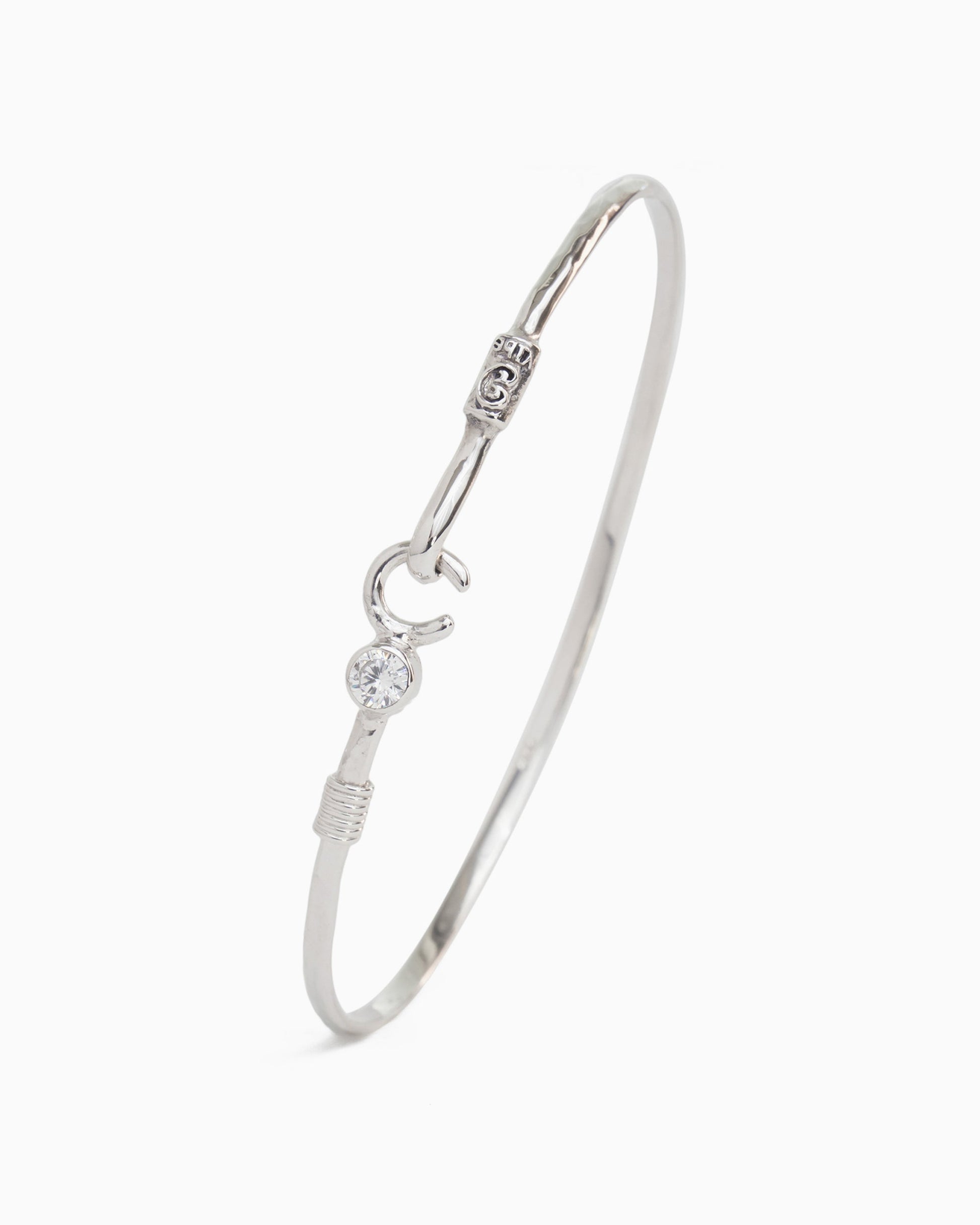 A Vibe signature, The Hook Bracelet with Stone is fashioned in gently hammered sterling silver with a faceted white zircon stone and "C" hook clasp. Featuring a replica of the St. John petroglyph and seven good luck wraps, solo or stacked, it is sure to be a favorite piece. Found in many of our designs, Vibe’s seven good luck wraps represent love, laughter, happiness, good fortune, health, unity, and peace. In the Caribbean tradition, wear your hook facing in to keep love close to your heart, and facing out if you are open to a new love in your life. Wear this piece on its own or stack it with other bracelets for a layered look.