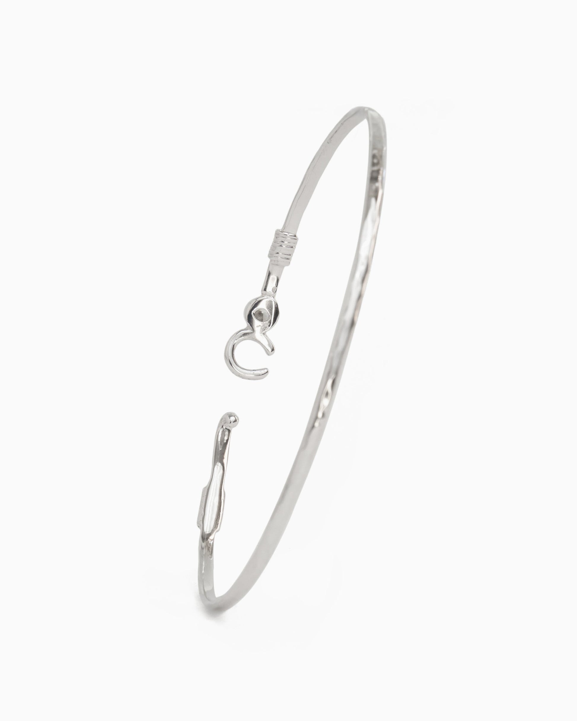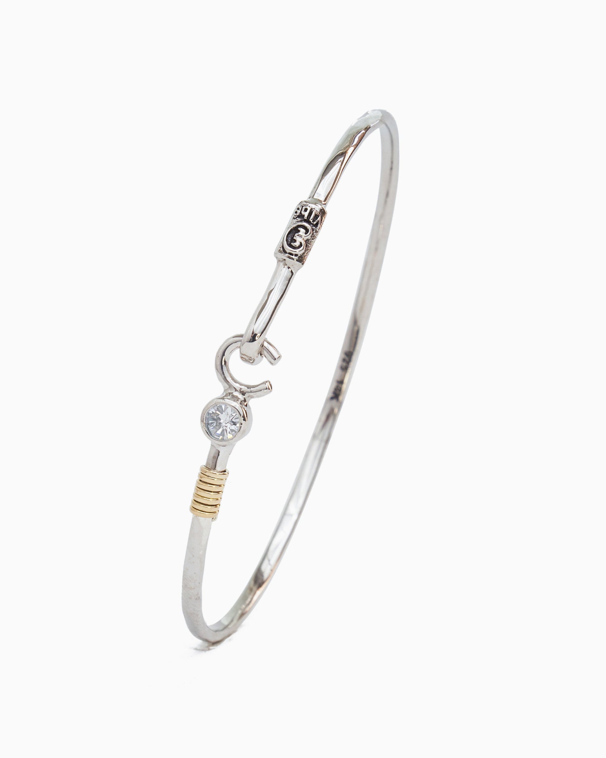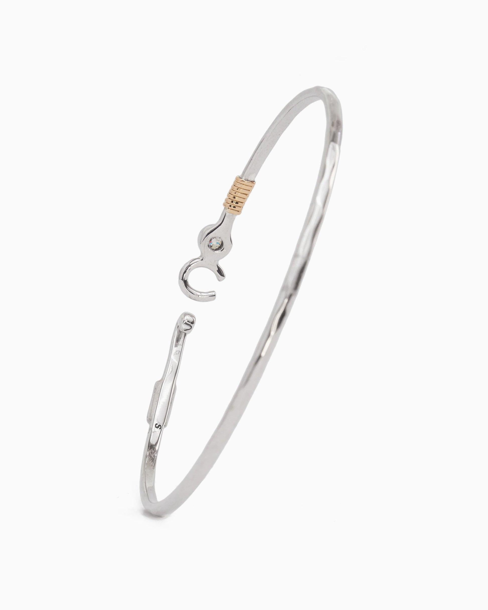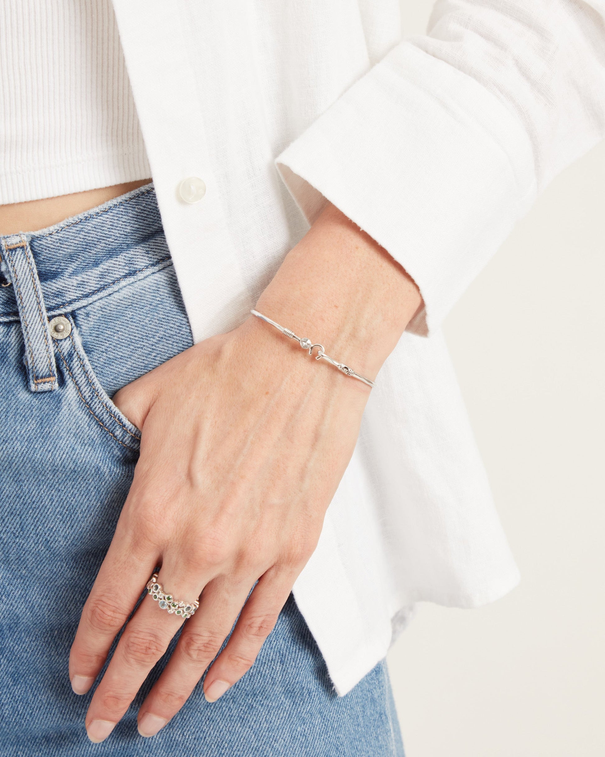 A Vibe signature, The Hook Bracelet with Stone is fashioned in gently hammered sterling silver with a faceted white zircon stone and "C" hook clasp. Featuring a replica of the St. John petroglyph and seven good luck wraps, solo or stacked, it is sure to be a favorite piece. Found in many of our designs, Vibe’s seven good luck wraps represent love, laughter, happiness, good fortune, health, unity, and peace. In the Caribbean tradition, wear your hook facing in to keep love close to your heart, and facing out if you are open to a new love in your life. Wear this piece on its own or stack it with other bracelets for a layered look.