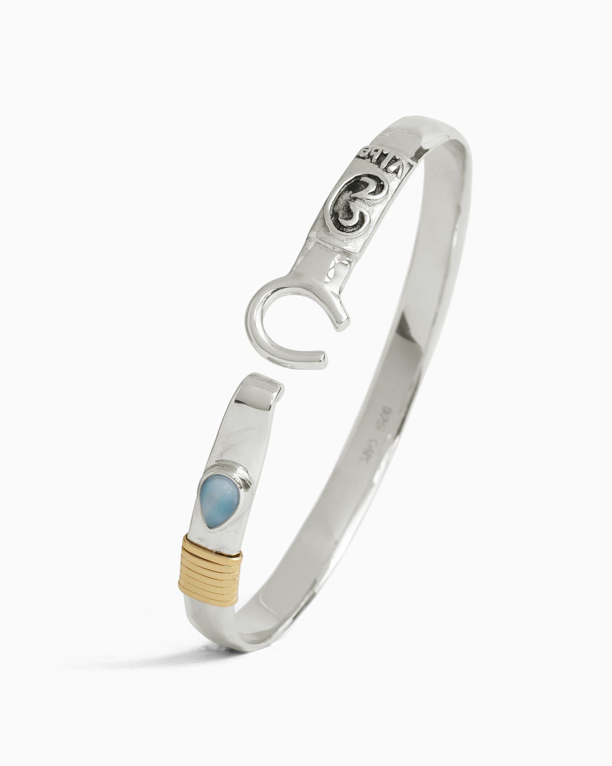 A Vibe signature, The Hook Bracelet with Stone is fashioned in gently hammered sterling silver with a pear-shaped larimar cabochon and 14K gold "C" hook clasp. Featuring a replica of the St. John petroglyph and seven 14K gold good luck wraps, solo or stacked, it is sure to be a favorite statement piece. Found in many of our designs, Vibe’s seven good luck wraps represent love, laughter, happiness, good fortune, health, unity, and peace. In the Caribbean tradition, wear your hook facing in to keep love close to your heart, and facing out if you are open to a new love in your life. Wear this piece on its own or stack it with other bracelets for a layered look. For added fun, embellish your new hook bracelet with one or more of Vibe's fun and unique charms!