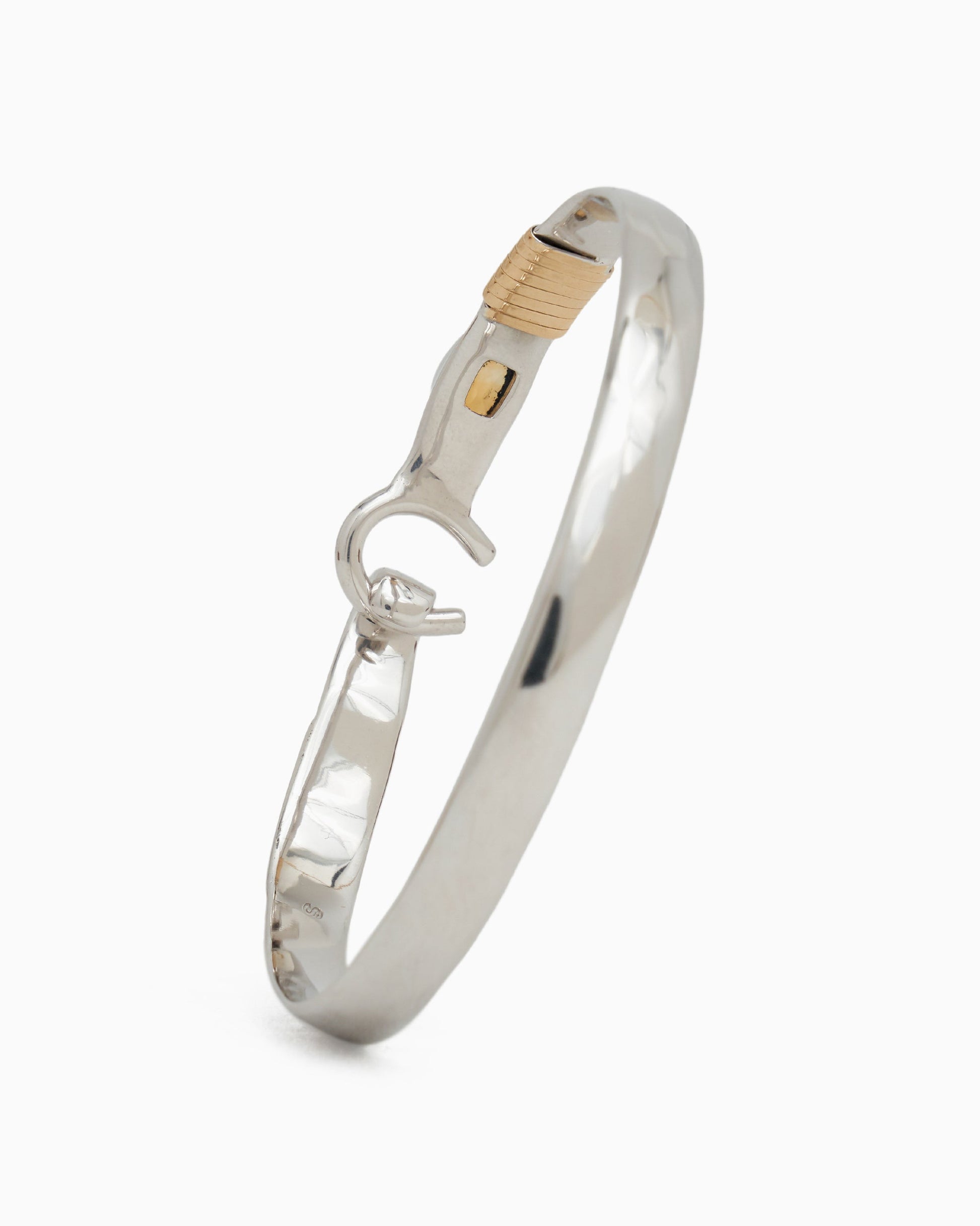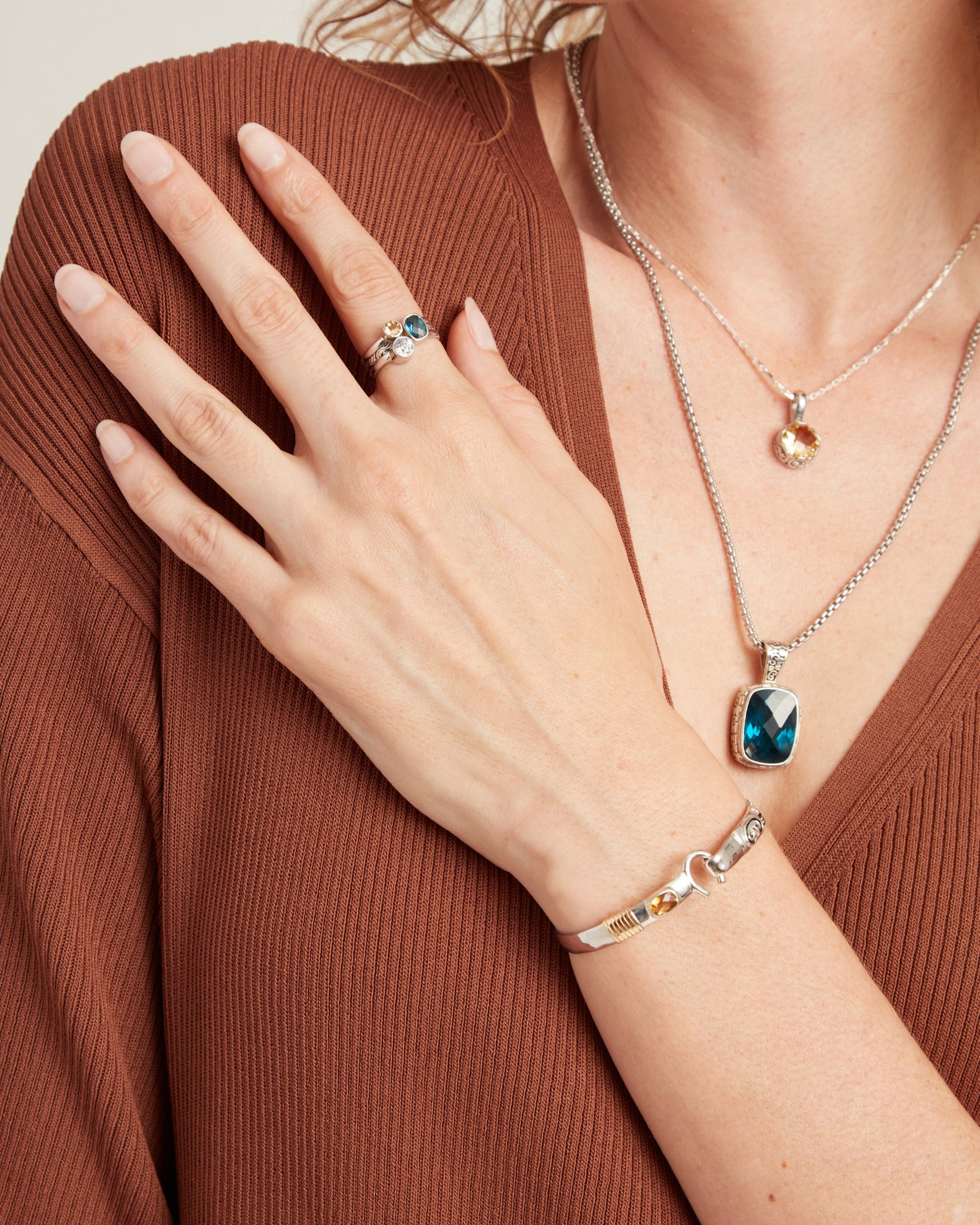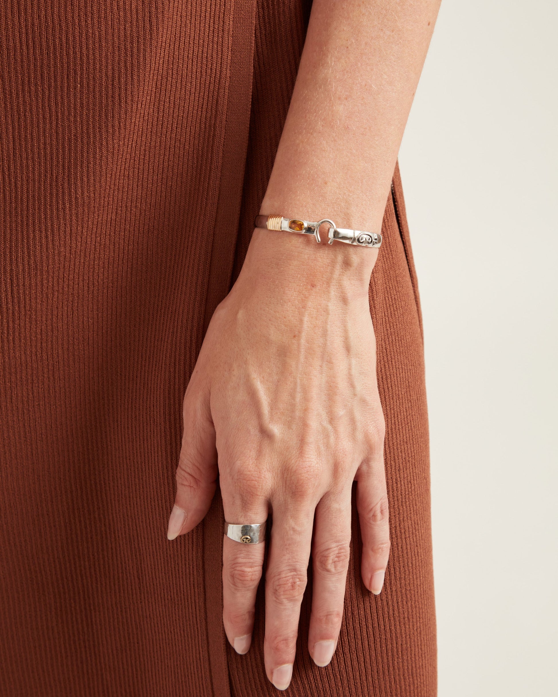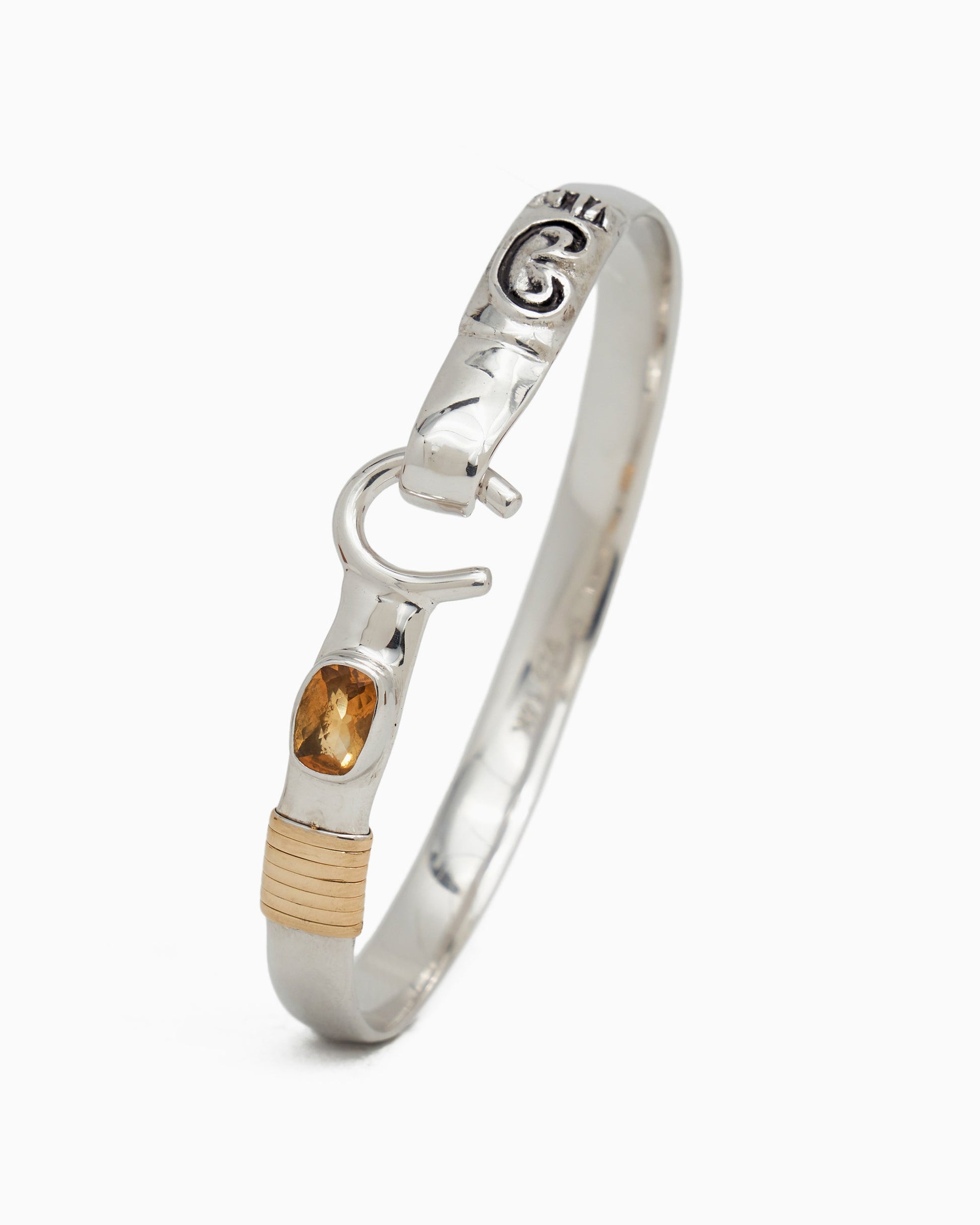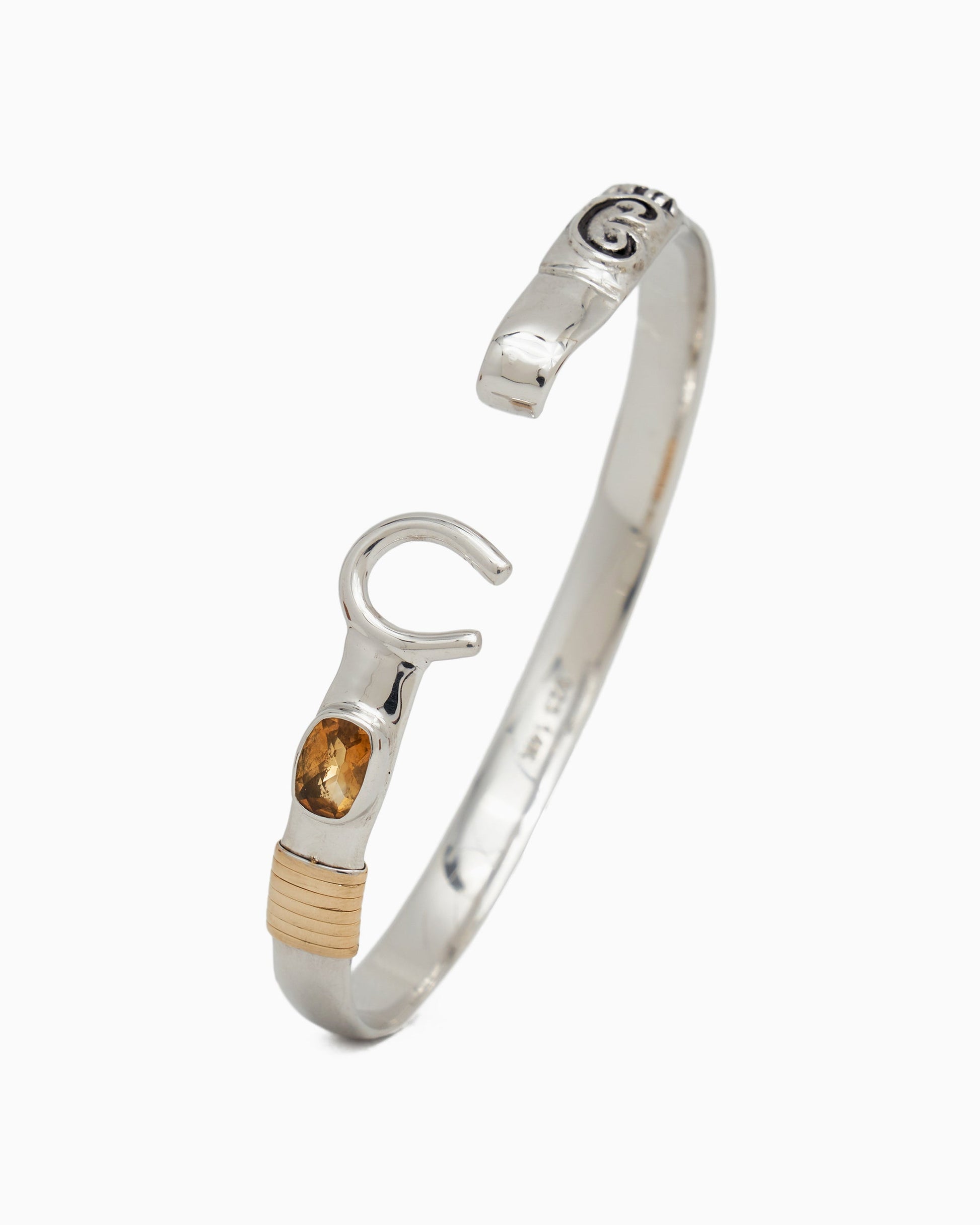 A Vibe signature, The Hook Bracelet with Stone is fashioned in gently hammered sterling silver with a faceted citrine stone and "C" hook clasp. Featuring a replica of the St. John petroglyph and seven 14K gold good luck wraps, solo or stacked, it is sure to be a favorite statement piece. Found in many of our designs, Vibe’s seven good luck wraps represent love, laughter, happiness, good fortune, health, unity, and peace. In the Caribbean tradition, wear your hook facing in to keep love close to your heart, and facing out if you are open to a new love in your life. Wear this piece on its own or stack it with other bracelets for a layered look.