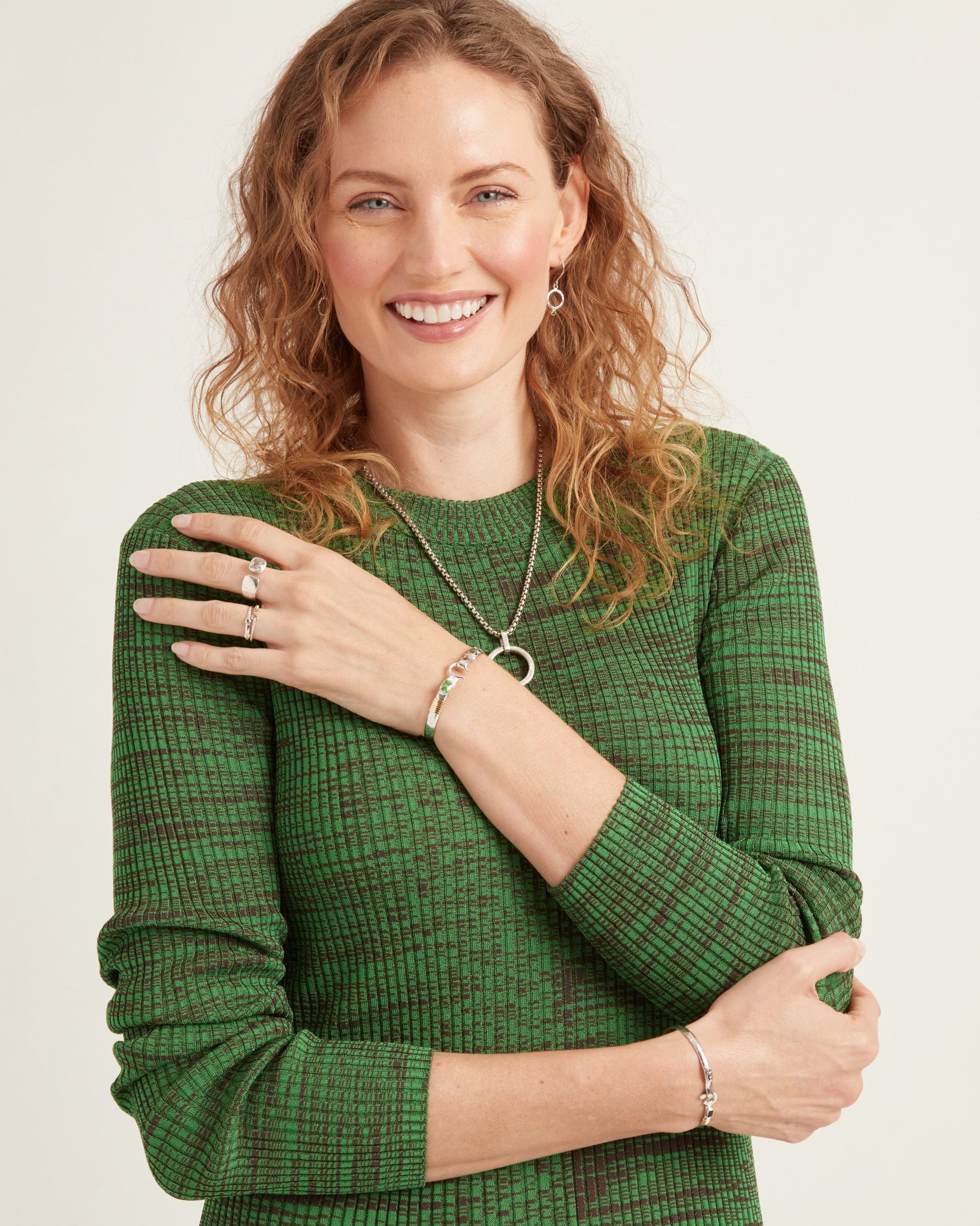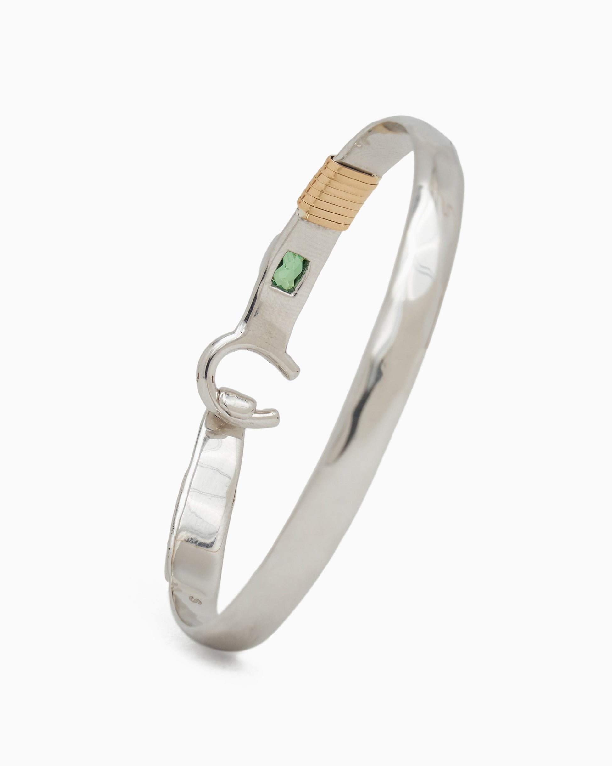A Vibe signature, The Hook Bracelet with Stone is fashioned in gently hammered sterling silver with a faceted green zircon stone and "C" hook clasp. Featuring a replica of the St. John petroglyph and seven 14K gold good luck wraps, solo or stacked, it is sure to be a favorite statement piece. Found in many of our designs, Vibe’s seven good luck wraps represent love, laughter, happiness, good fortune, health, unity, and peace. In the Caribbean tradition, wear your hook facing in to keep love close to your heart, and facing out if you are open to a new love in your life. Wear this piece on its own or stack it with other bracelets for a layered look.