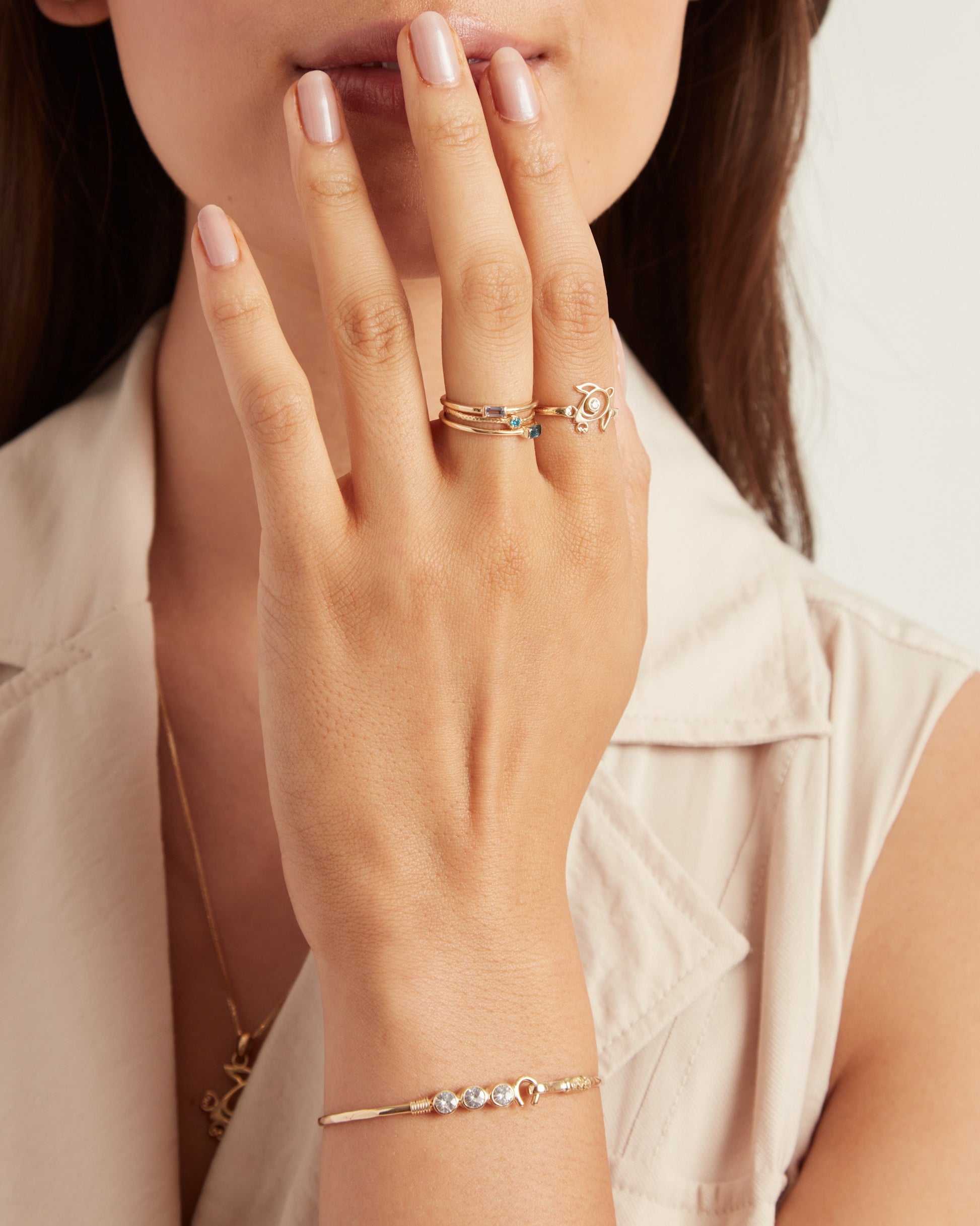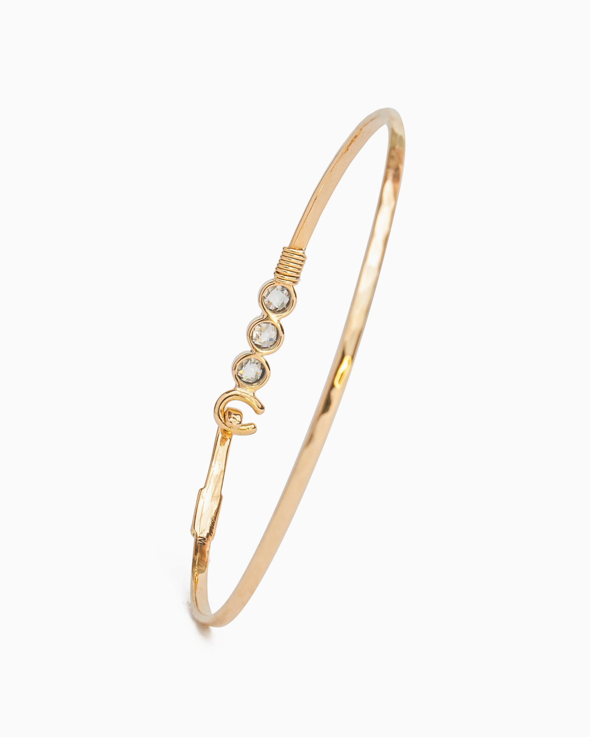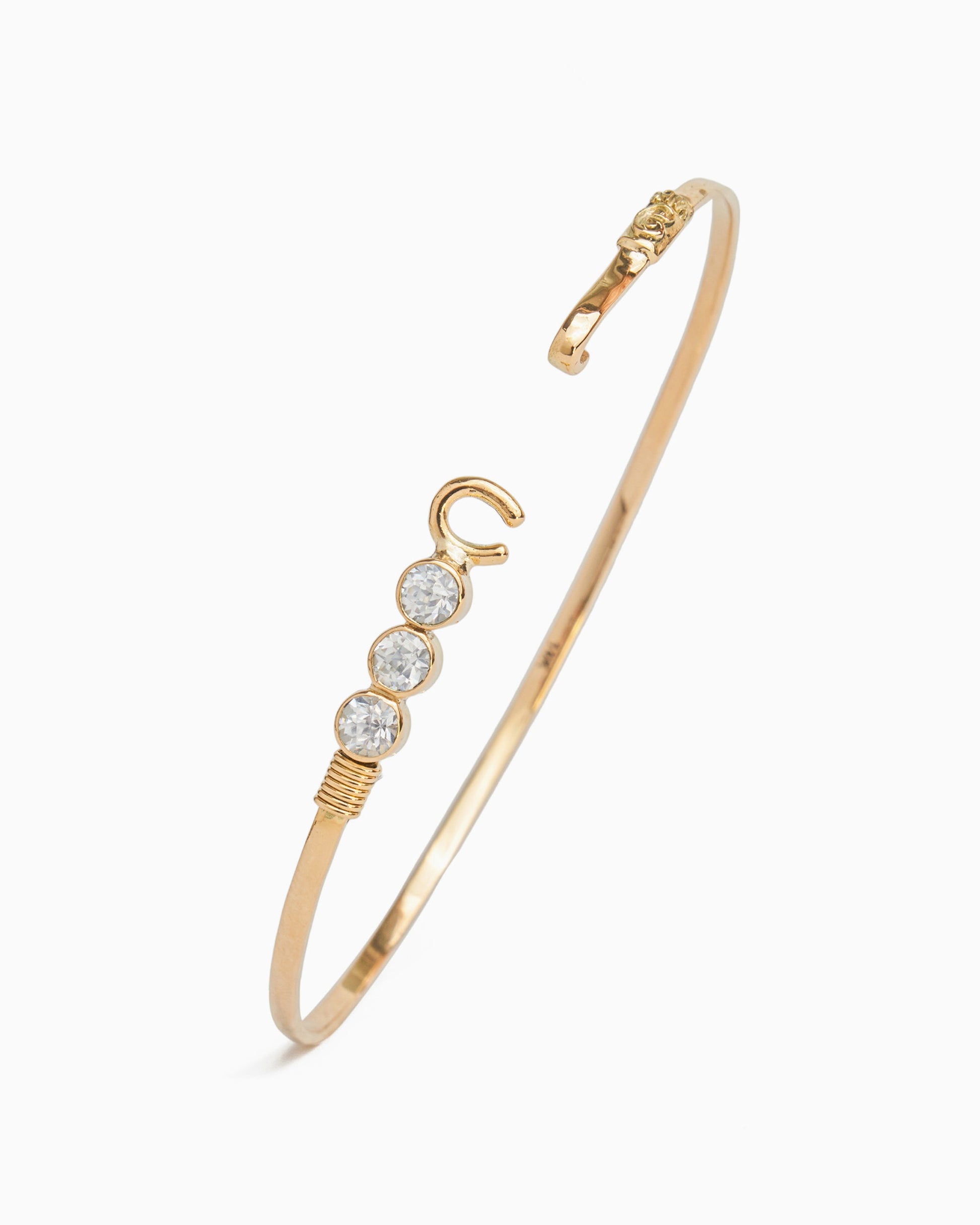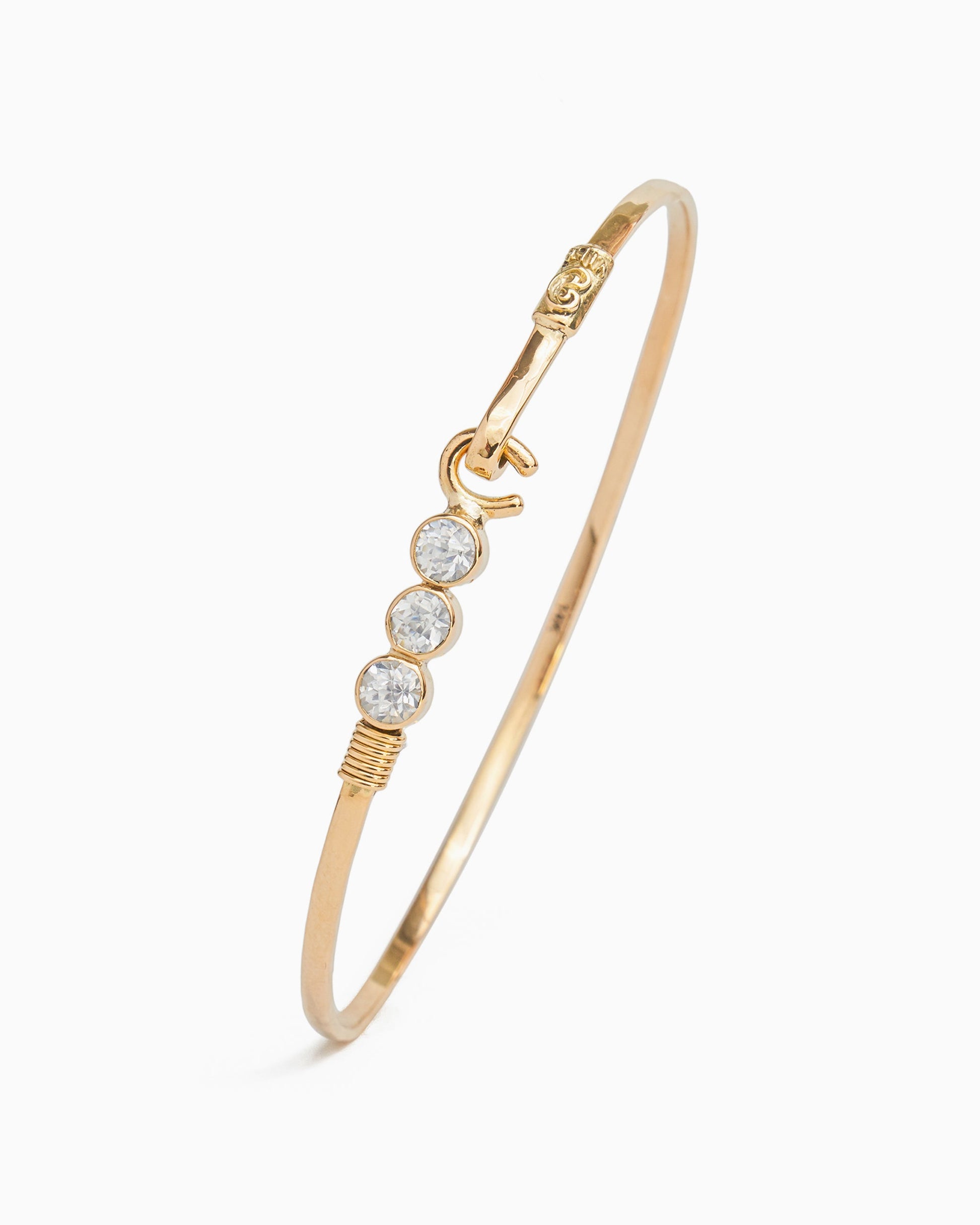 A Vibe signature, The Hook Bracelet with Triple Stones is fashioned in gently hammered 14K solid gold with three faceted white zircon stones and a "C" hook clasp. Each stone is a tribute to one of the three iconic U.S. Virgin Islands: St. John, St. Thomas, and St. Croix. Featuring a replica of the St. John petroglyph and seven good luck wraps, solo or stacked, it is sure to be a favorite piece. Found in many of our designs, Vibe’s seven good luck wraps represent love, laughter, happiness, good fortune, health, unity, and peace. In the Caribbean tradition, wear your hook facing in to keep love close to your heart, and facing out if you are open to a new love in your life. Wear this piece on its own or stack it with other bracelets for a layered look.
