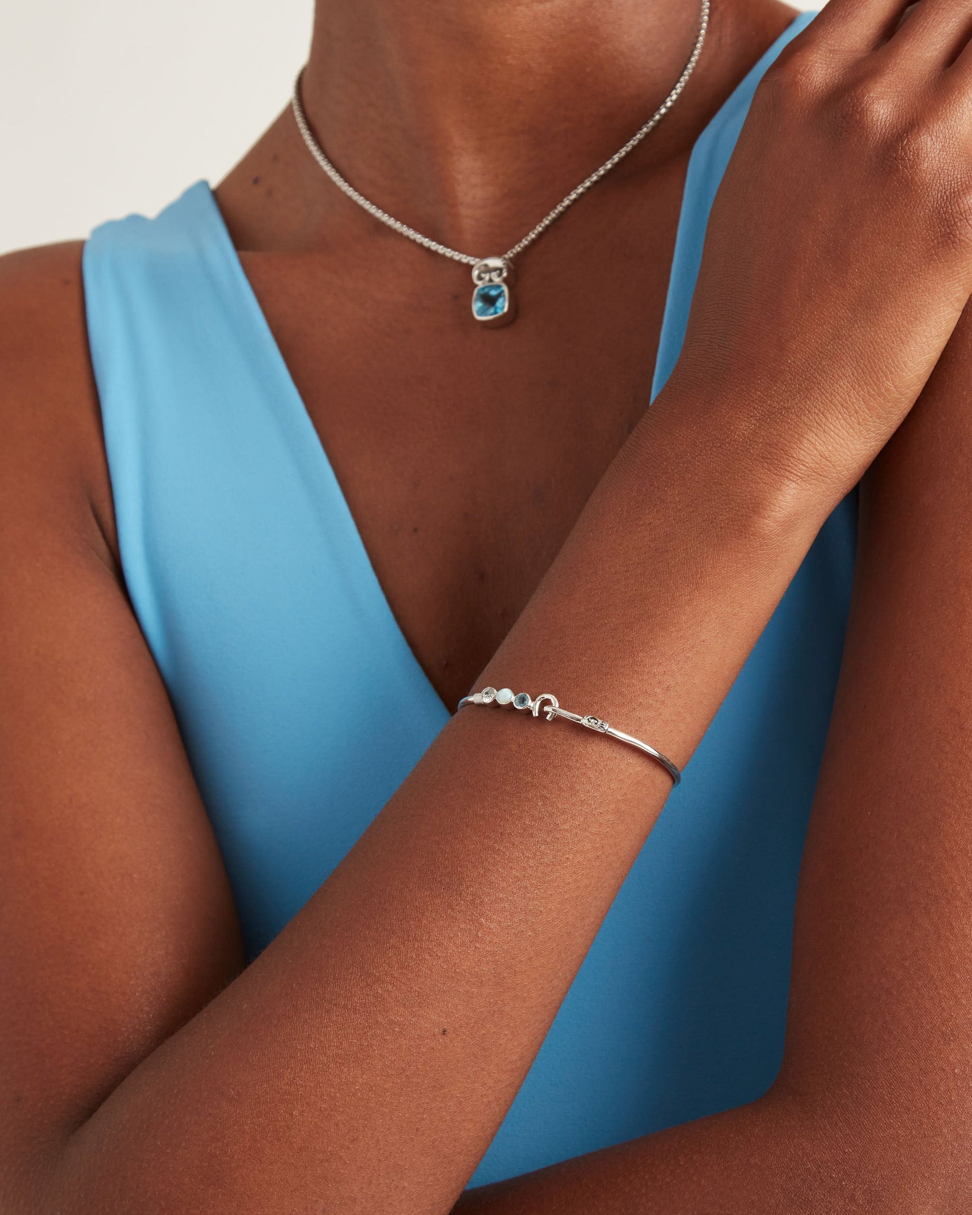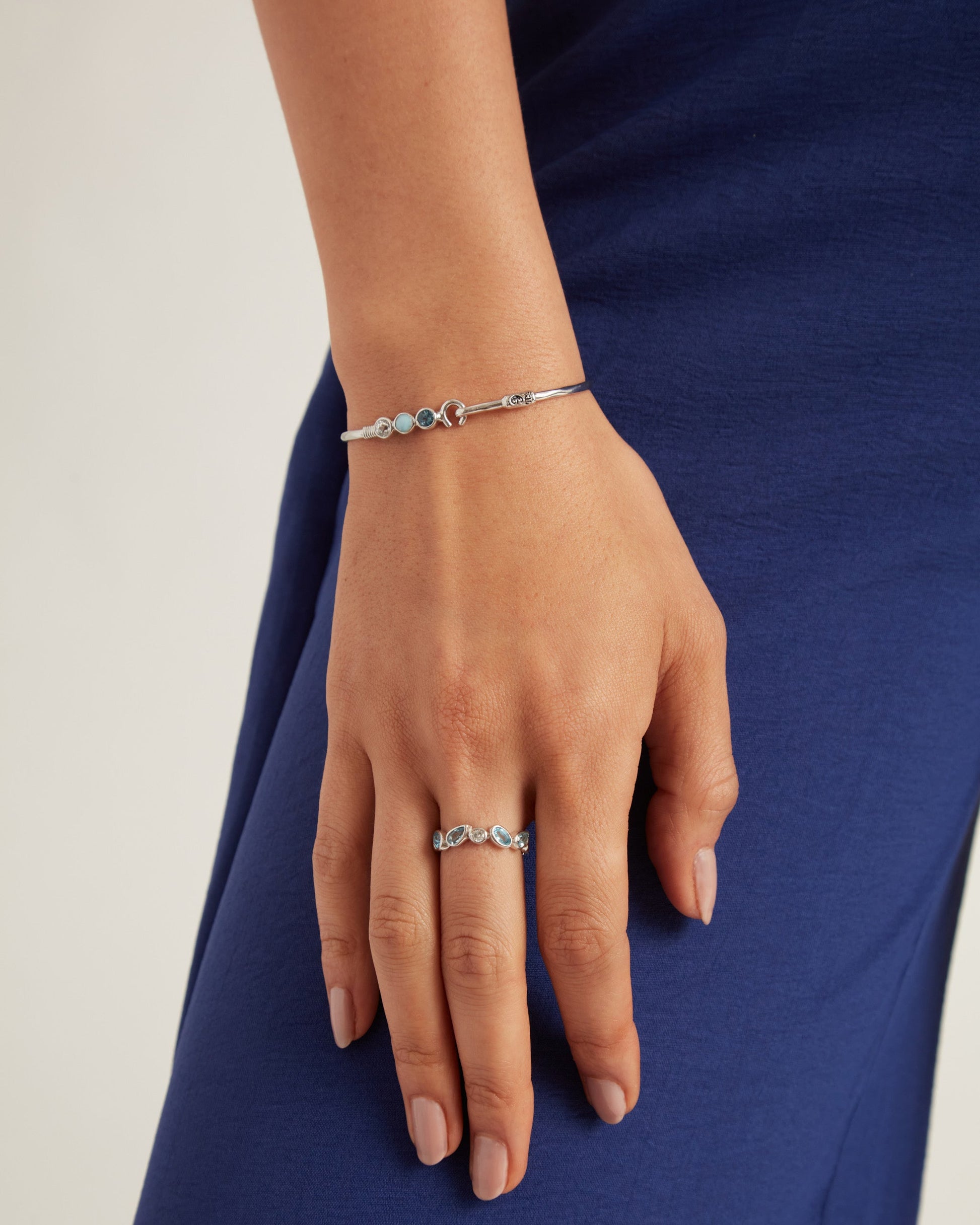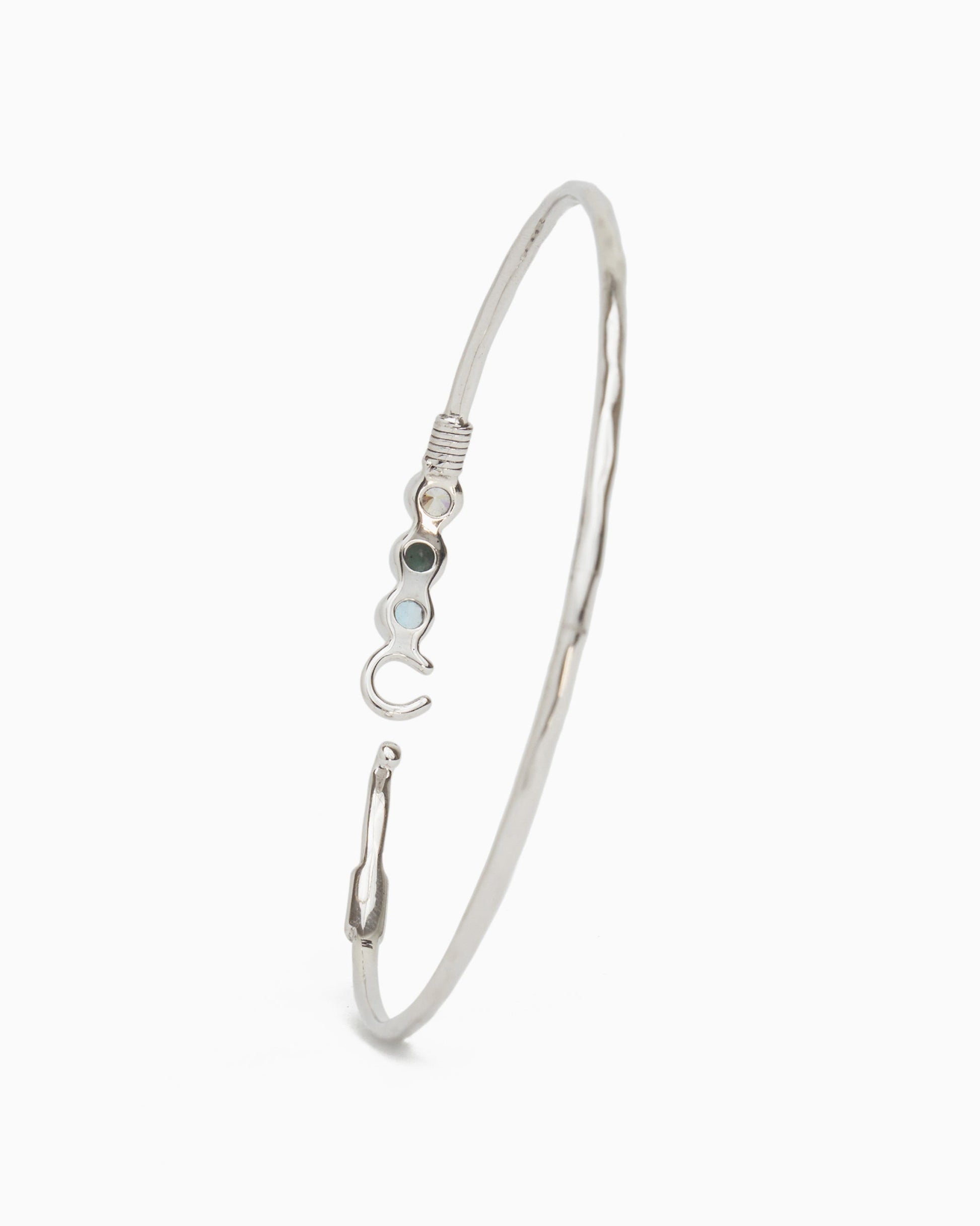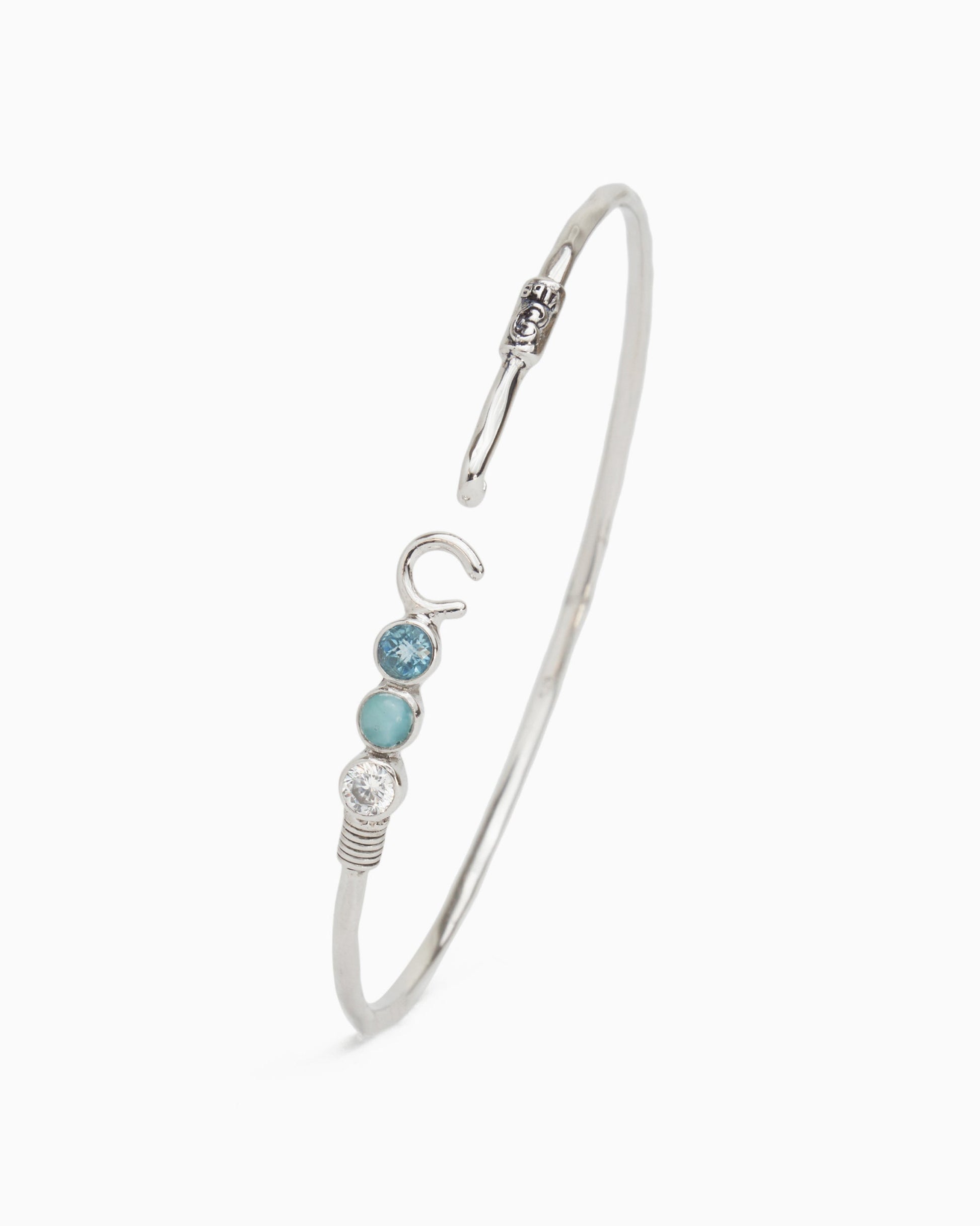 A Vibe signature, The Hook Bracelet with Triple Stones is fashioned in gently hammered sterling silver with three stones and a "C" hook clasp. Each stone is a tribute to one of the three iconic U.S. Virgin Islands: St. John, St. Thomas, and St. Croix. Featuring a replica of the St. John petroglyph and seven good luck wraps, solo or stacked, it is sure to be a favorite piece. Found in many of our designs, Vibe’s seven good luck wraps represent love, laughter, happiness, good fortune, health, unity, and peace. In the Caribbean tradition, wear your hook facing in to keep love close to your heart, and facing out if you are open to a new love in your life. Wear this piece on its own or stack it with other bracelets for a layered look.