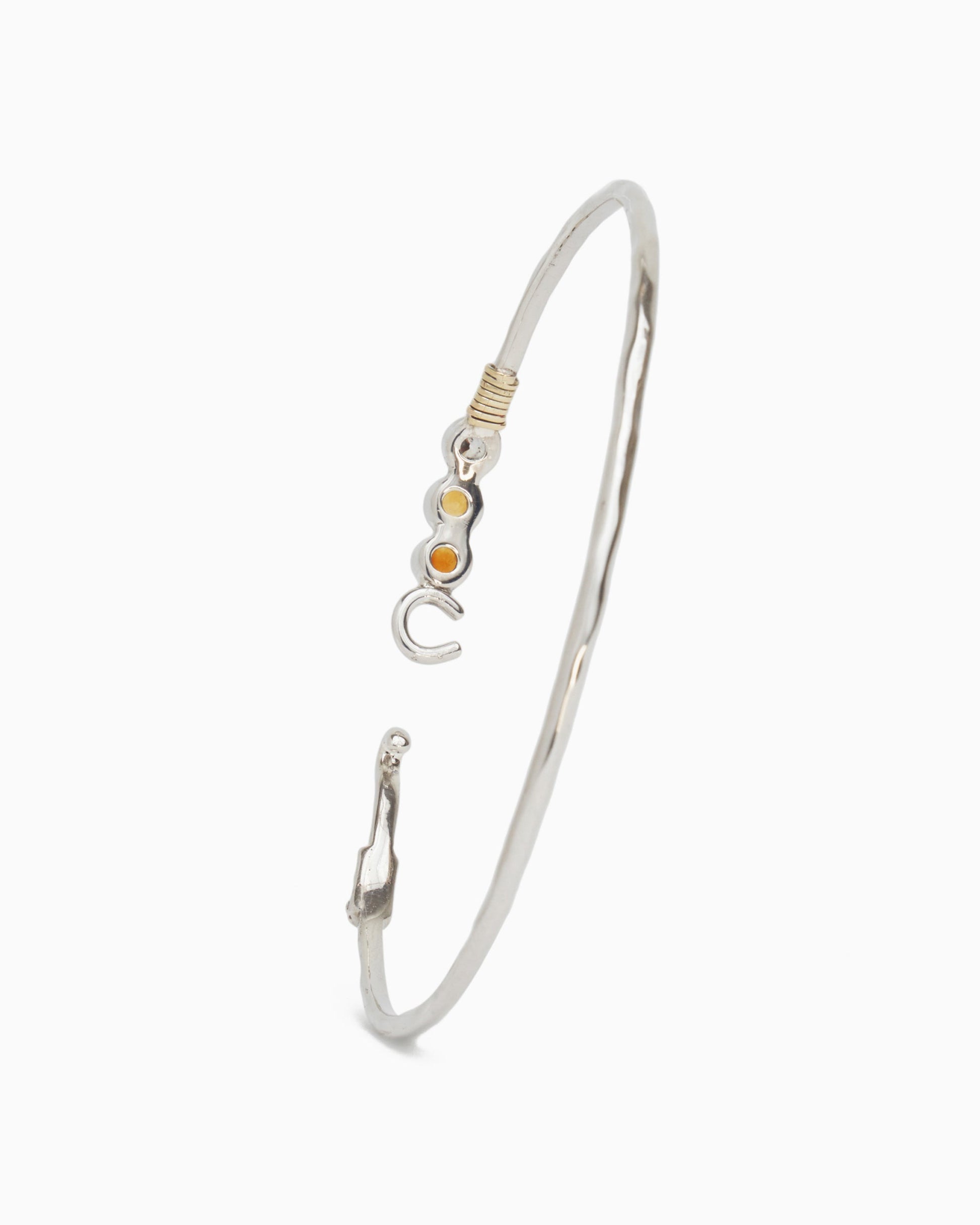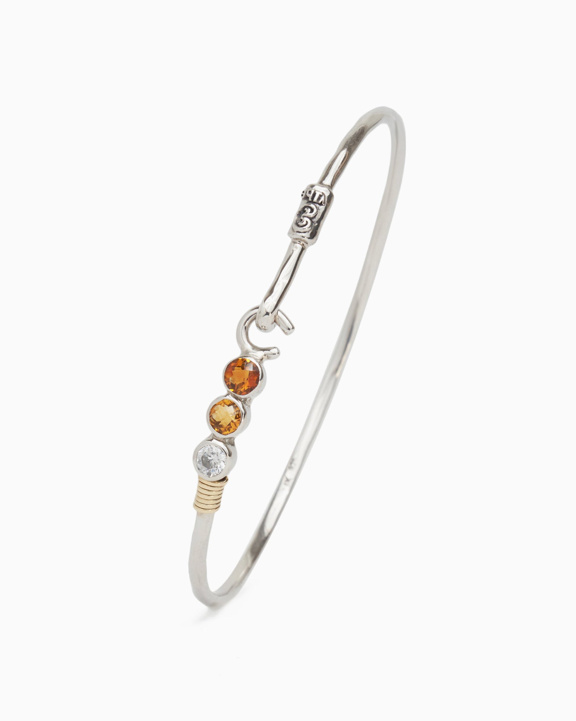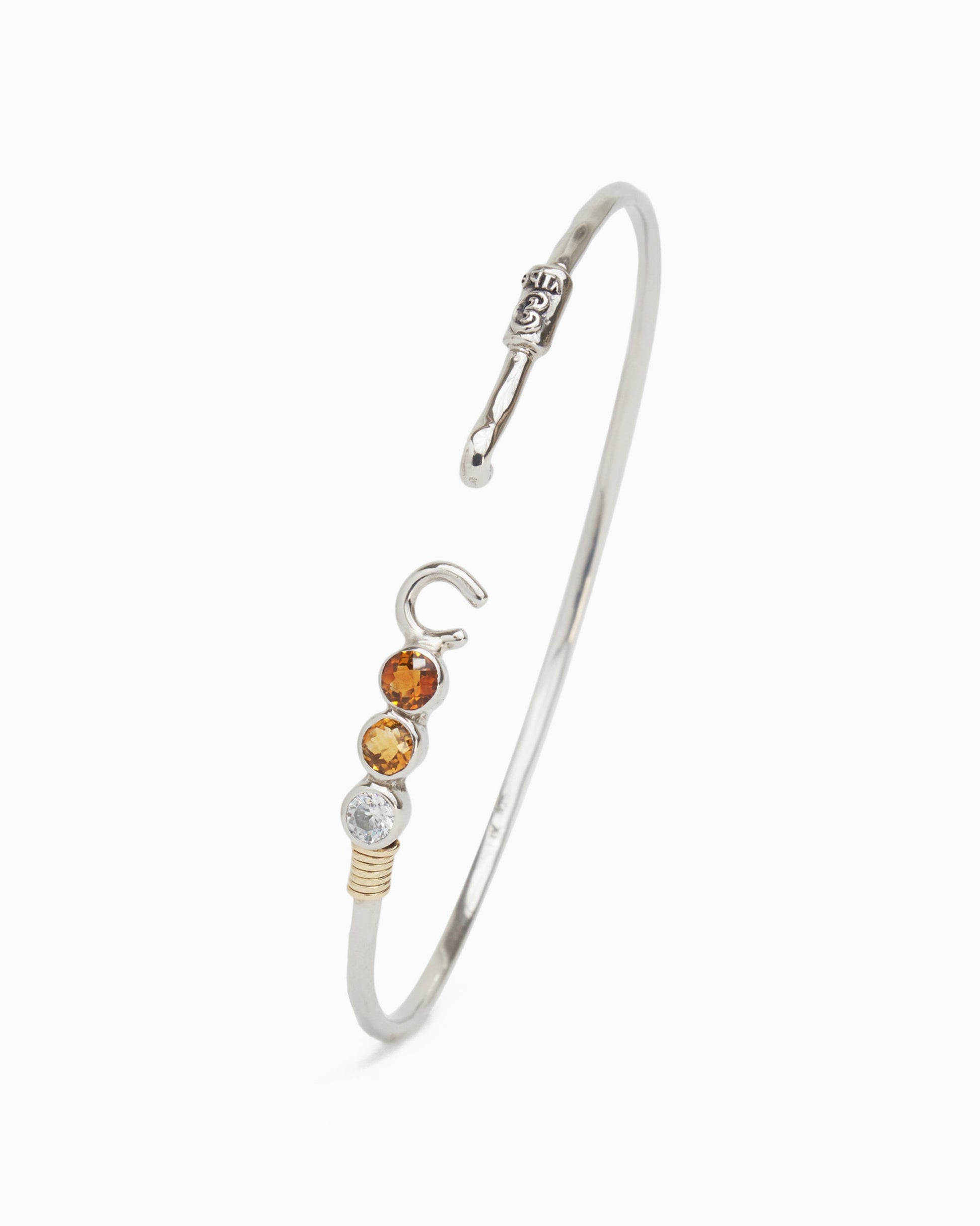 A Vibe signature, The Hook Bracelet with Triple Stones is fashioned in gently hammered sterling silver with three faceted stones and a "C" hook clasp. Each stone is a tribute to one of the three iconic U.S. Virgin Islands: St. John, St. Thomas, and St. Croix. Featuring a replica of the St. John petroglyph and seven 14K gold good luck wraps, solo or stacked, it is sure to be a favorite piece. Found in many of our designs, Vibe’s seven good luck wraps represent love, laughter, happiness, good fortune, health, unity, and peace. In the Caribbean tradition, wear your hook facing in to keep love close to your heart, and facing out if you are open to a new love in your life. Wear this piece on its own or stack it with other bracelets for a layered look.