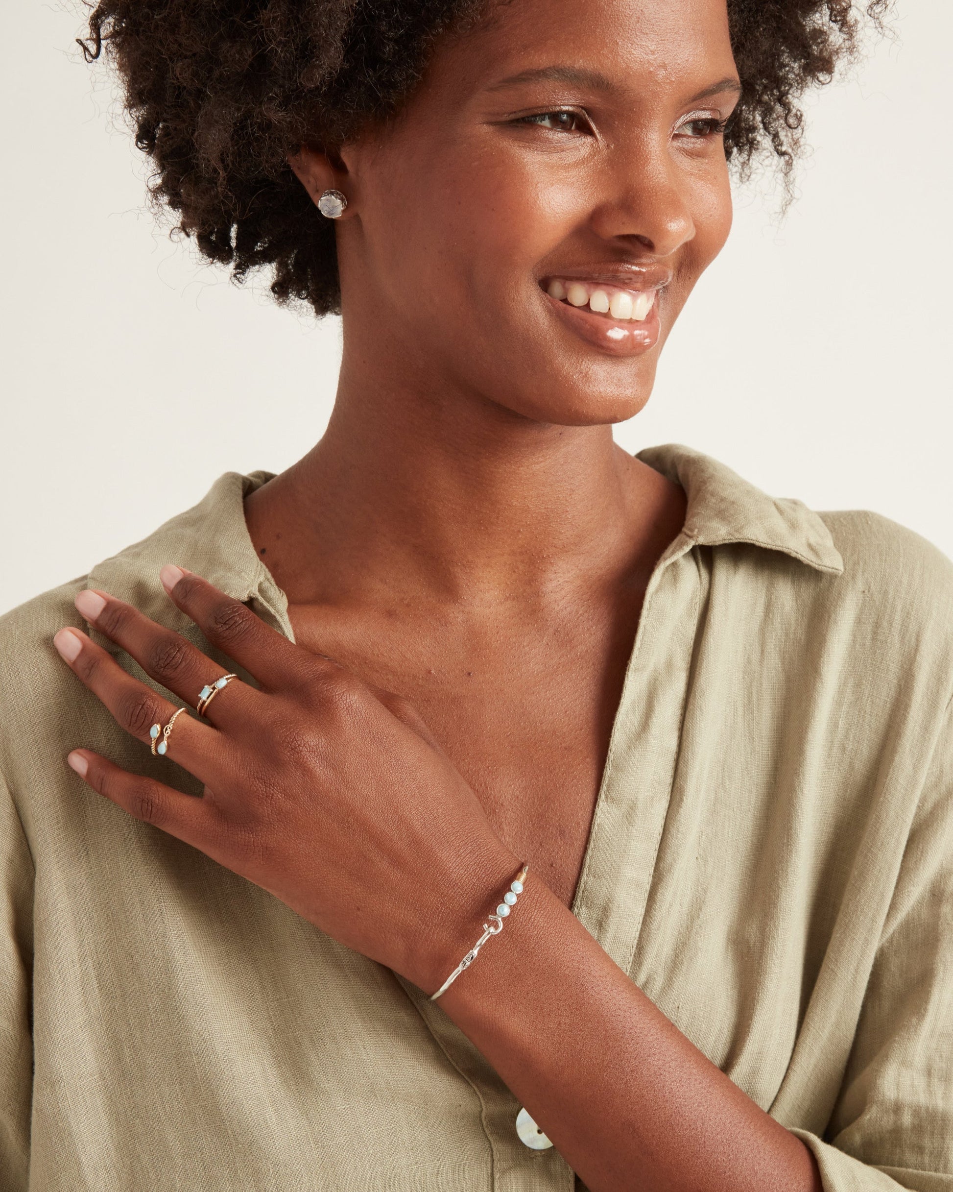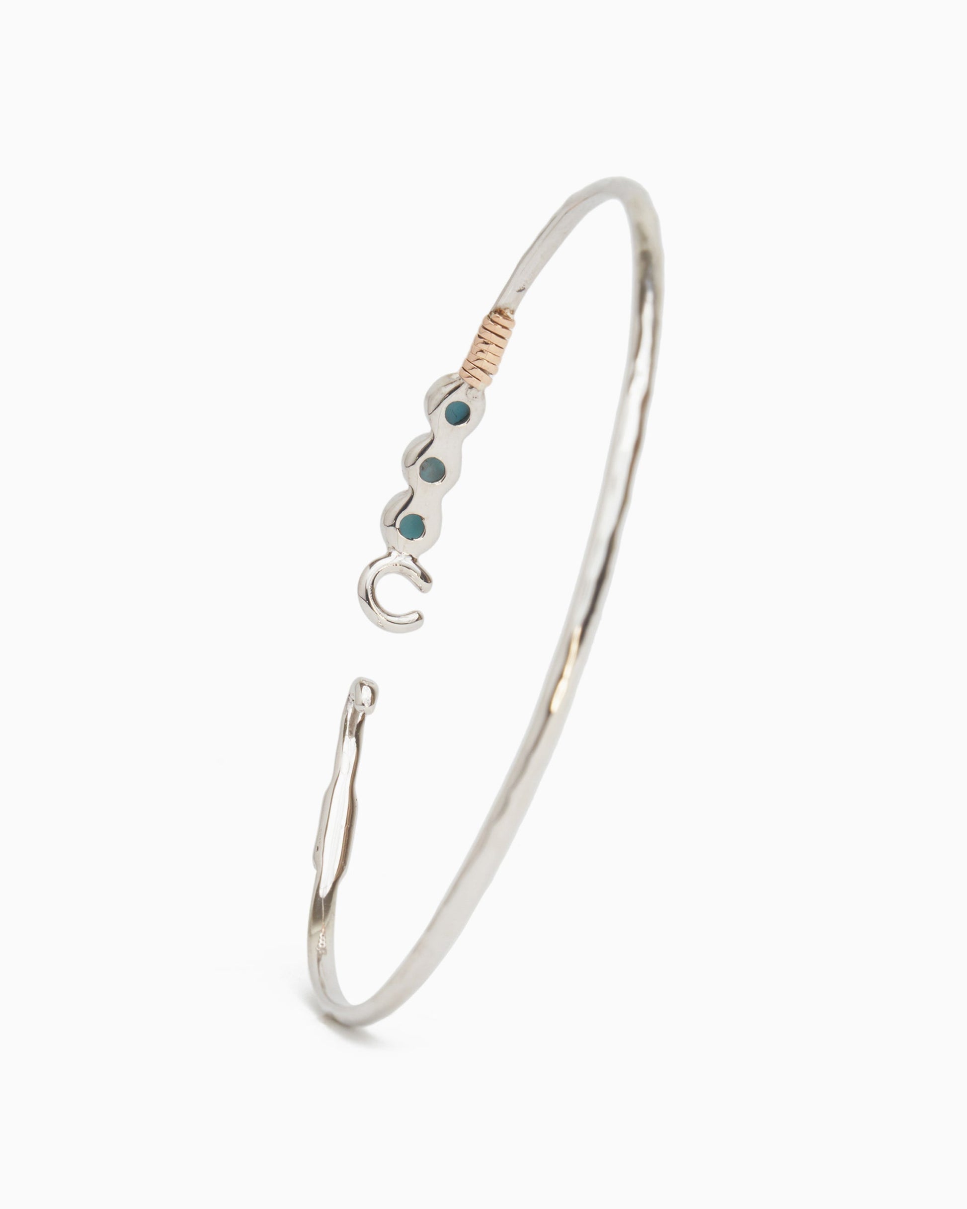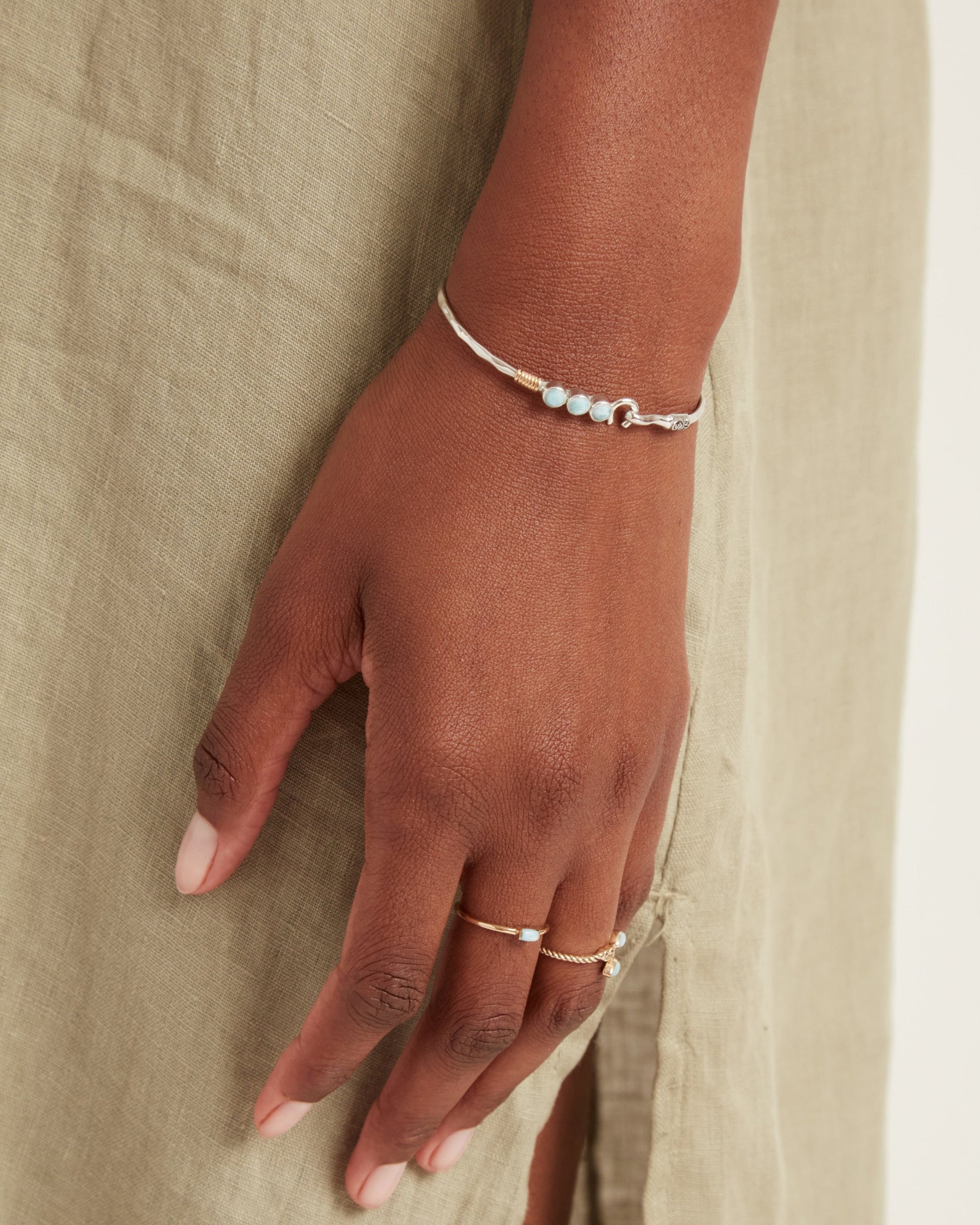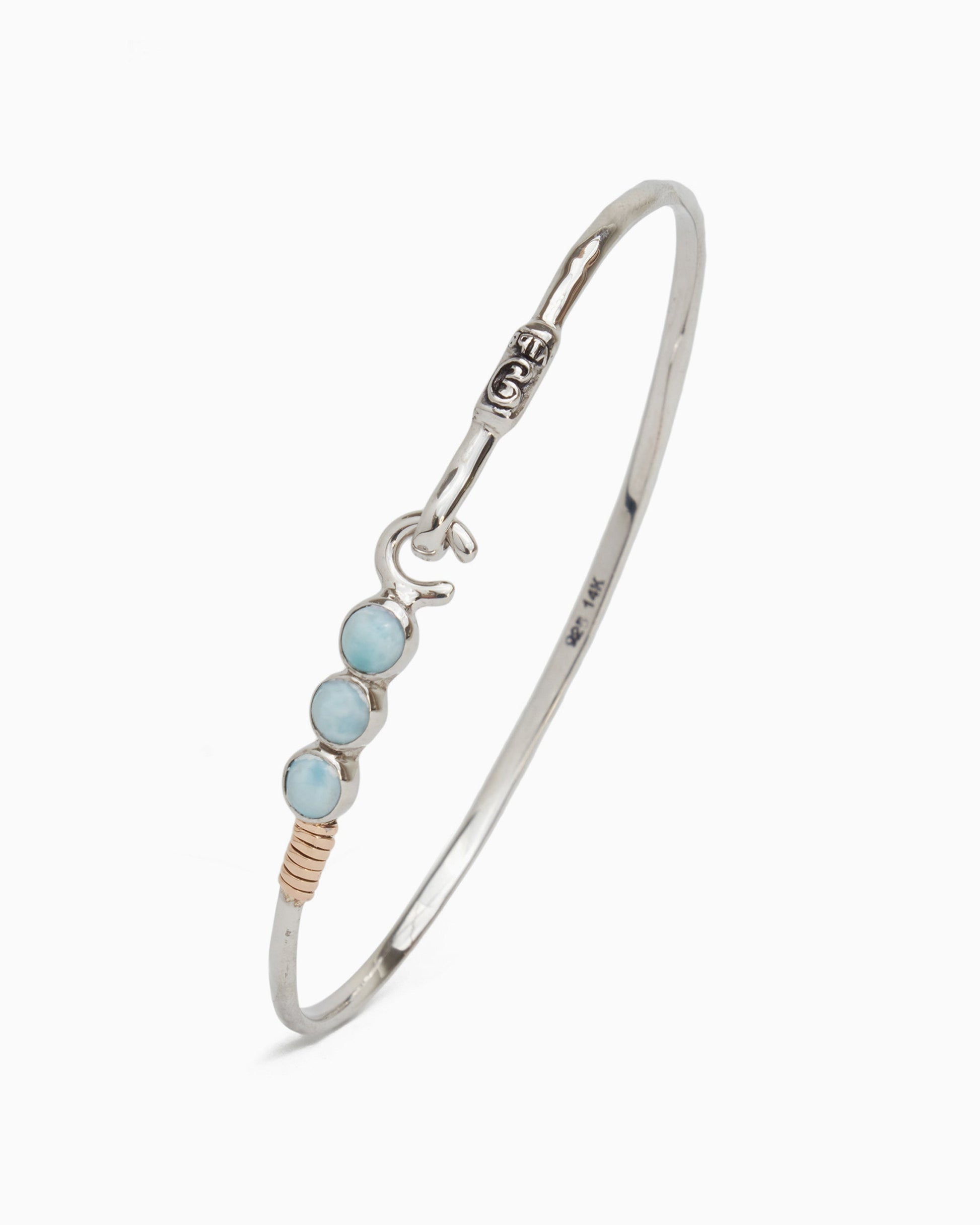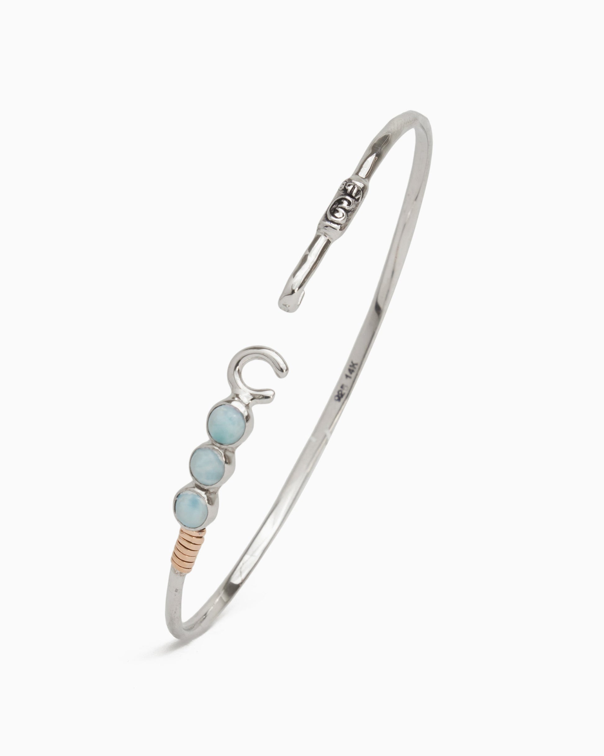 A Vibe signature, The Hook Bracelet with Triple Stones is fashioned in gently hammered sterling silver with three larimar cabochons and a "C" hook clasp. Each stone is a tribute to one of the three iconic U.S. Virgin Islands: St. John, St. Thomas, and St. Croix. Featuring a replica of the St. John petroglyph and seven 14K gold good luck wraps, solo or stacked, it is sure to be a favorite piece. Found in many of our designs, Vibe’s seven good luck wraps represent love, laughter, happiness, good fortune, health, unity, and peace. In the Caribbean tradition, wear your hook facing in to keep love close to your heart, and facing out if you are open to a new love in your life. Wear this piece on its own or stack it with other bracelets for a layered look.