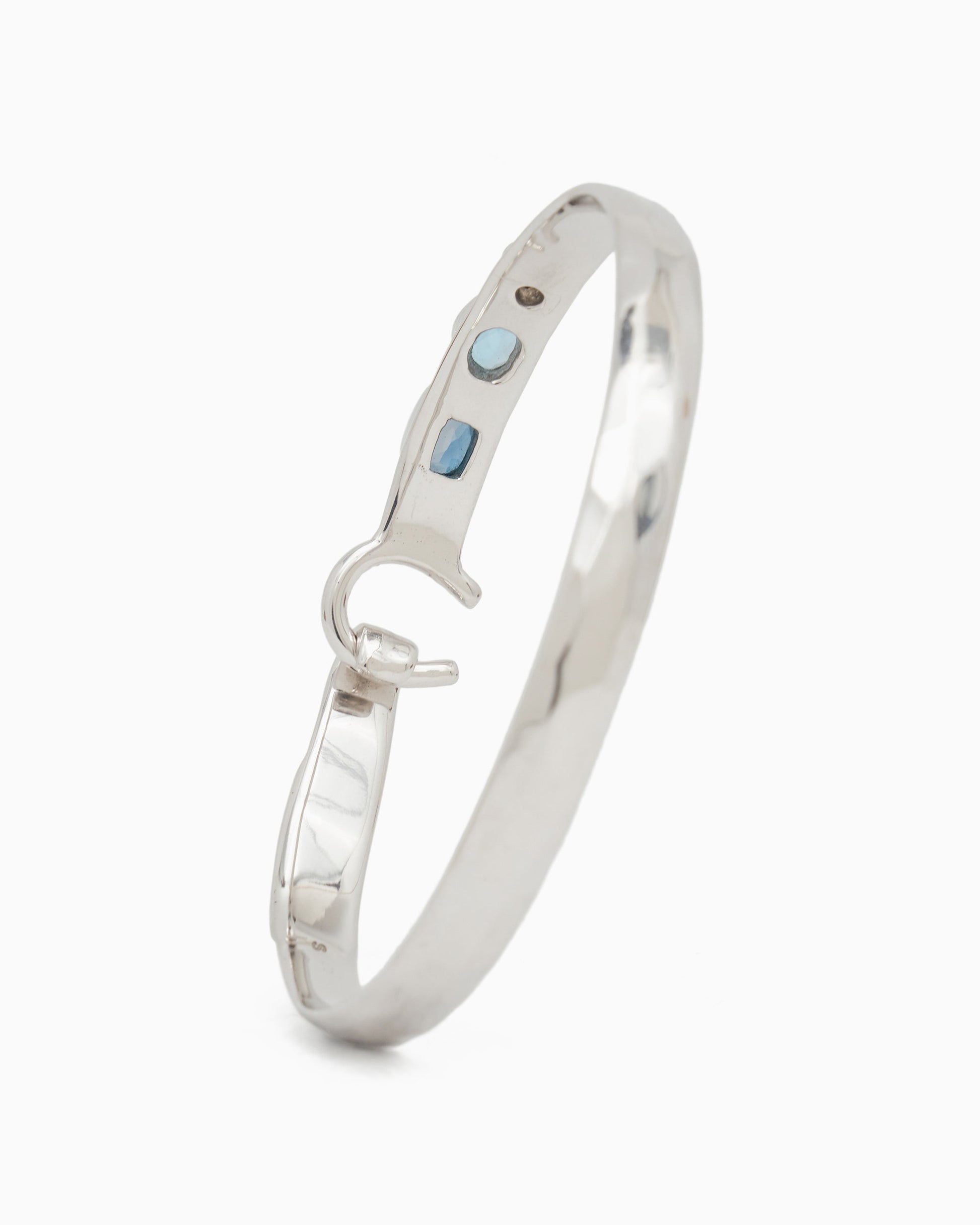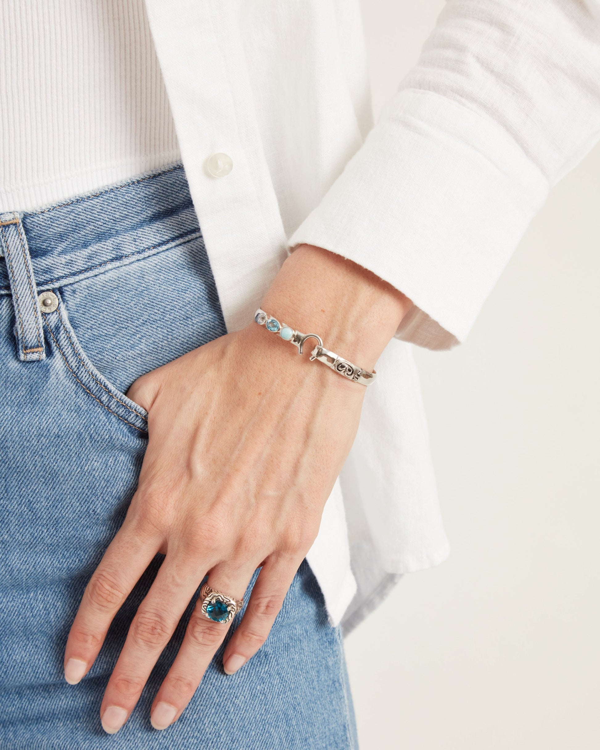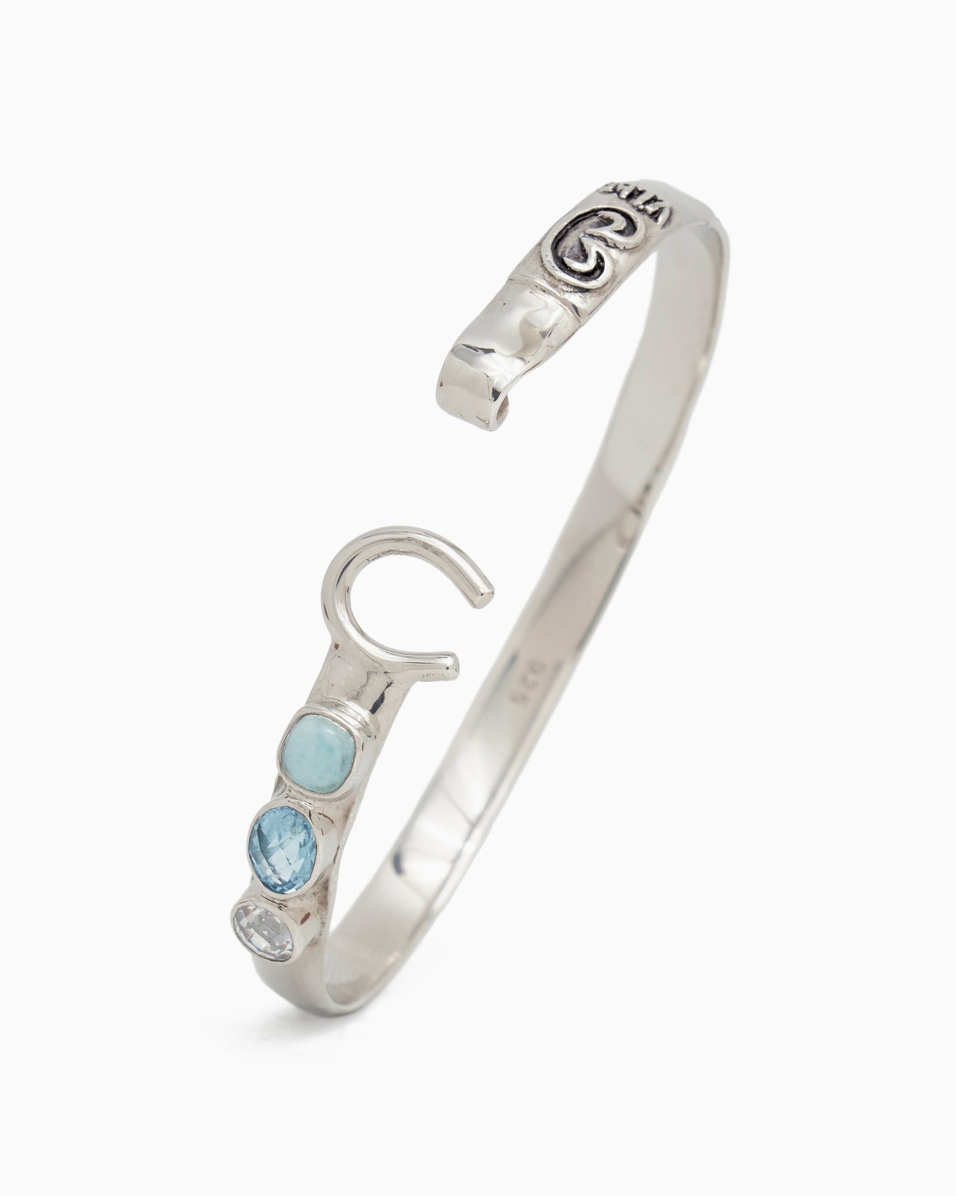 A Vibe signature, this widest version of The Hook Bracelet with Triple Stones is fashioned in gently hammered sterling silver with three stones, a St. John petroglyph, and a "C" hook clasp. Each stone is a tribute to one of the three iconic U.S. Virgin Islands: St. John, St. Thomas, and St. Croix. Solo or stacked, it is sure to be a favorite statement piece. In the Caribbean tradition, wear your hook facing in to keep love close to your heart, and facing out if you are open to a new love in your life. Wear this piece on its own or stack it with other bracelets for a layered look. For added fun, embellish your new hook bracelet with one or more of Vibe's fun and unique charms!