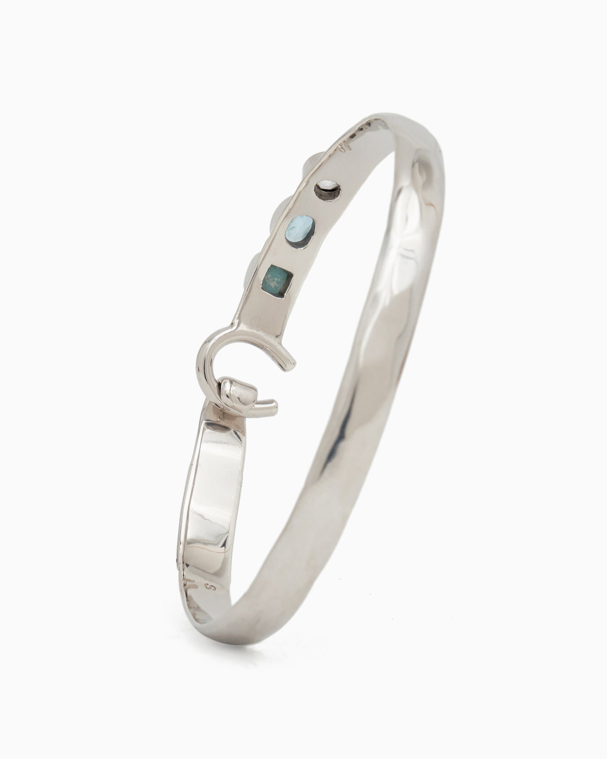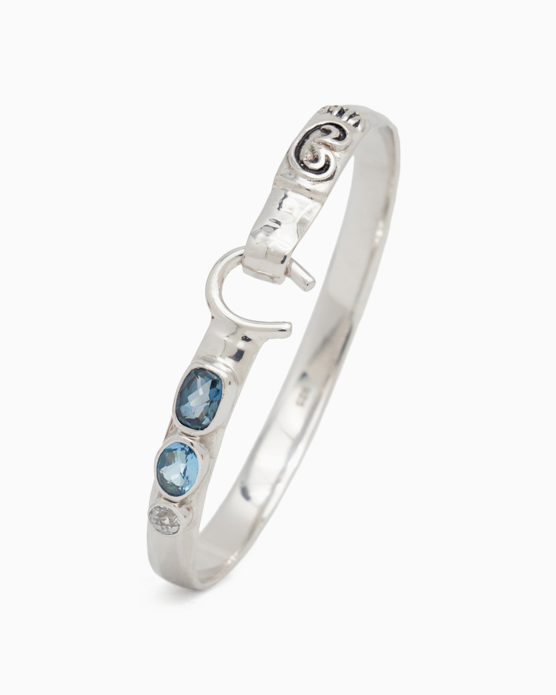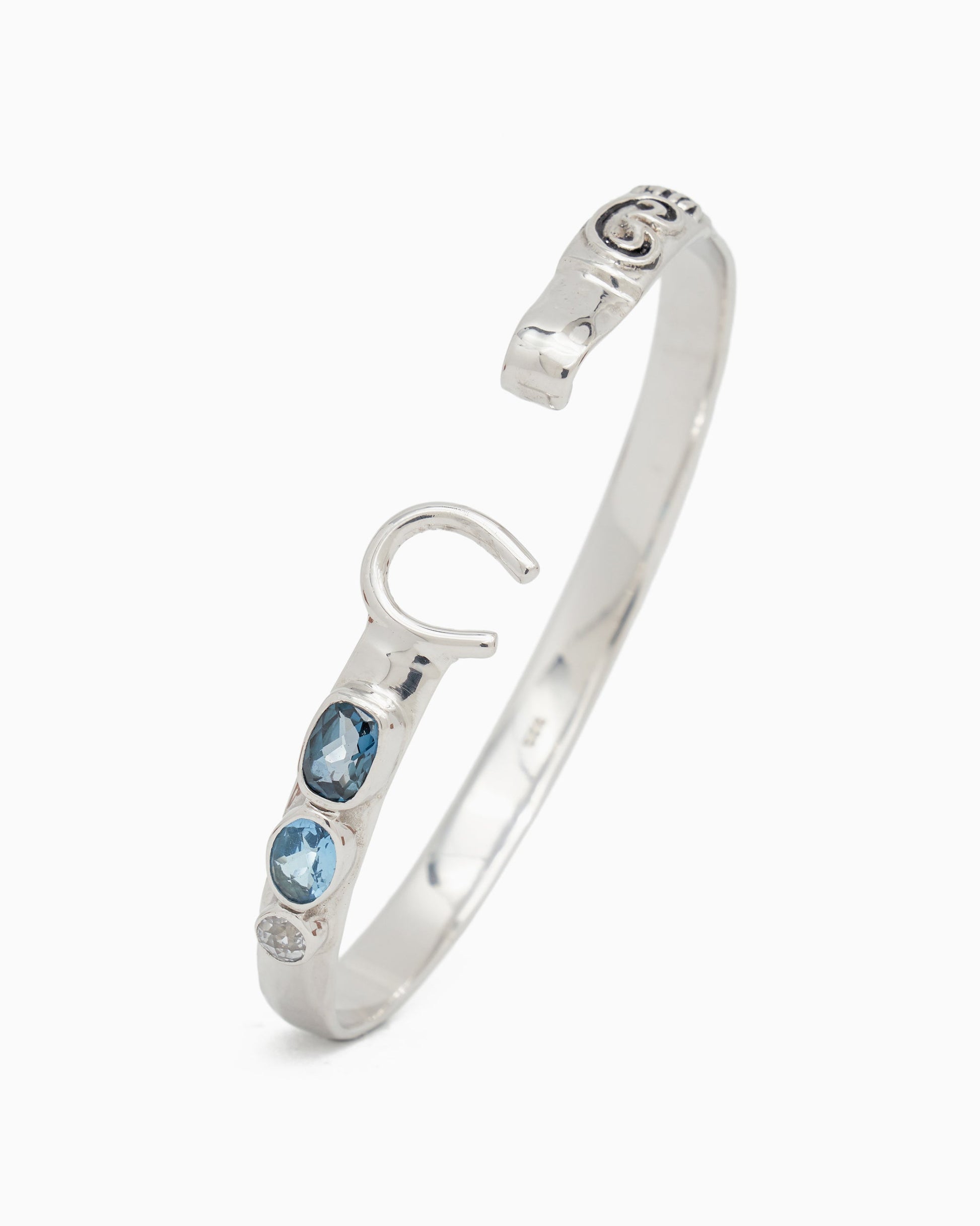 A Vibe signature, this widest version of The Hook Bracelet with Triple Stones is fashioned in gently hammered sterling silver with three faceted stones, a St. John petroglyph, and a "C" hook clasp. Each stone is a tribute to one of the three iconic U.S. Virgin Islands: St. John, St. Thomas, and St. Croix. Solo or stacked, it is sure to be a favorite statement piece. In the Caribbean tradition, wear your hook facing in to keep love close to your heart, and facing out if you are open to a new love in your life. Wear this piece on its own or stack it with other bracelets for a layered look. For added fun, embellish your new hook bracelet with one or more of Vibe's fun and unique charms!