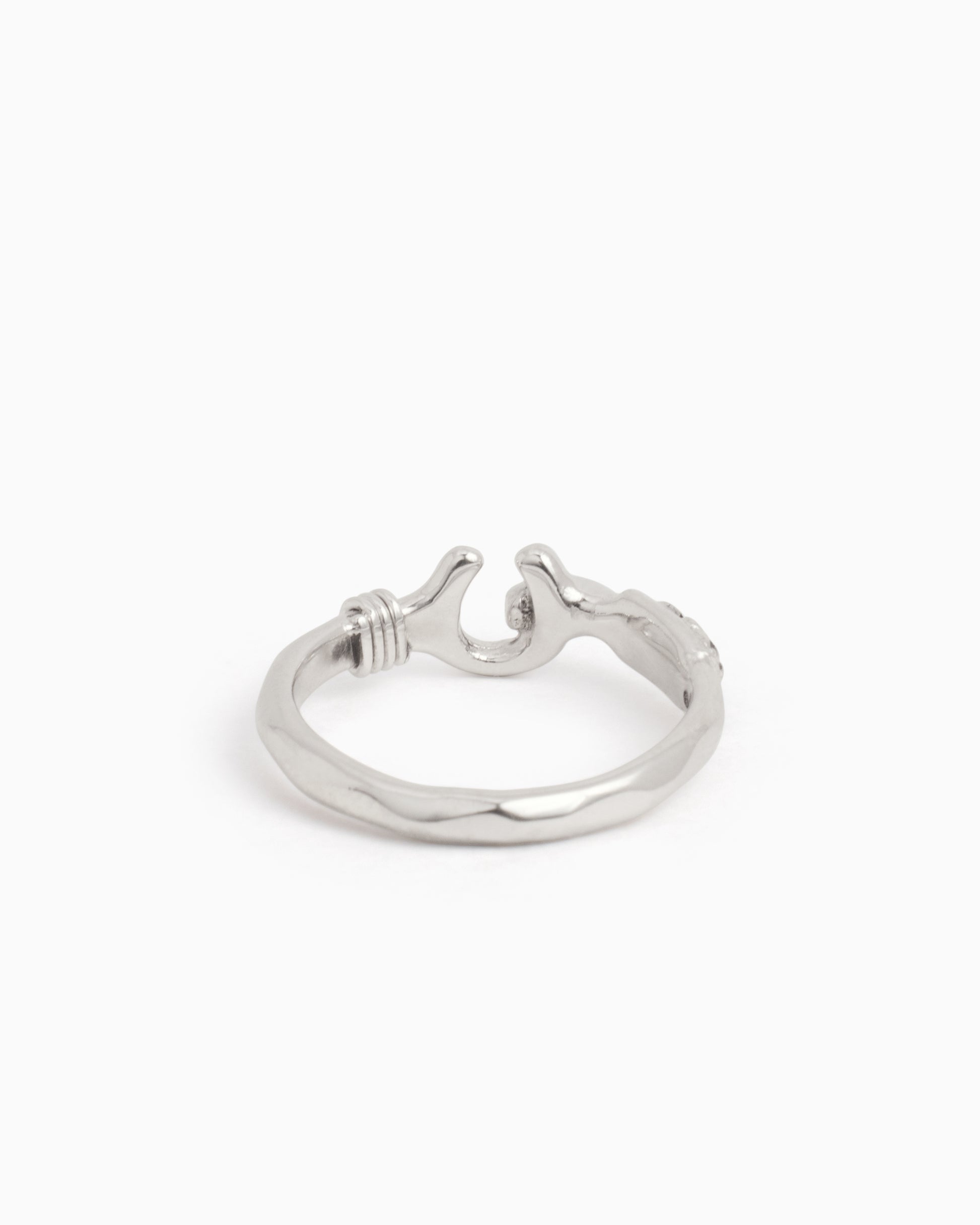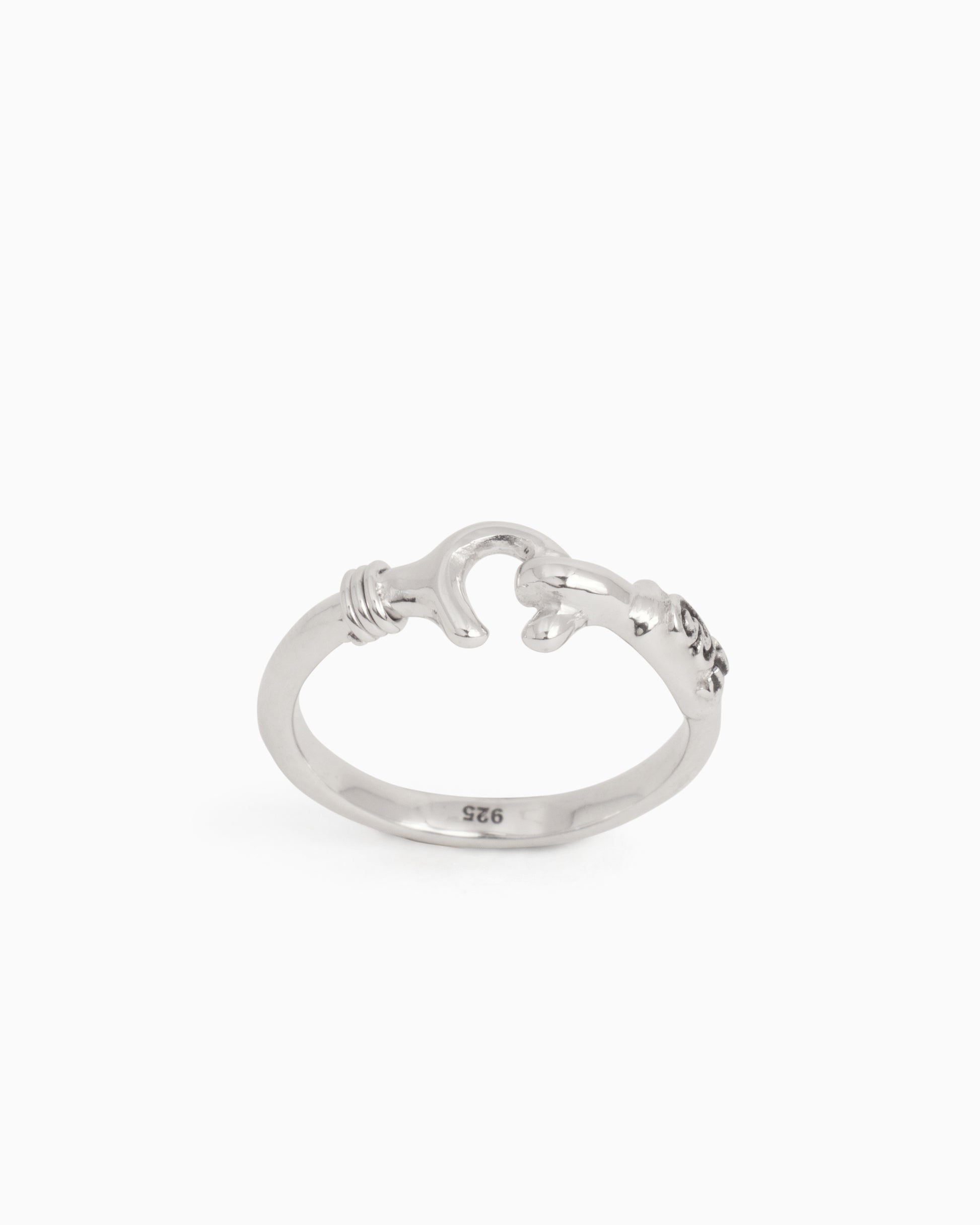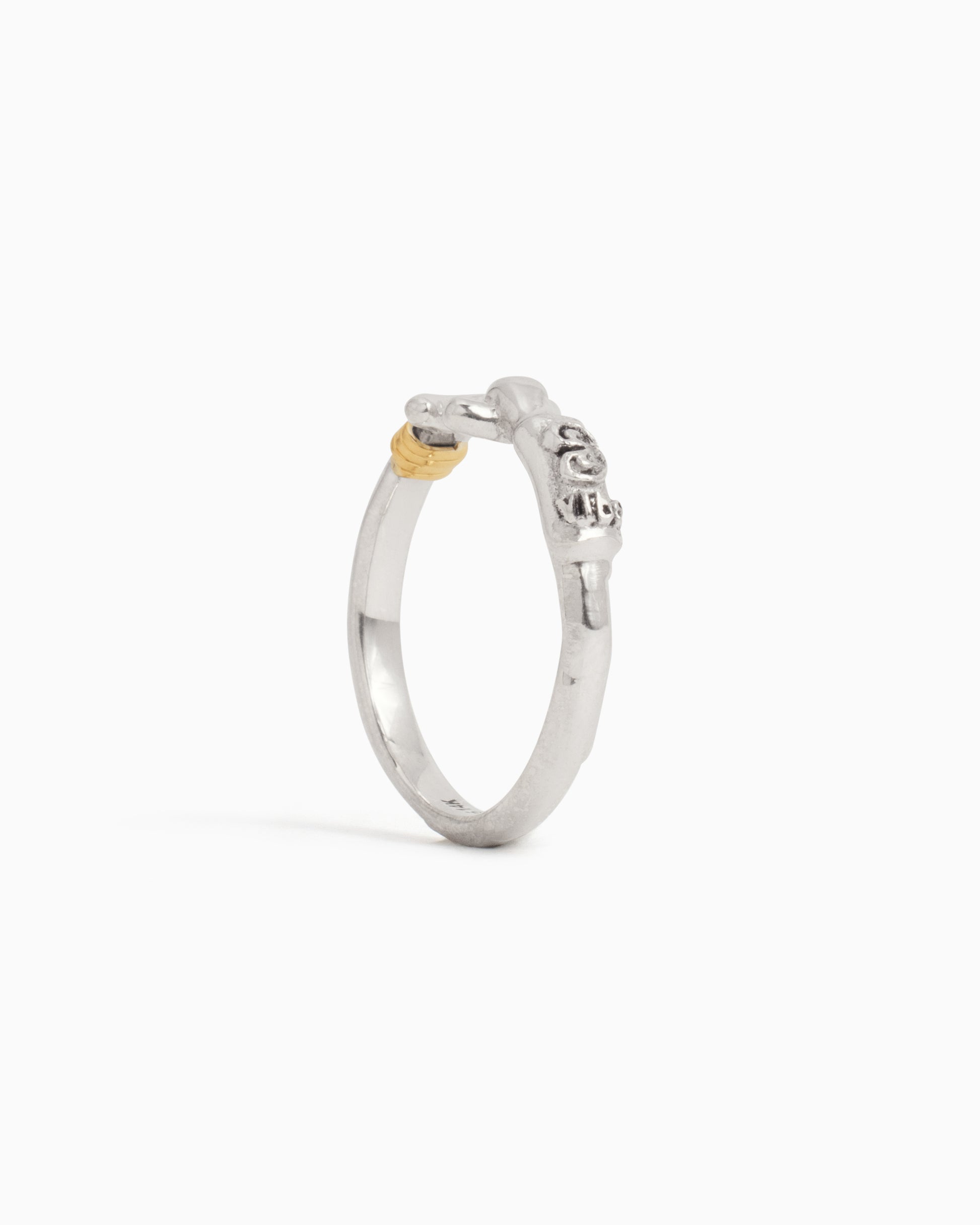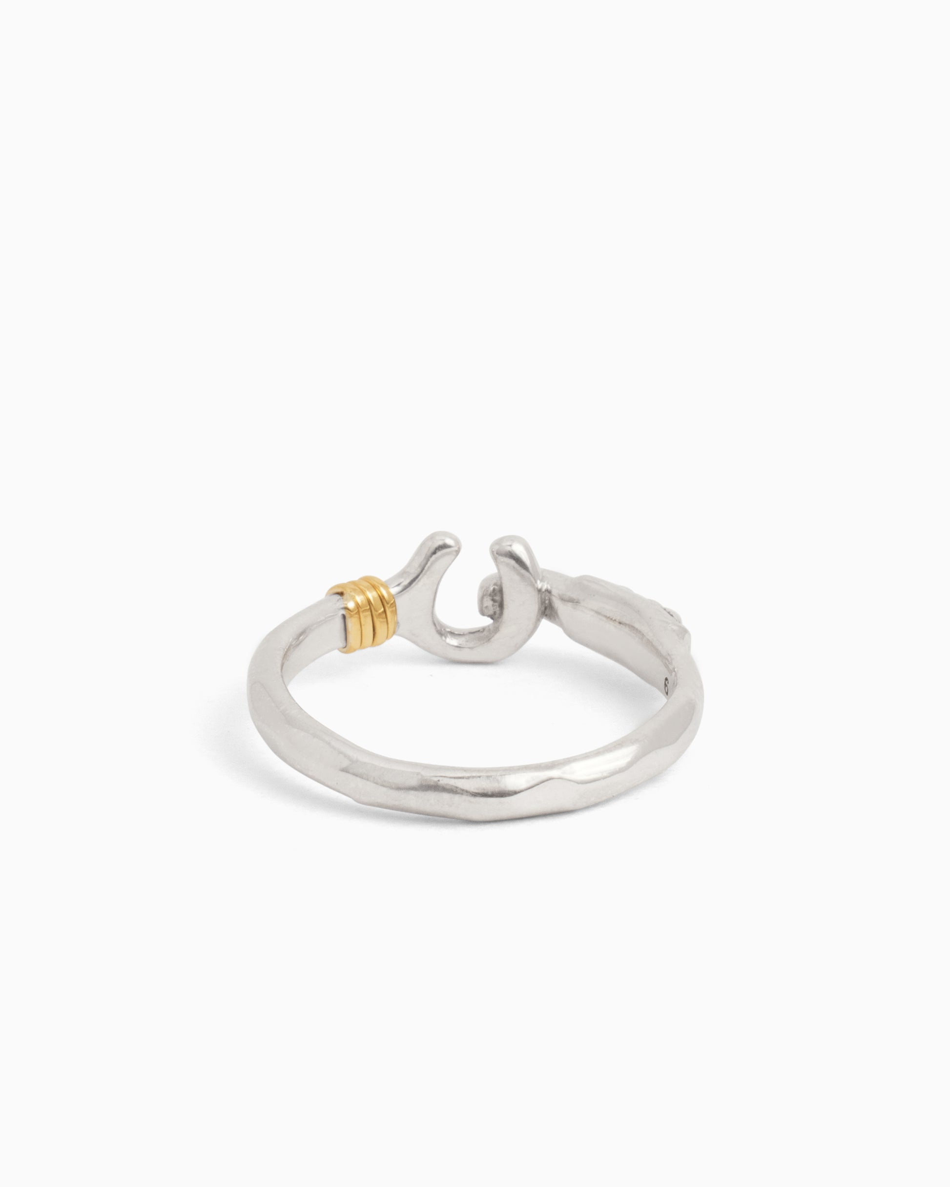 A Vibe signature, the Hook Ring is handcrafted in gently hammered sterling silver and showcases a distinctive "C" hook and a replica of the St. John petroglyph. Its three good luck wraps serve as positive affirmations to draw into your life, such as health, happiness, and prosperity. In Caribbean tradition, wear the hook inward to keep love close, or outward to attract new love.