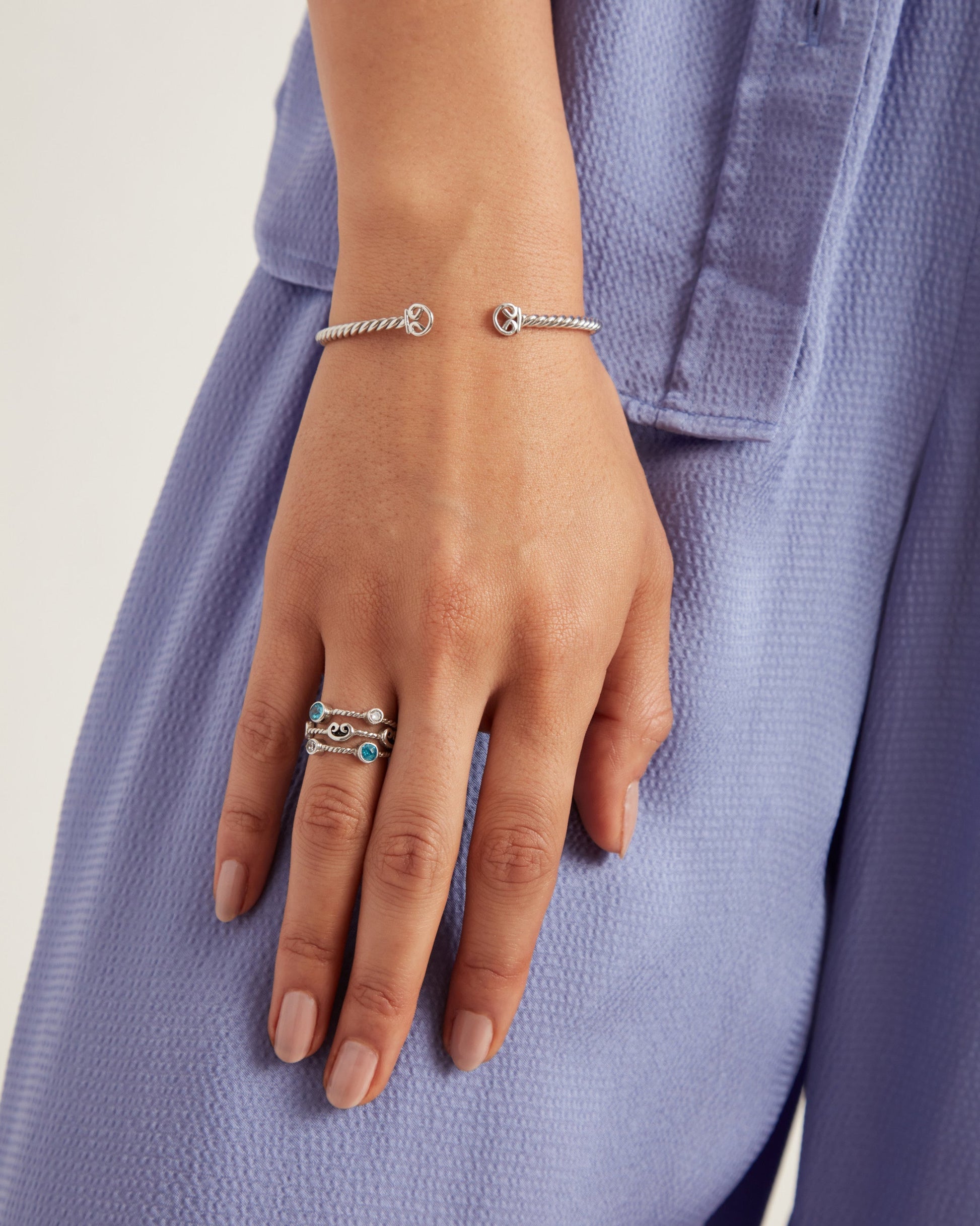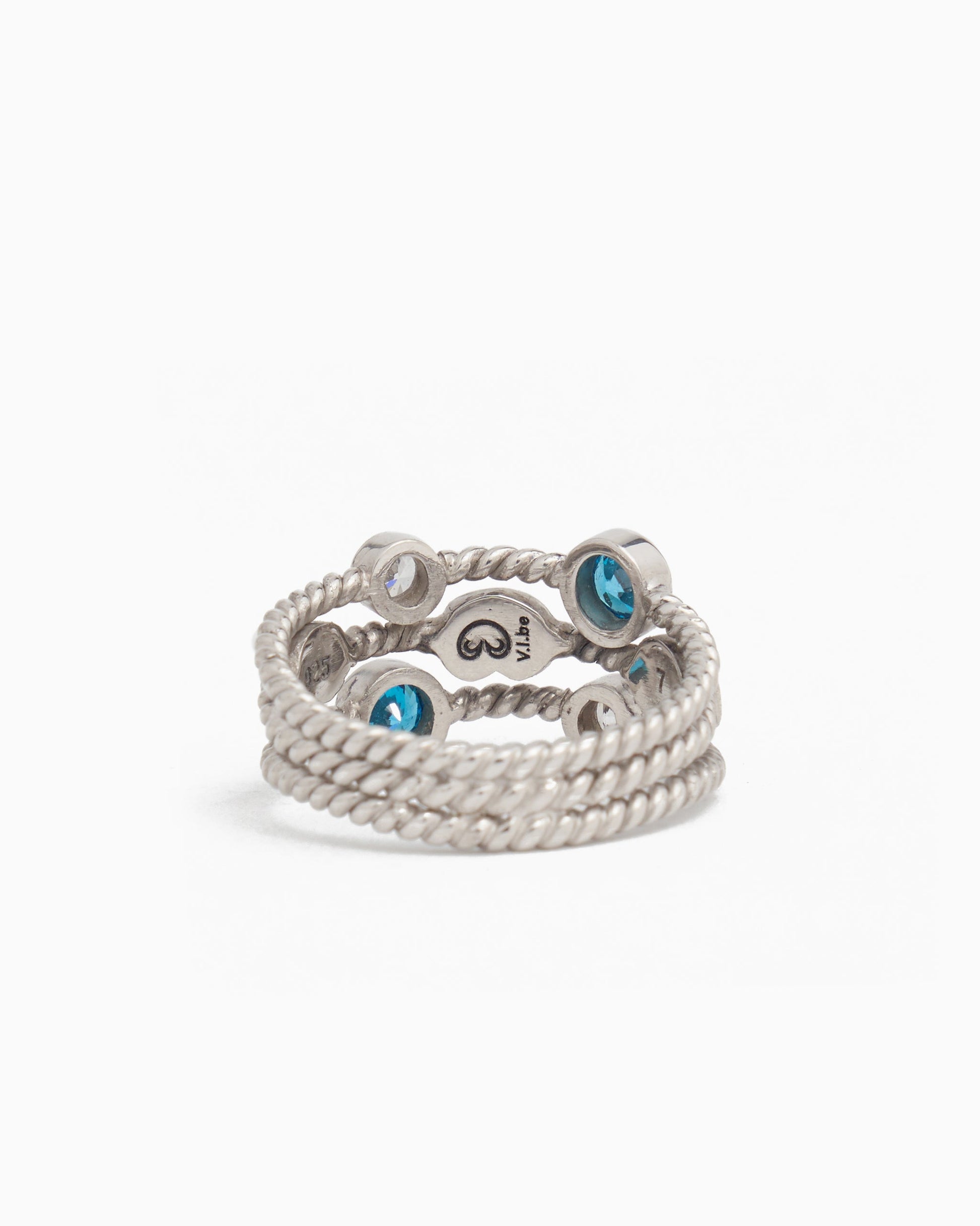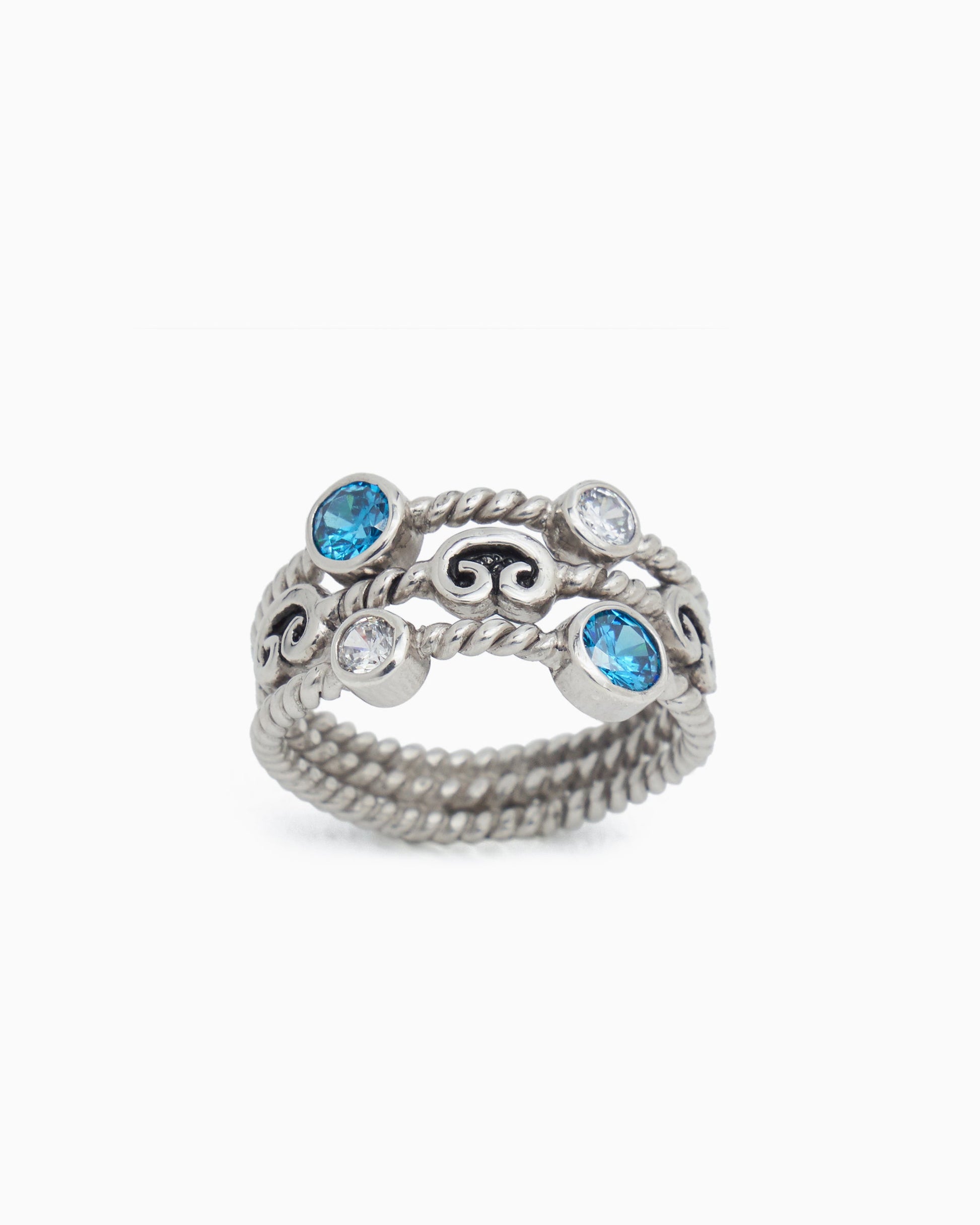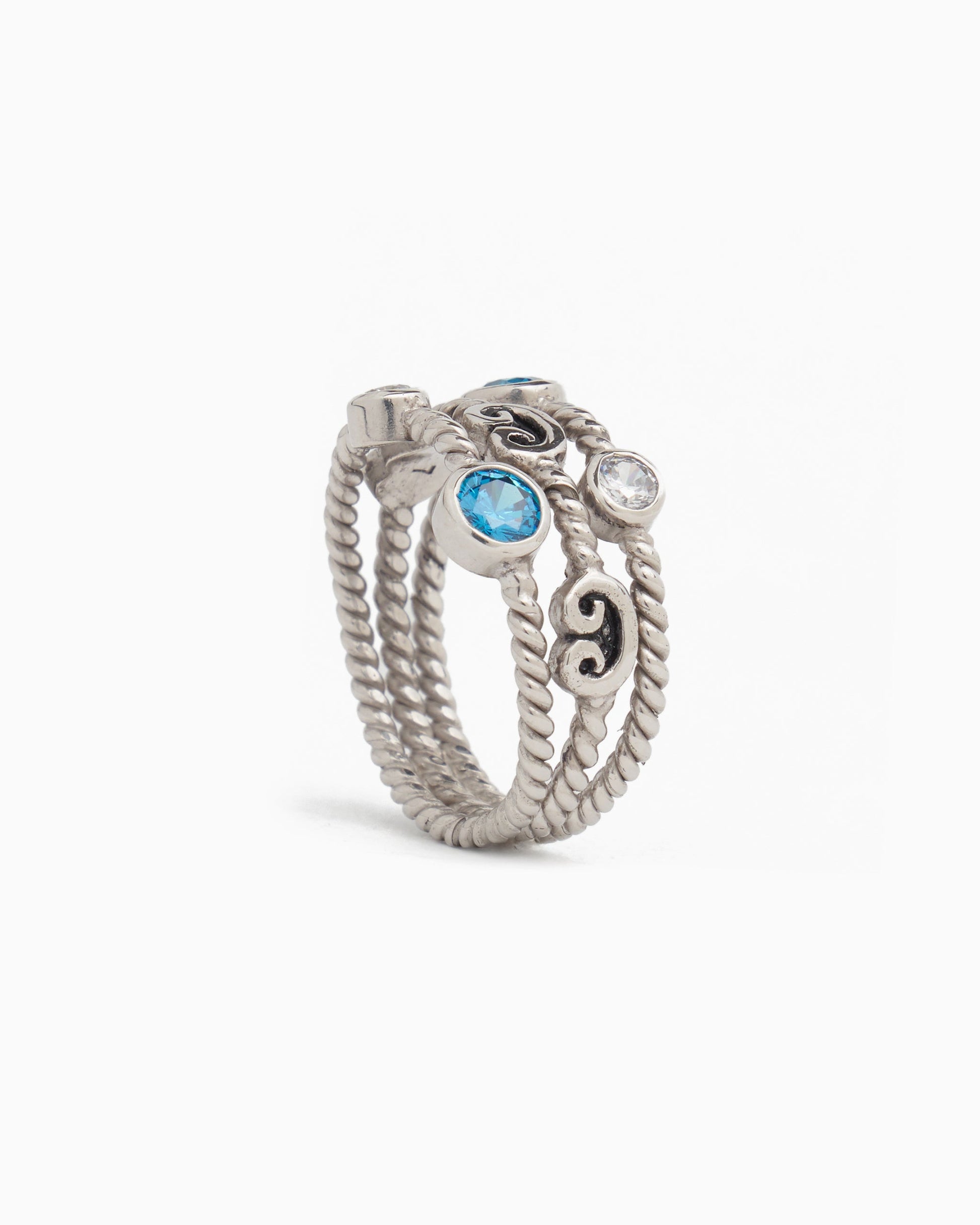 The Triple Band Twisted Ring is a fun and unique design. With three intertwined rope-like bands, faceted blue zircon and white zircon stones, and petroglyphs on the bands, this piece is sure to become a staple in your collection. Each band is a tribute to one of the three iconic U.S. Virgin Islands: St. John, St. Thomas, and St. Croix. Elevate your everyday jewelry ensemble with this statement ring.
