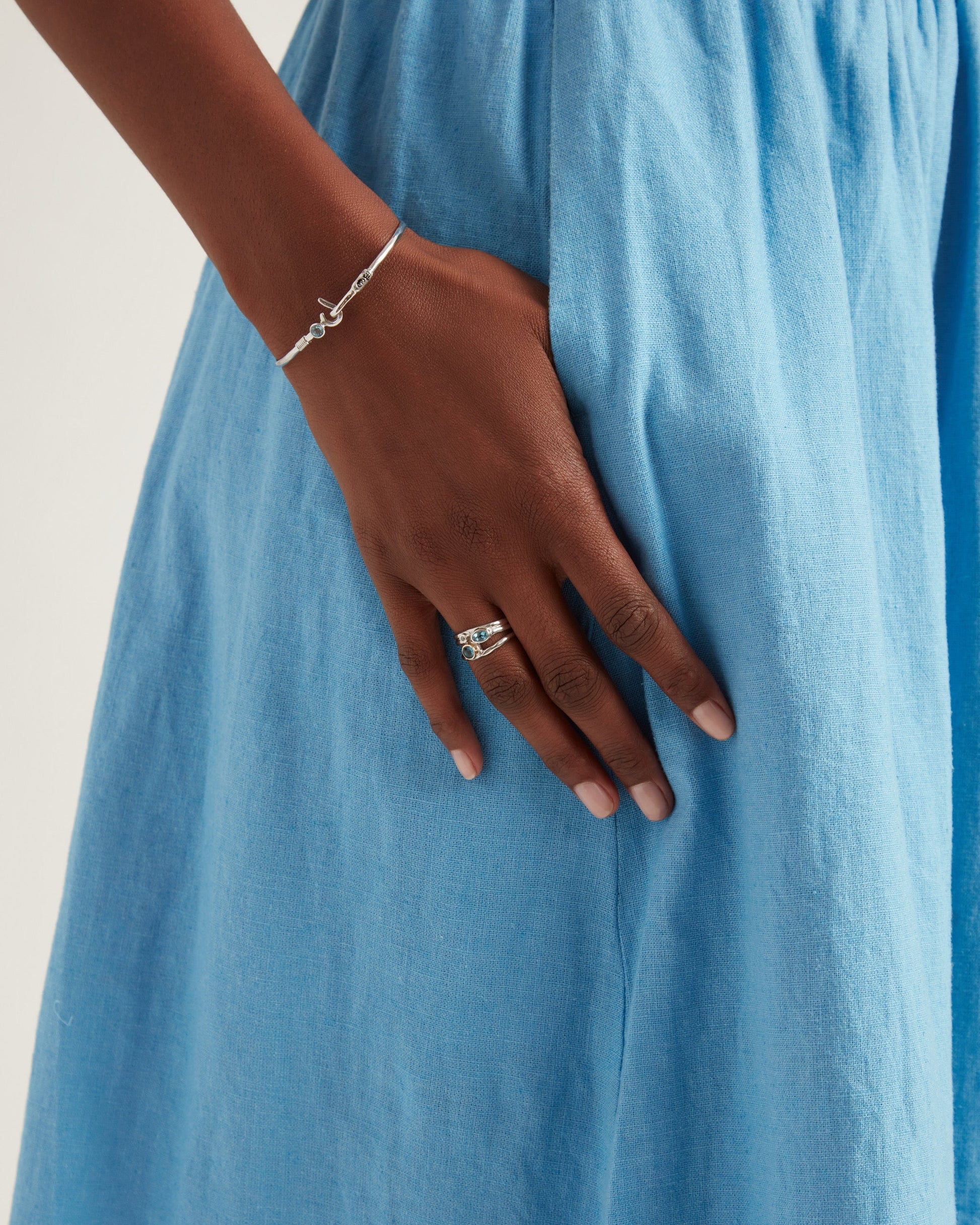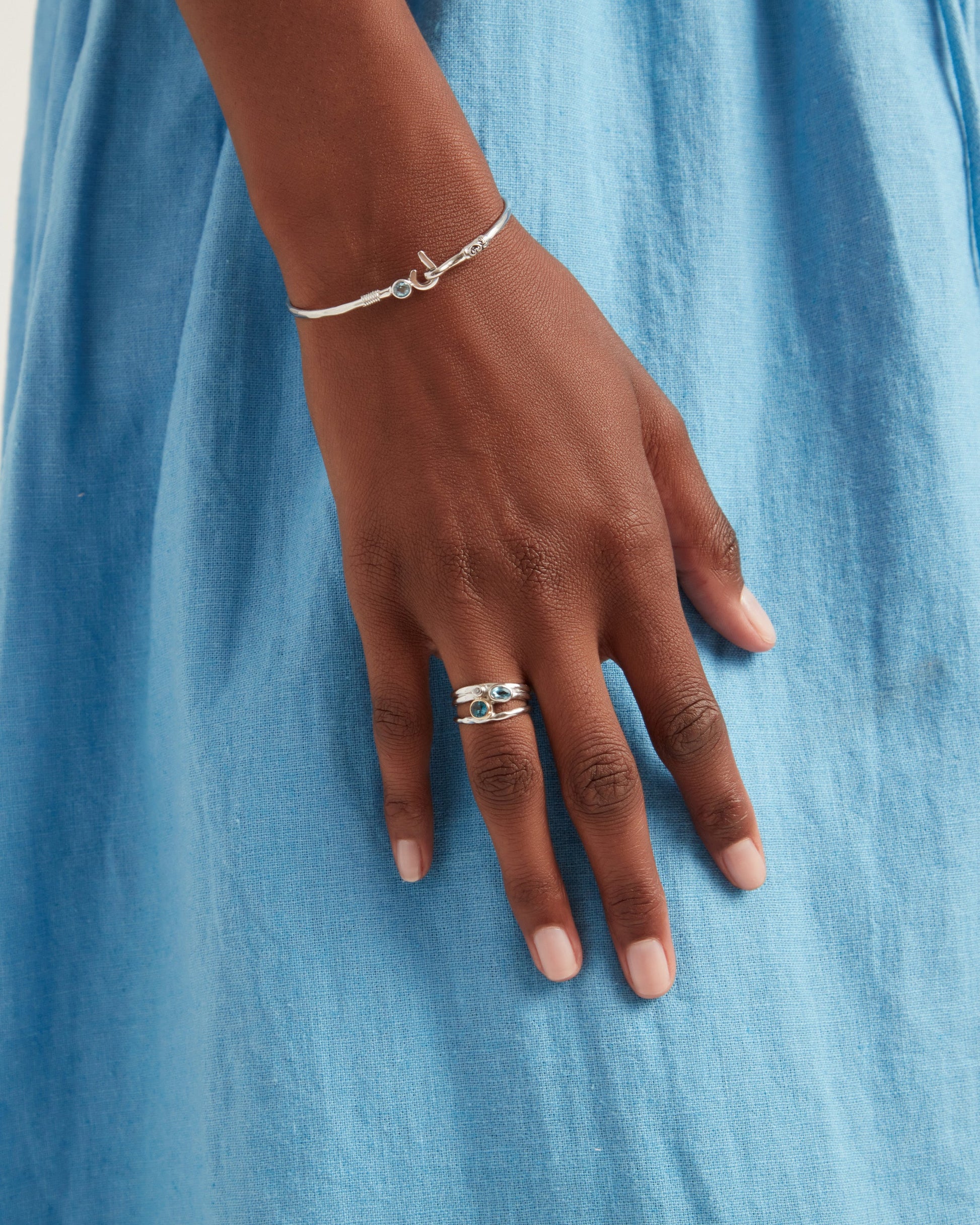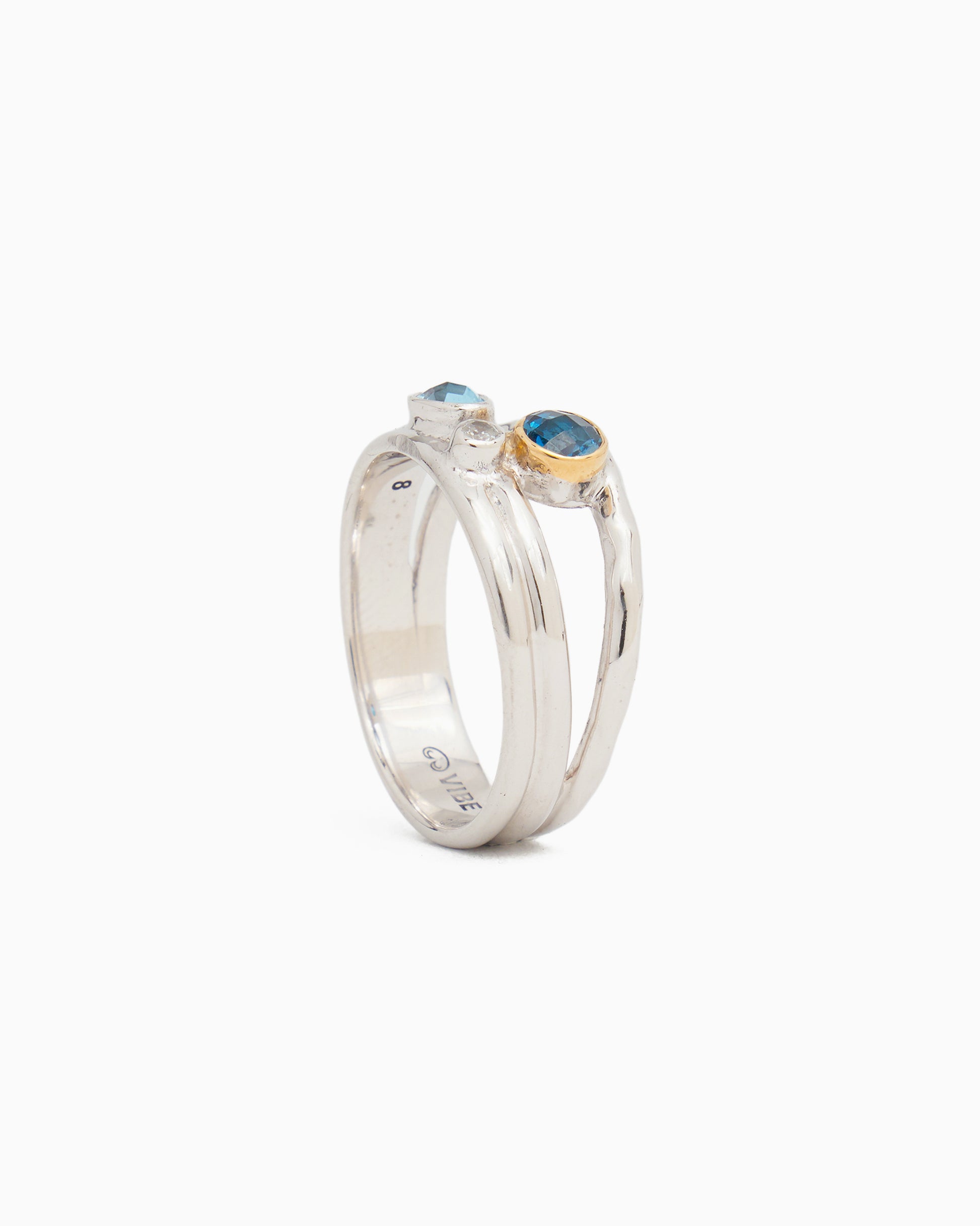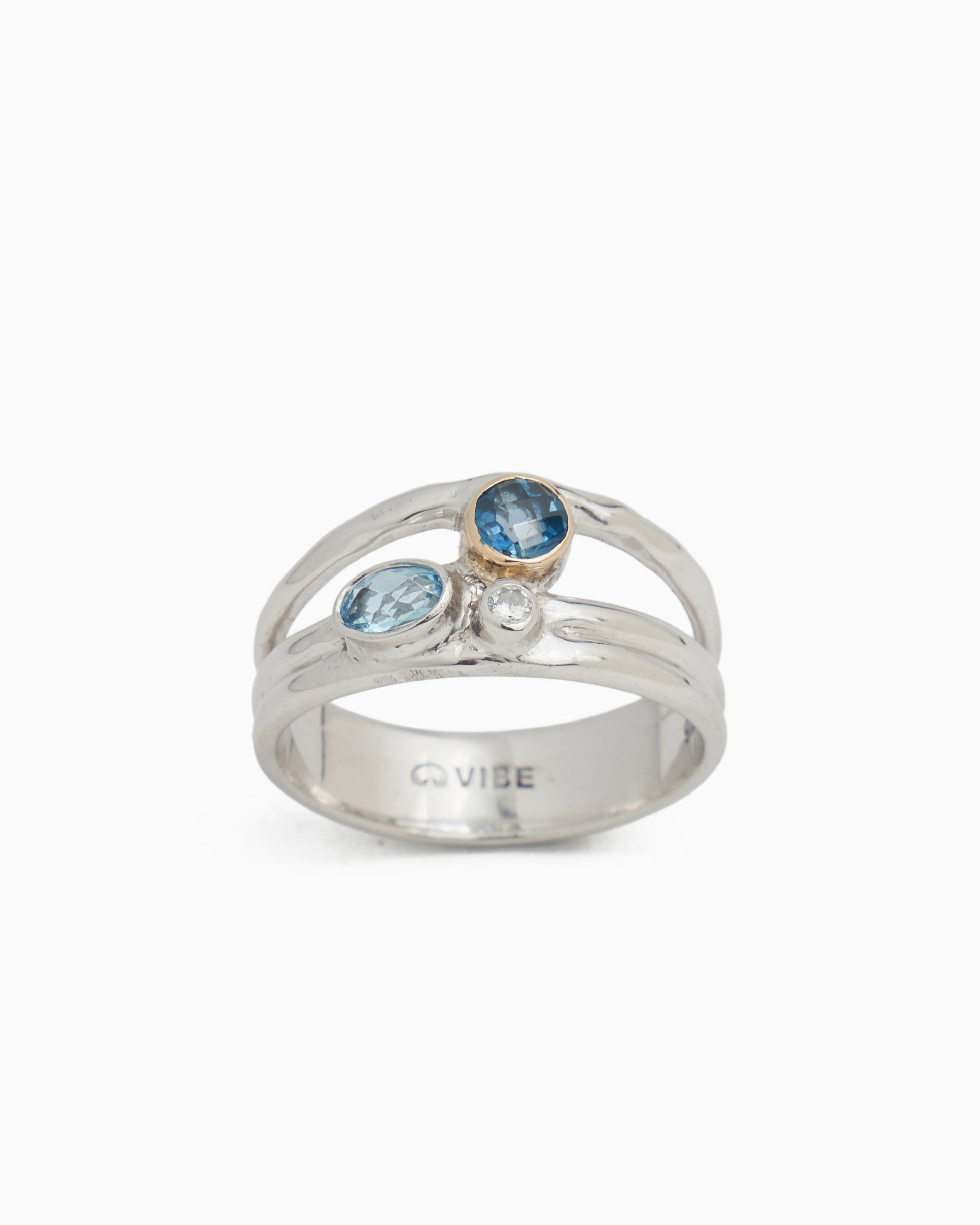 The Triple Band Ring features three different stones that are uniquely shaped and set into a sterling silver band. The top faceted London blue topaz stone features a 14K gold bezel, while the faceted Hampton blue topaz and zircon are set in sterling silver.