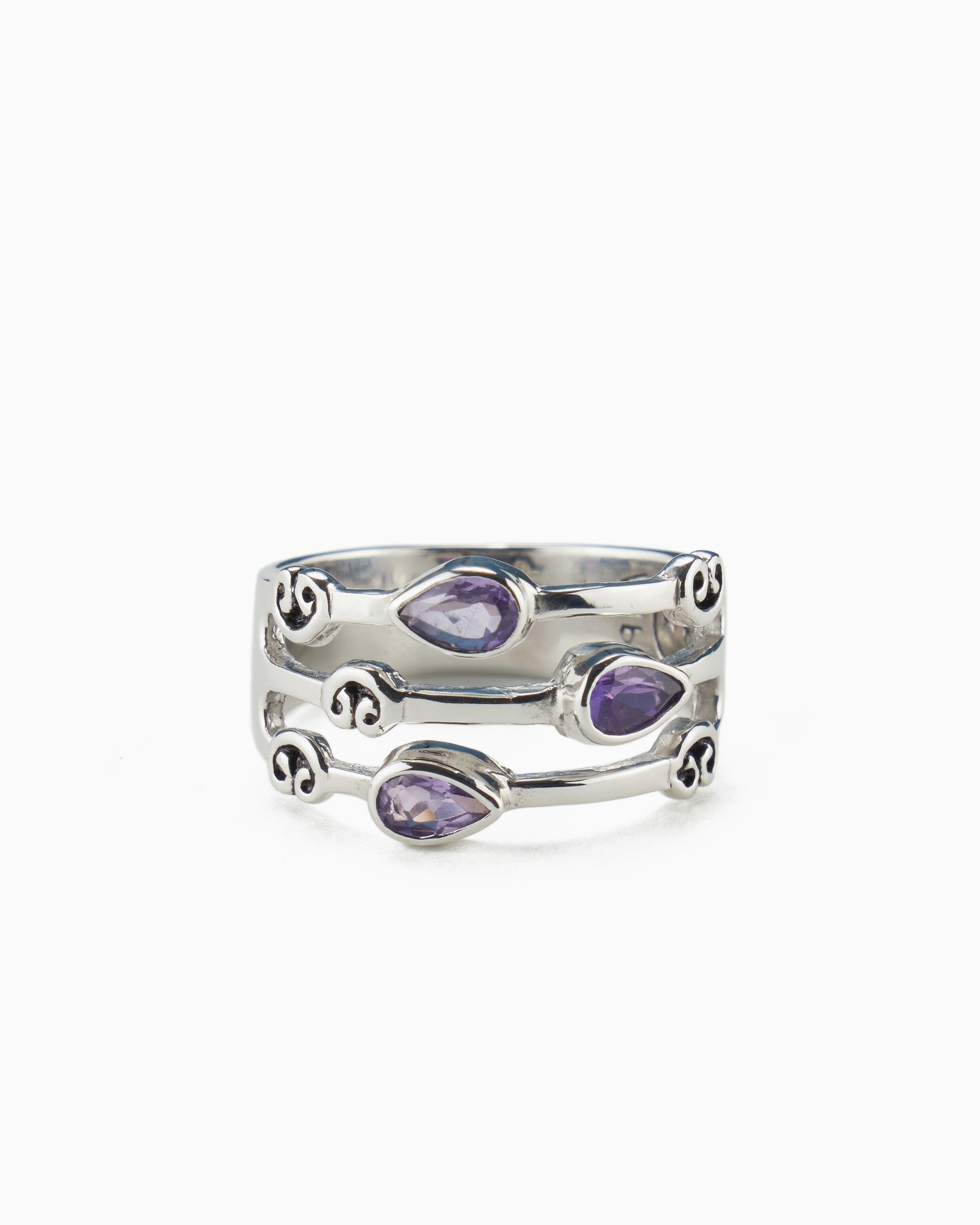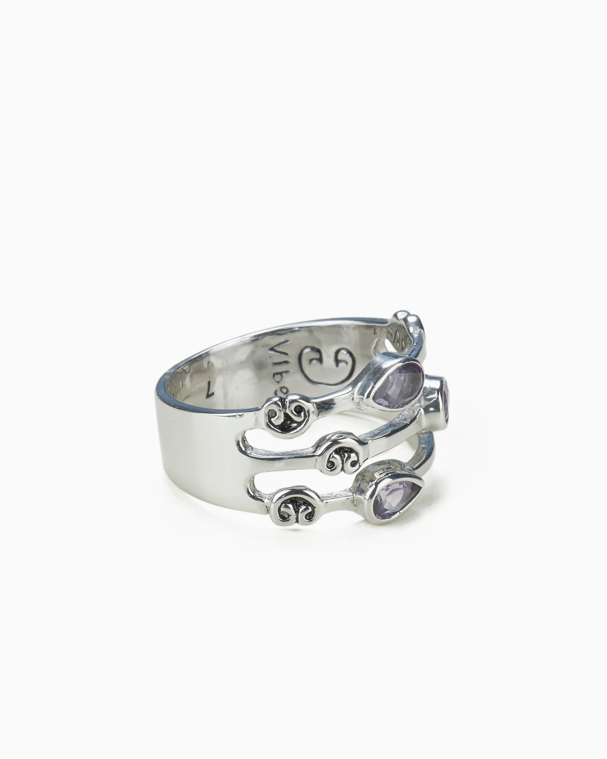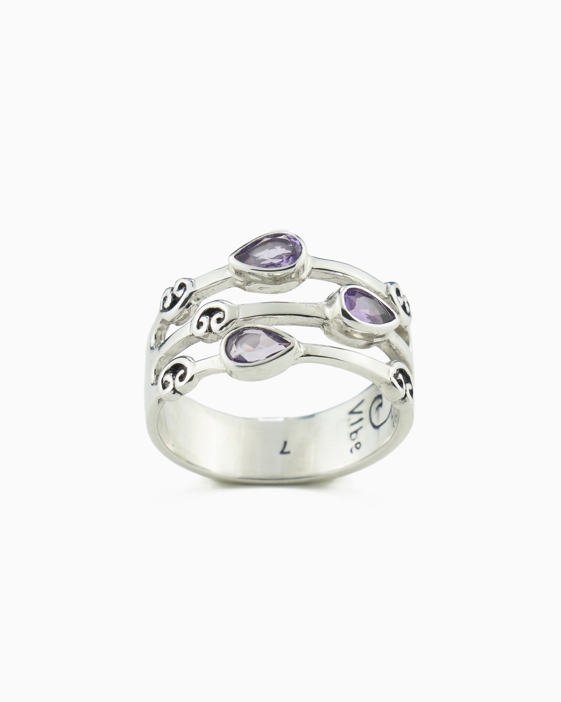 The Triple Band Ring With Three Stones is a top favorite at Vibe Jewelry. Marvel at the exquisite faceted pear-shaped amethyst stones and the well-recognized petroglyphs on the bands. Each band and stone is a tribute to one of the three iconic U.S. Virgin Islands: St. John, St. Thomas, and St. Croix. Elevate your everyday jewelry ensemble with this statement ring.