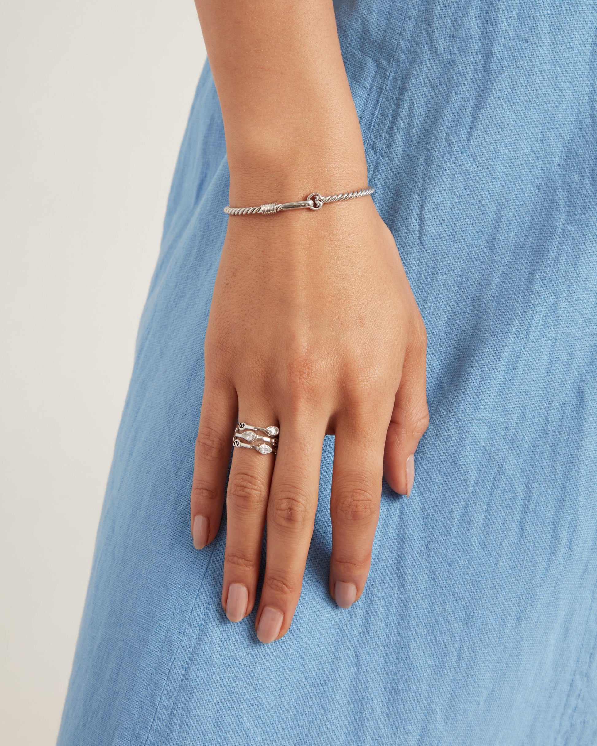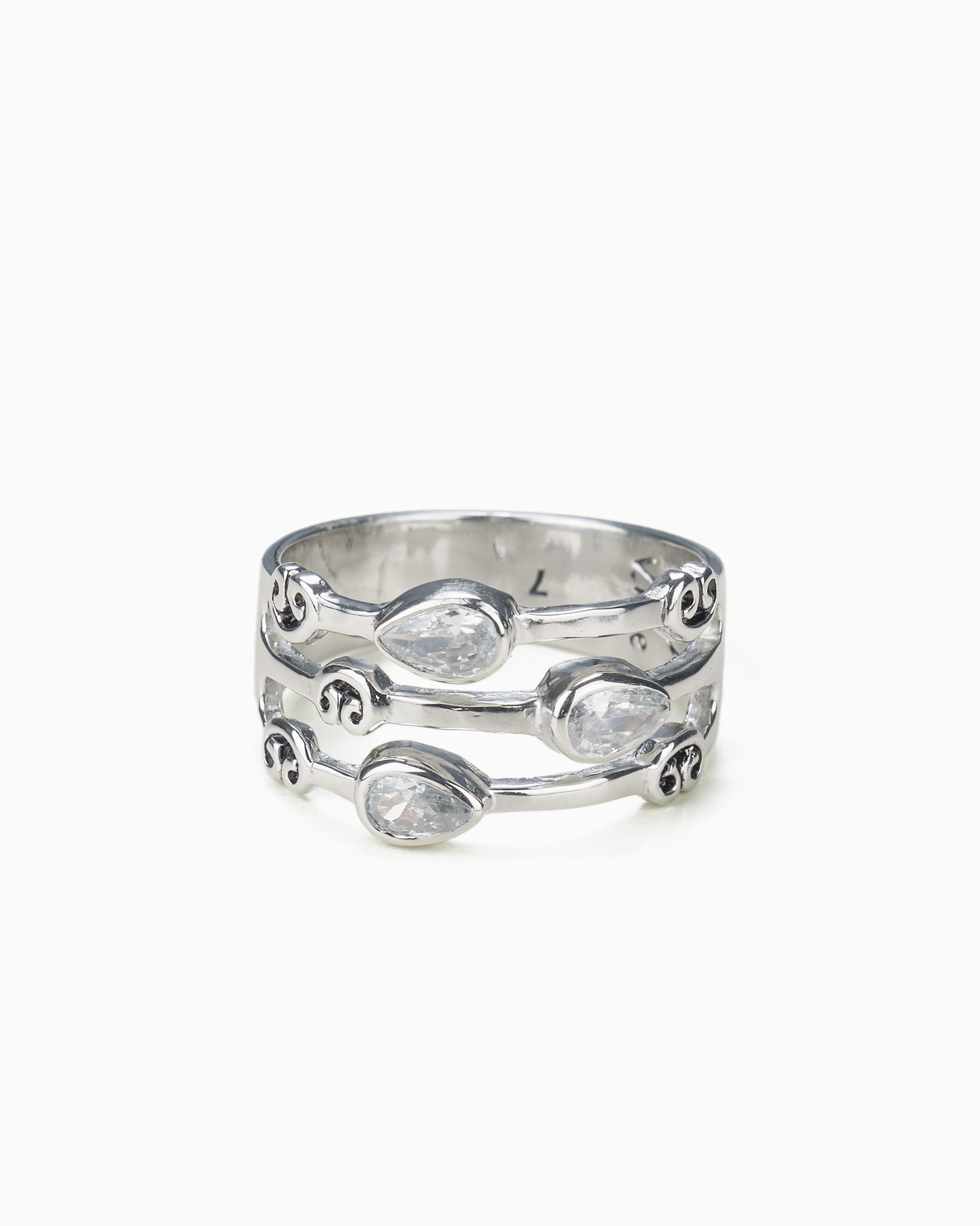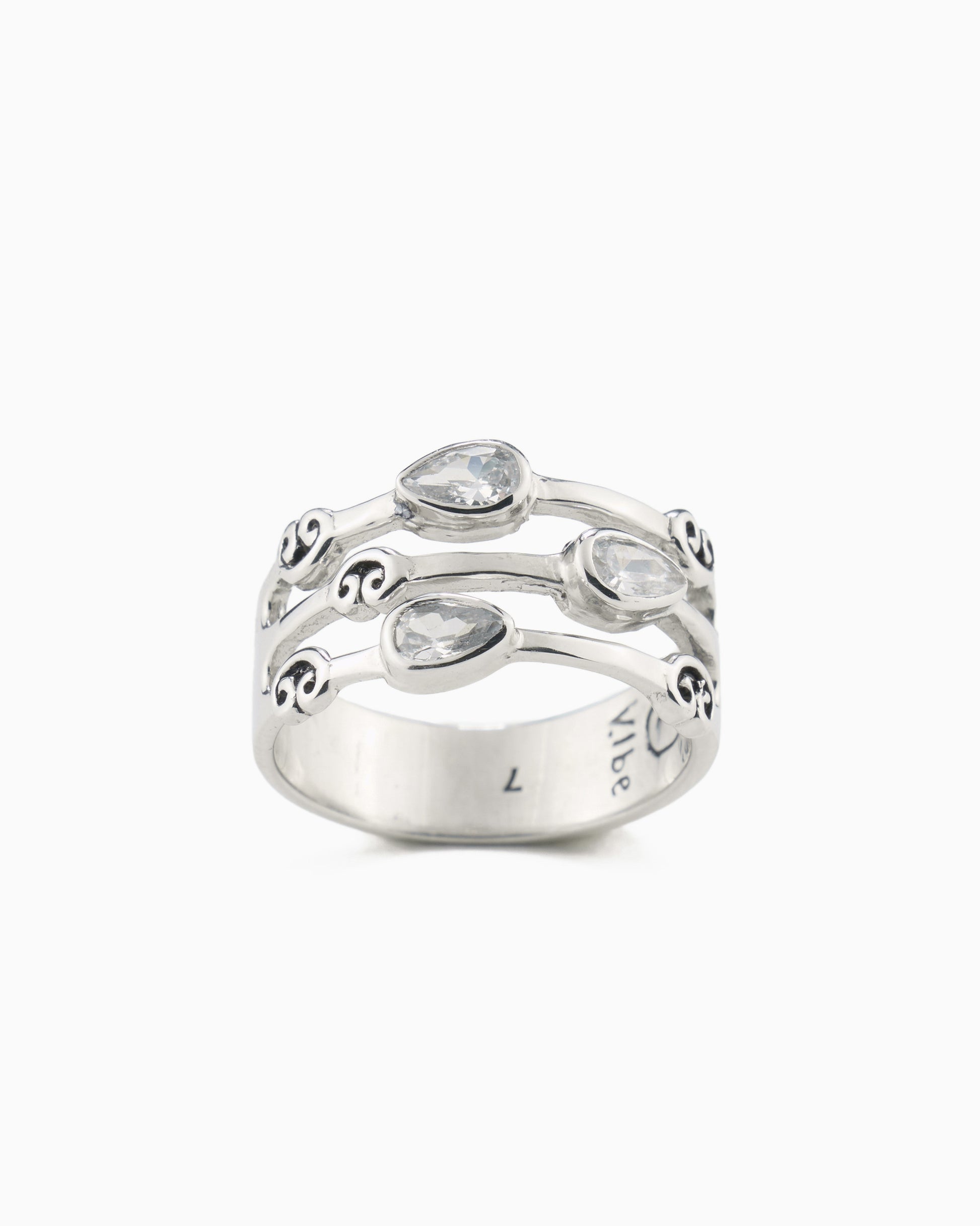 The Triple Band Ring With Three Stones is a top favorite at Vibe Jewelry. Marvel at the exquisite faceted pear-shaped white zircon stones and the well-recognized petroglyphs on the bands. Each band and stone is a tribute to one of the three iconic U.S. Virgin Islands: St. John, St. Thomas, and St. Croix. Elevate your everyday jewelry ensemble with this statement ring.