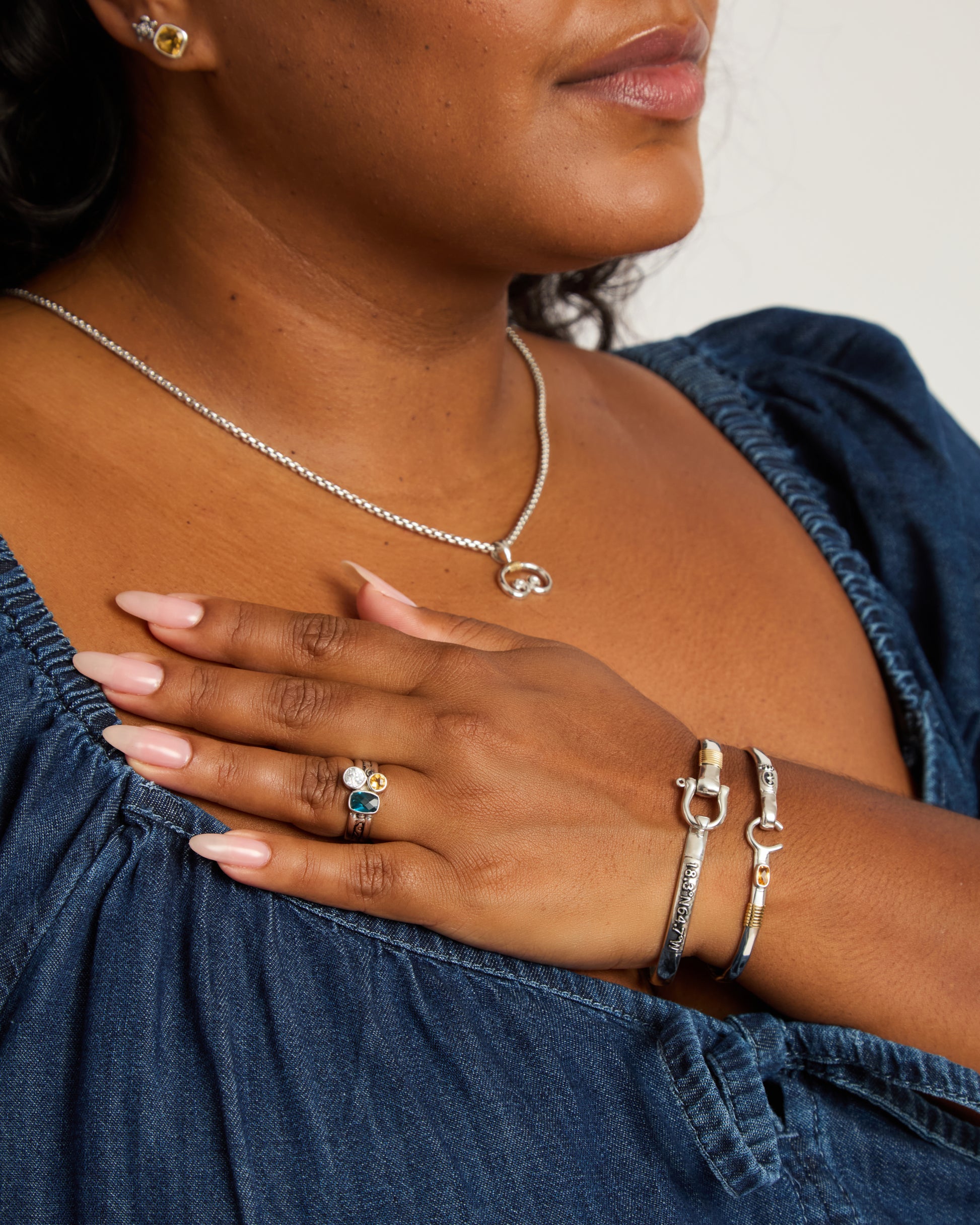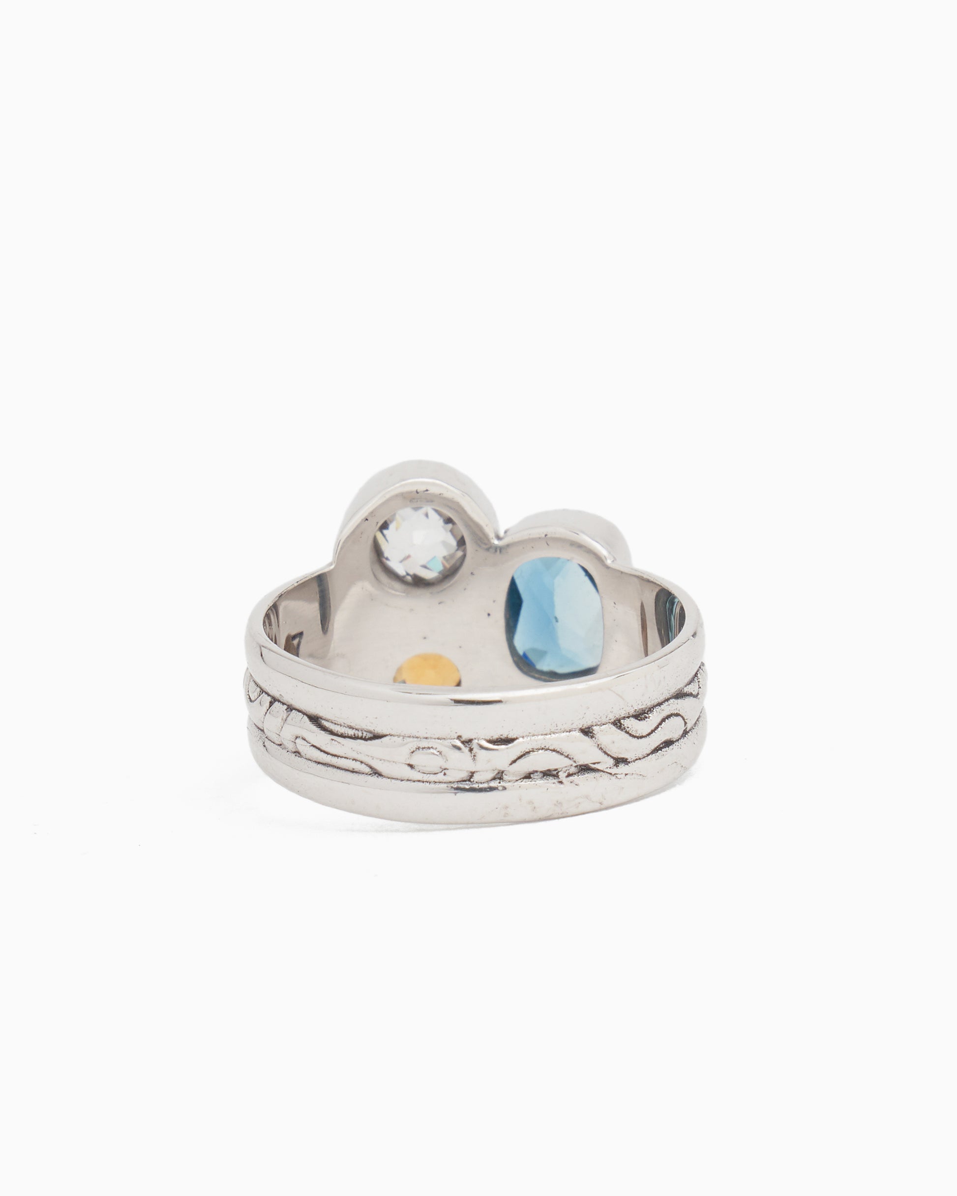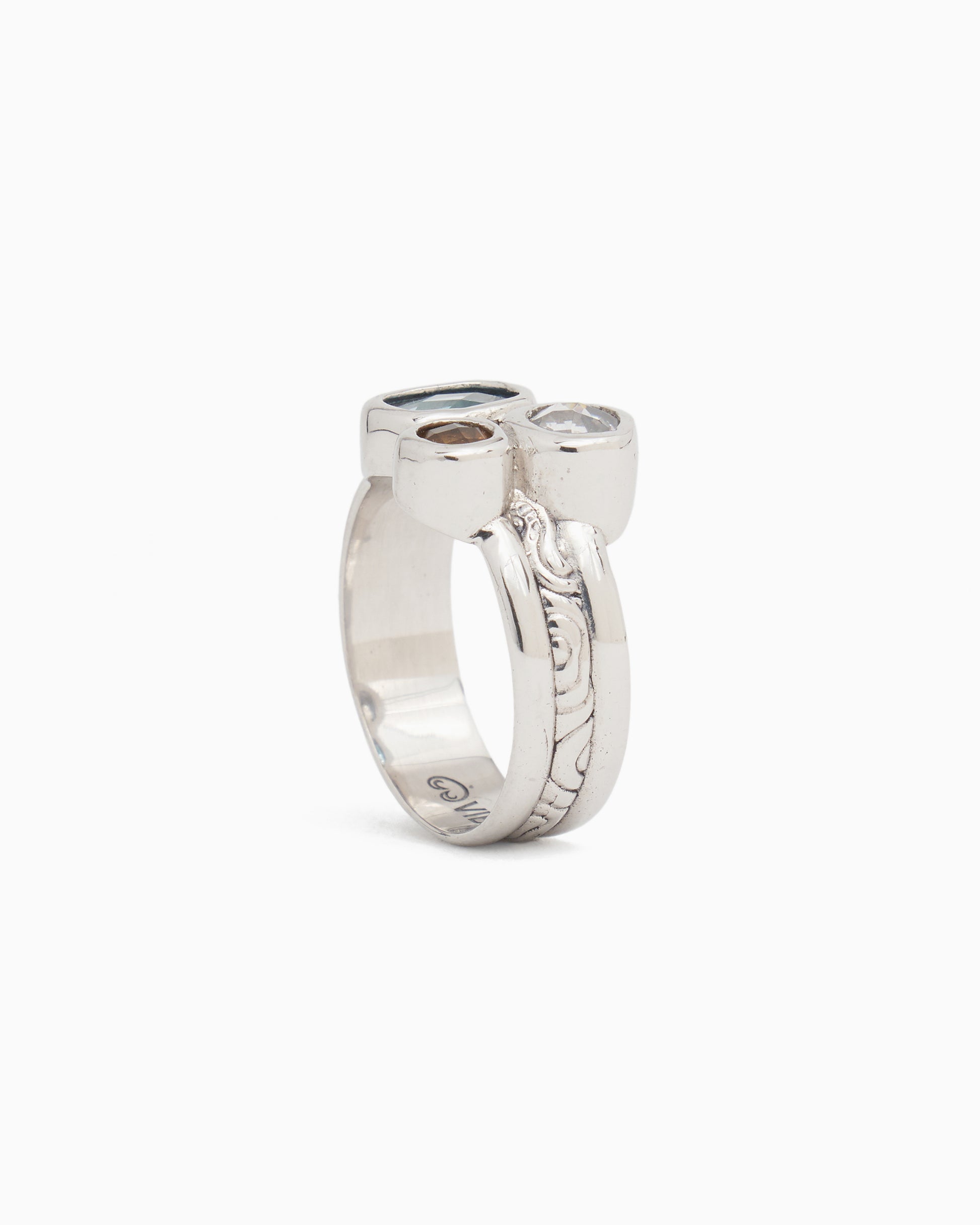 The Triple Stone Ring is a playful design with timeless details. Handcrafted in sterling silver, the ring showcases three stones of different shapes and sizes, symbolizing the three U.S. Virgin Islands: St. John, St. Thomas, and St. Croix. The band boasts a distinctive design, featuring a textured reef strip running through the middle. This versatile style can be worn alone for a statement look or stacked with other rings for a personalized touch.