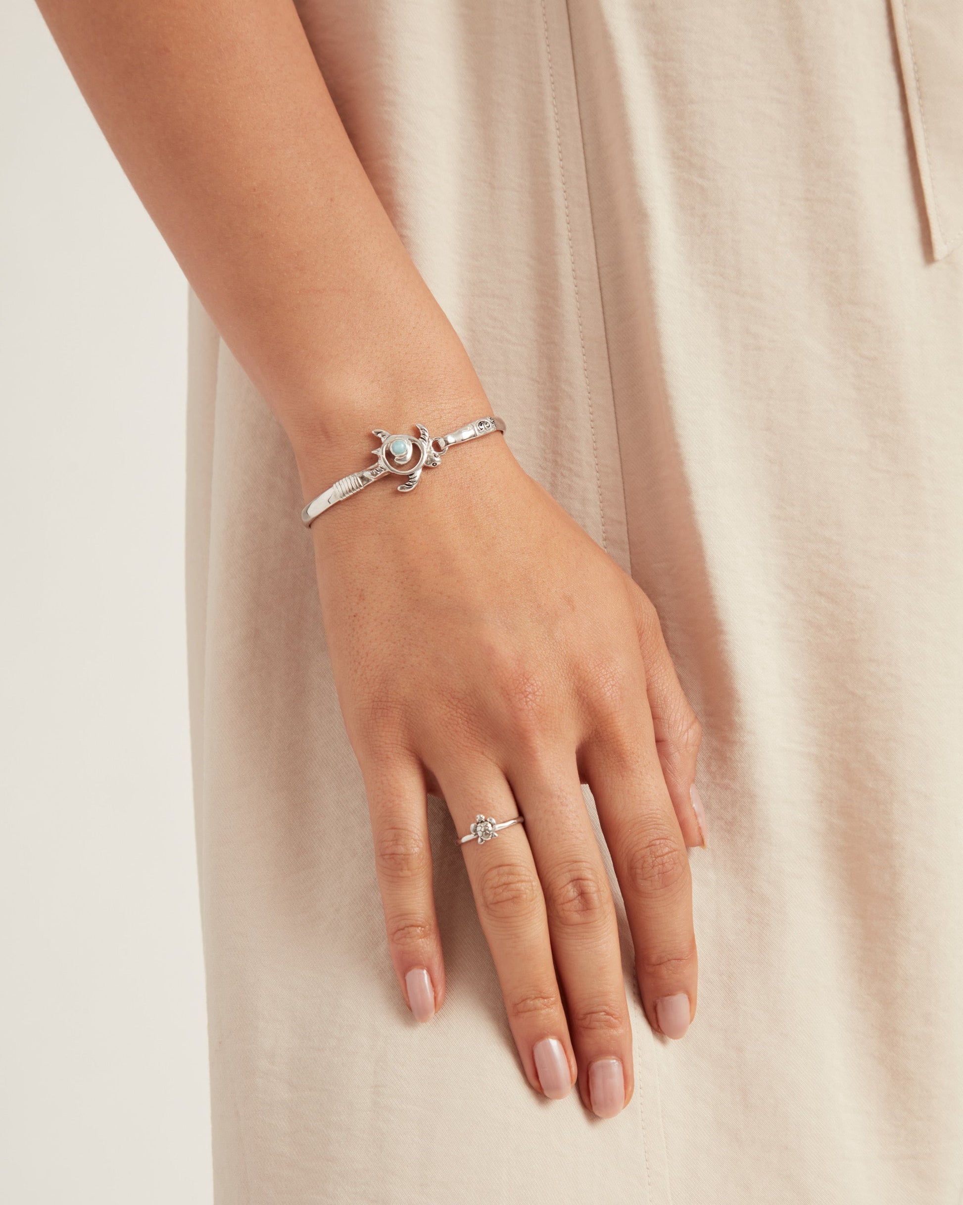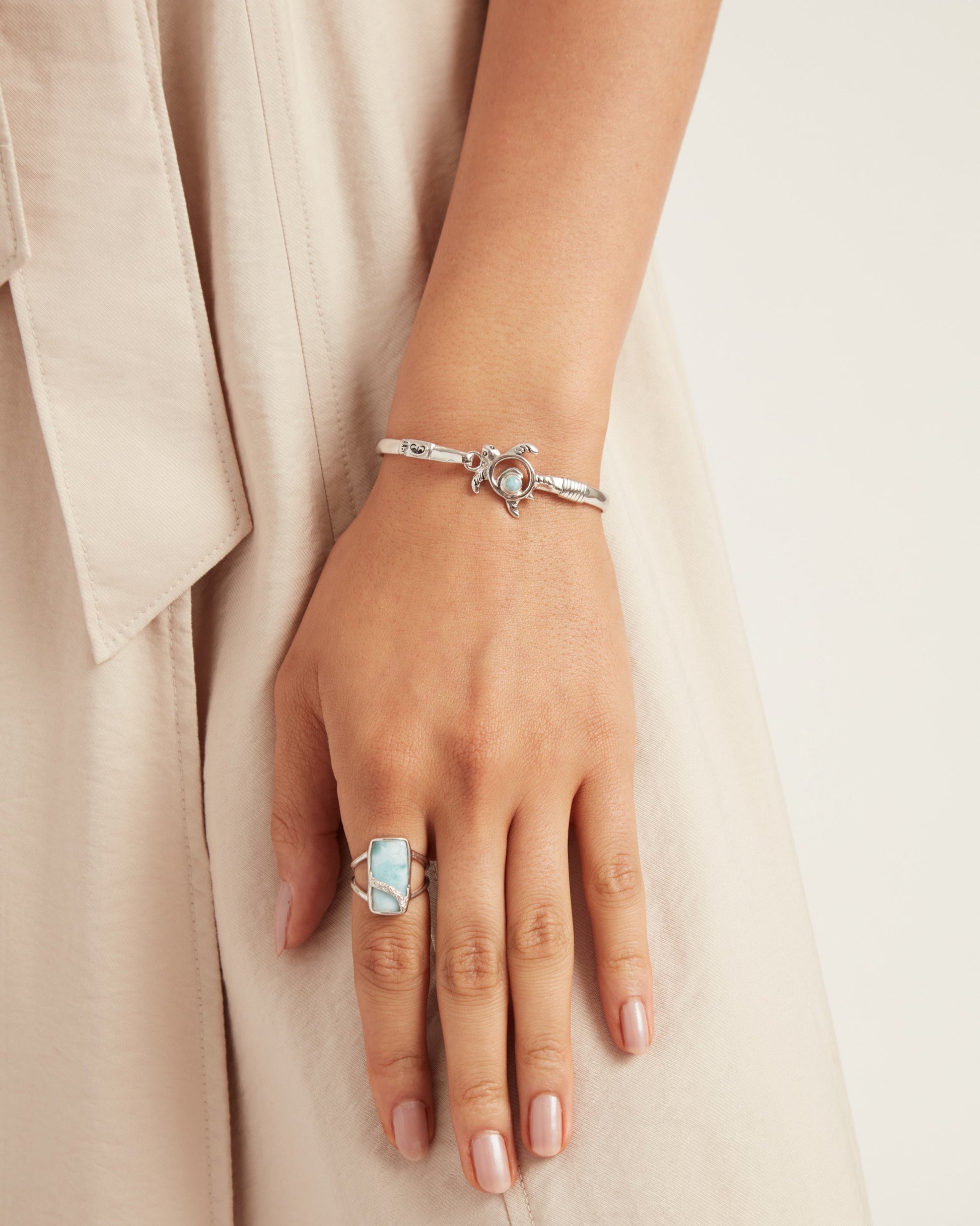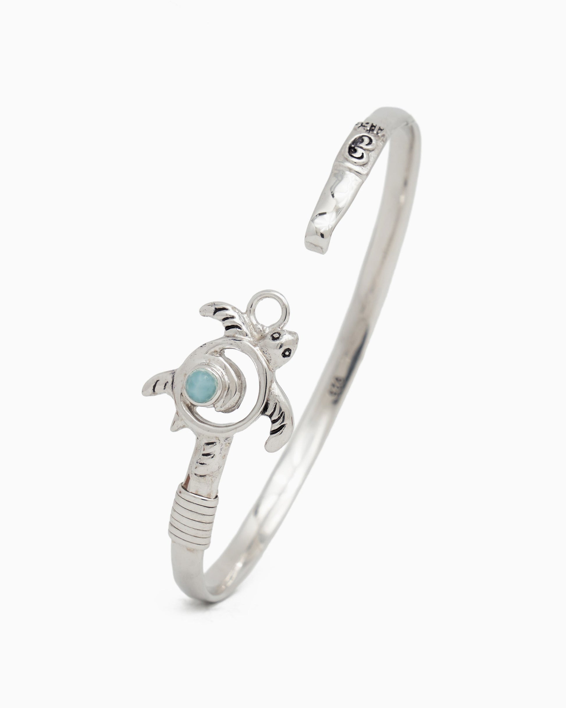 This sterling silver piece features a cute as can be sea turtle clasp with a beautiful larimar cabochon and seven good luck wraps. This original design is handcrafted by Vibe artisans to celebrate endangered sea turtles. Found in many of our designs, Vibe’s seven wraps represent love, laughter, happiness, good fortune, health, unity, and peace.