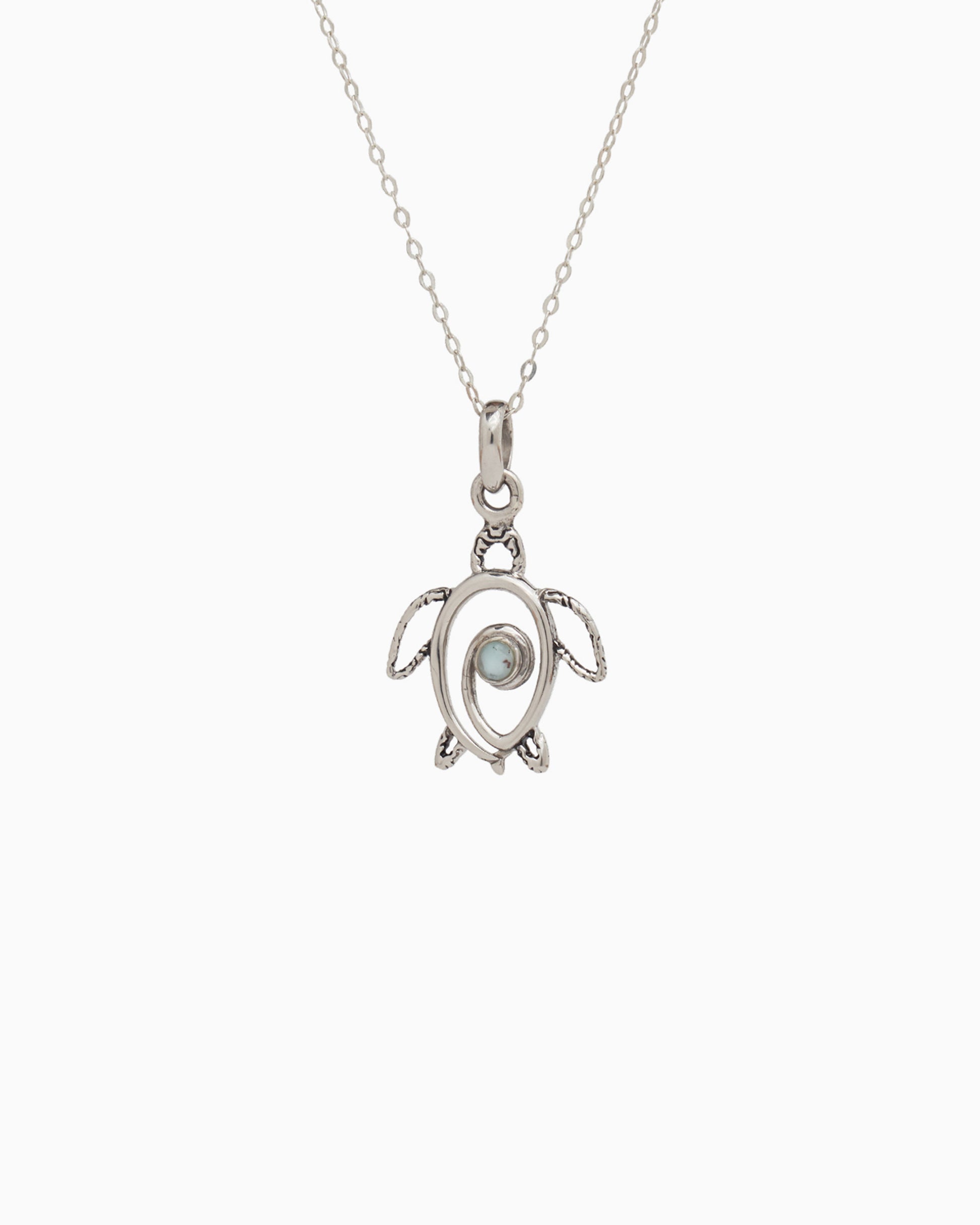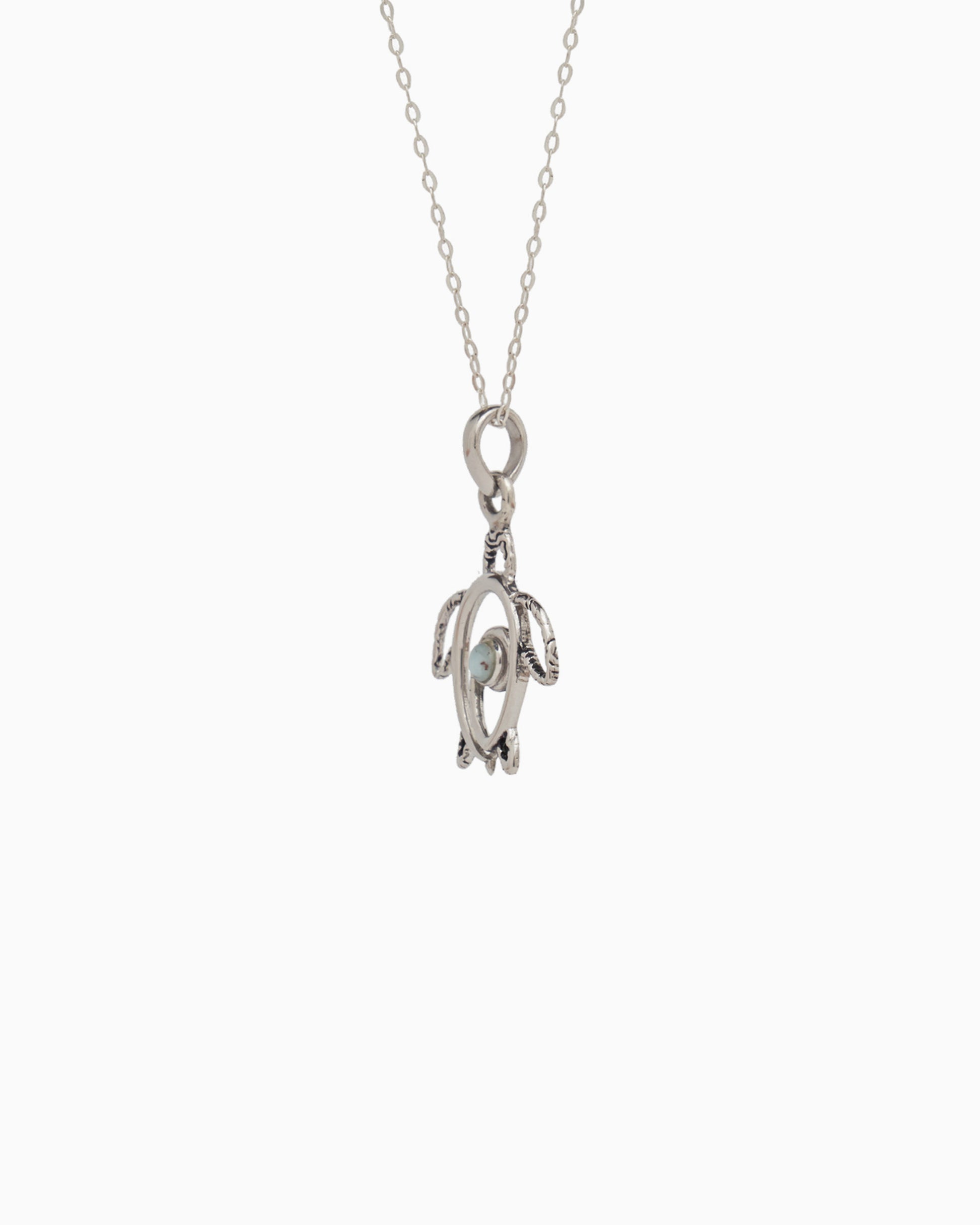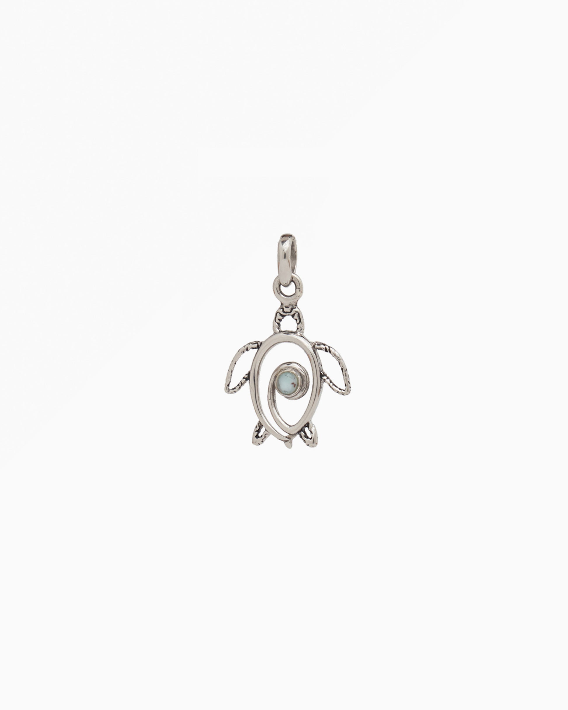 The Turtle Outline Pendant showcases a distinctively textured sterling silver turtle outline, accentuated by a larimar cabochon at its center. This exquisite piece makes a striking homage to the majestic Caribbean sea turtles, capturing the beauty and essence of these graceful creatures. Pair with your favorite chain, sold separately.