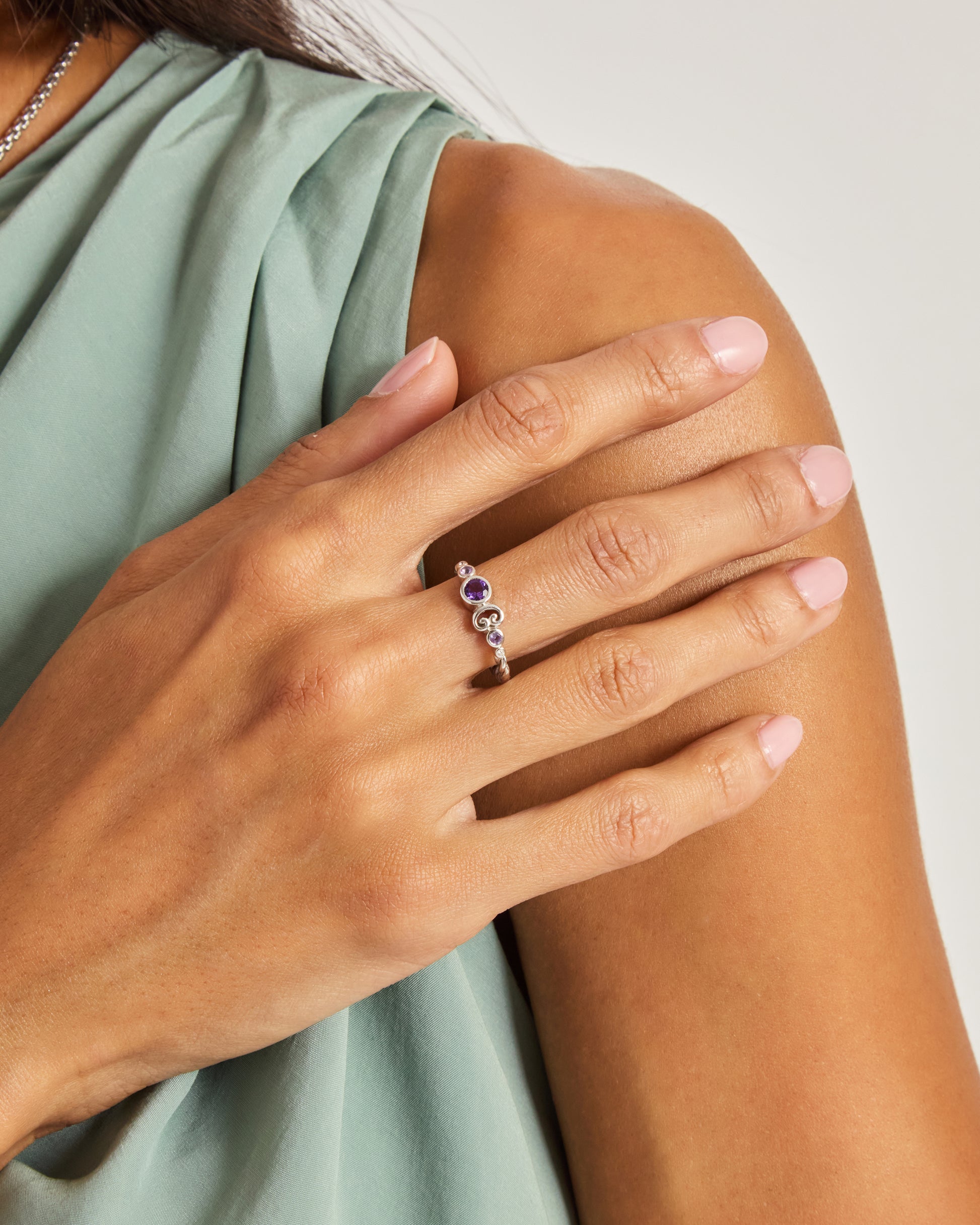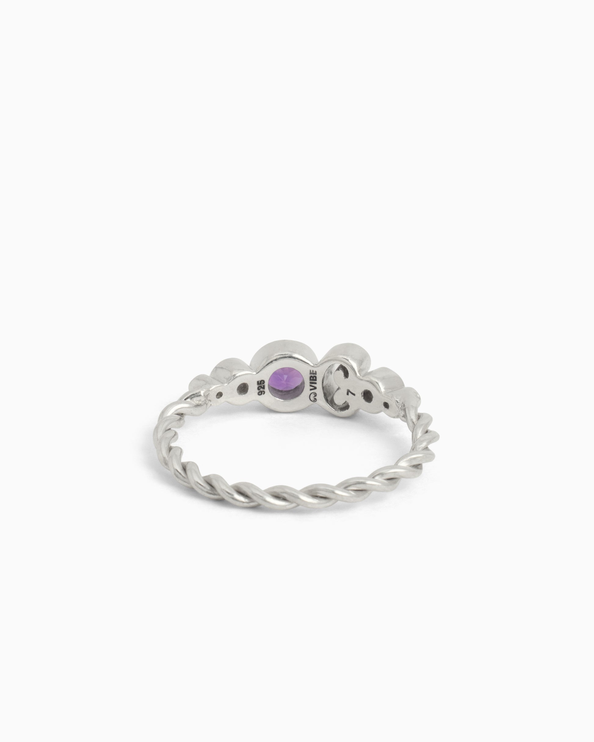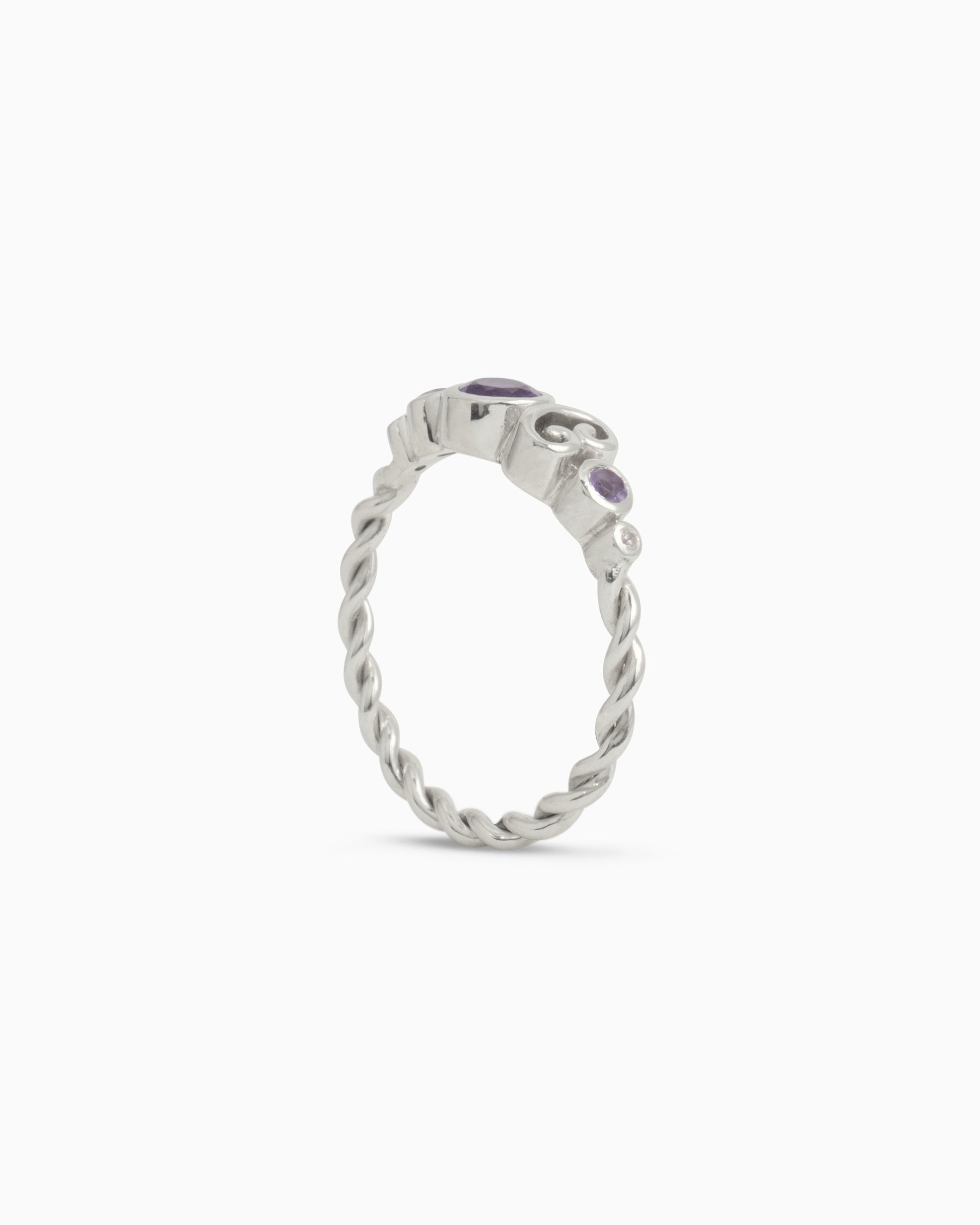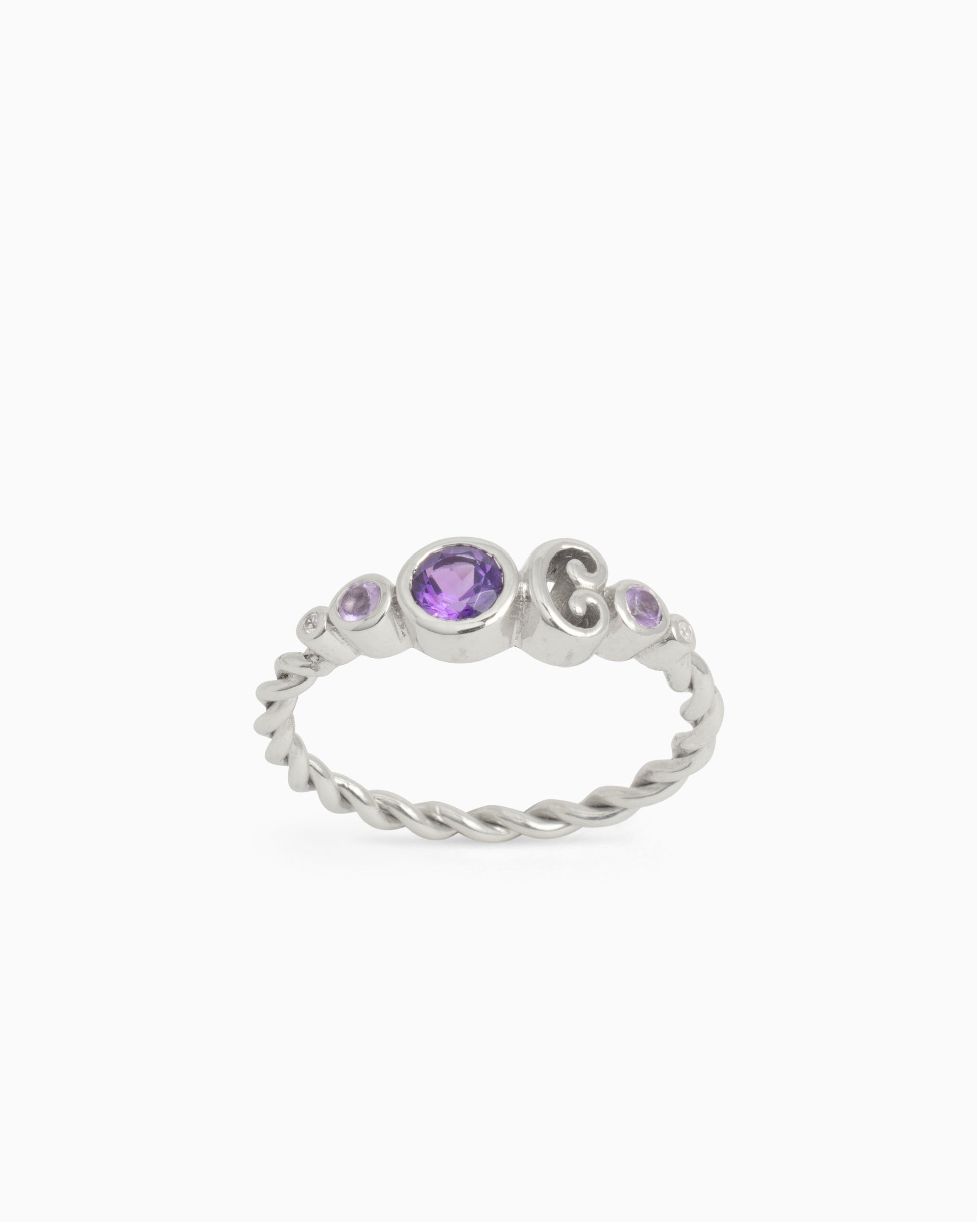 The Twisted Five Stone Ring with Open Petroglyph is handcrafted in sterling silver, featuring an intertwined, rope-inspired band. A central faceted amethyst stone is flanked by smaller amethyst and white zircon stones, along with our signature open petroglyph. Looks great as a versatile stacker or styled solo!