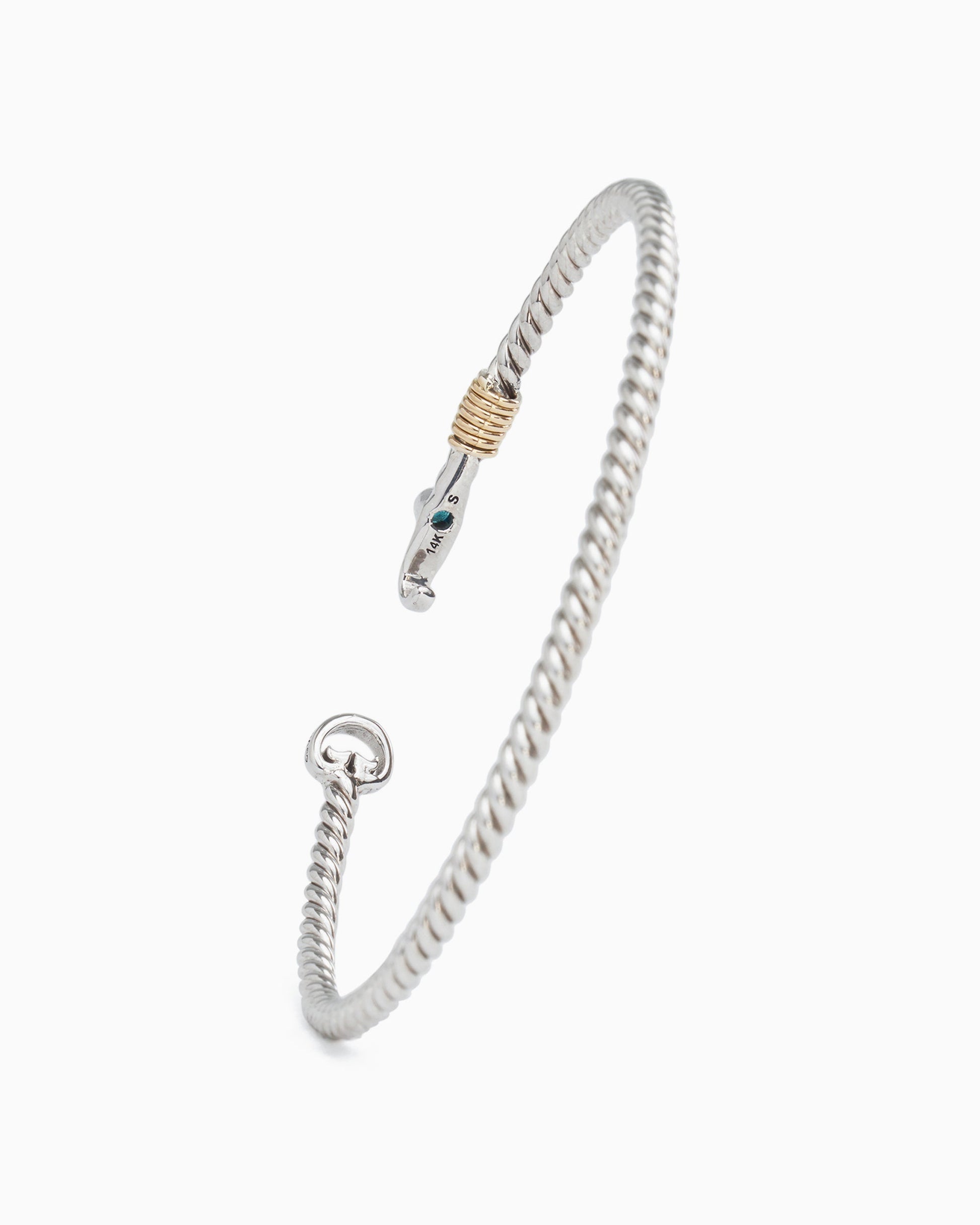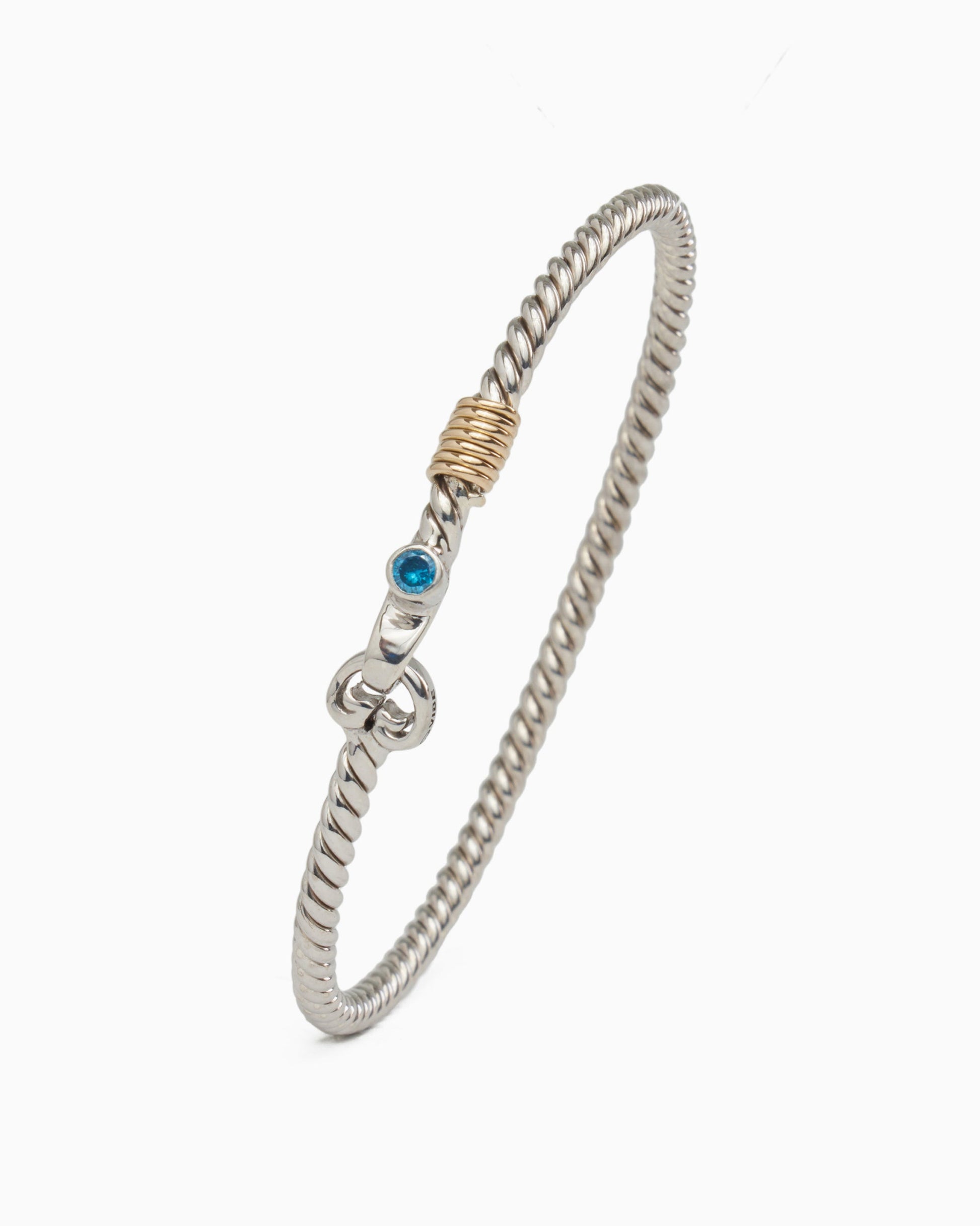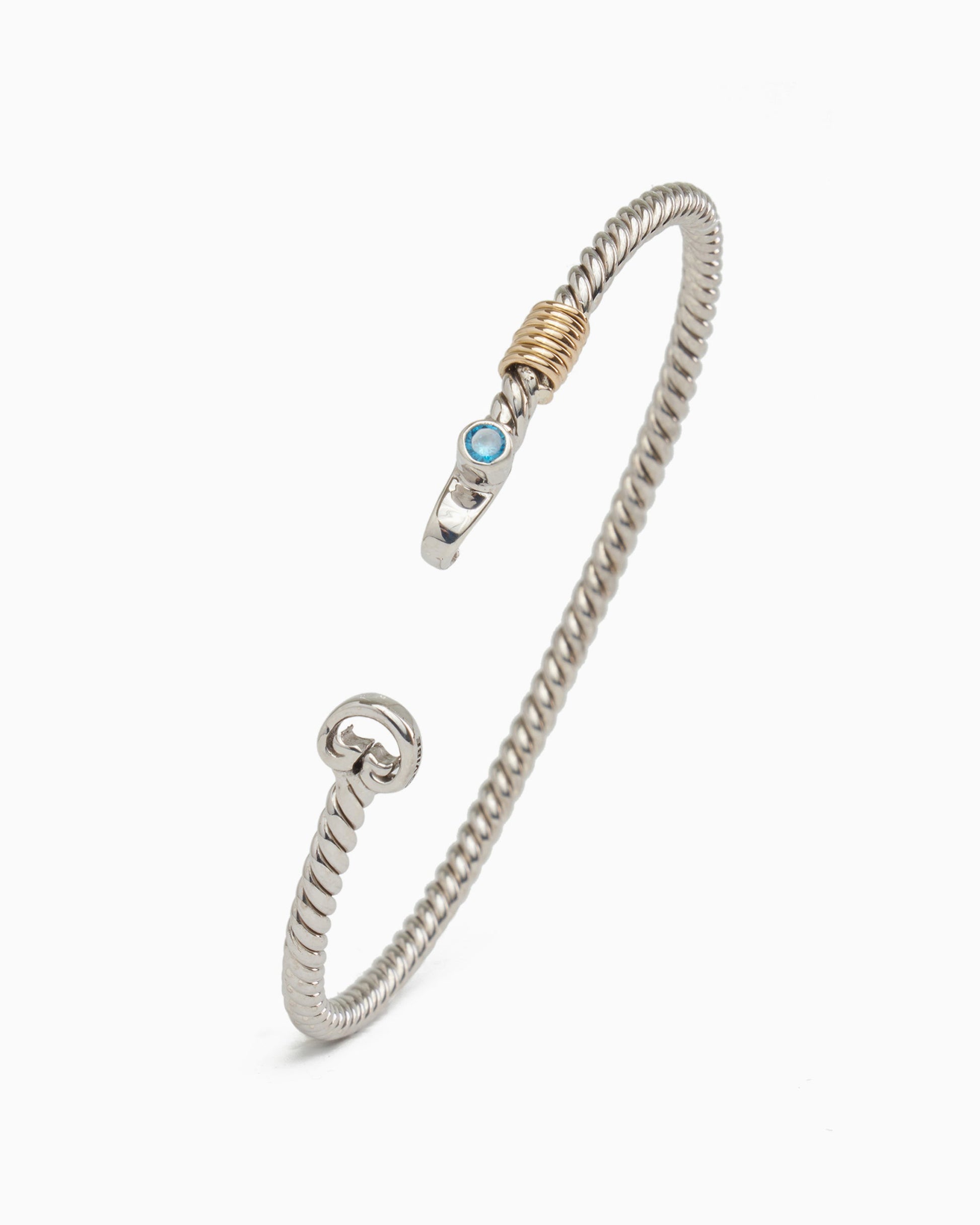This sterling silver piece features an intertwined rope-inspired band, seven 14K gold good luck wraps, a faceted blue zircon stone and a signature petroglyph clasp. Designed for stacking or to be worn on its own, the Twisted Hook Bracelet will elevate any look. Found in many of our designs, Vibe’s seven good luck wraps represent love, laughter, happiness, good fortune, health, unity, and peace.