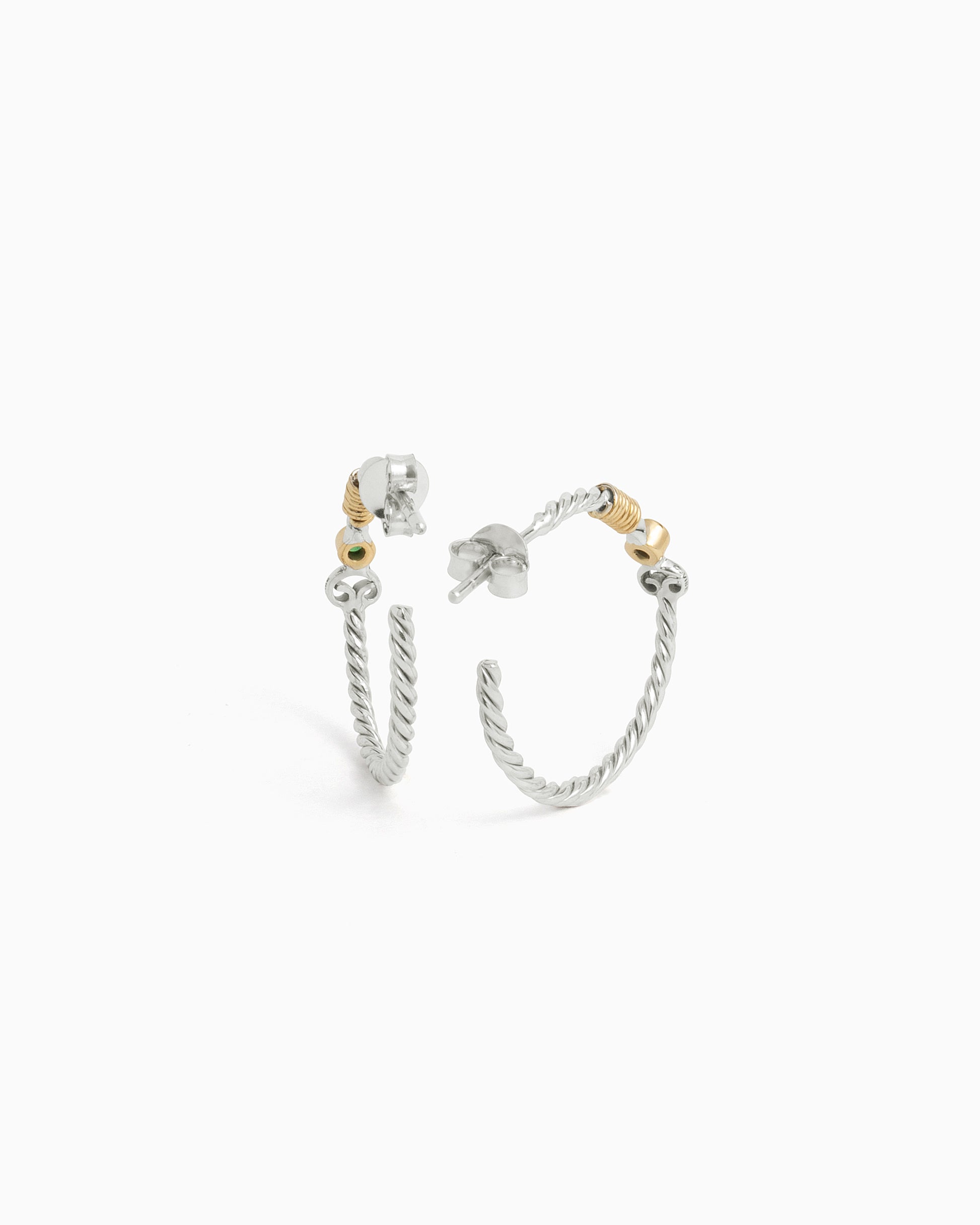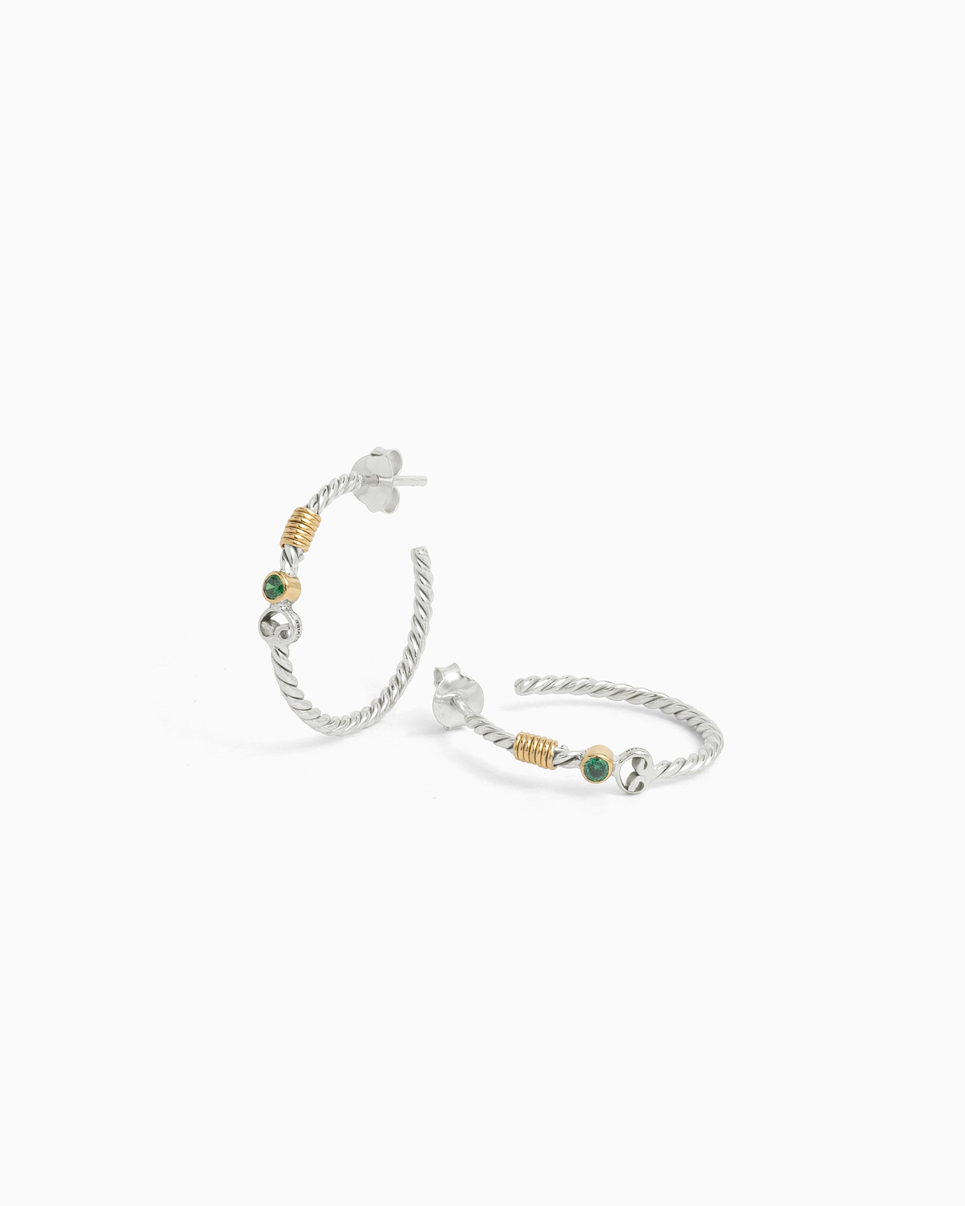 Vibe's Twisted Hoops feature an intertwined rope-inspired look. Handcrafted in sterling silver wrapped with seven 14K gold good luck wraps and a 14K gold set faceted stone. Found in many of our designs, Vibe’s seven good luck wraps represent love, laughter, happiness, good fortune, health, unity, and peace. Pair with our Twisted Ring or Hook Bracelet for a cohesive look.