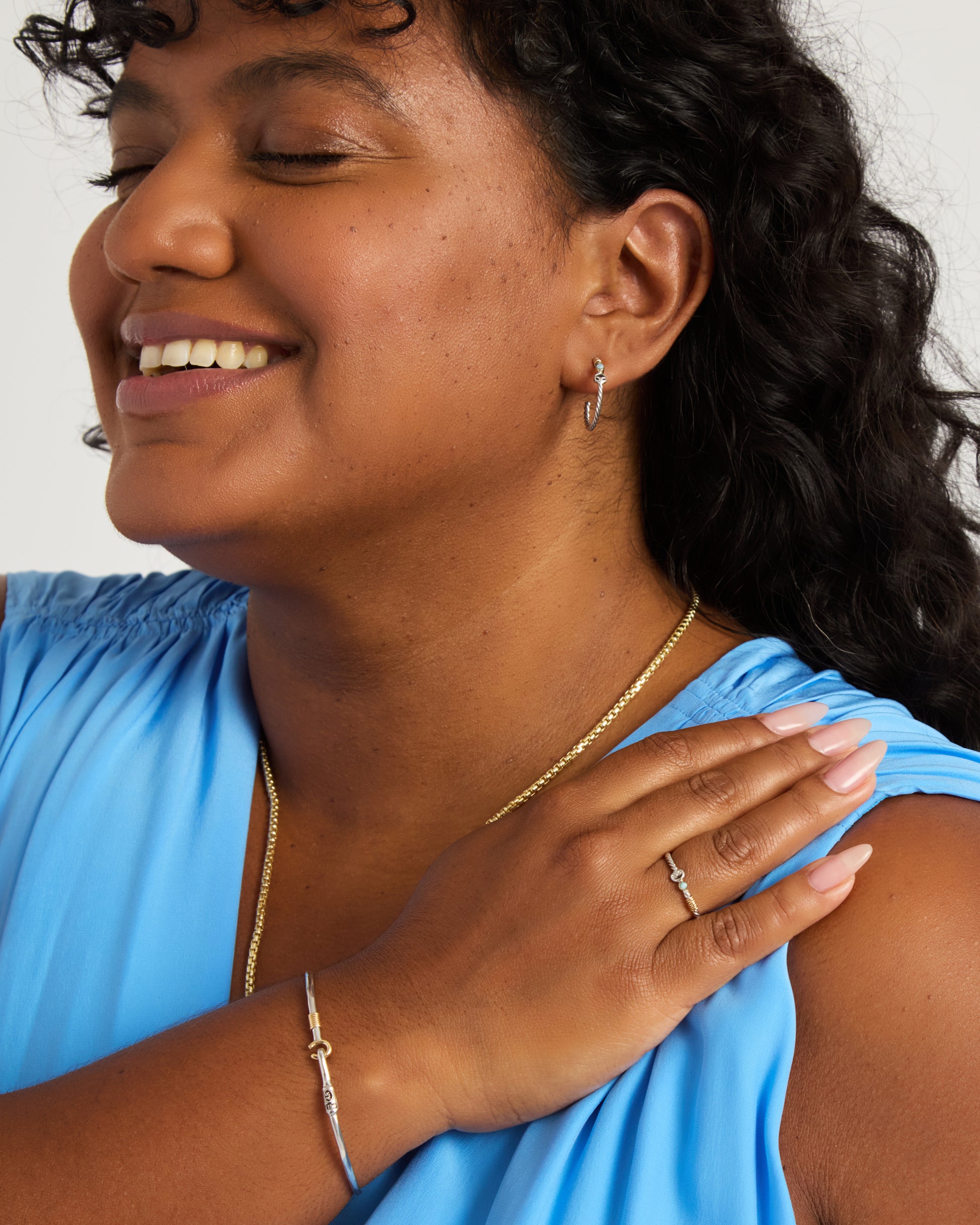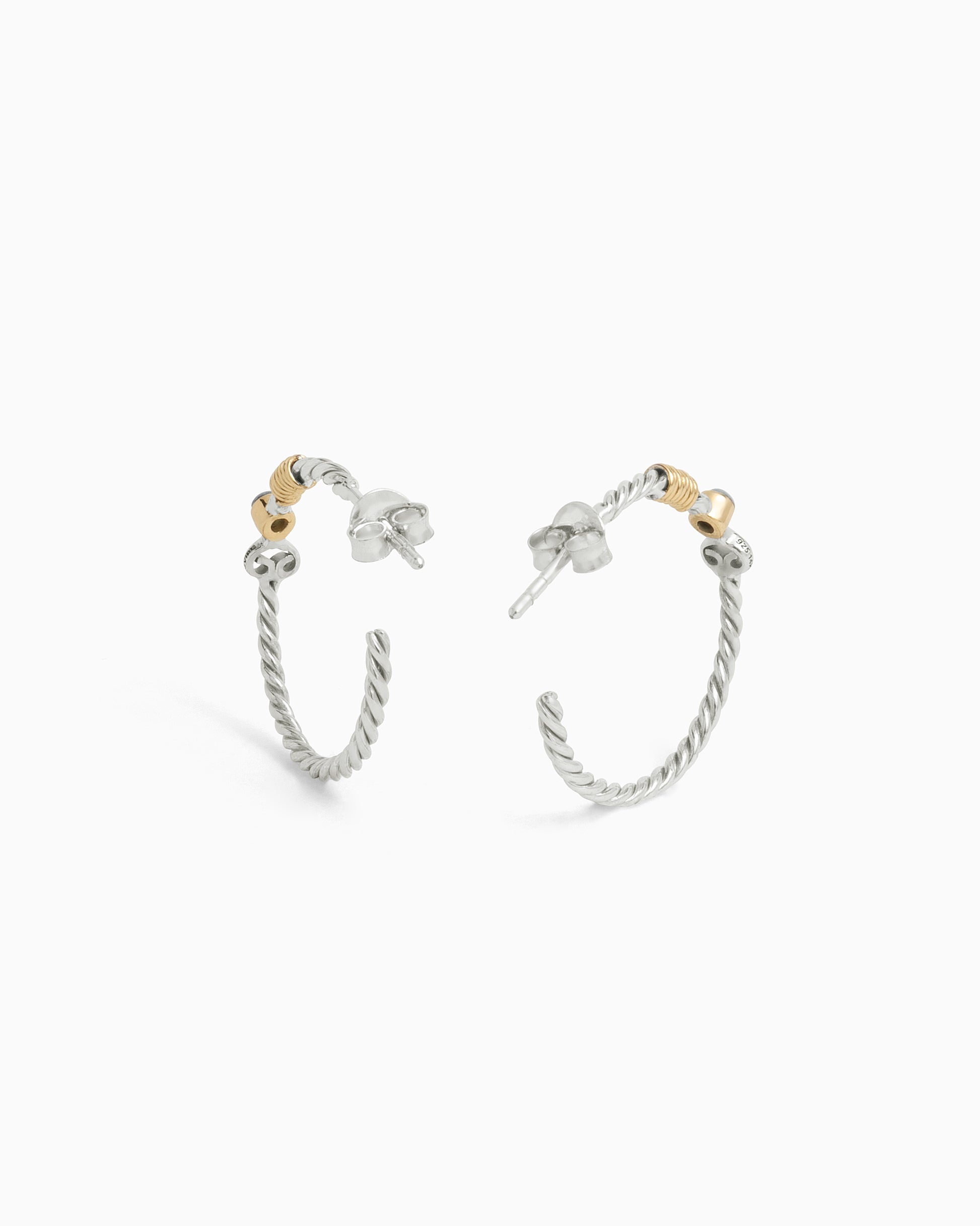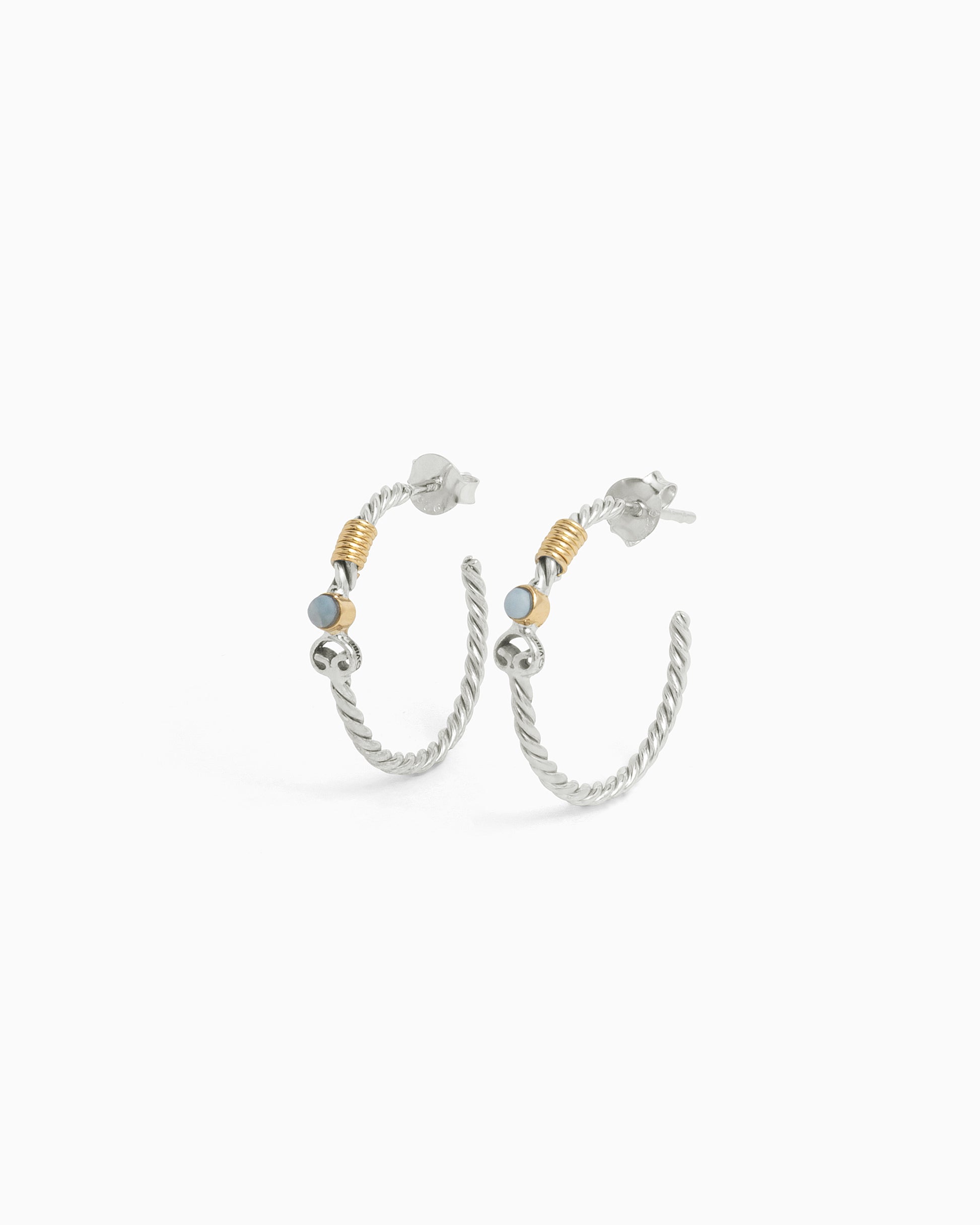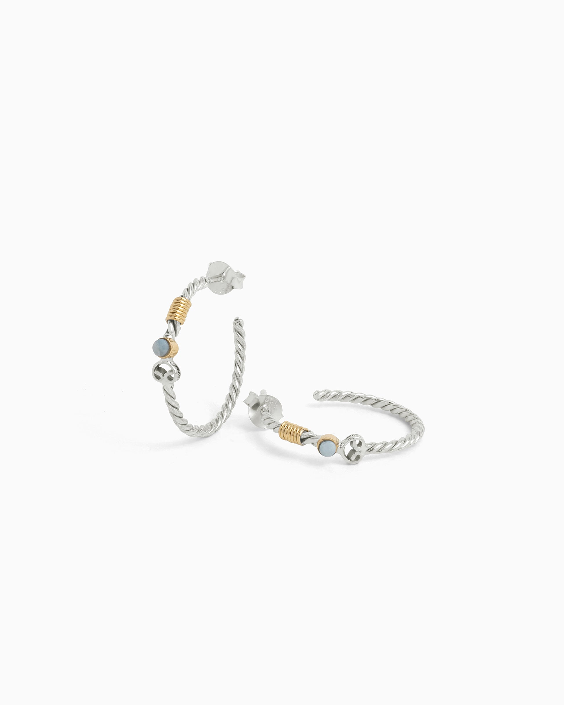 Vibe's Twisted Hoops feature an intertwined rope-inspired look. Handcrafted in sterling silver wrapped with seven 14K gold good luck wraps and a 14K gold set larimar stone. Found in many of our designs, Vibe’s seven good luck wraps represent love, laughter, happiness, good fortune, health, unity, and peace. Pair with our Twisted Ring or Hook Bracelet for a cohesive look.