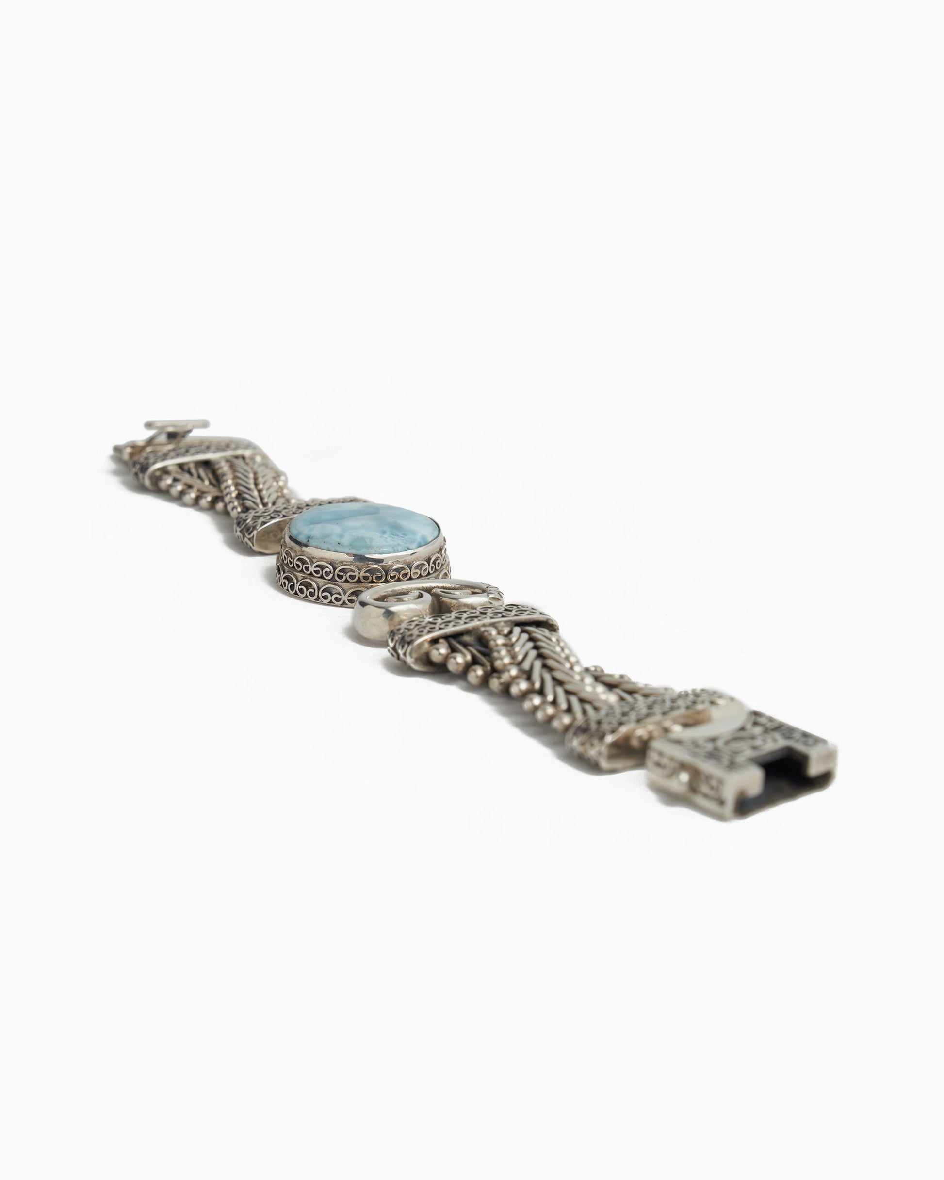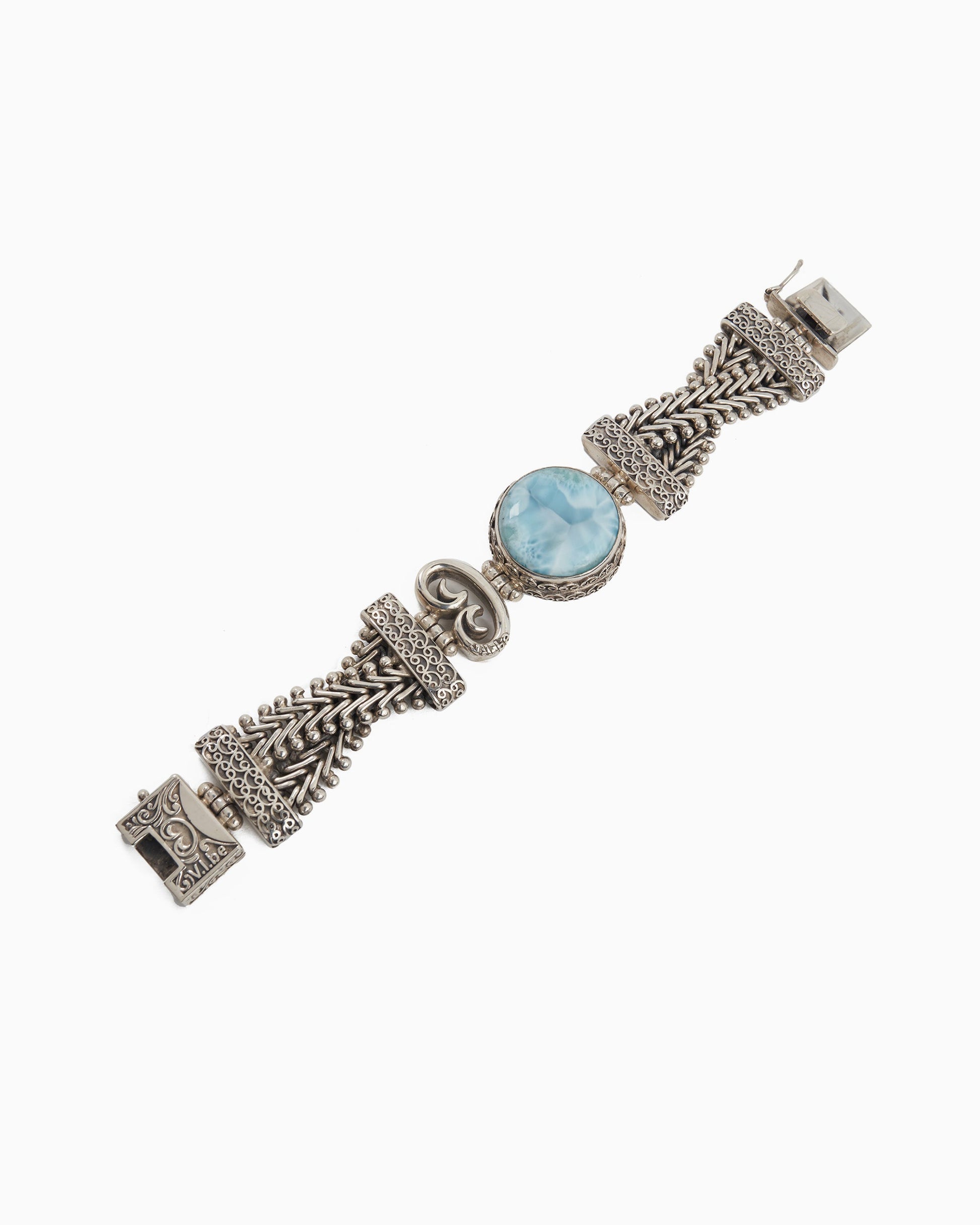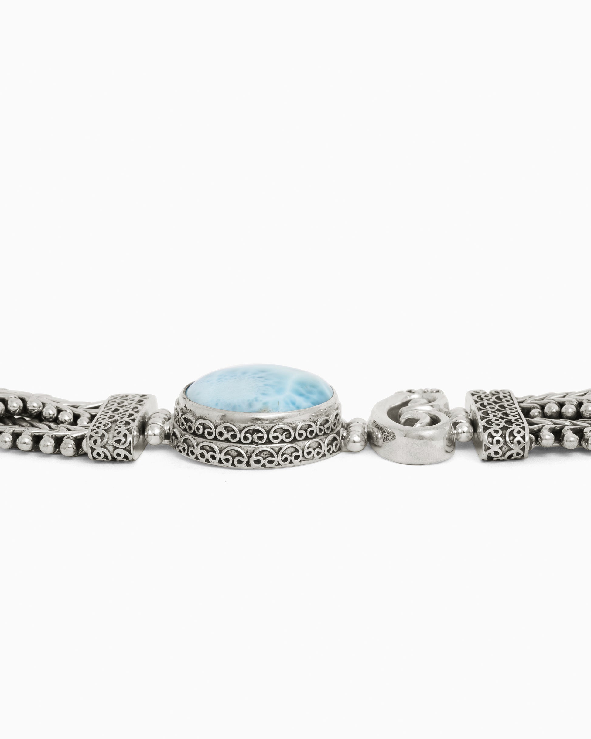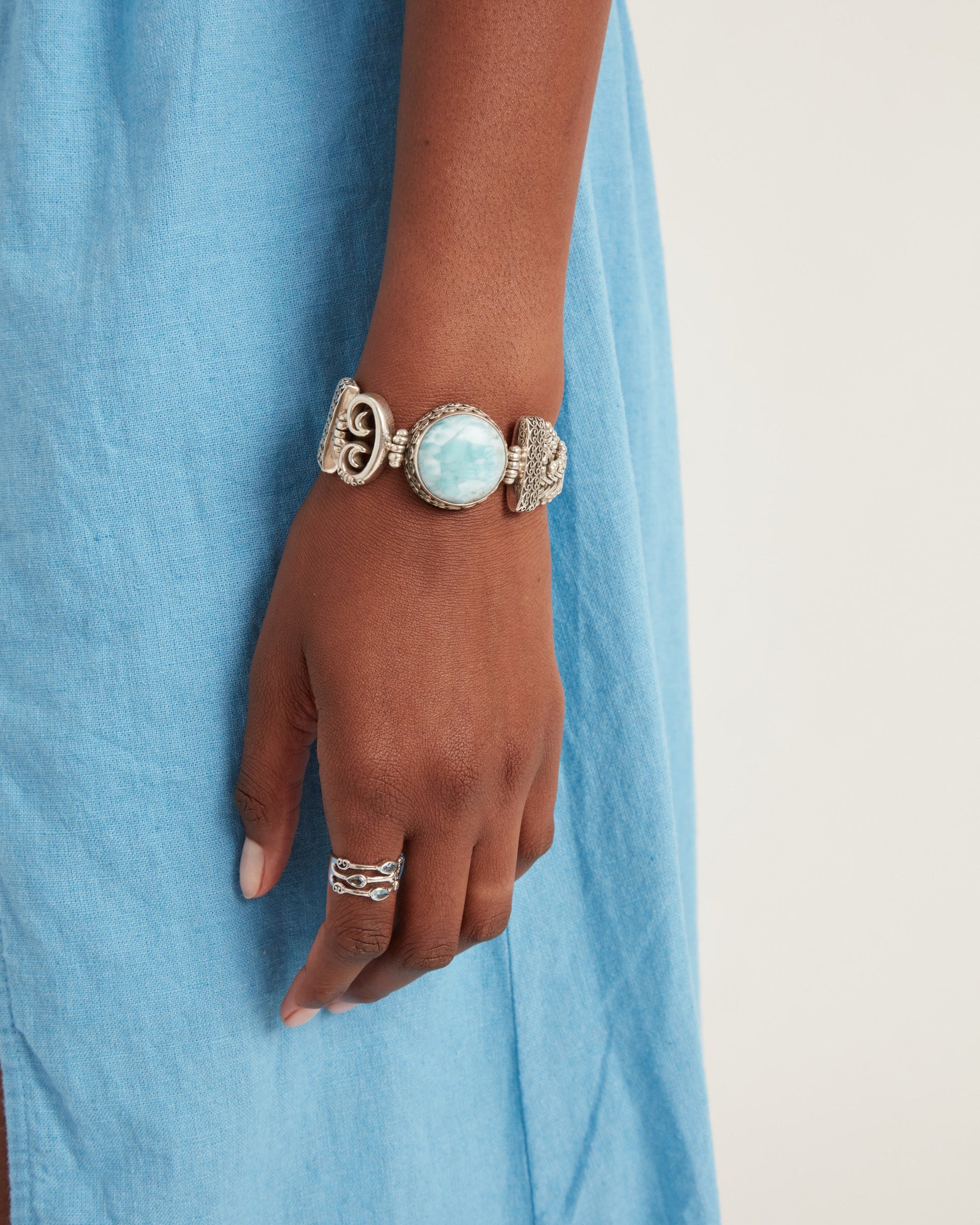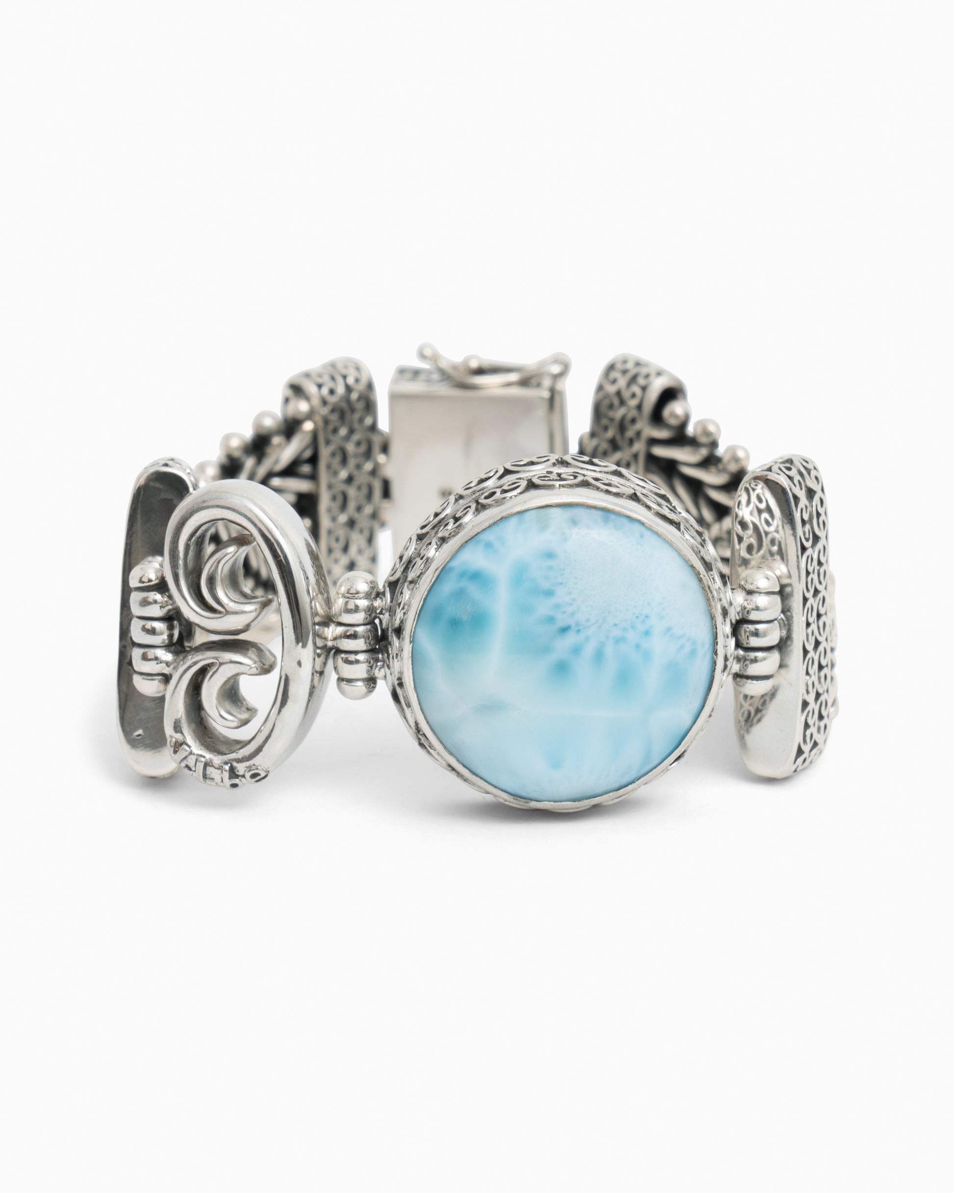 The Twisted Link Bracelet with Larimar & Petroglyph is handcrafted in sterling silver and features a magnificent larimar cabochon, statement petroglyph, and intricate petroglyph detailing all around the setting. This handcrafted design is inspired by the crystal blue waters of the Caribbean.