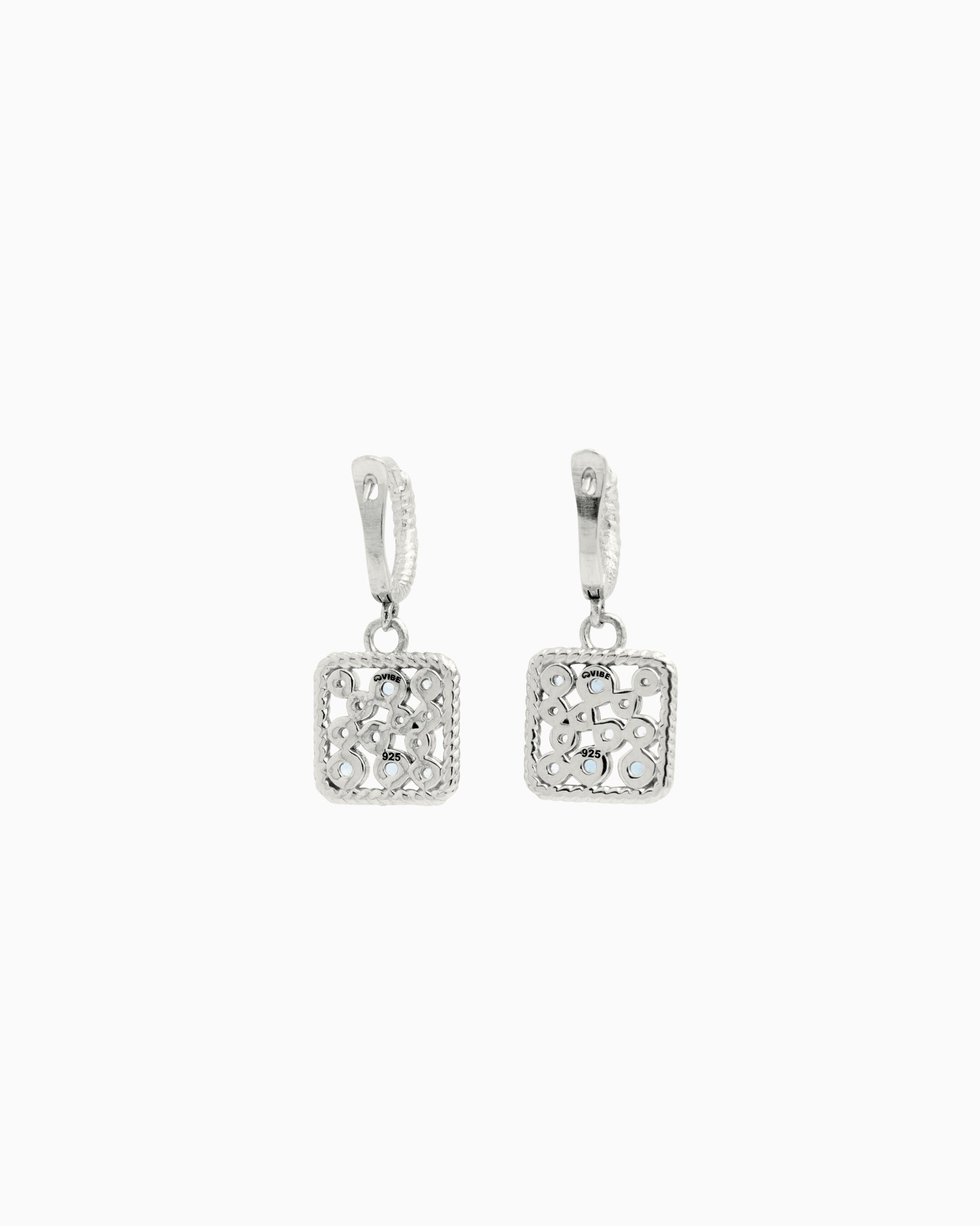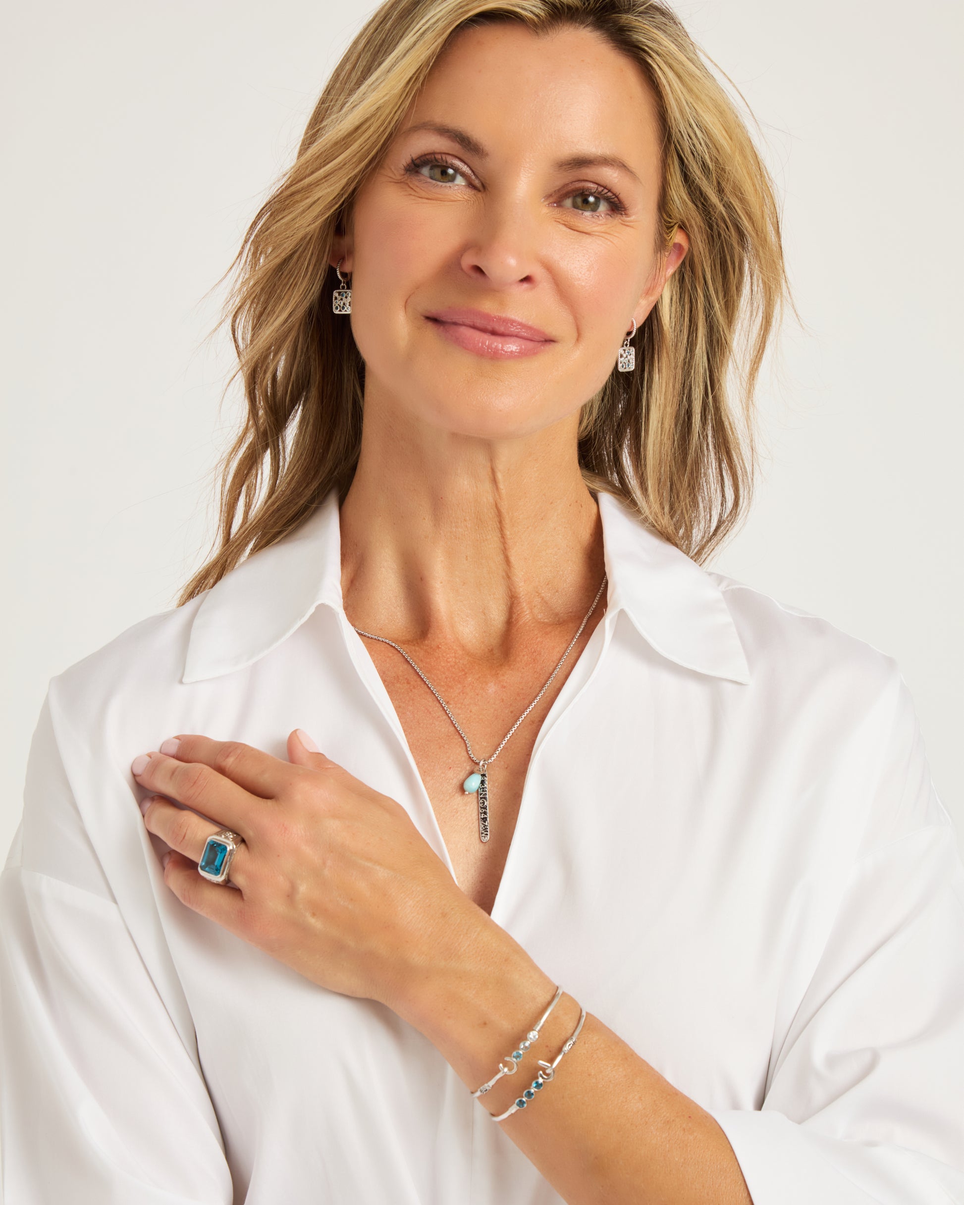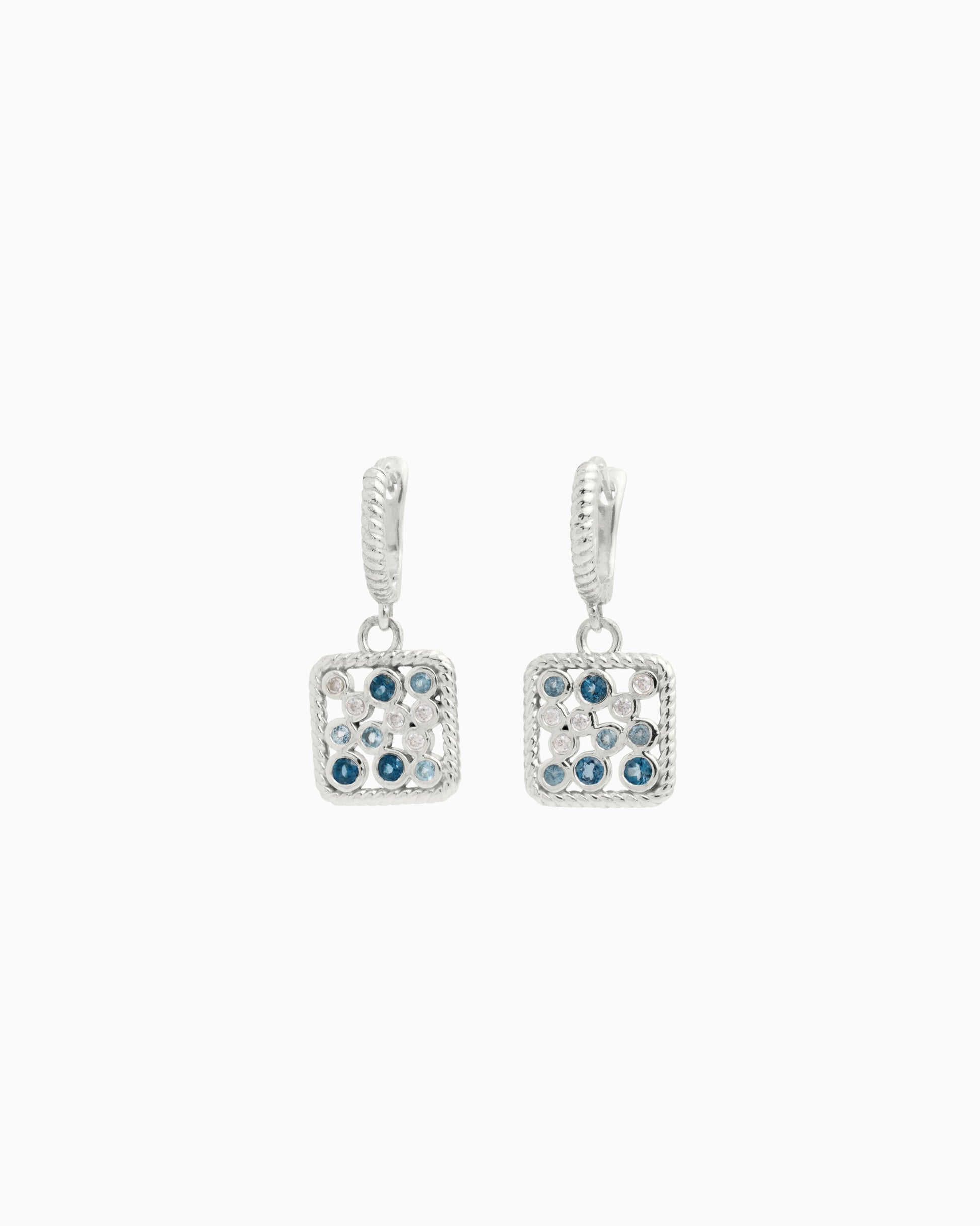 The Twisted Ocean Bubbles Drop Huggies feature faceted London blue topaz, Hampton blue topaz, and white zircon stones, arranged slightly askew in a playful design inspired by a cascade of bubbles. These earrings are handcrafted in sterling silver with twisted detailing along the square frame and huggie hoop. Pair with the Twisted Ocean Bubbles Pendant for the perfect set.