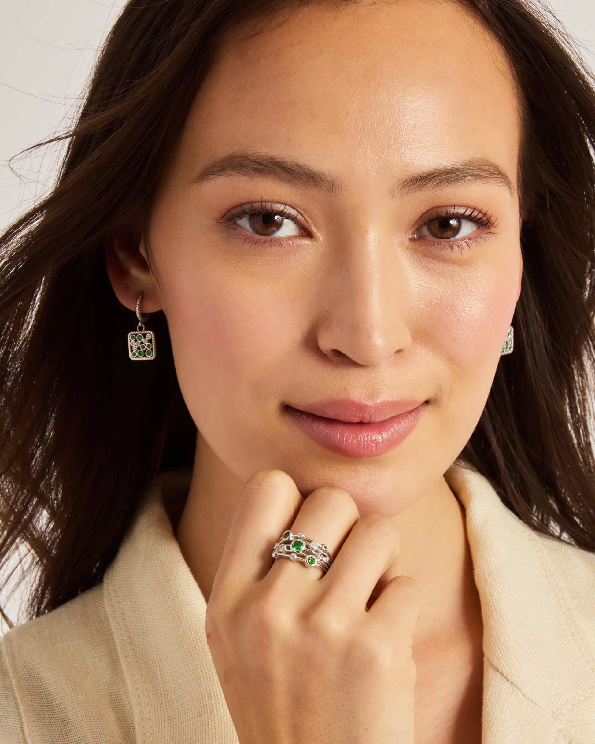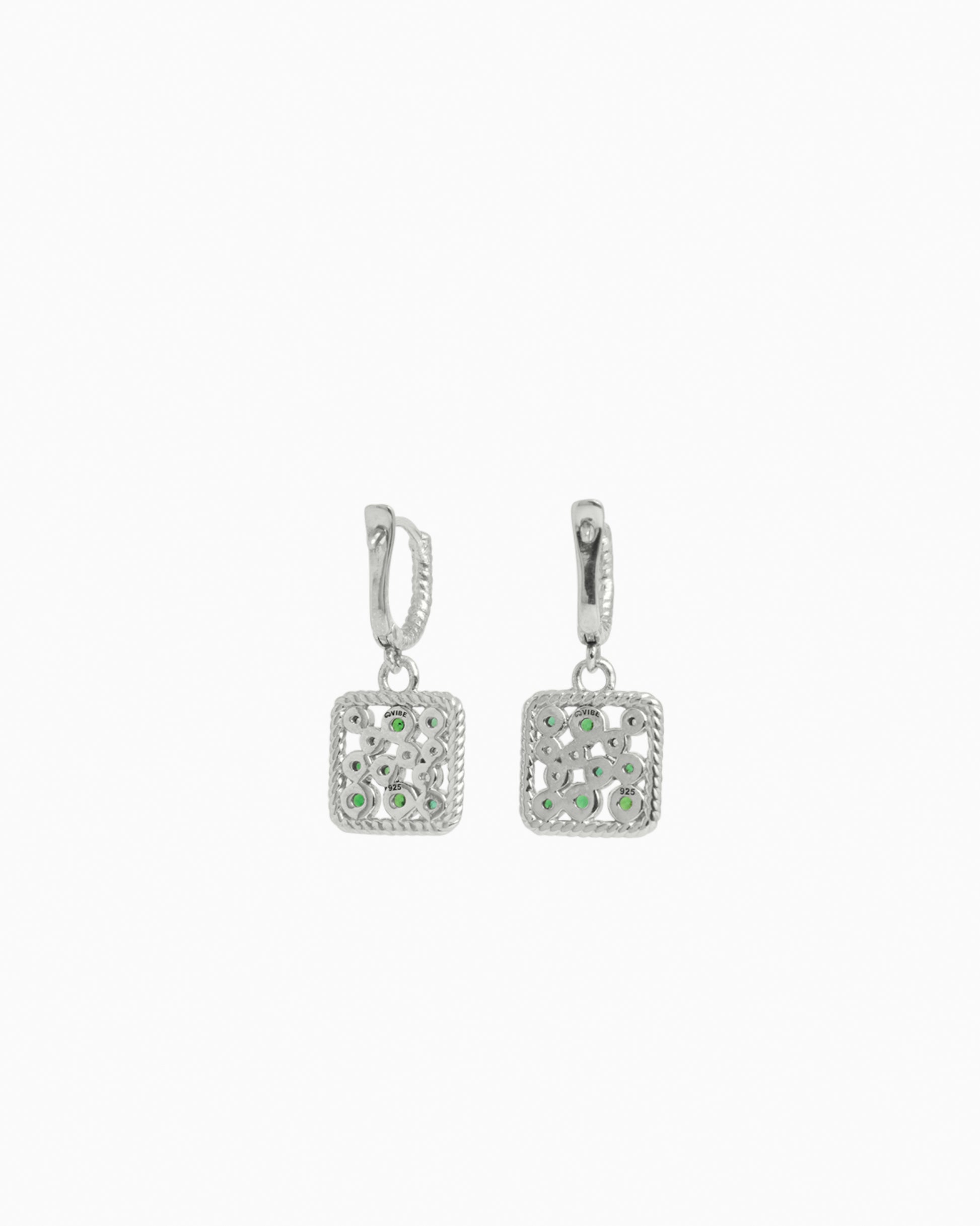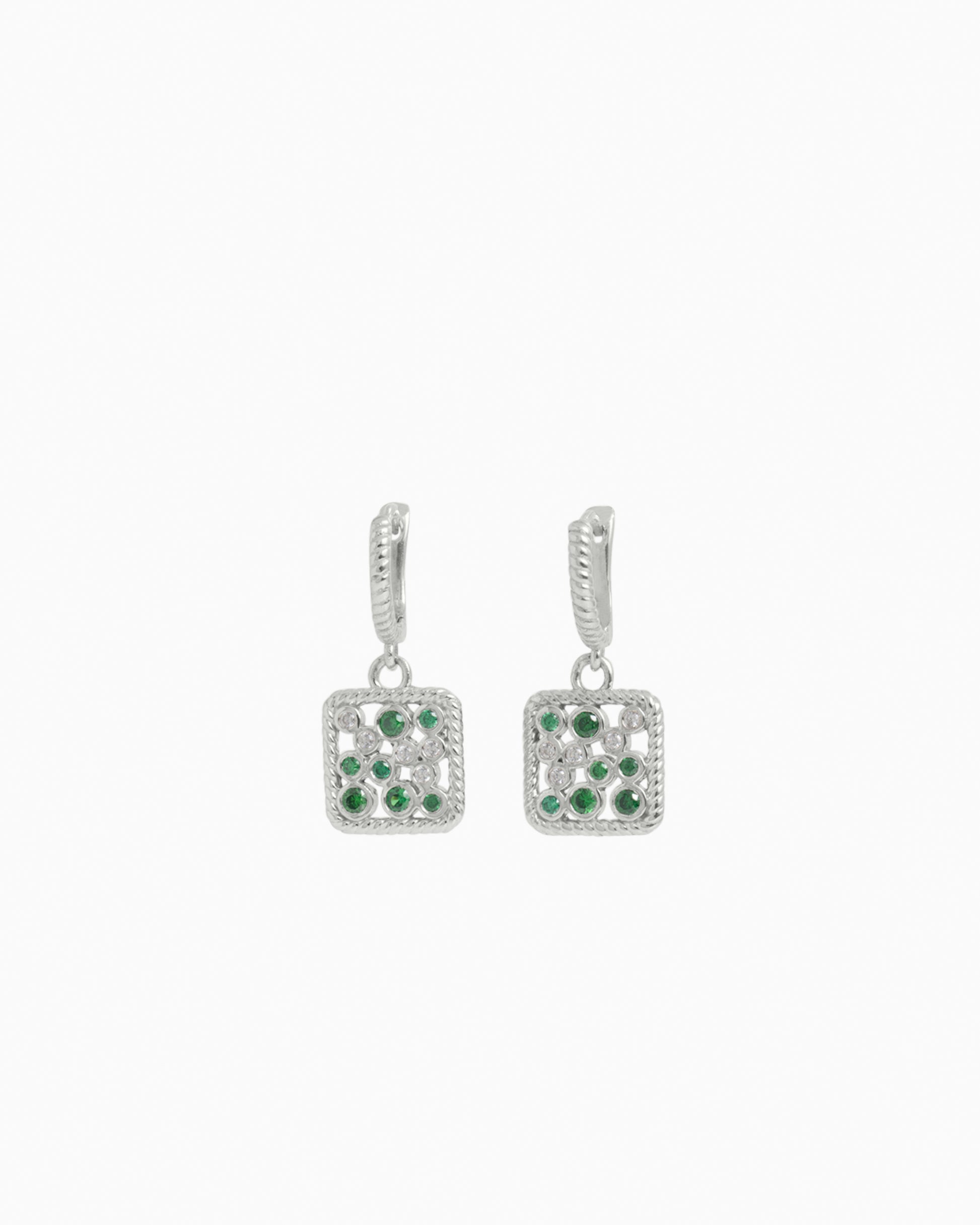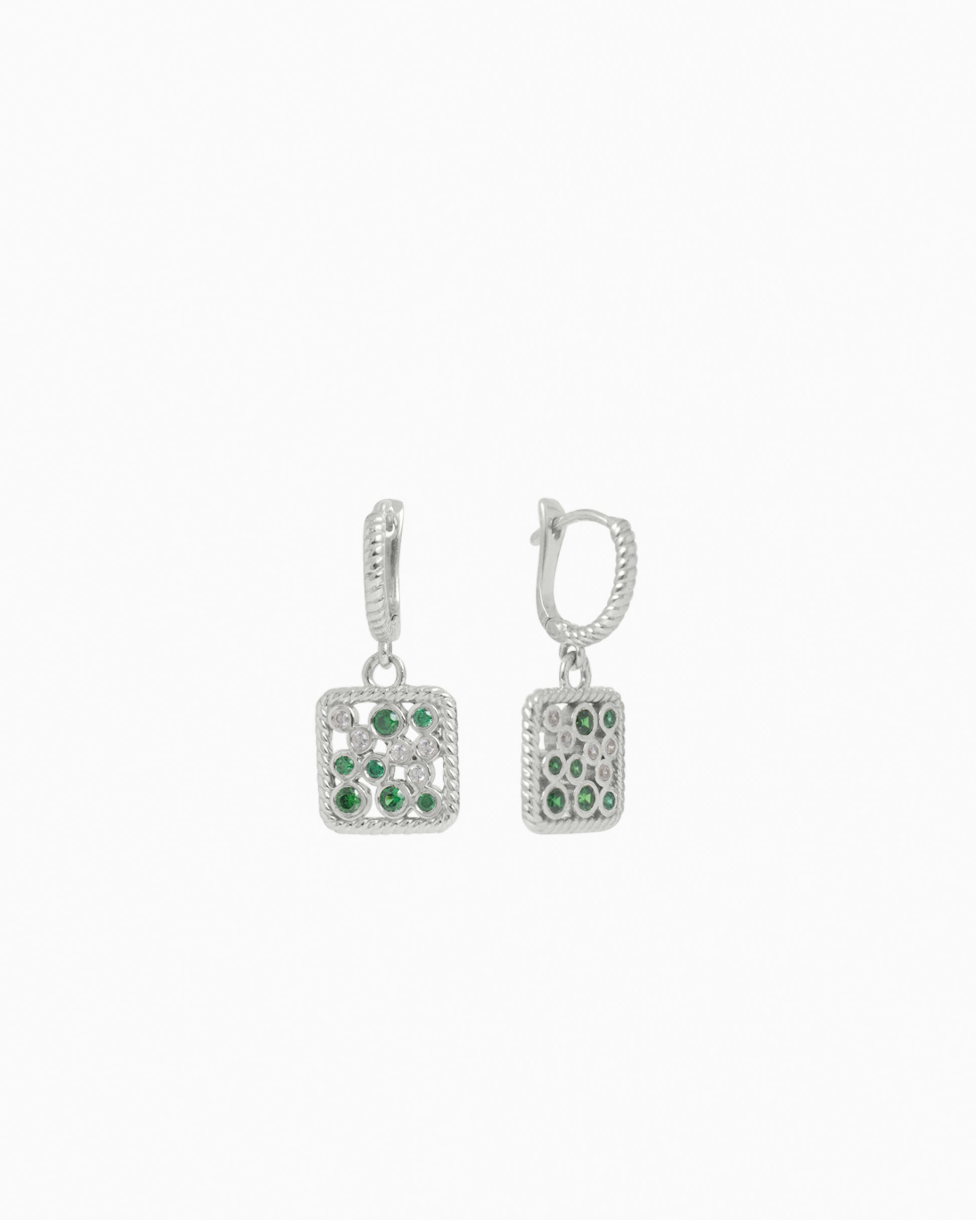 The Twisted Ocean Bubbles Drop Earrings feature faceted green zircon and white zircon stones in various sizes arranged slightly askew in a playful design inspired by a cascade of bubbles. These earrings are handcrafted in sterling silver with twisted detailing along the square frame and huggie hoop. Pair with the Twisted Ocean Bubbles Pendant for the perfect set.