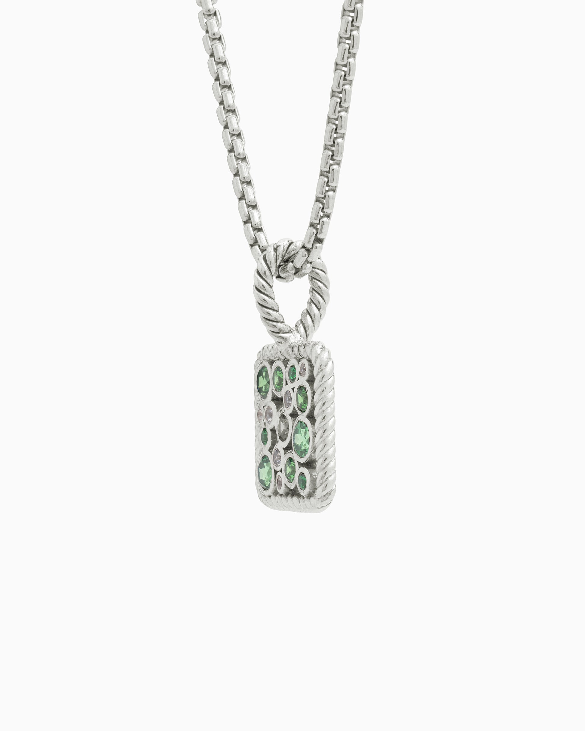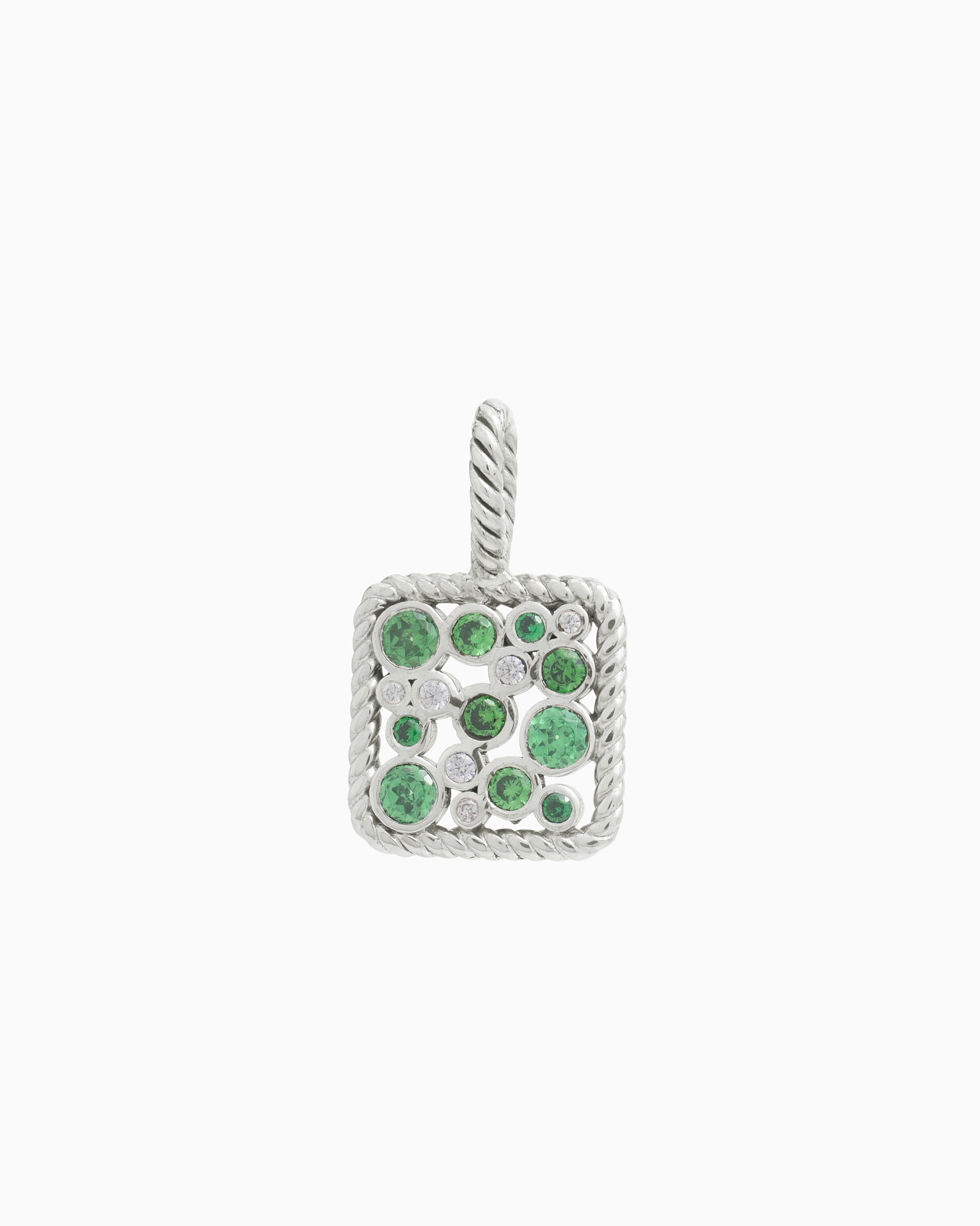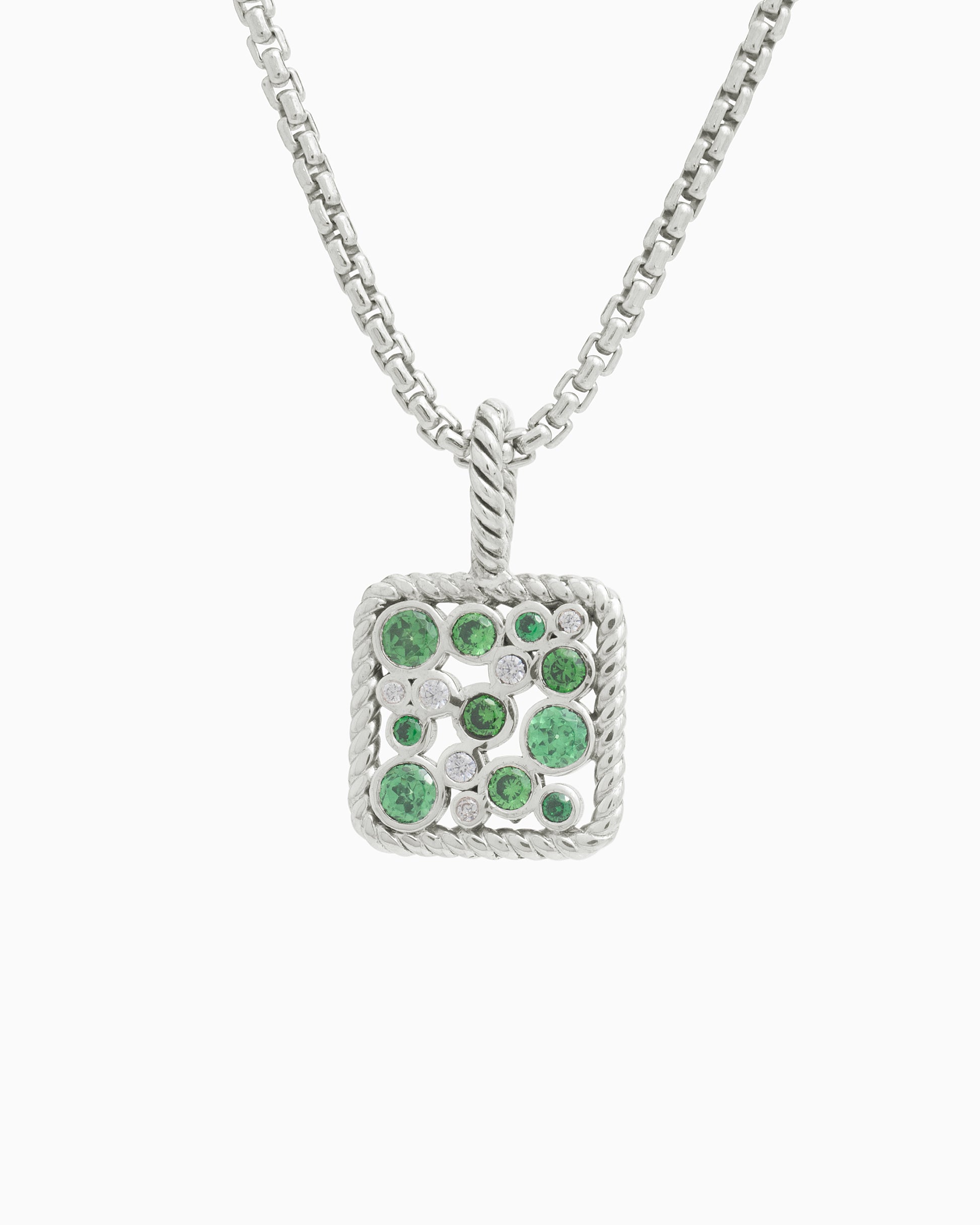 The Twisted Ocean Bubbles Pendant is an eye-catching piece featuring a mix of faceted green zircon and white zircon stones all in different sizes. This pendant is handcrafted in sterling silver with twisted detailing along the entire square and bail. Pair with your favorite chain, sold separately.