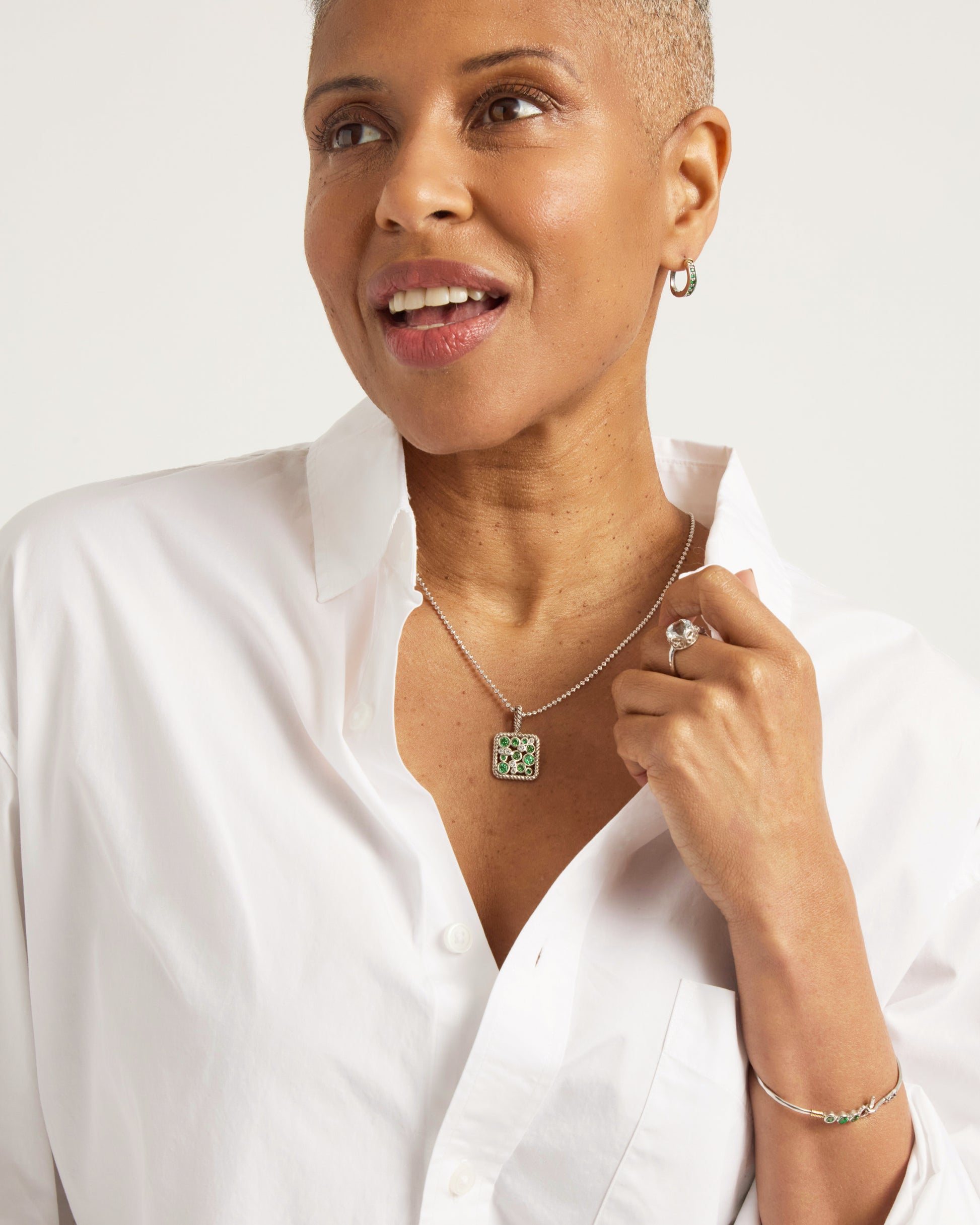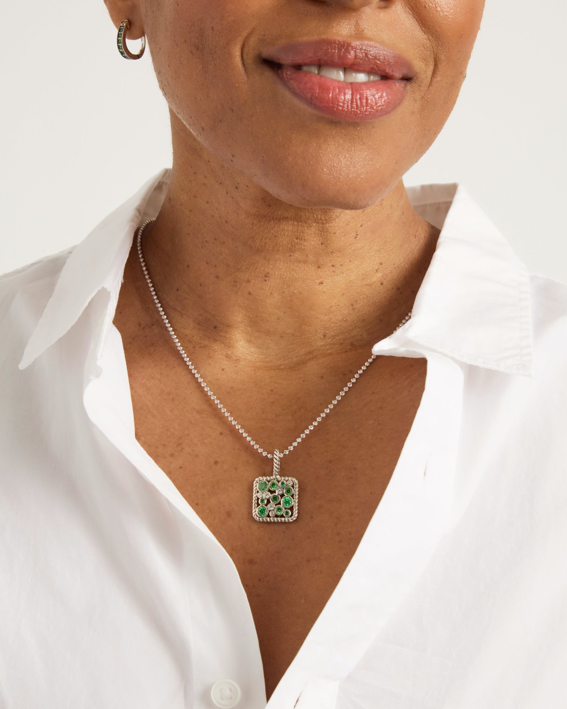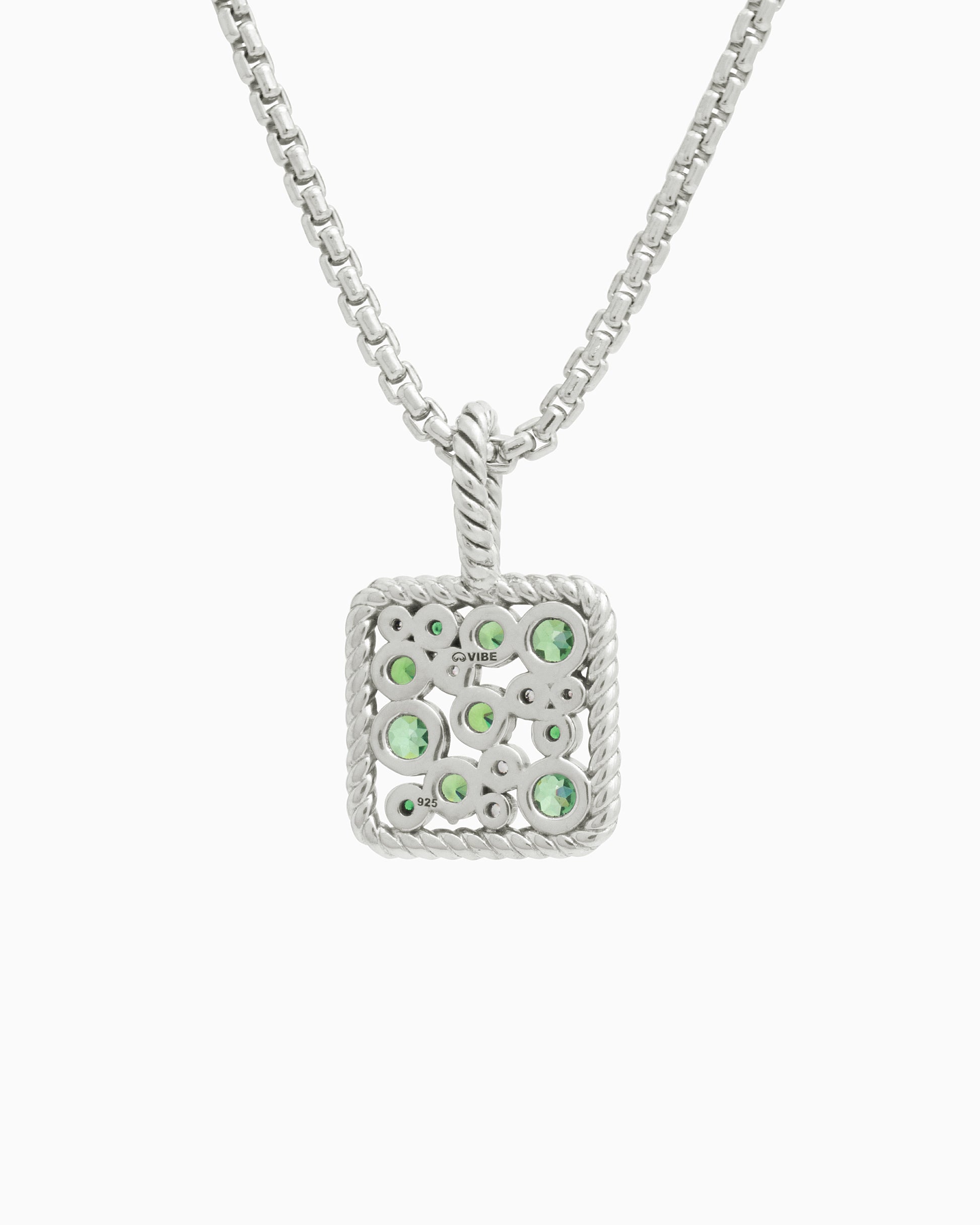 The Twisted Ocean Bubbles Pendant is an eye-catching piece featuring a mix of faceted green zircon and white zircon stones all in different sizes. This pendant is handcrafted in sterling silver with twisted detailing along the entire square and bail. Pair with your favorite chain, sold separately.