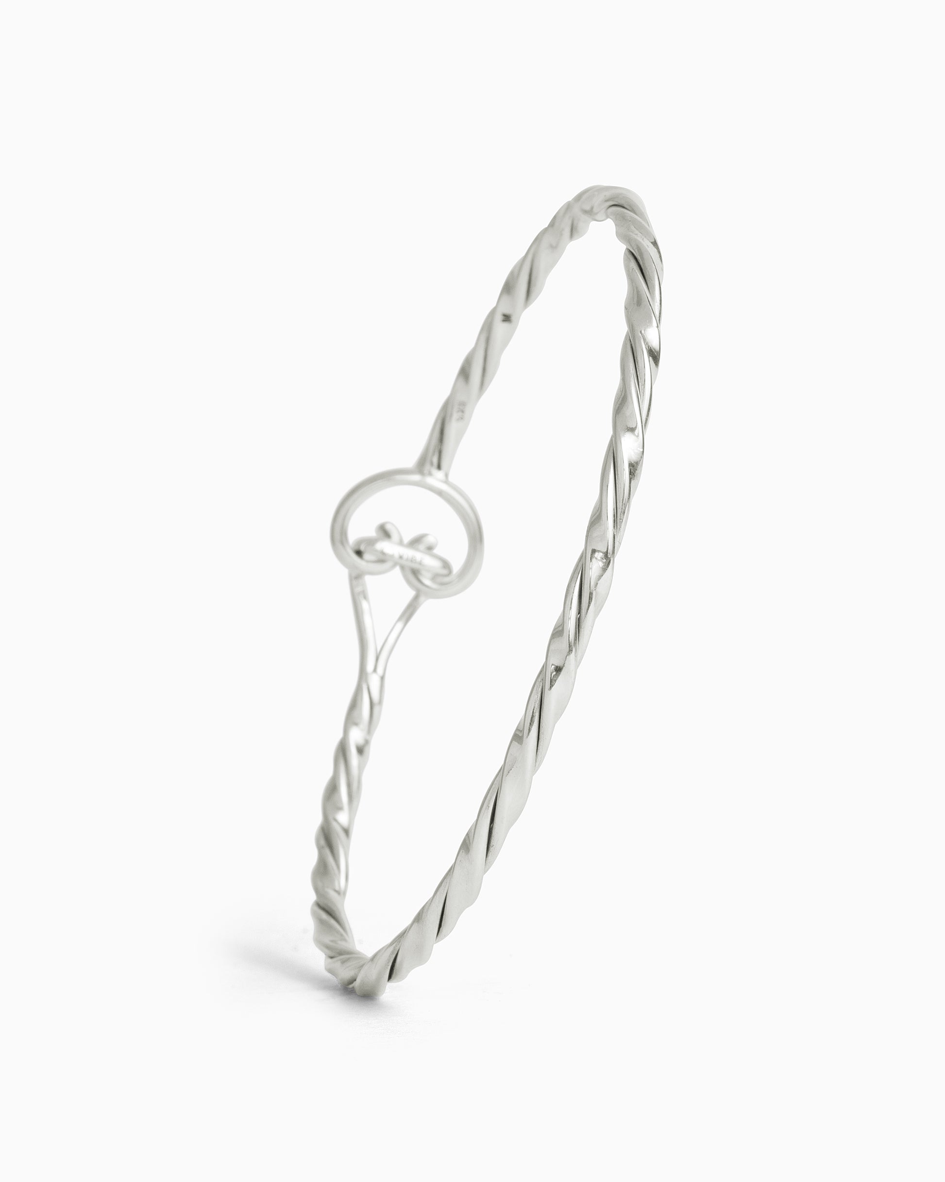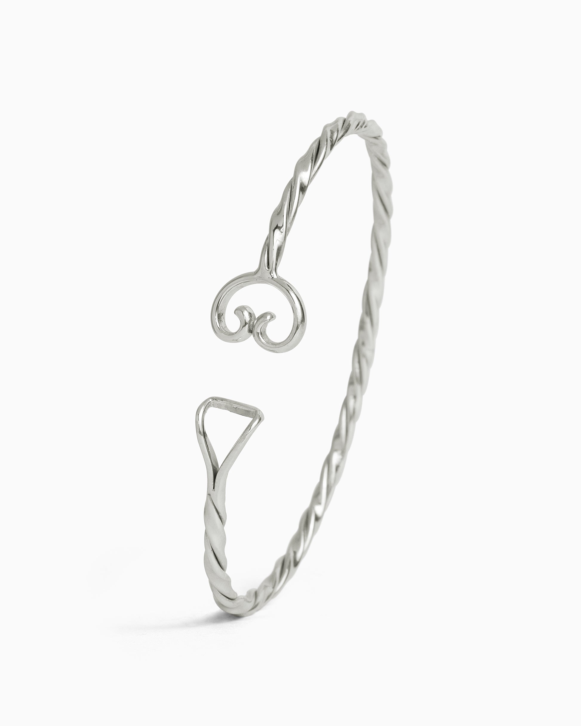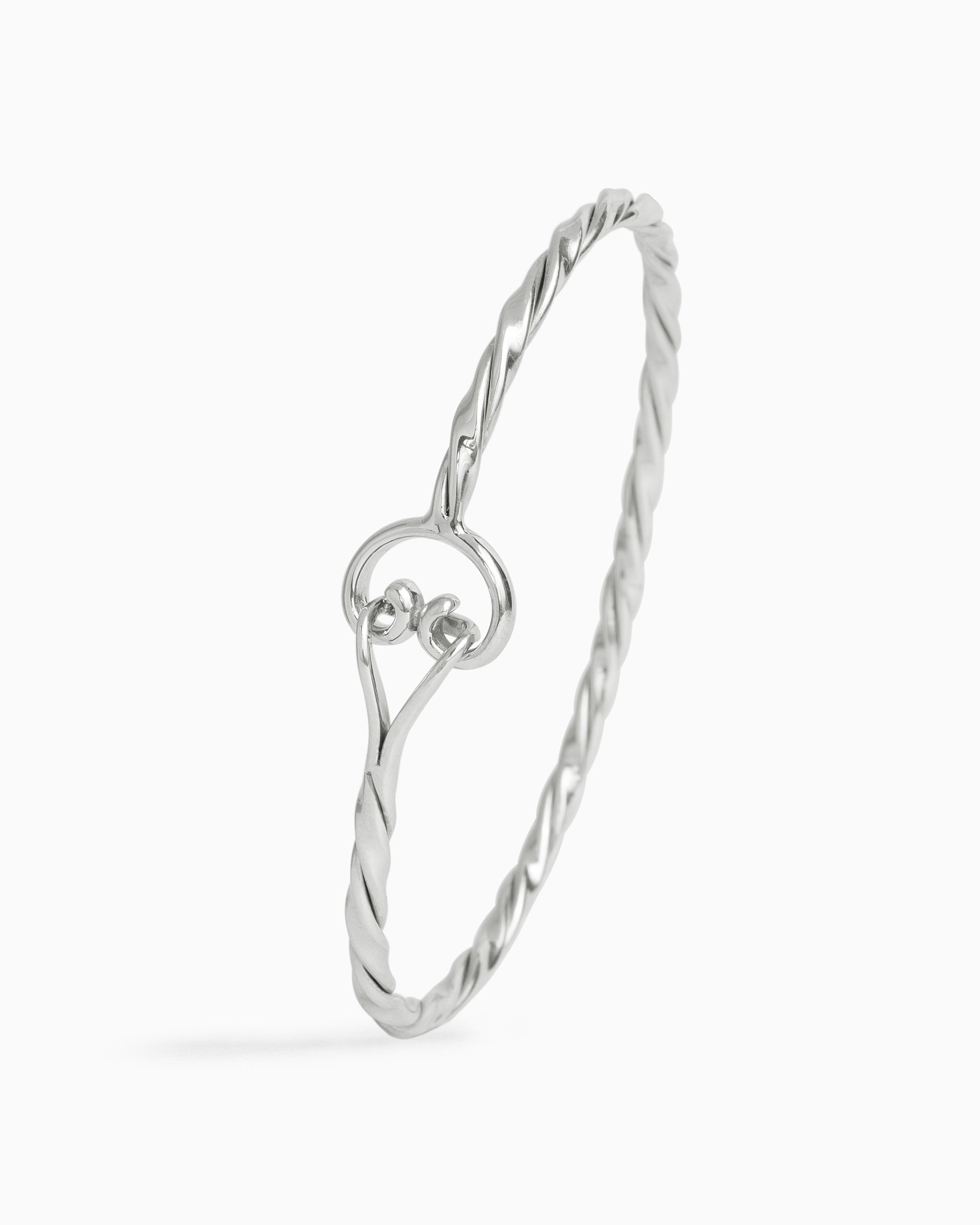 The Twisted Petroglyph Hook Bracelet is an elegant sterling silver bracelet that features a loosely twisted rope-inspired band and signature St. John petroglyph closure.