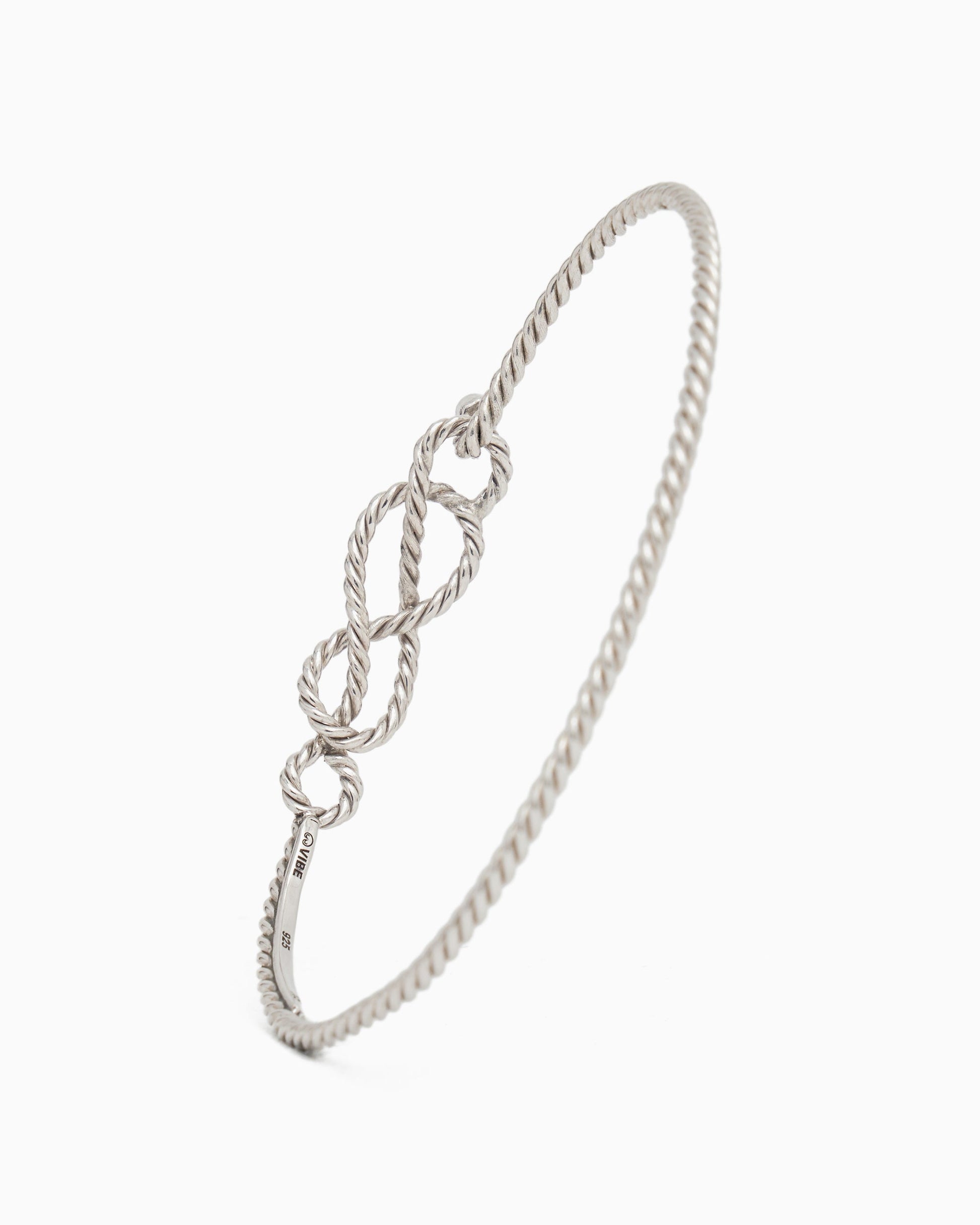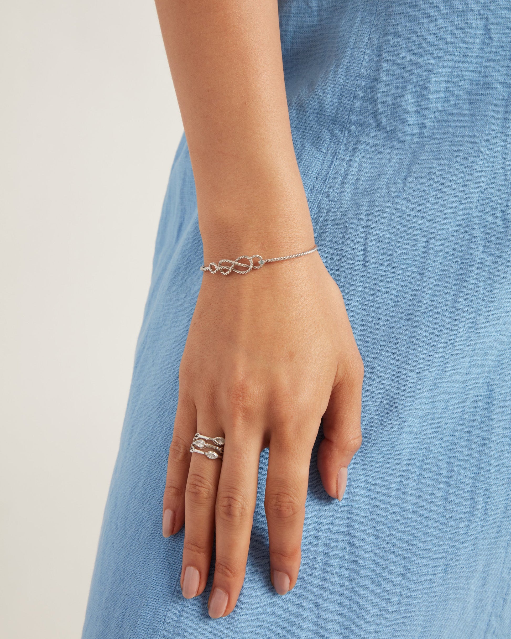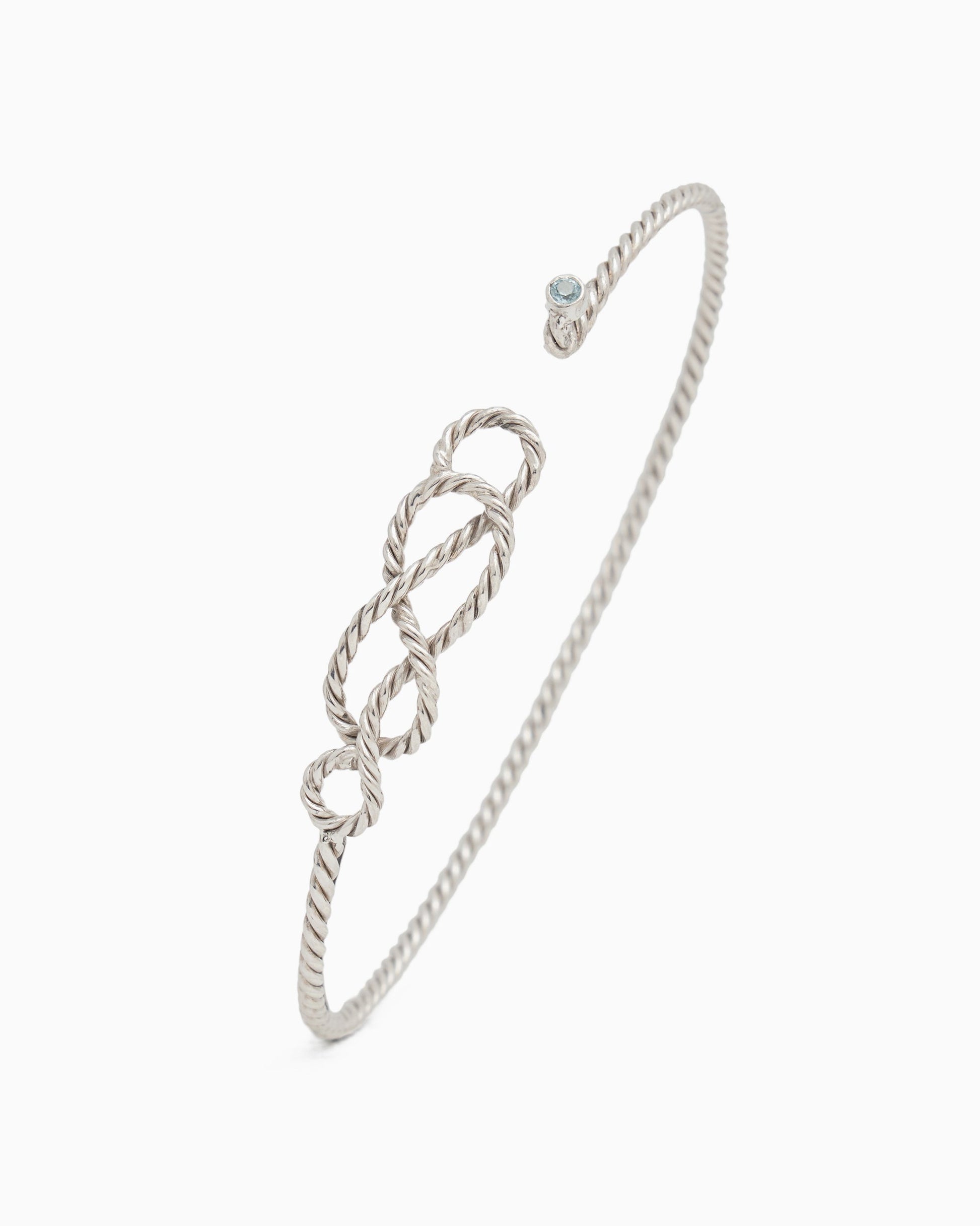 The Twisted Sailor's Knot Bracelet, handcrafted in sterling silver, features a twisted rope-inspired band and sailor's knot wrapped around a faceted Hampton blue topaz stone. Uniquely nautical yet universally fashionable, it's a great addition to any collection.