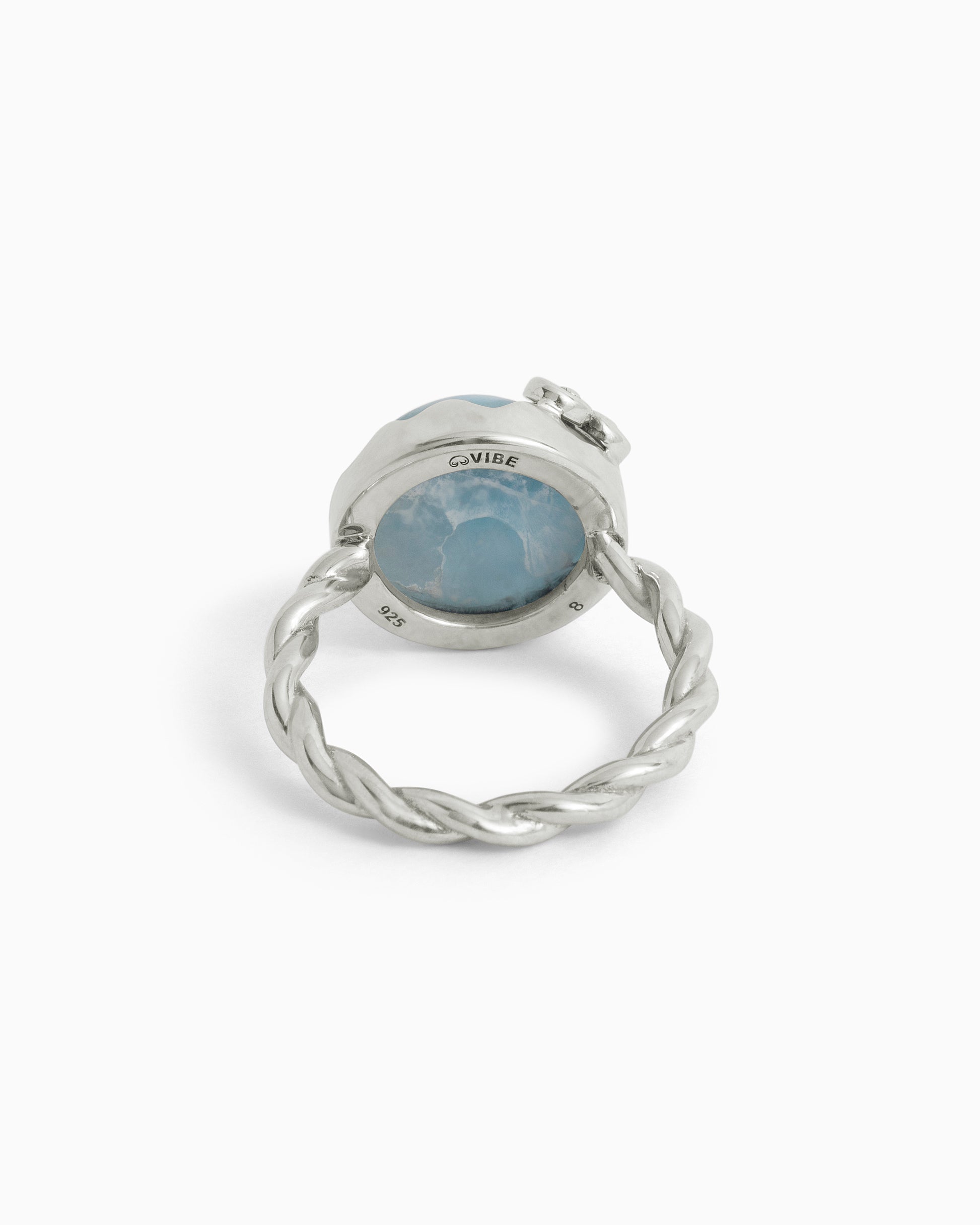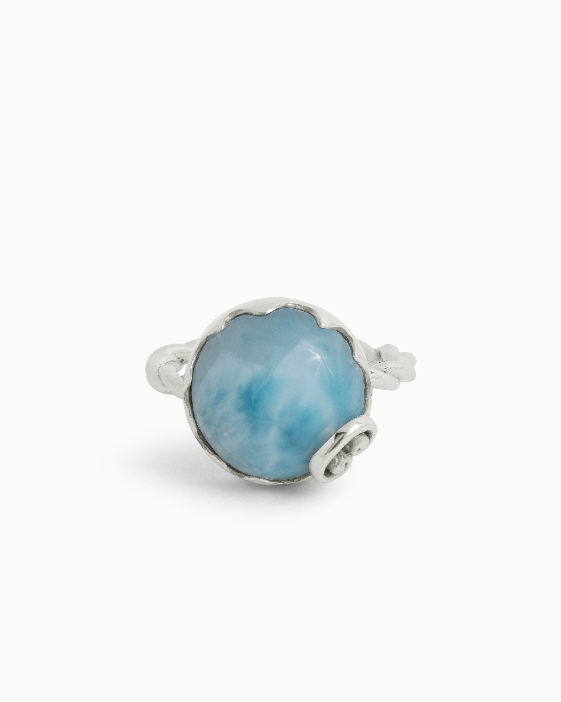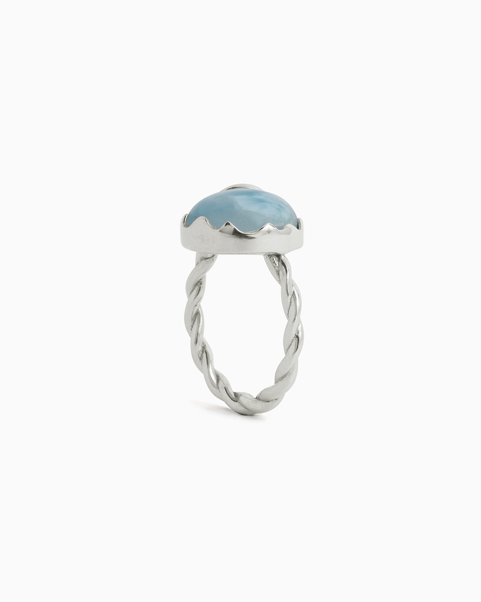 The Stone and Petroglyph Twisted Ring is a statement style handcrafted in sterling silver and featuring a bold larimar cabochon at the center. This piece includes an assortment of unique details like a twisted band, and a petroglyph adorning the top of the stone placed in a wave-like setting.