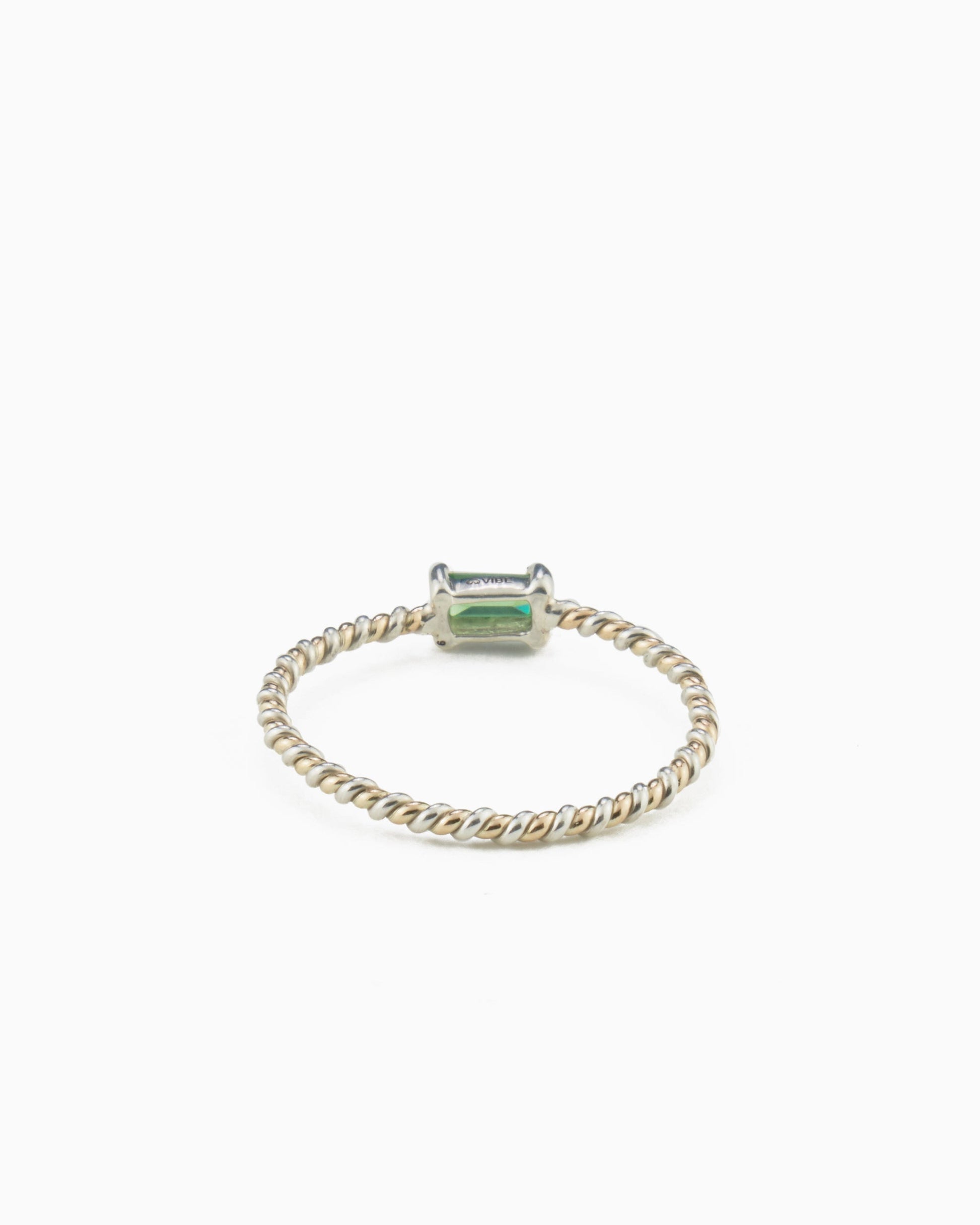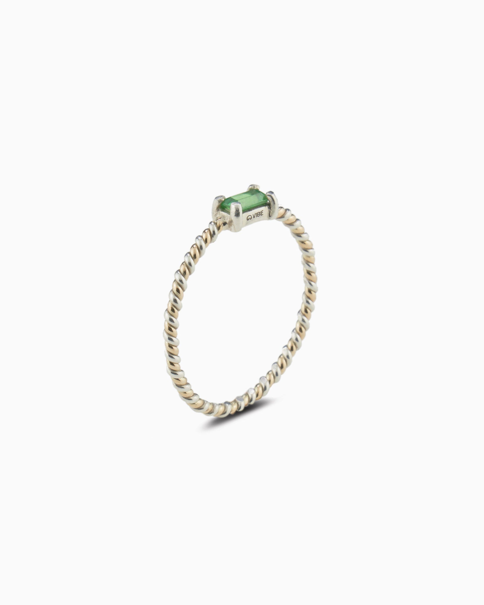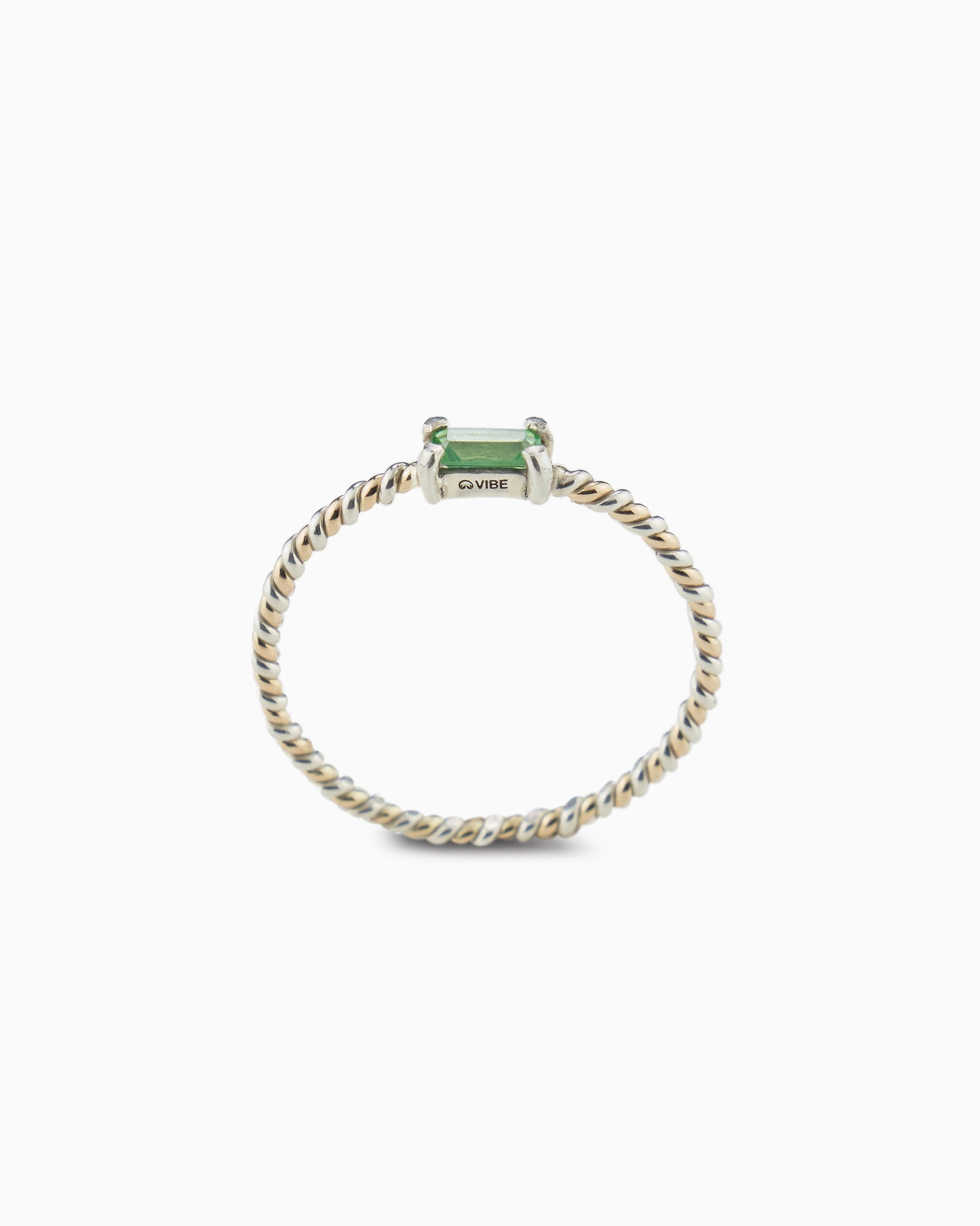 Elevate your everyday style with the Twisted Two-Tone Band, designed to be worn solo or stacked with other pieces. Handcrafted from a blend of 14K solid gold and sterling silver, the intertwining bands frame a faceted green zircon stone making it the perfect addition to your jewelry collection.