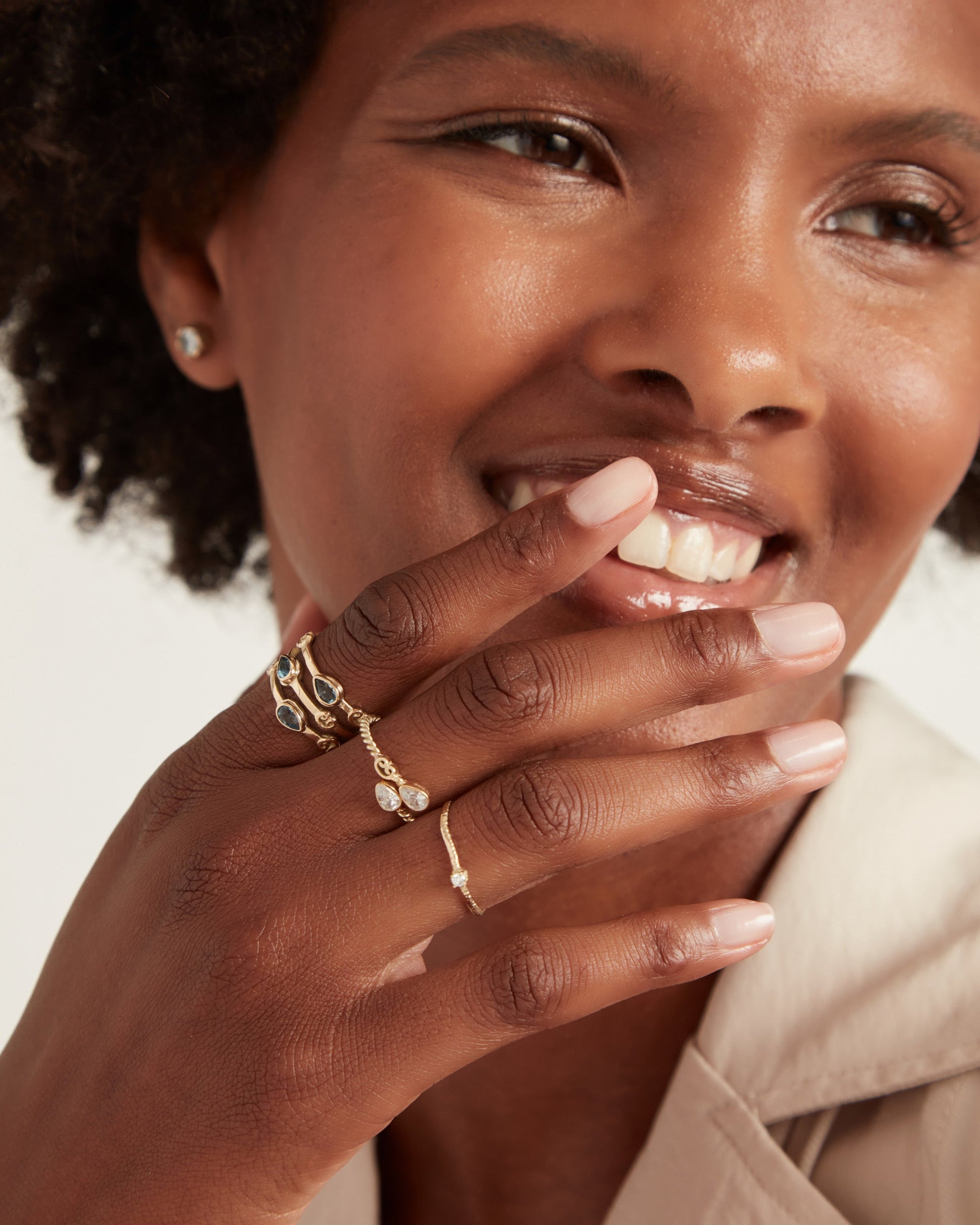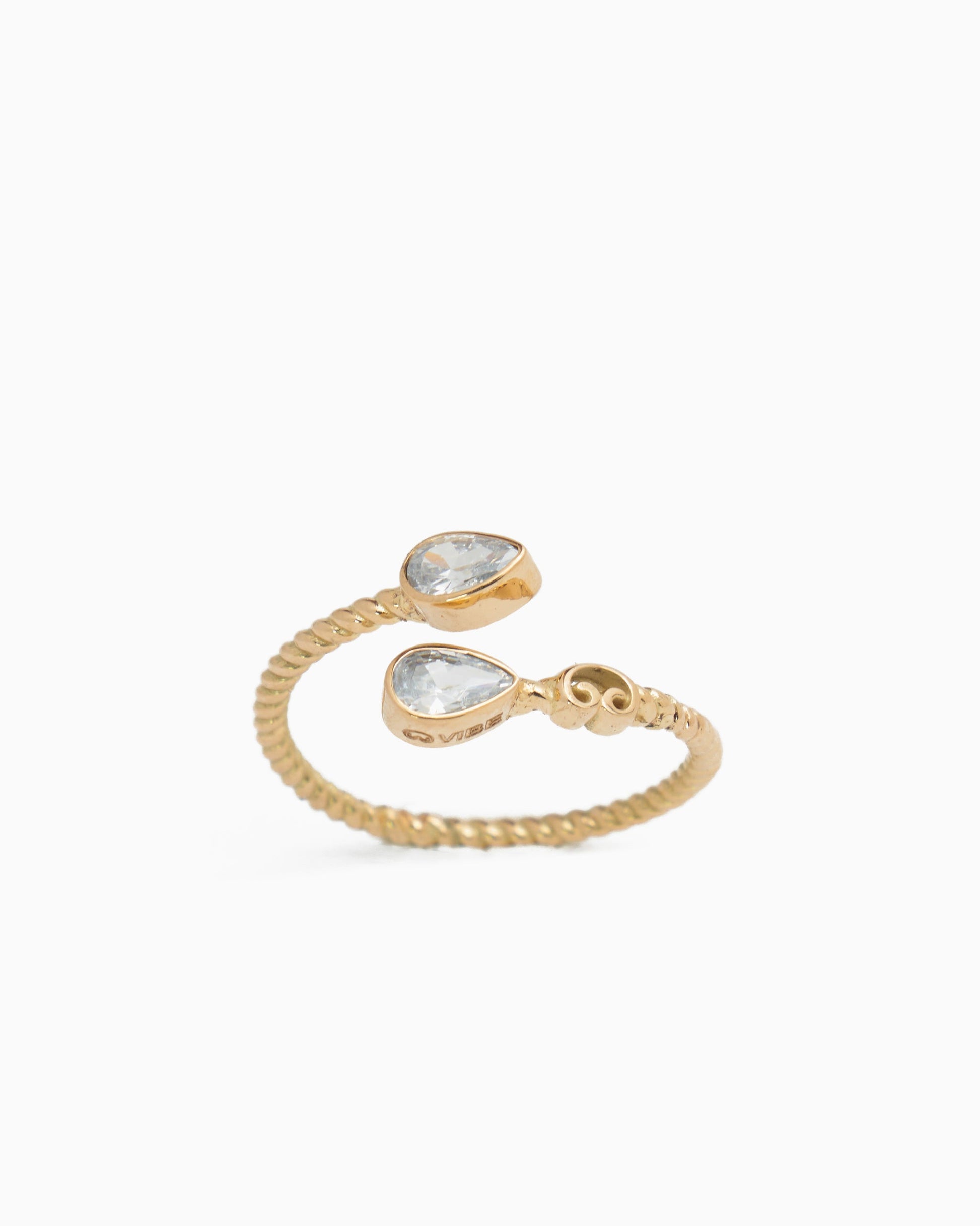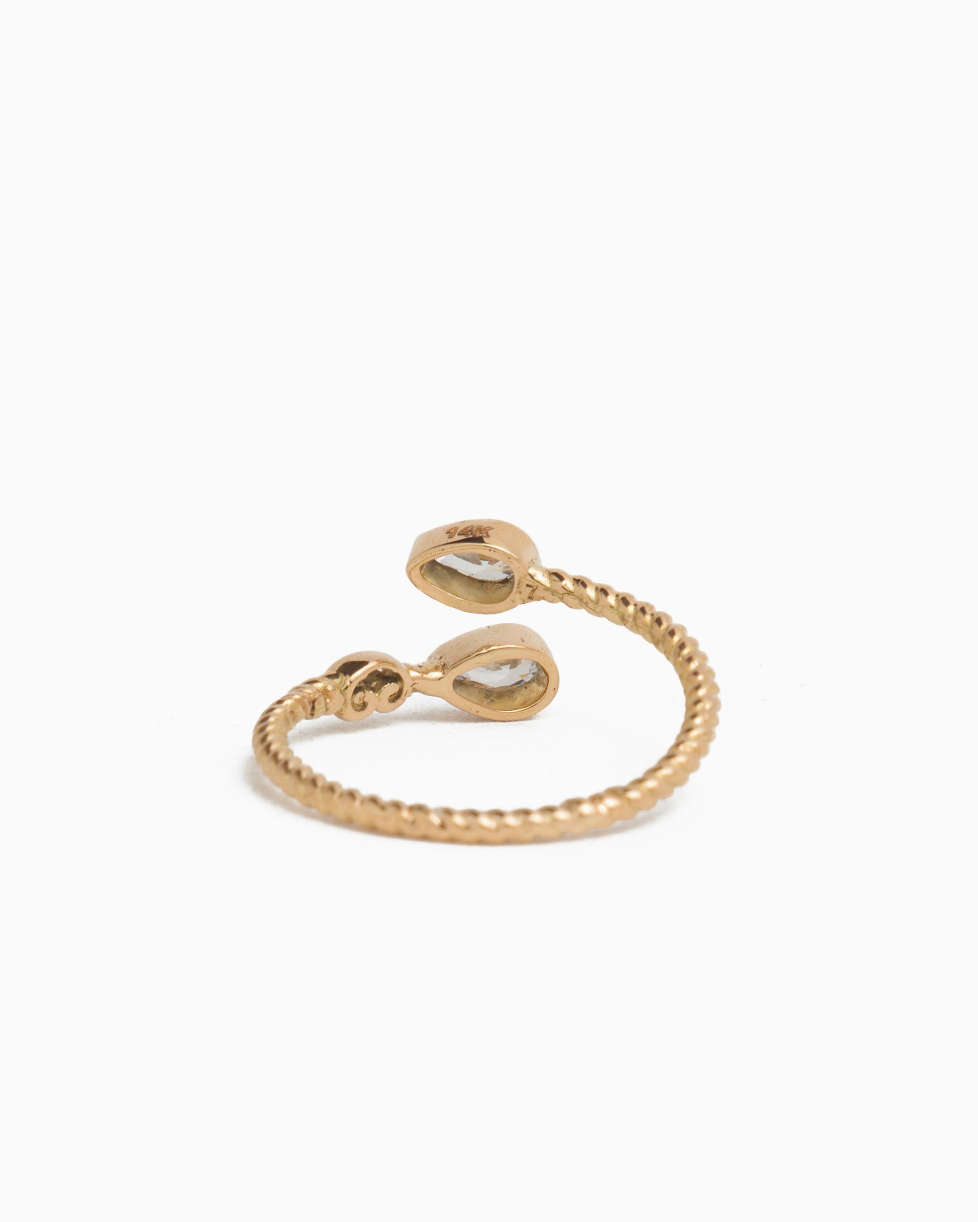 The Twisted Wrap Ring features a twisted 14K solid gold band adorned with two faceted pear-shaped white zircon stones. With its flexible fit, this ring can be worn solo for a minimalist look or stacked with others from your collection.