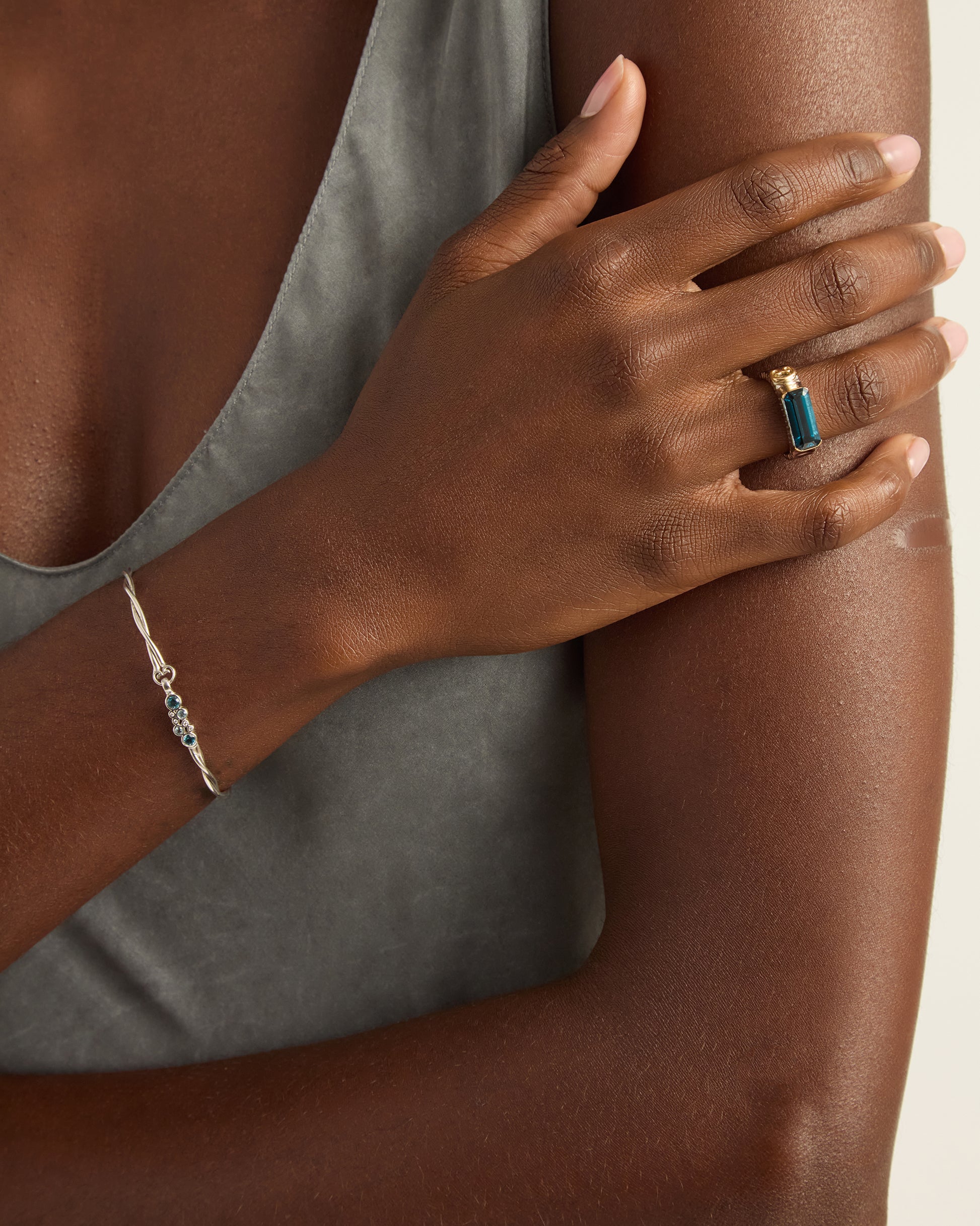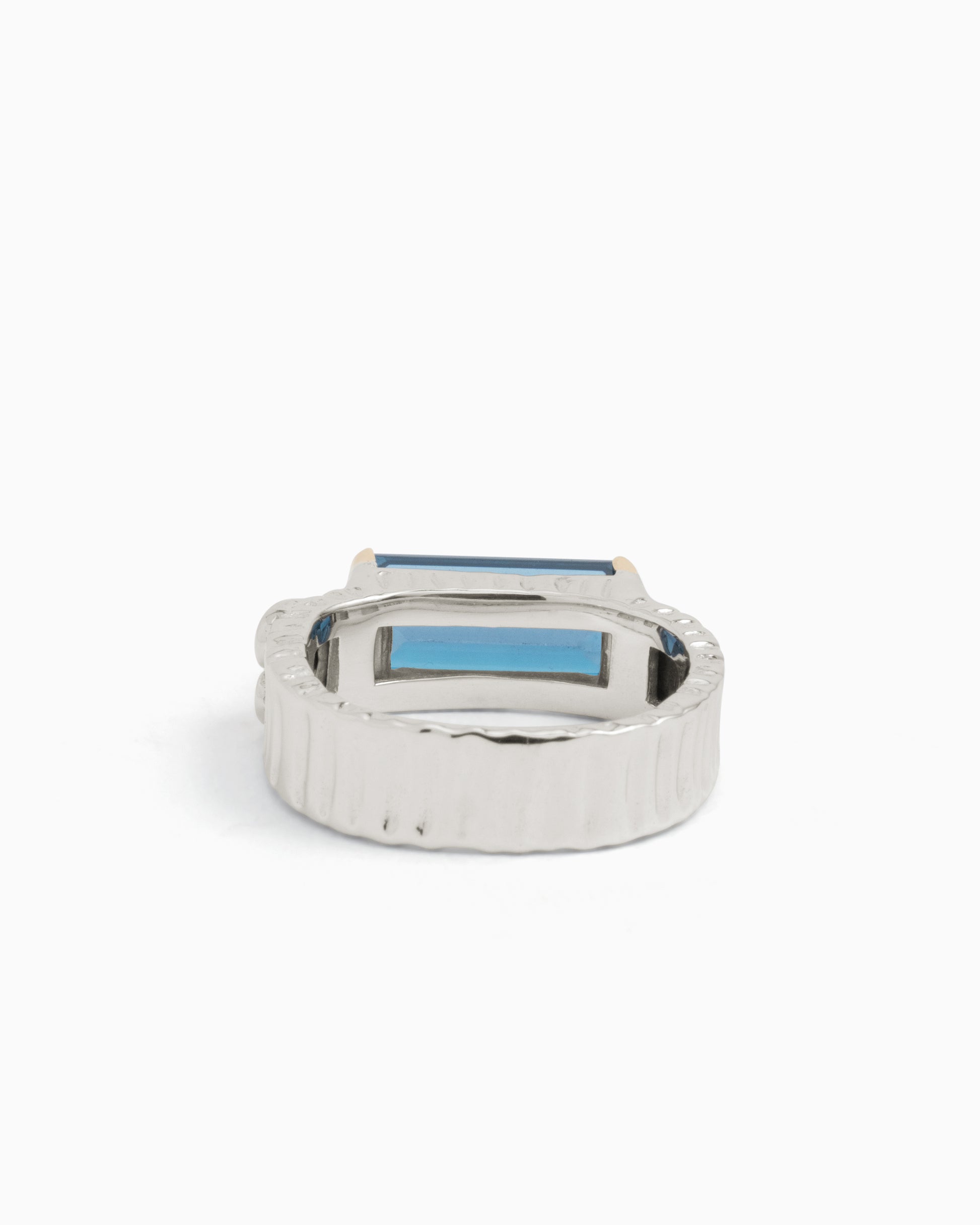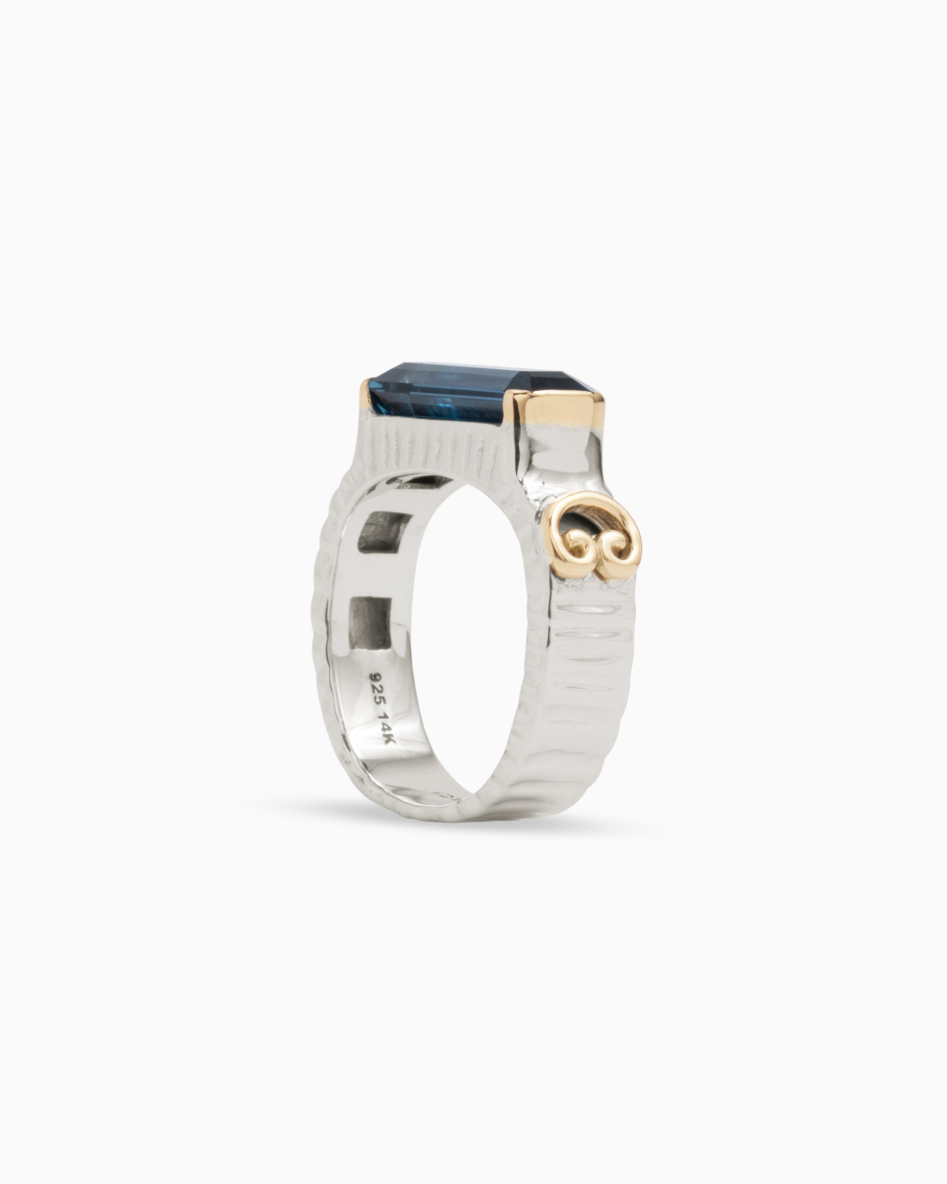 Handcrafted in sterling silver, the Water Texture Elongated Stone Ring features a rectangular, faceted London blue topaz framed by 14K gold accents, and a 14K gold petroglyph on one side. The shiny water texture adds soft, wave-like ripples inspired by the ocean’s natural movement.