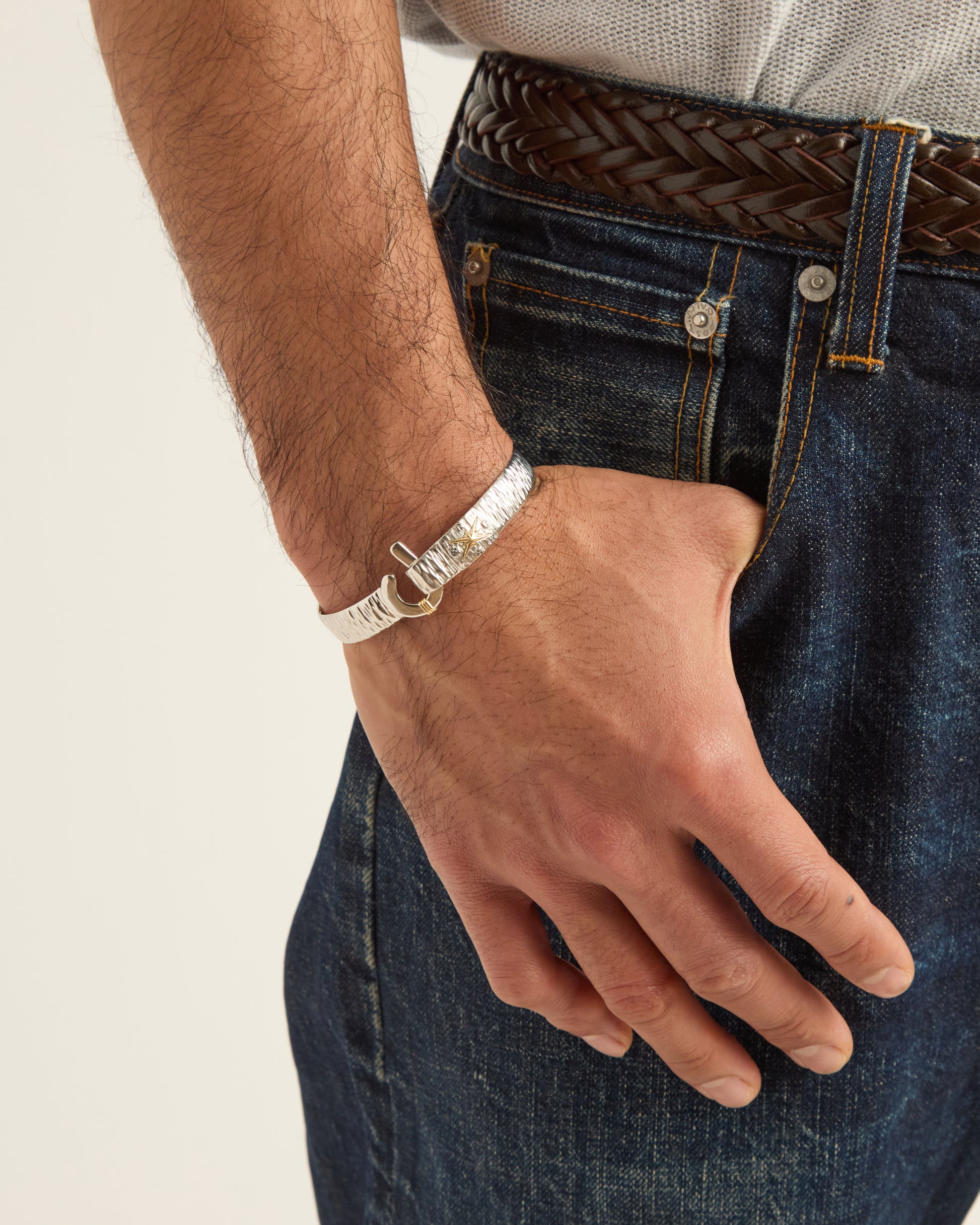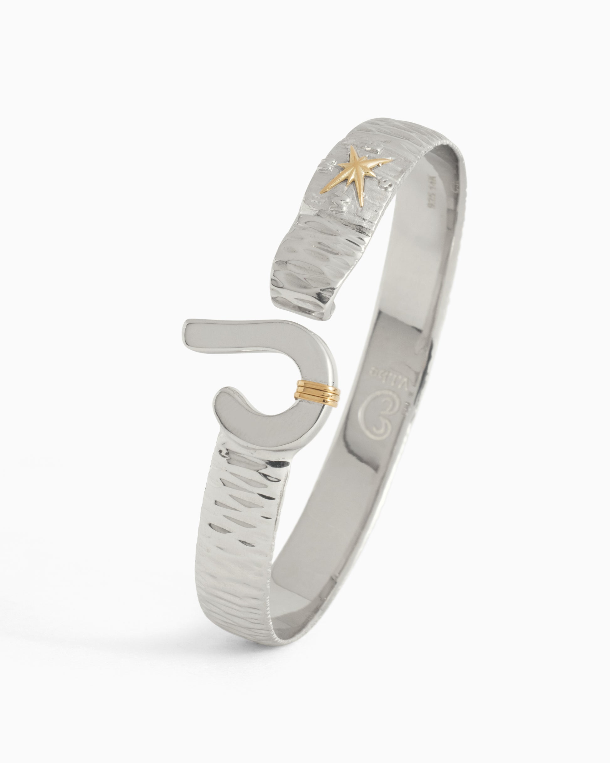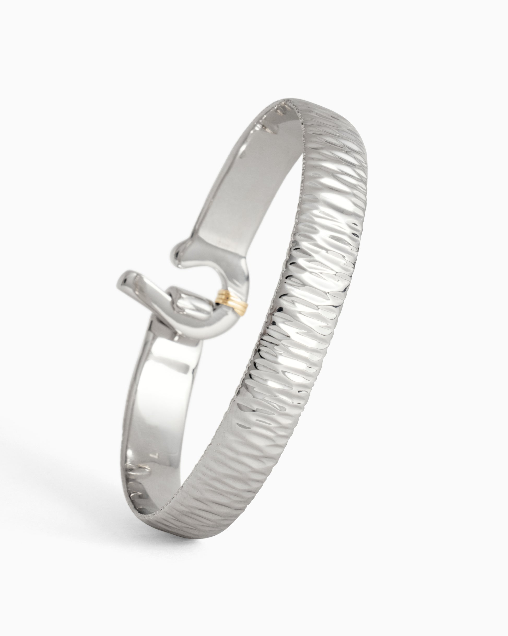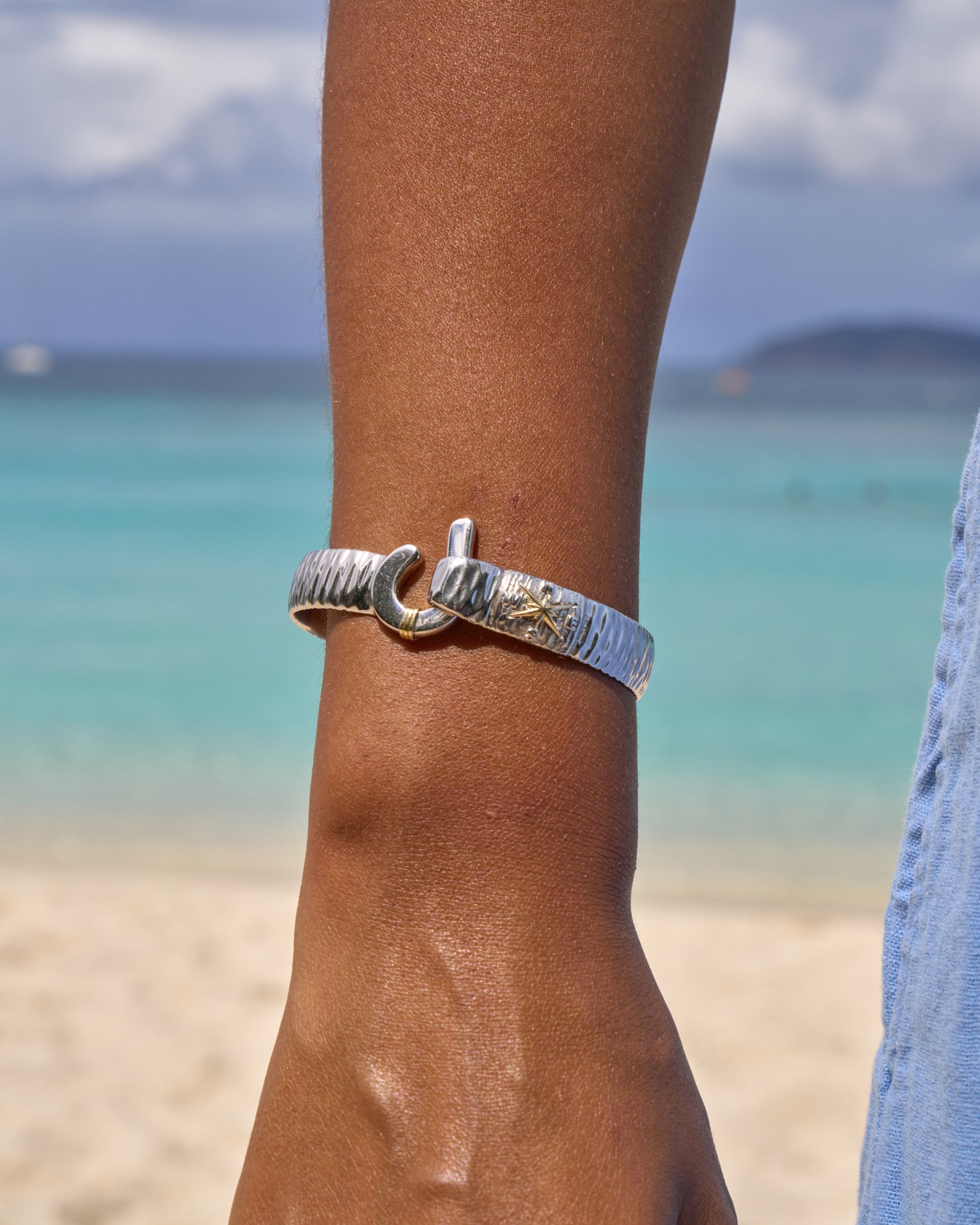 The Water Texture St. John Hook Bracelet is fashioned in sterling silver with a "J" hook clasp to honor the island of St. John. Our water texture is ocean inspired and features wave-like details throughout. Featuring a 14K gold compass and 14K gold good luck wraps, solo or stacked, it is sure to be a favorite statement piece. Found in many of our designs, Vibe’s good luck wraps represent love, laughter, happiness, good fortune, health, unity, and peace. Wear this piece on its own or stack it with other bracelets for a layered look.