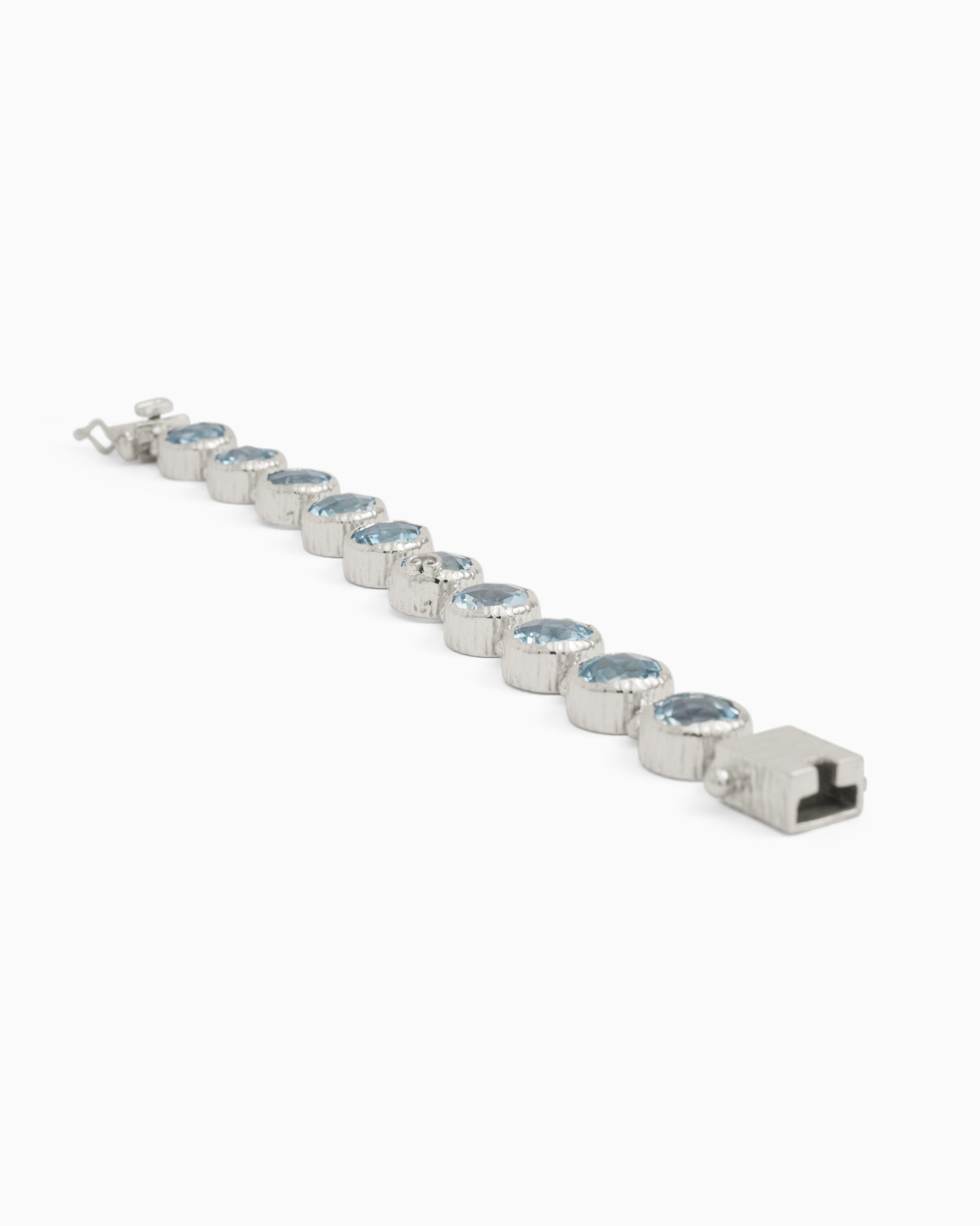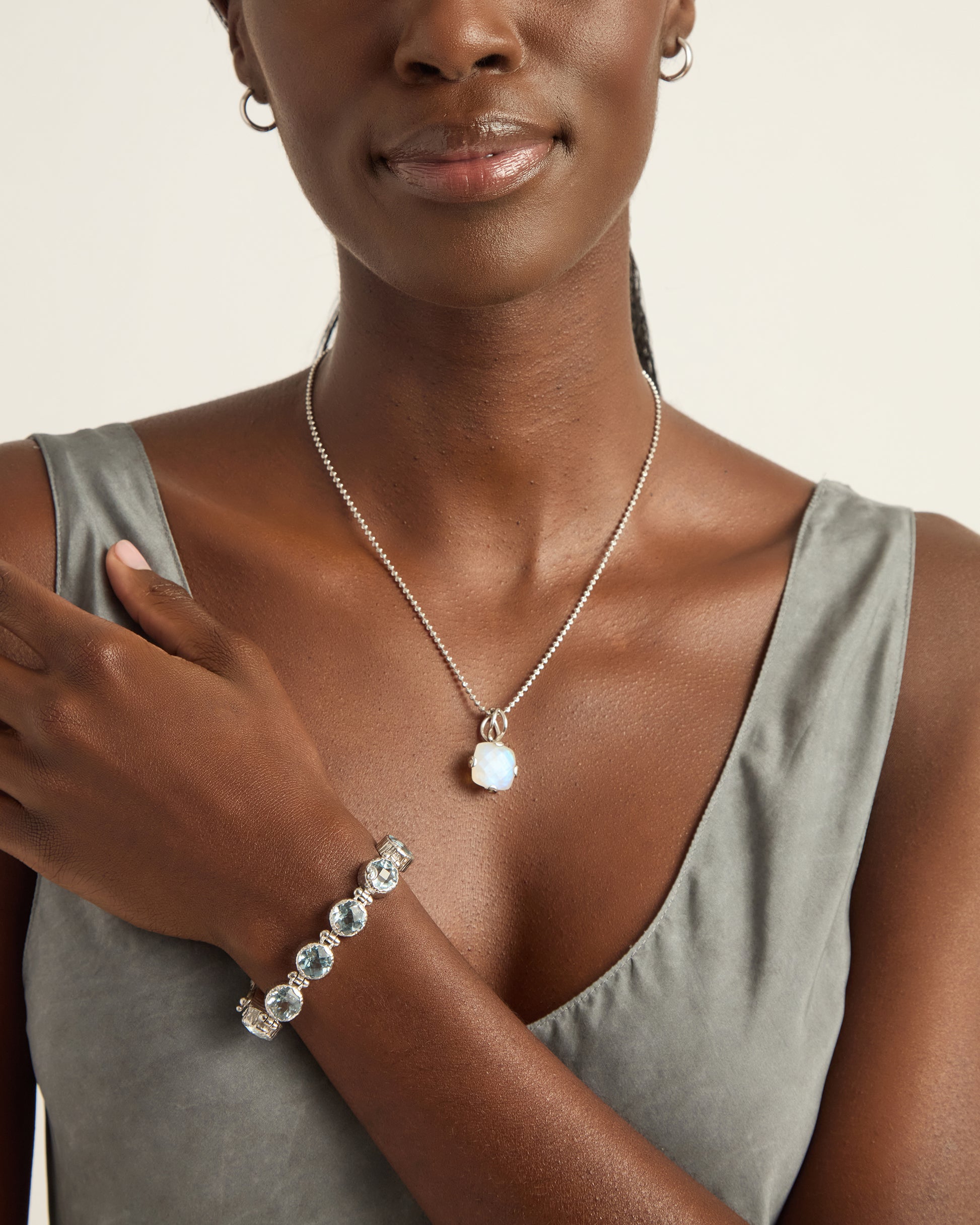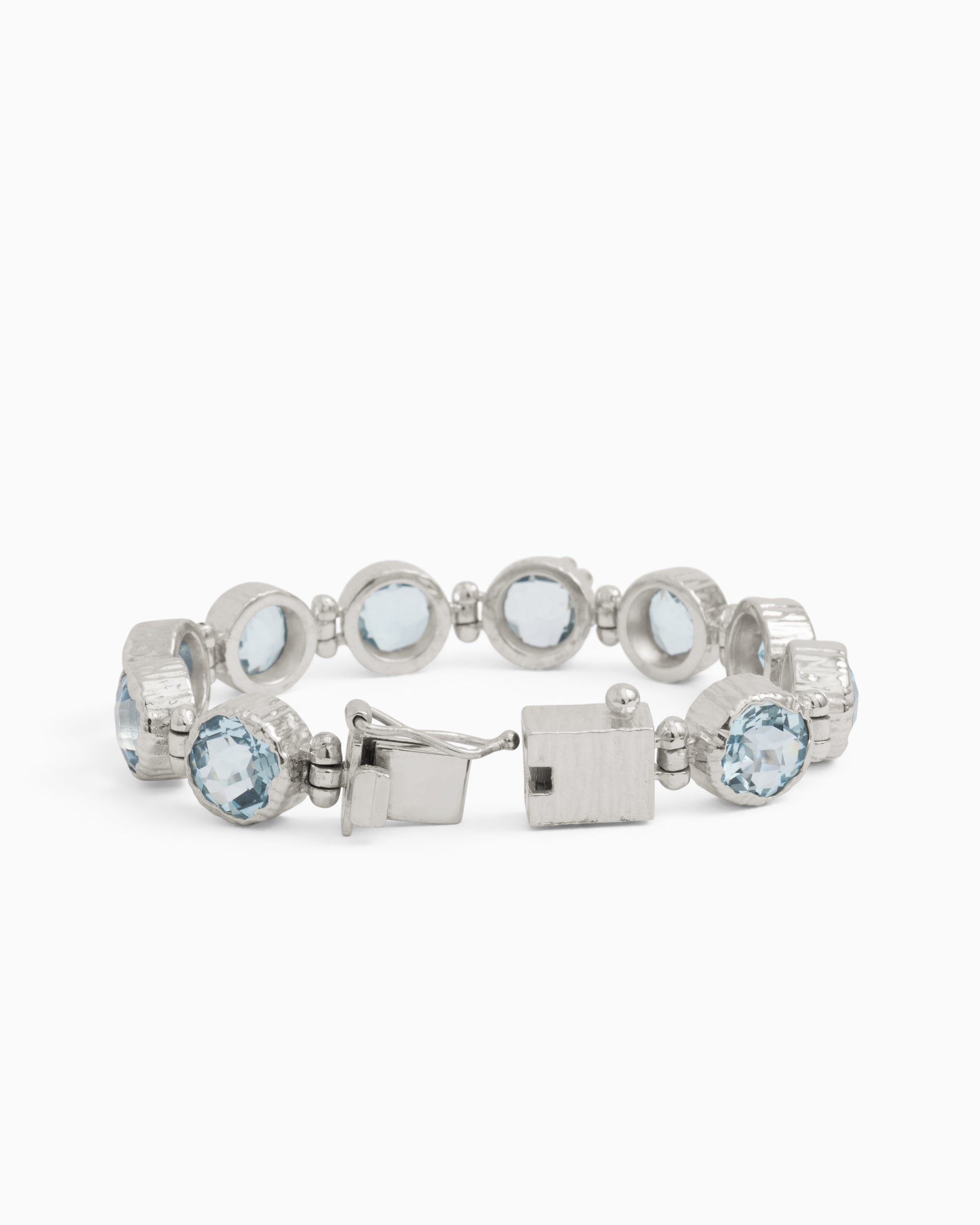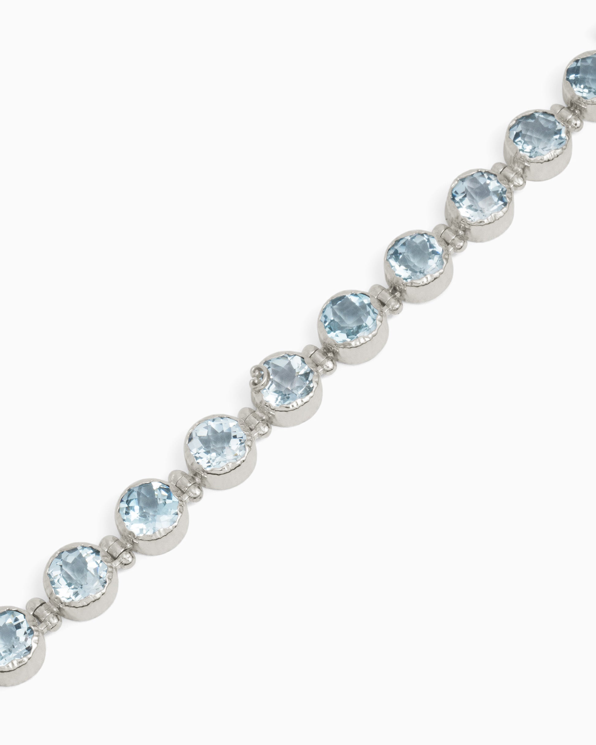 The Water Texture Stone Link Bracelet is handcrafted in sterling silver, featuring a series of sky blue topaz stones bezel-set in rounded links. Each setting is finished with our signature shiny water texture, inspired by the look of rippling water under sunlight, featuring organic grooves and soft, reflective movement. Finished with a secure clasp, this bracelet works great in a statement look or everyday wear.