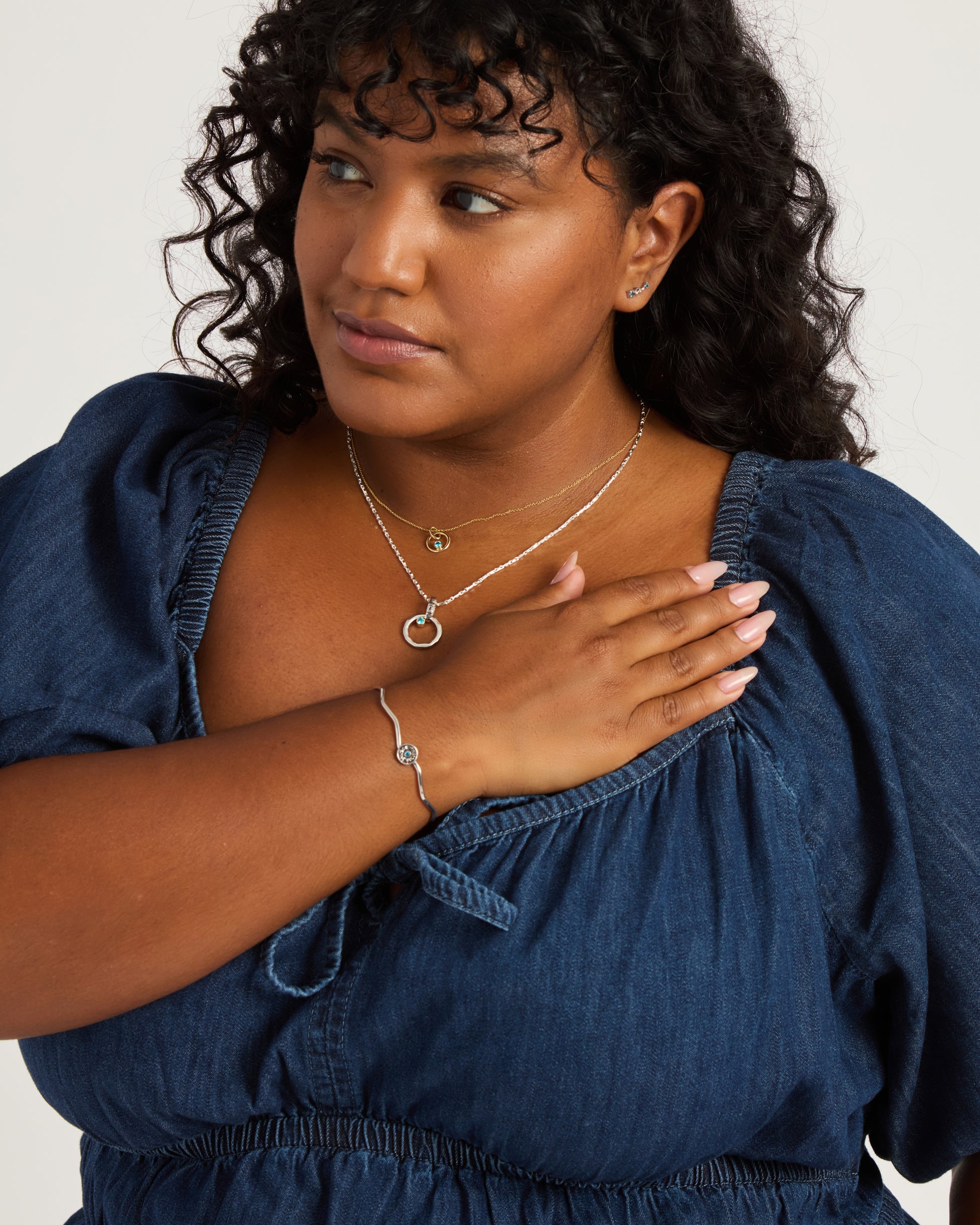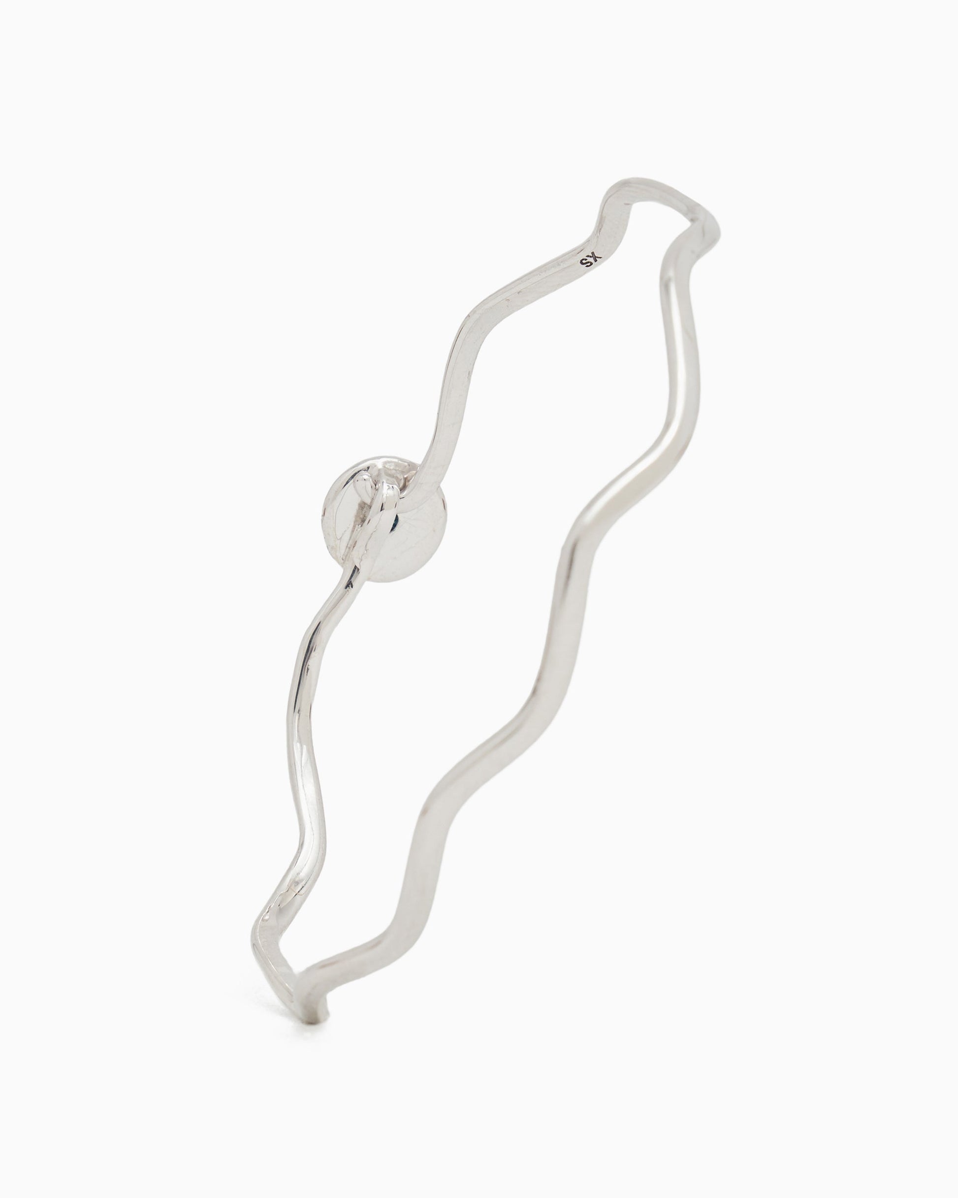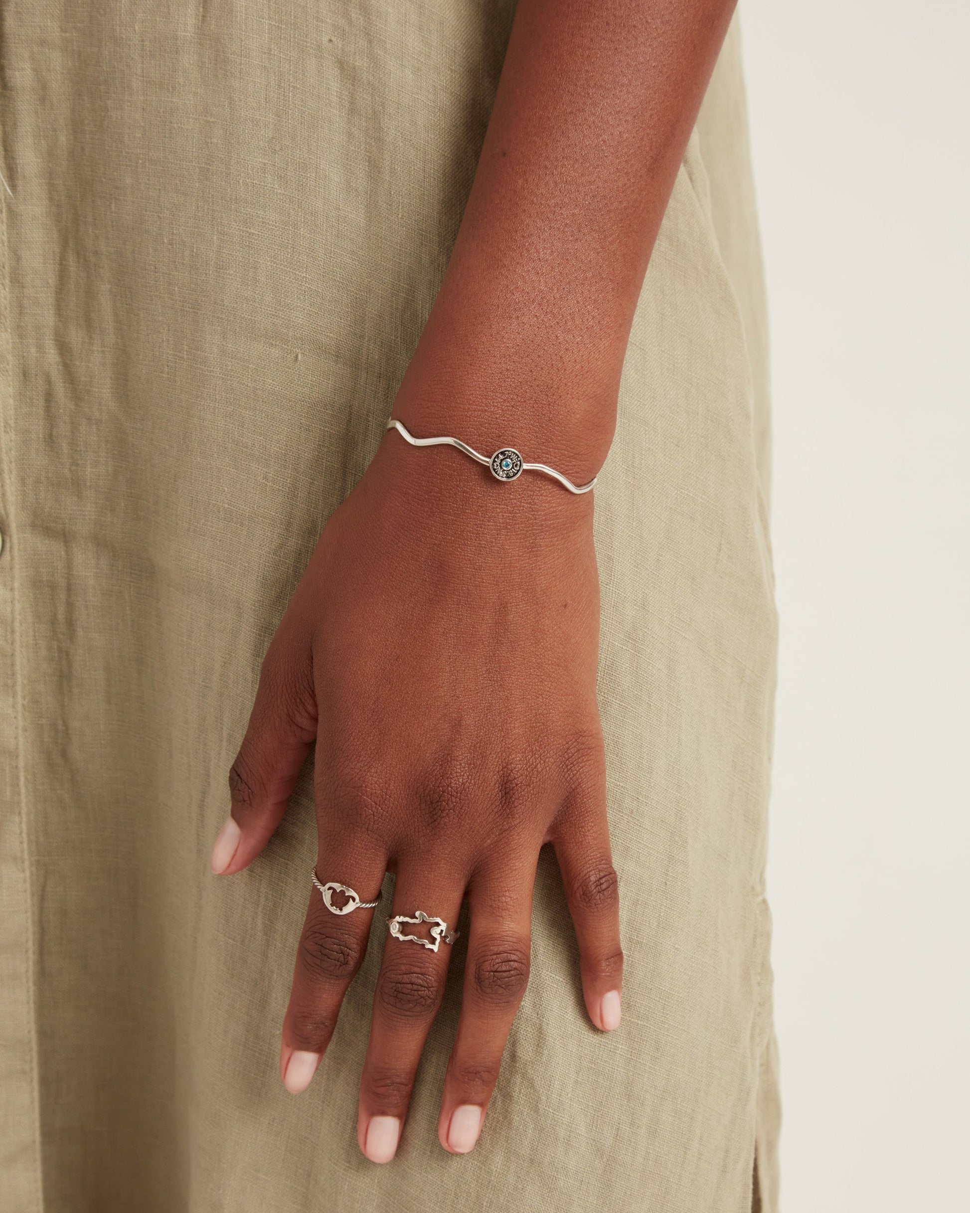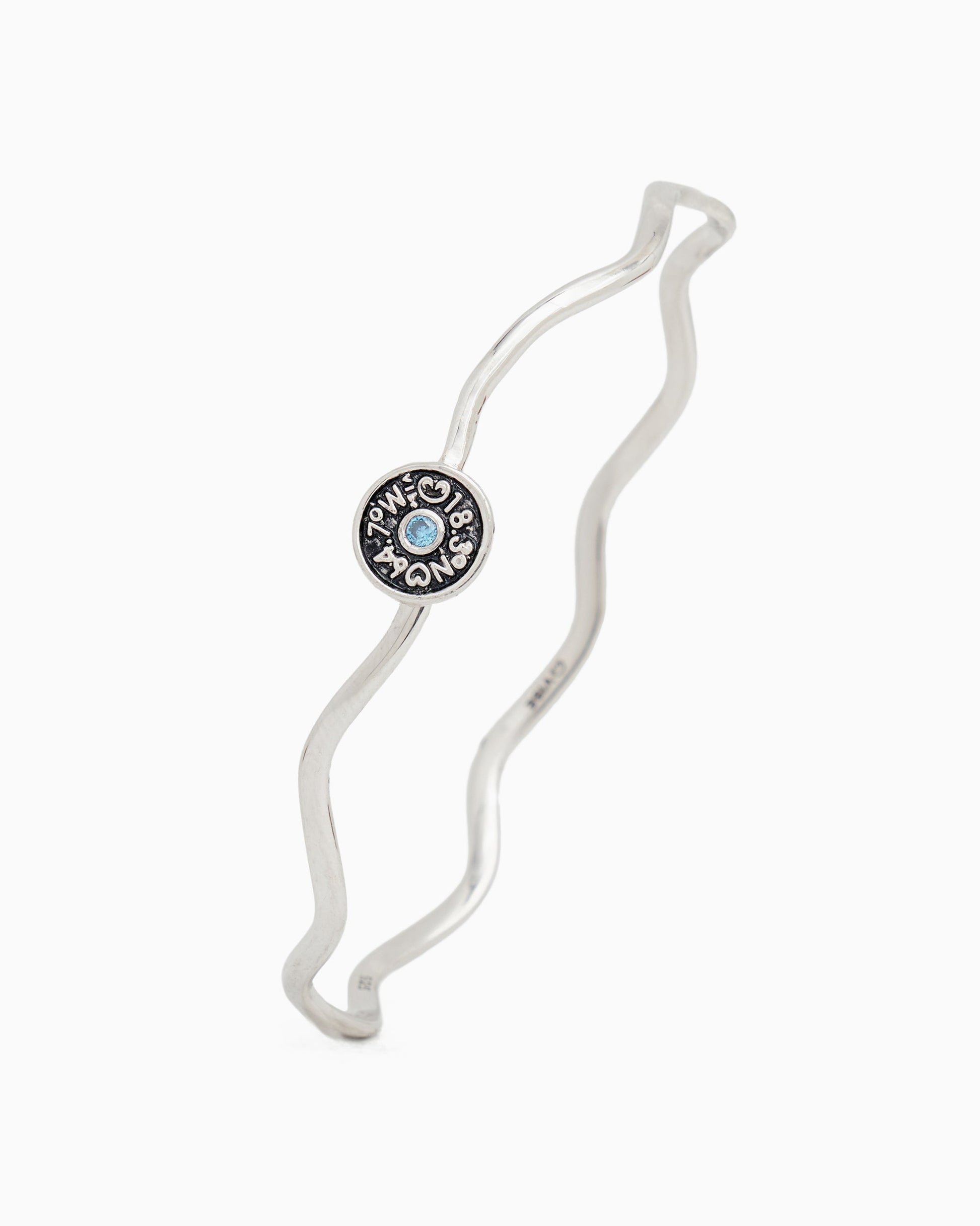 Find your way to St. John with this unique sterling silver bracelet. Featuring a wavy band with a medallion clasp adorned with a faceted blue zircon stone and St. John coordinates.